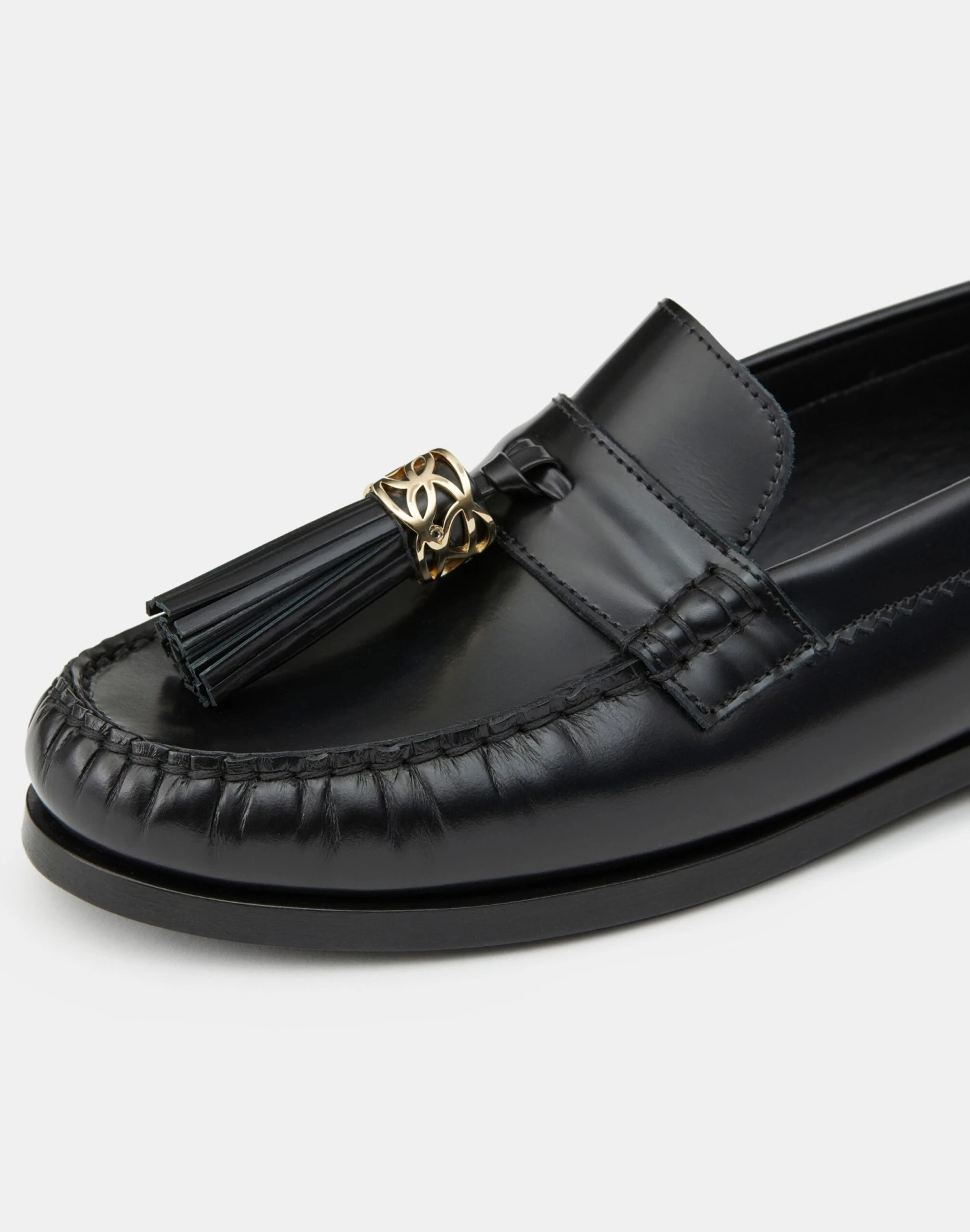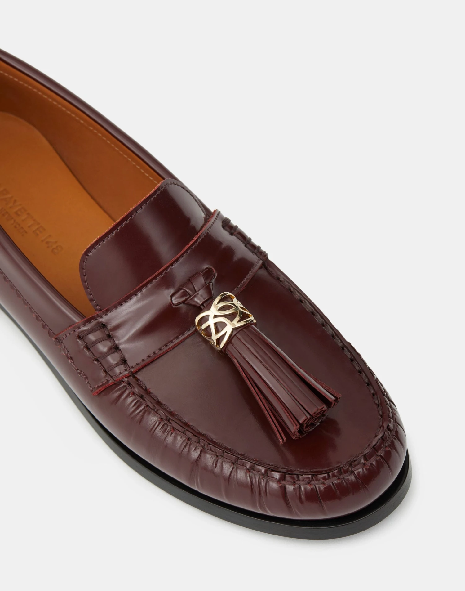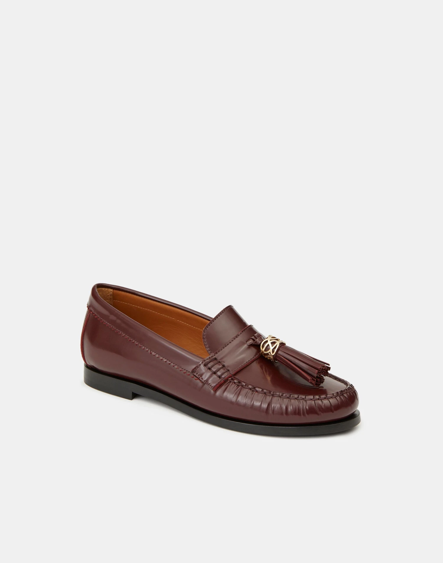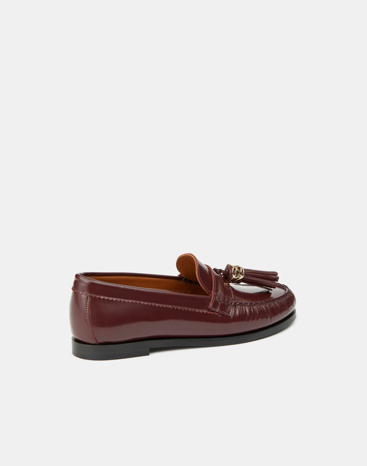 Crafted in Italy from smooth brushed leather, the quintessential loafer is elevated with a textural leather tassel at the vamp that’s embellished with a sculptural 8 Knot charm. The slip-on style is set on a stacked leather flat heel, and finished with intricate hand stitching and ruching along the rounded toe.