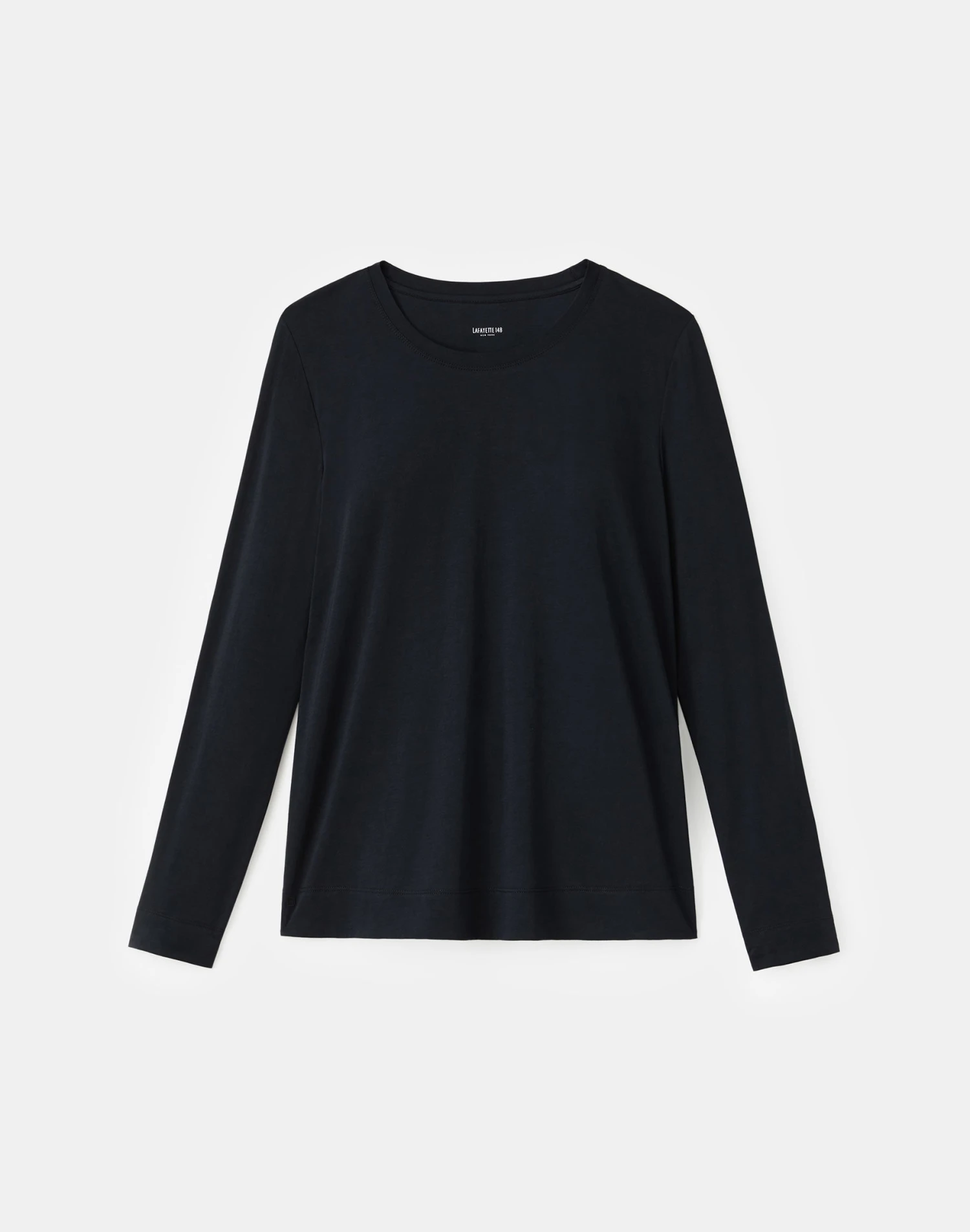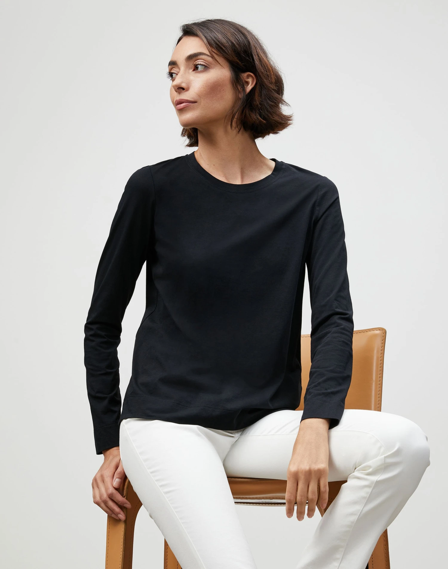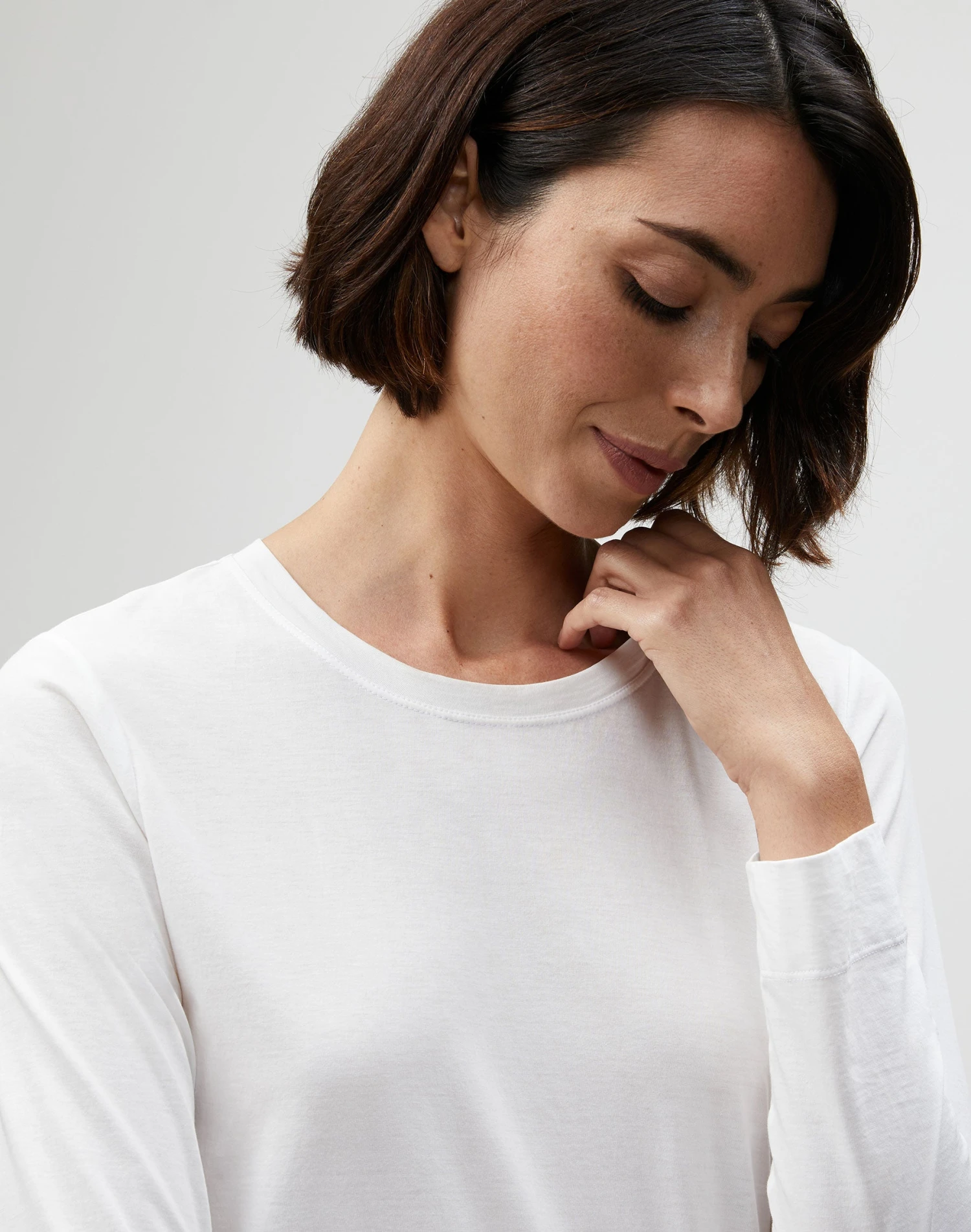 A classic t-shirt structure and crafted from pure comfortable, soft cotton, the Modern Tee is a true closet staple that every woman needs. With long sleeves, a crewneck and slightly below hip length, this piece is endlessly versatile and sophisticated.
