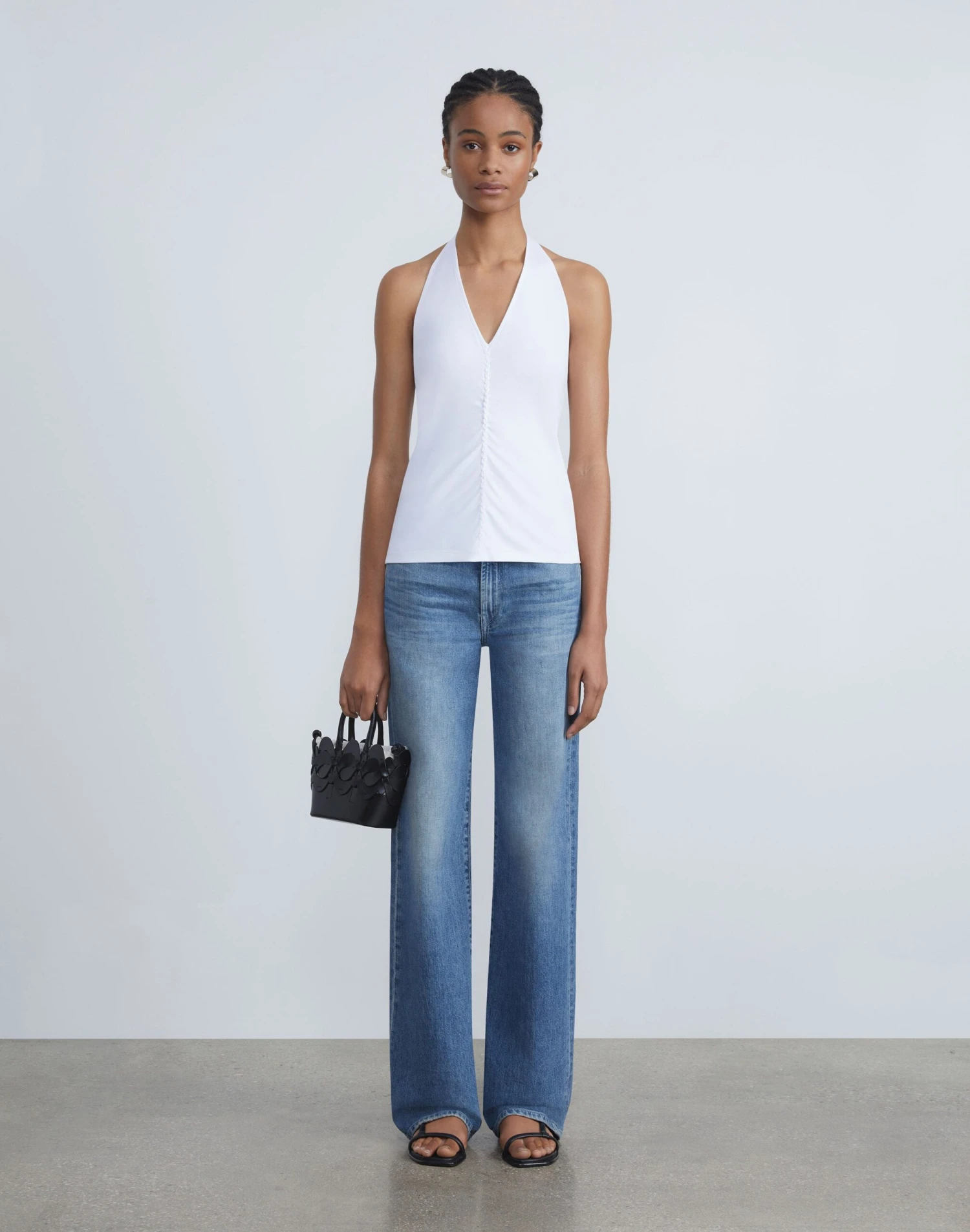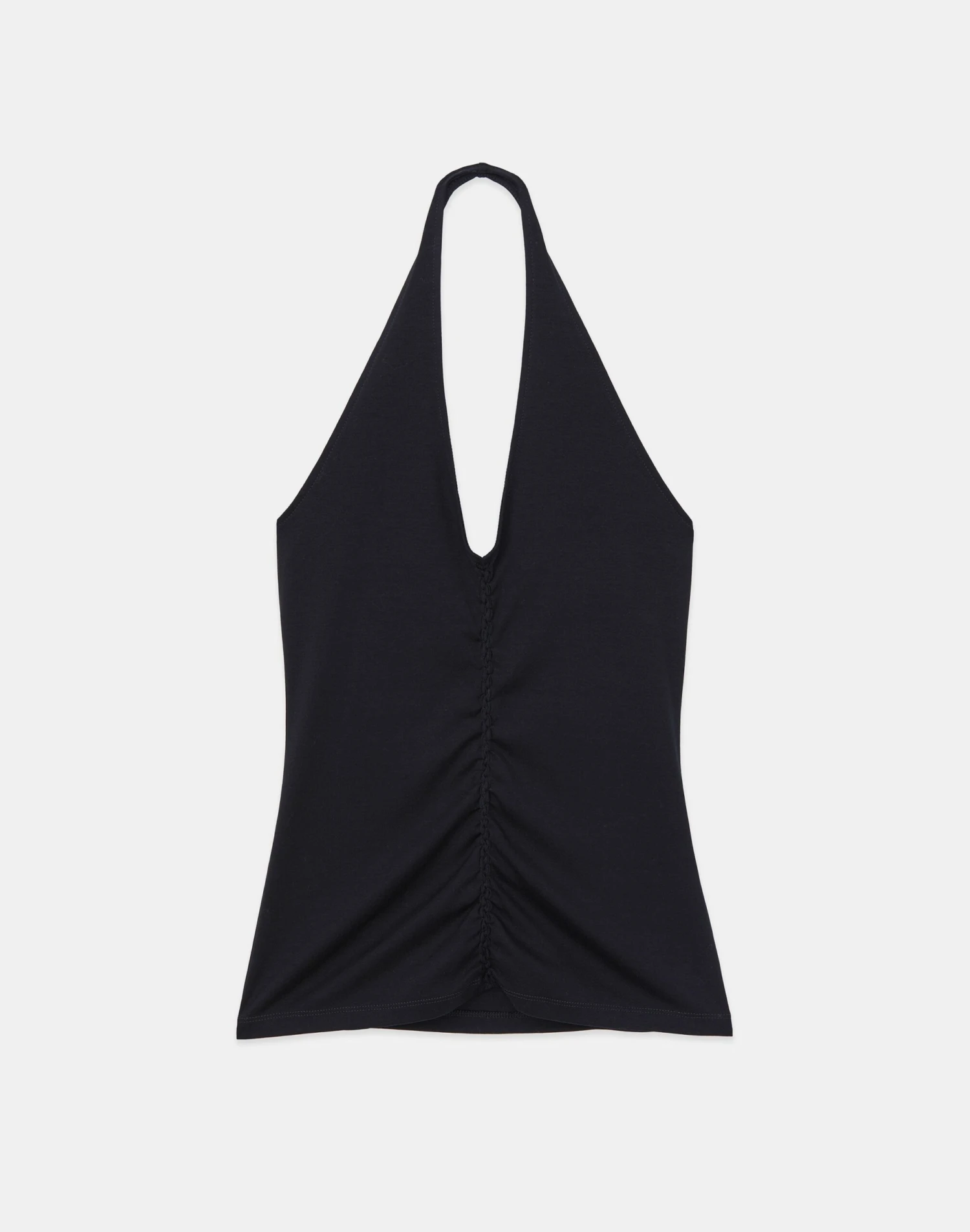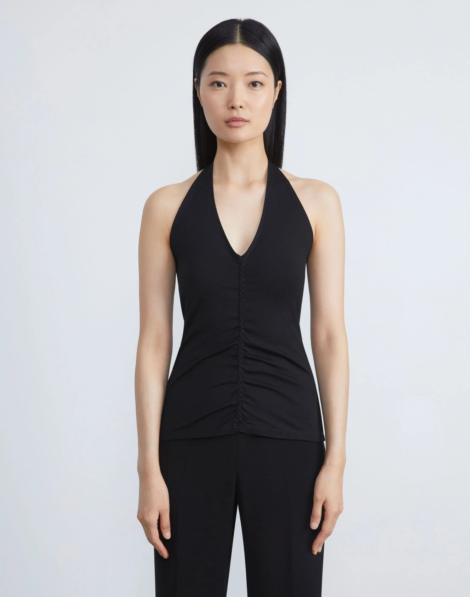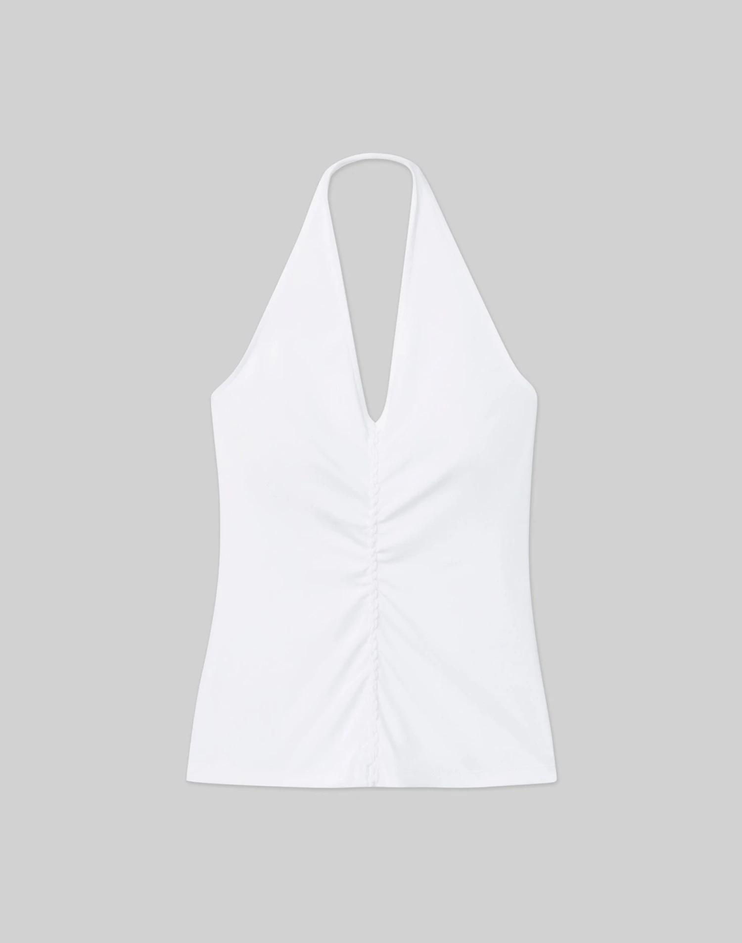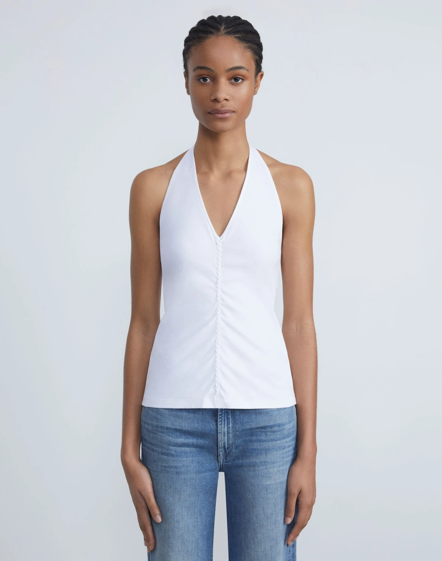 Elements of sculpture and minimalist design accentuate this cotton rib halter top, defined by gathered ruching down the center front with hand-stitched braided detail. The fitted silhouette has a hint of stretch for at-ease wear.