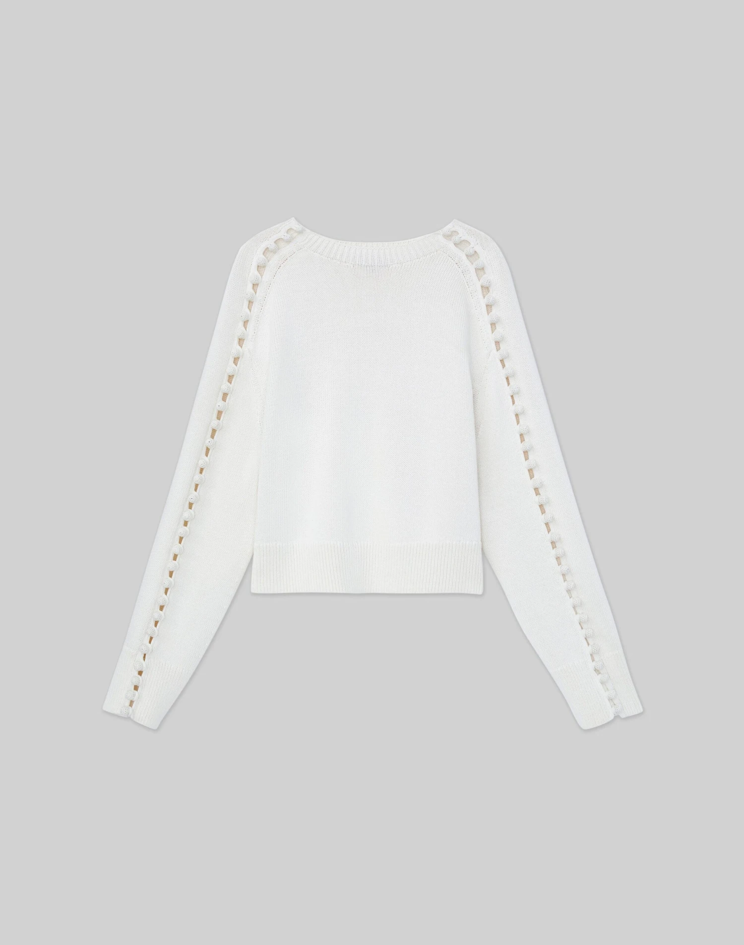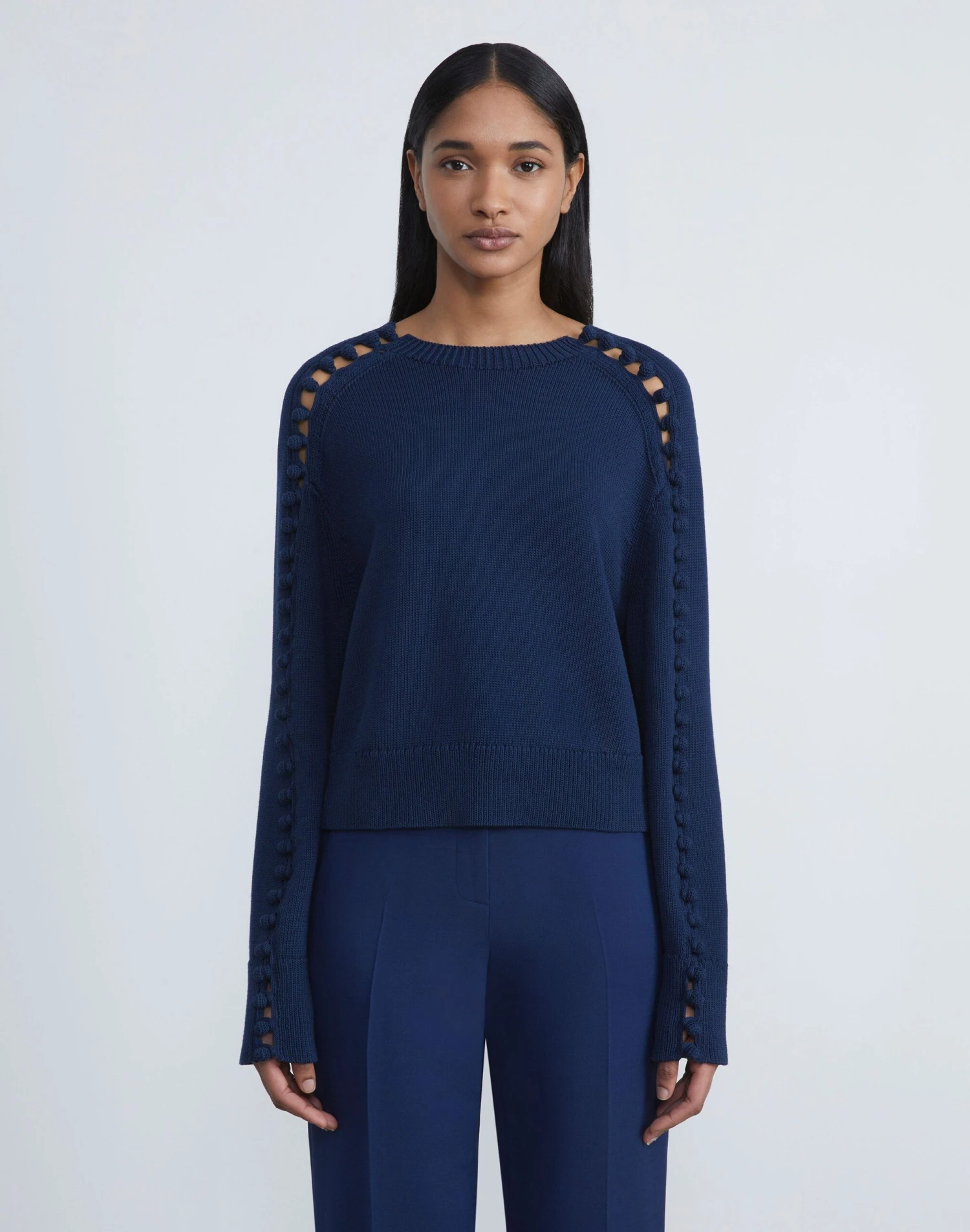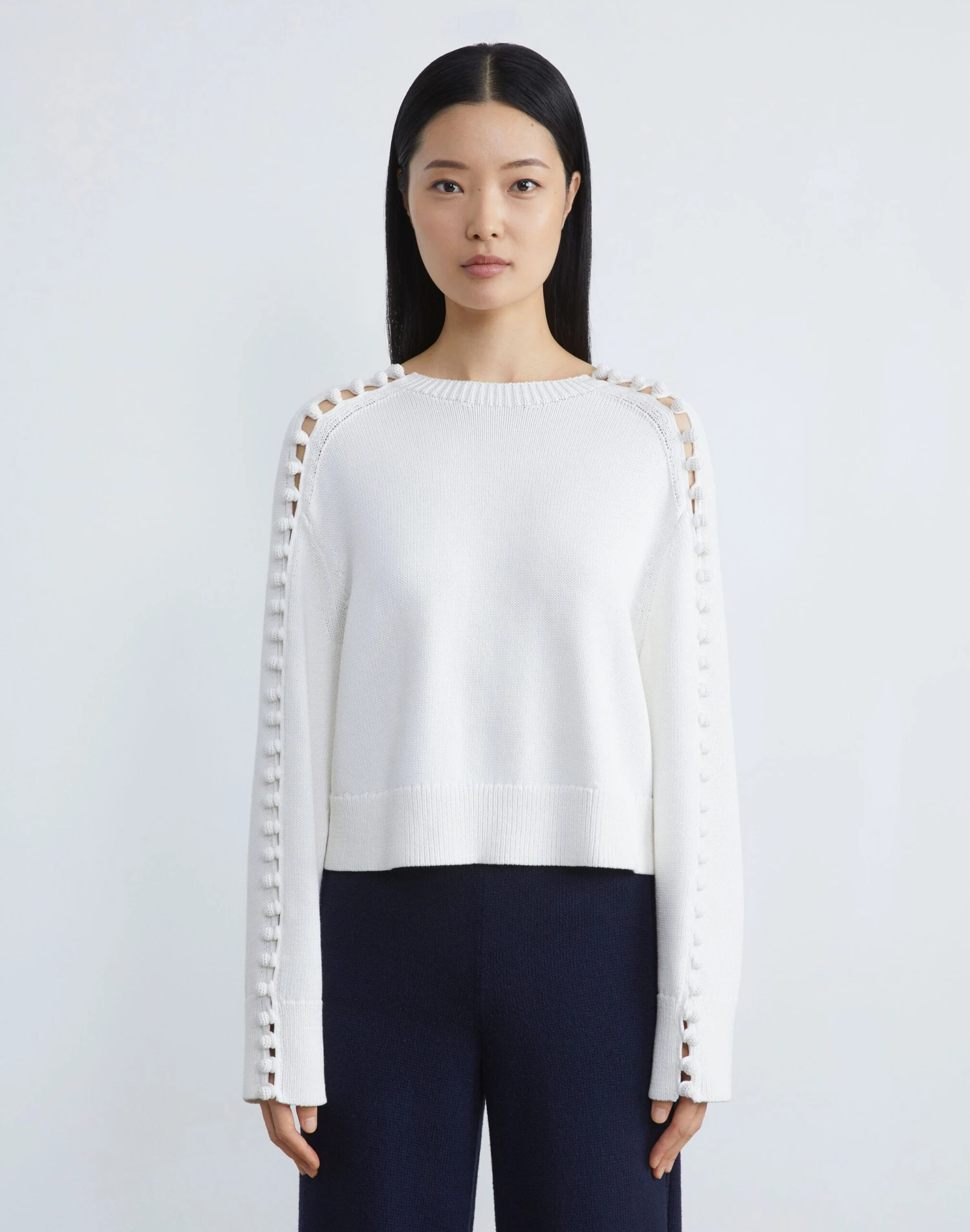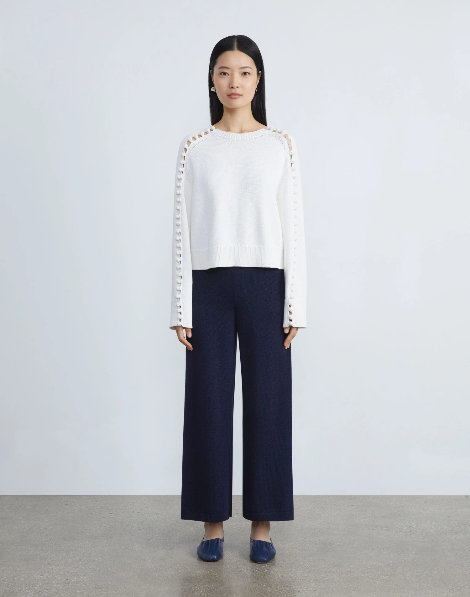 Inspired by the scalloped, cut-out edges of tear-away stamps, this button-sleeve sweater is expertly knit from tactile Italian cotton-silk yarns and adorned with hand-crocheted pearl and loop closures. The relaxed silhouette is framed by elongated sleeves and a slightly cropped length.