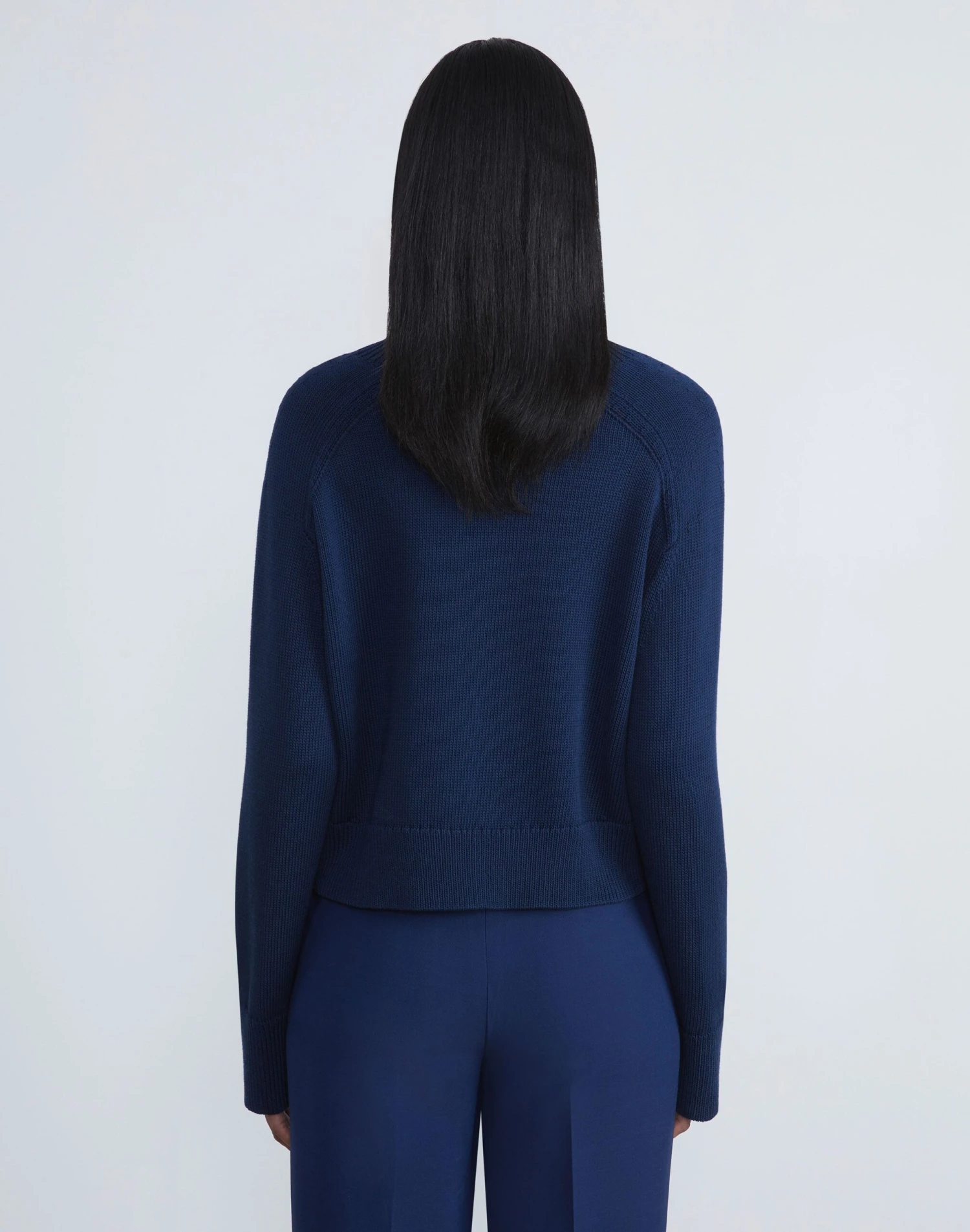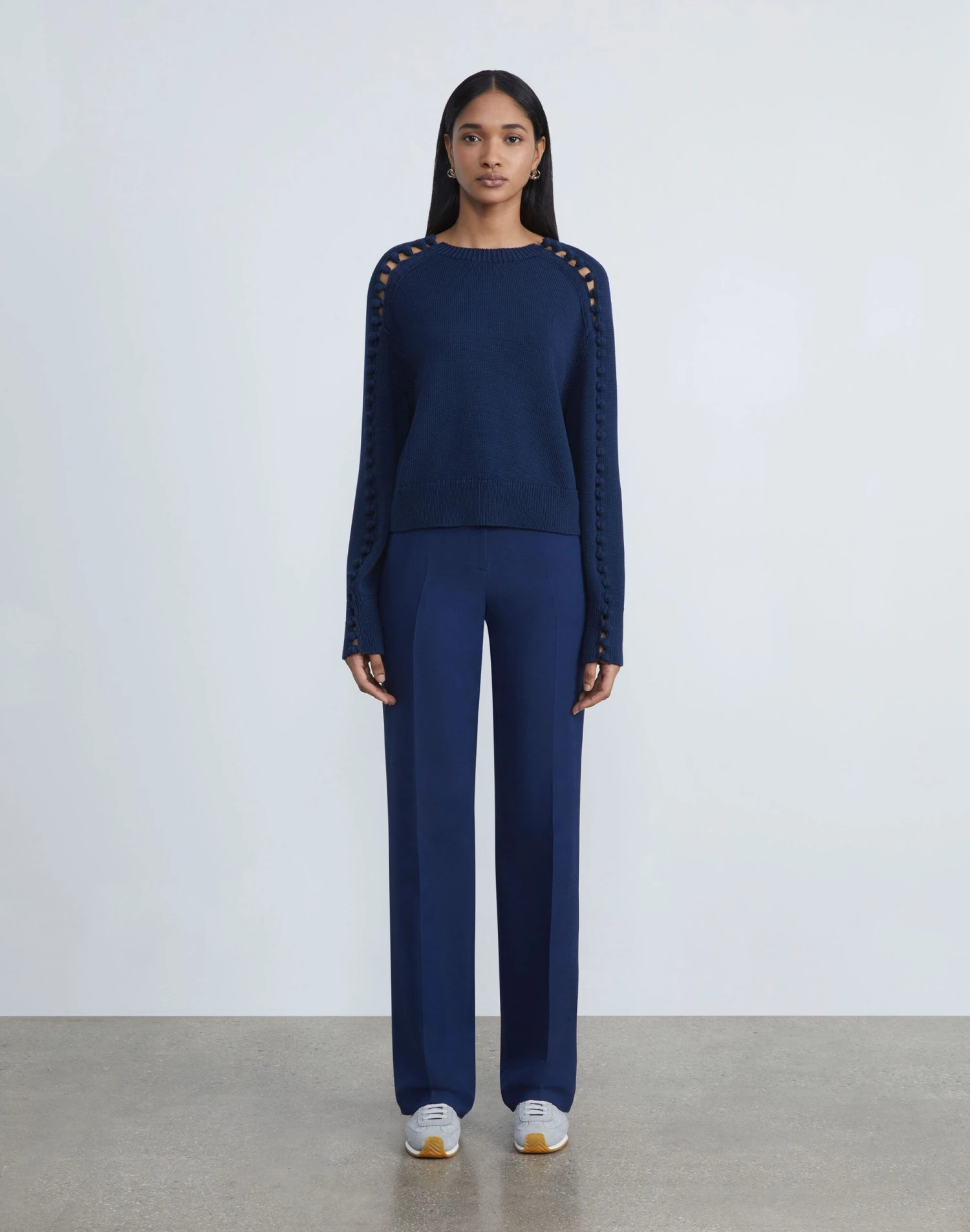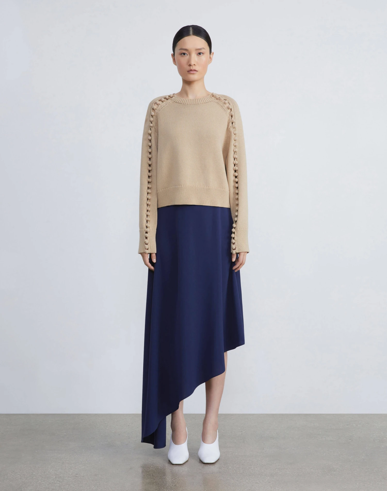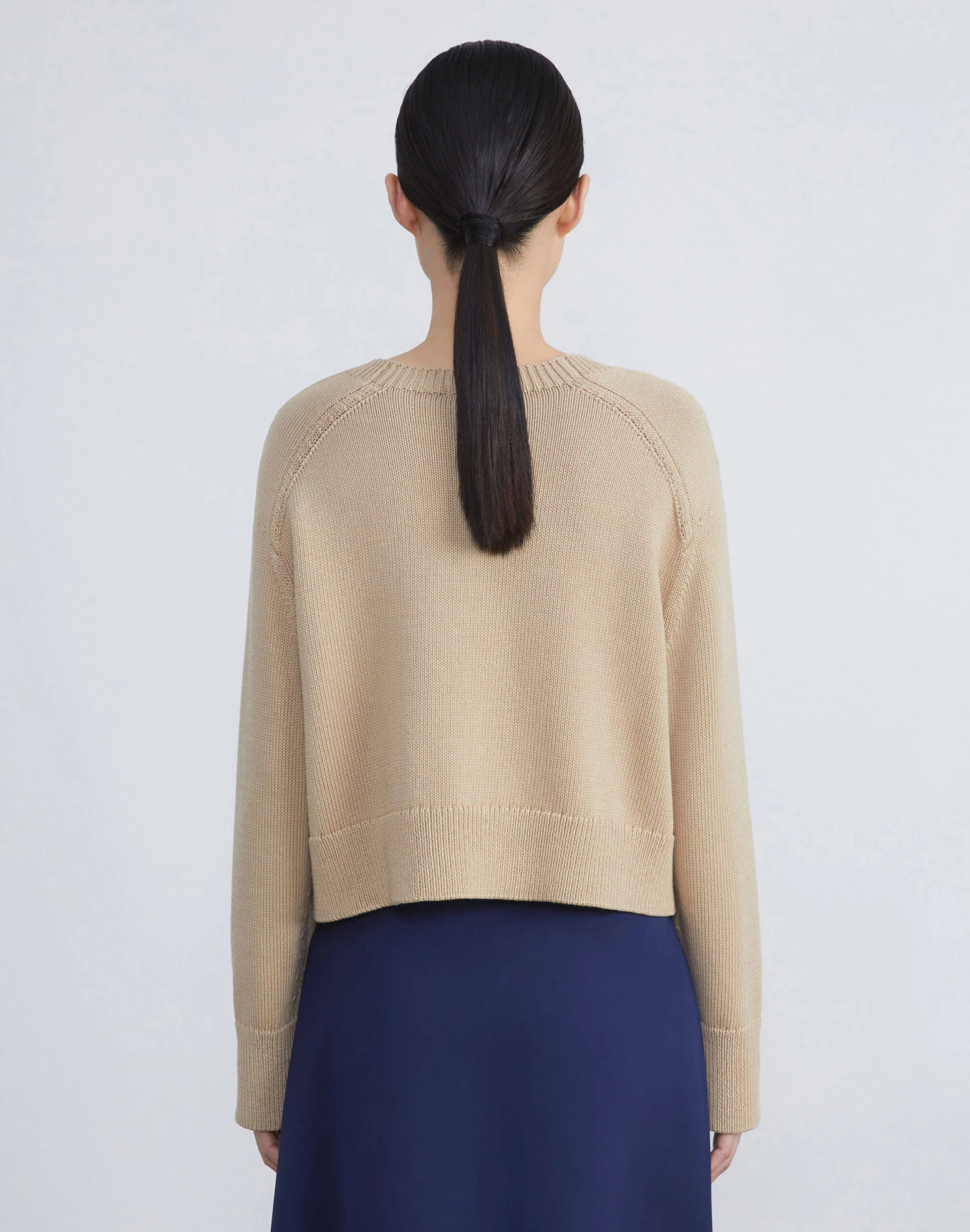 Inspired by the scalloped, cut-out edges of tear-away stamps, this button-sleeve sweater is expertly knit from tactile Italian cotton-silk yarns and adorned with hand-crocheted pearl and loop closures. The relaxed silhouette is framed by elongated sleeves and a slightly cropped length.