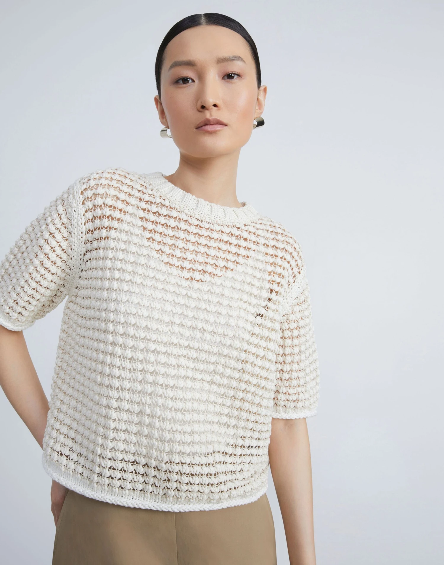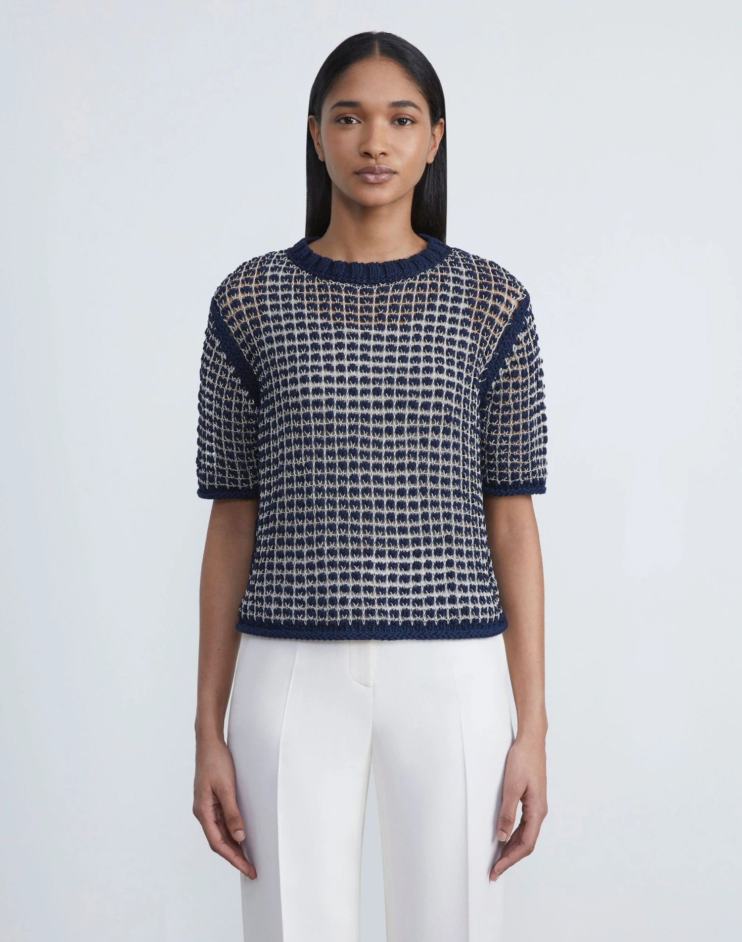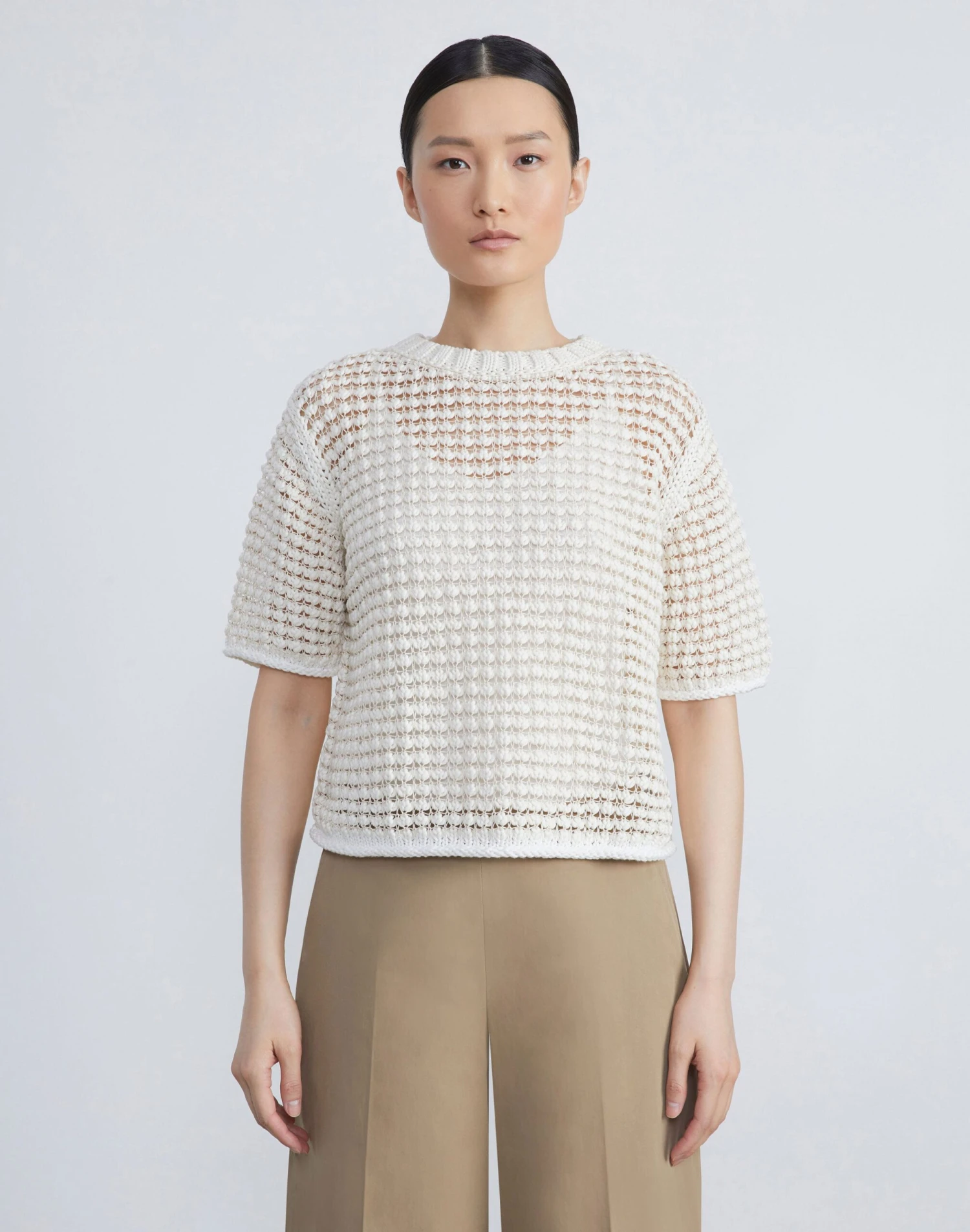 Lustrous silk and mercerized cotton yarns are met with impeccable craft in this short sleeve sweater, meticulously knit in a bi-color open-net stitch with airy dimension. The boxy, relaxed fit is cropped at the hip and finished with soft, rolled edges and solid ribbed trims.