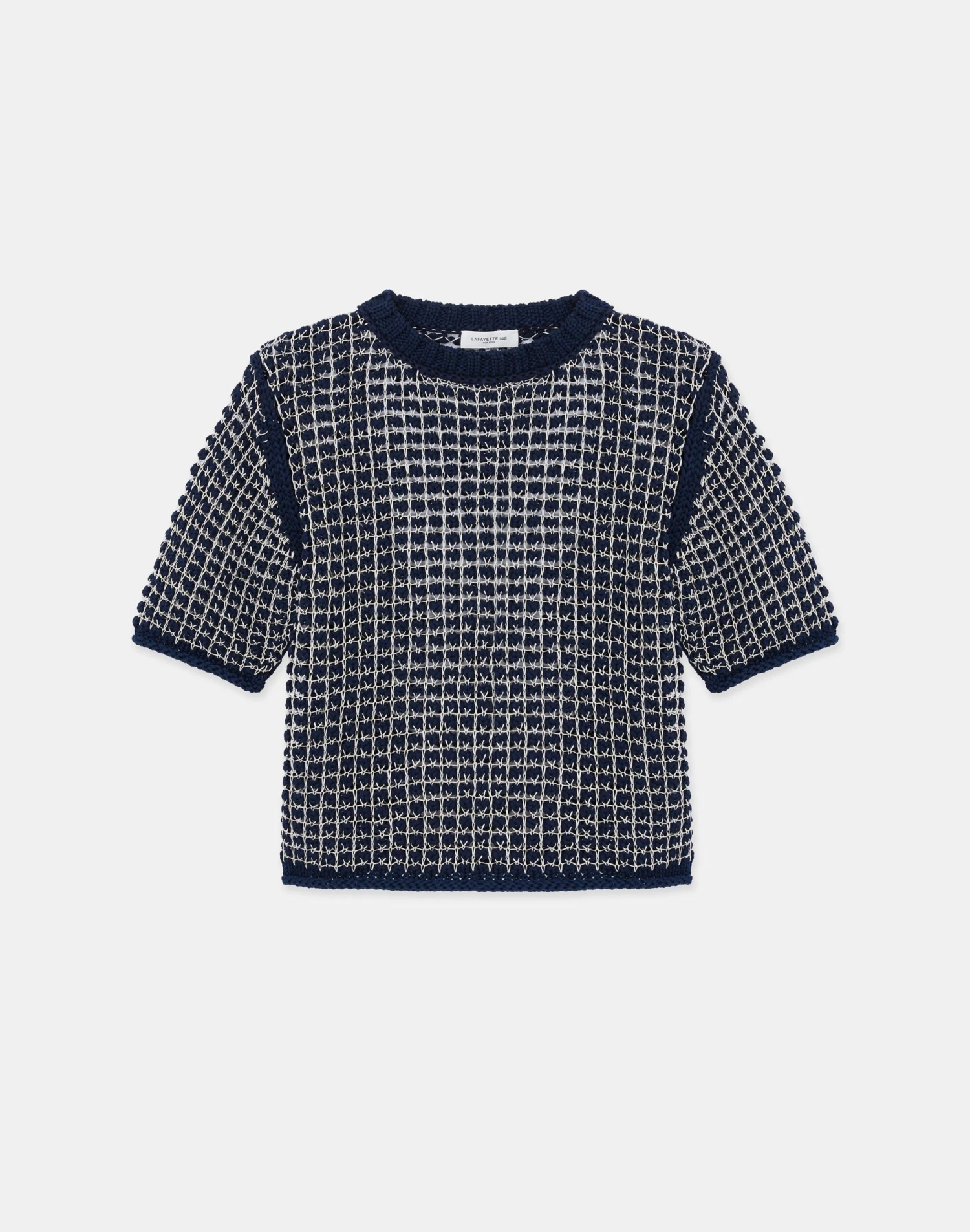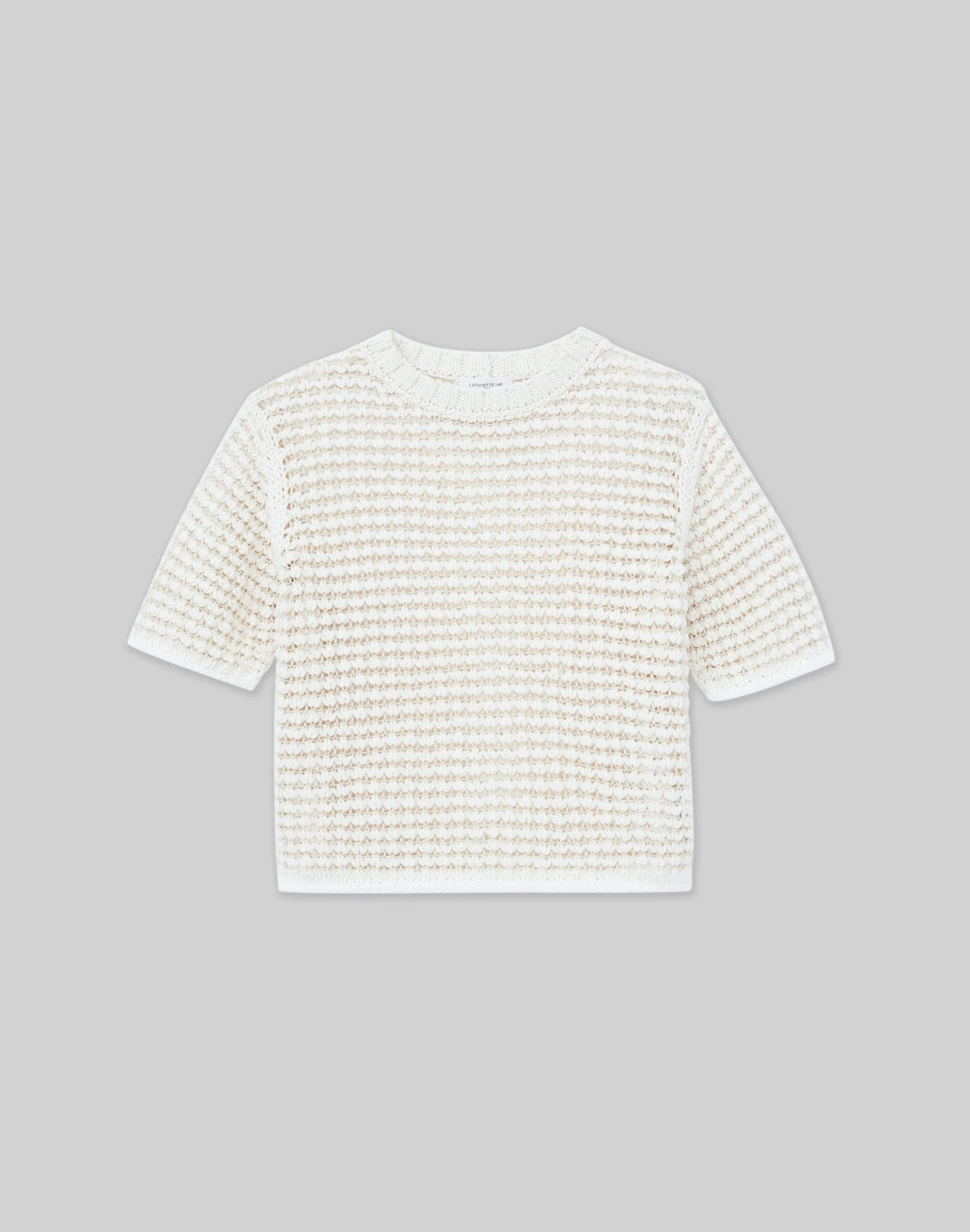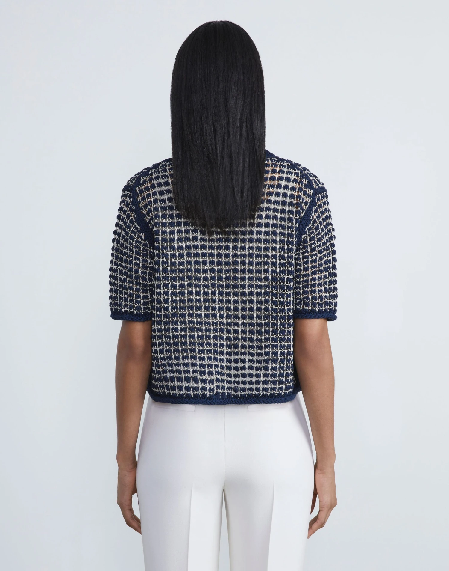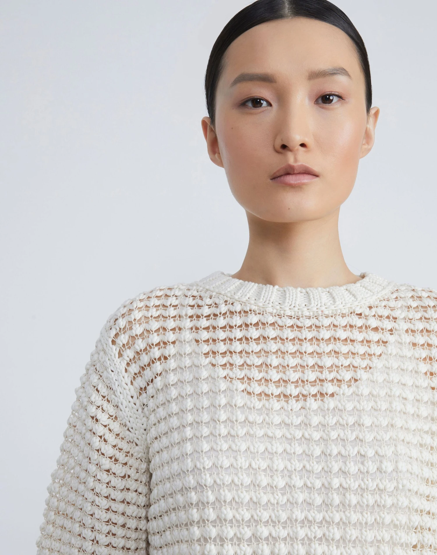 Lustrous silk and mercerized cotton yarns are met with impeccable craft in this short sleeve sweater, meticulously knit in a bi-color open-net stitch with airy dimension. The boxy, relaxed fit is cropped at the hip and finished with soft, rolled edges and solid ribbed trims.