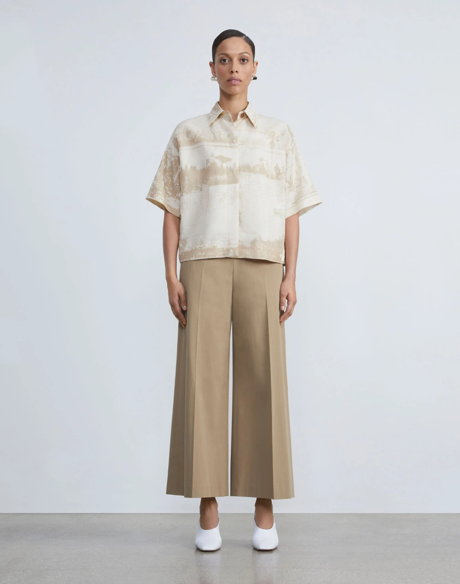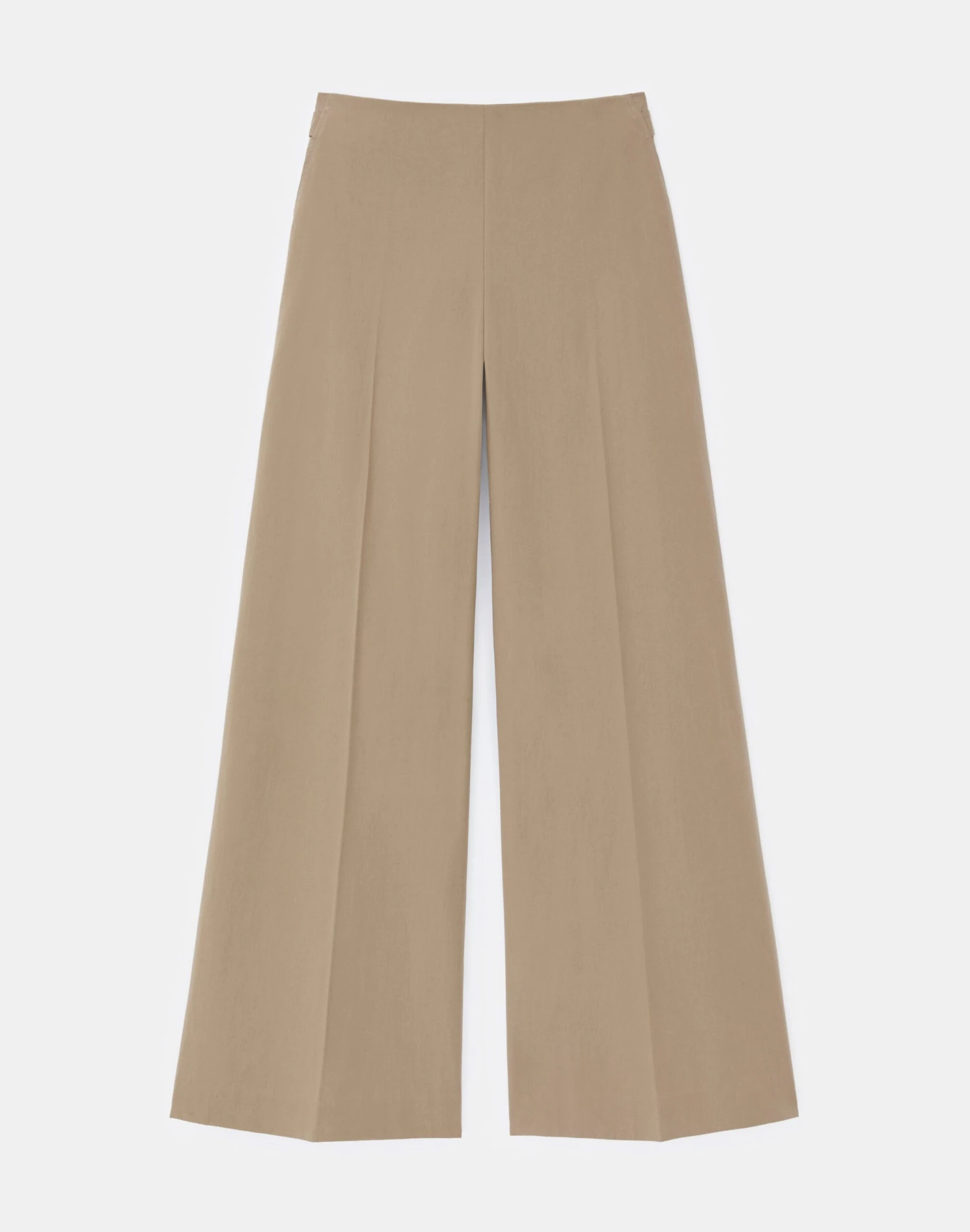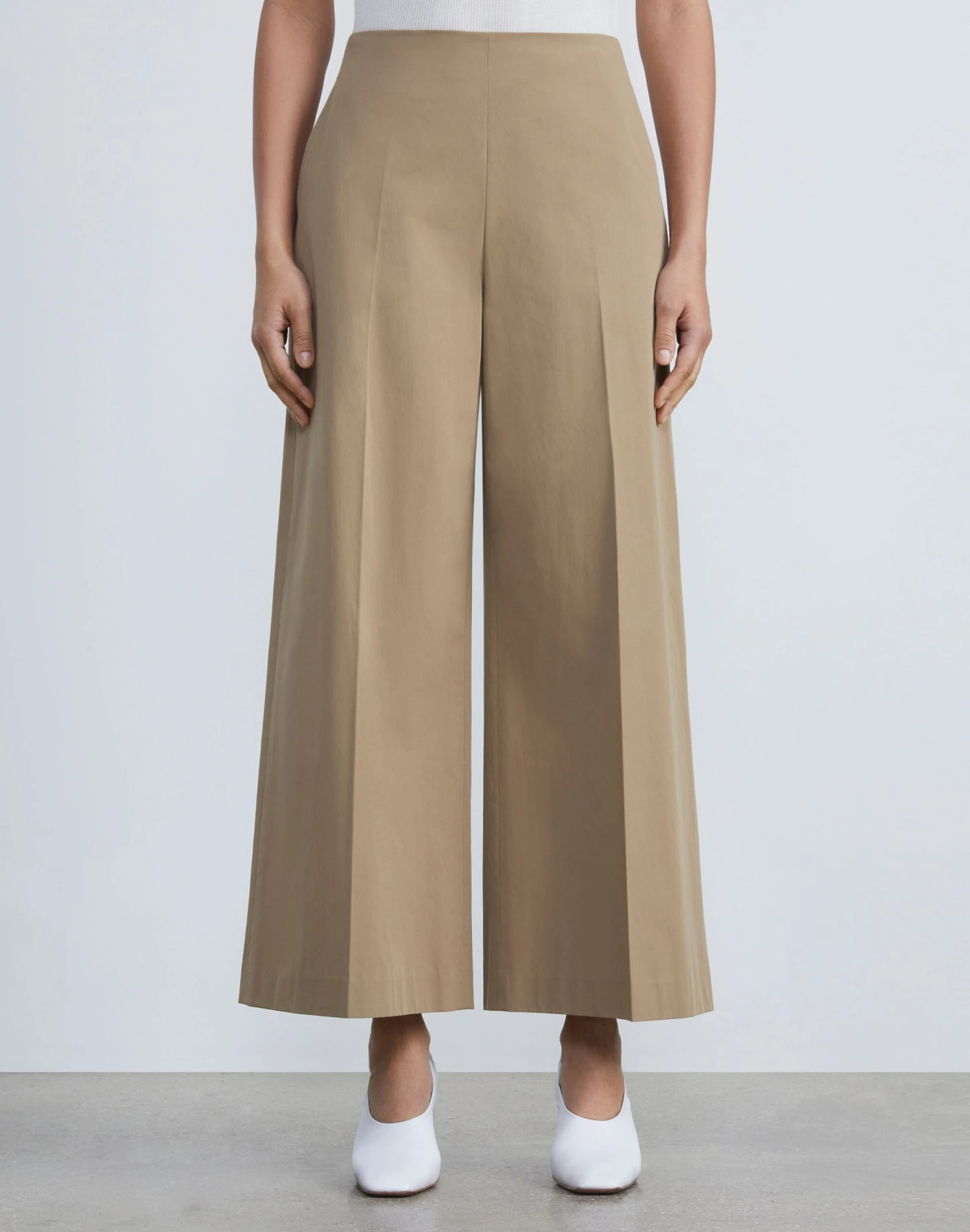 New to Lafayette 148’s pant collection, the Bowery features a wide leg and side buckle tabs merging modern proportions with postal uniform details—key to the Pre-Fall 2023 design aesthetic. Expertly crafted from lightweight Italian cotton twill, the flat front design is tailored with back waist darts and finished with a hidden side zip and clean ankle crop.