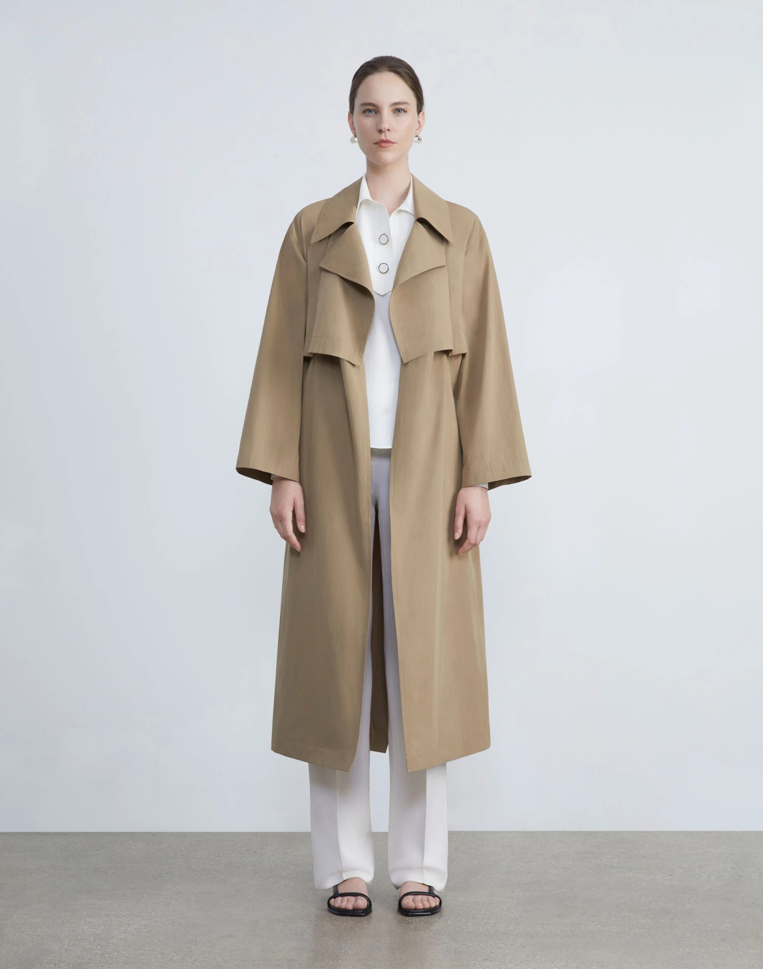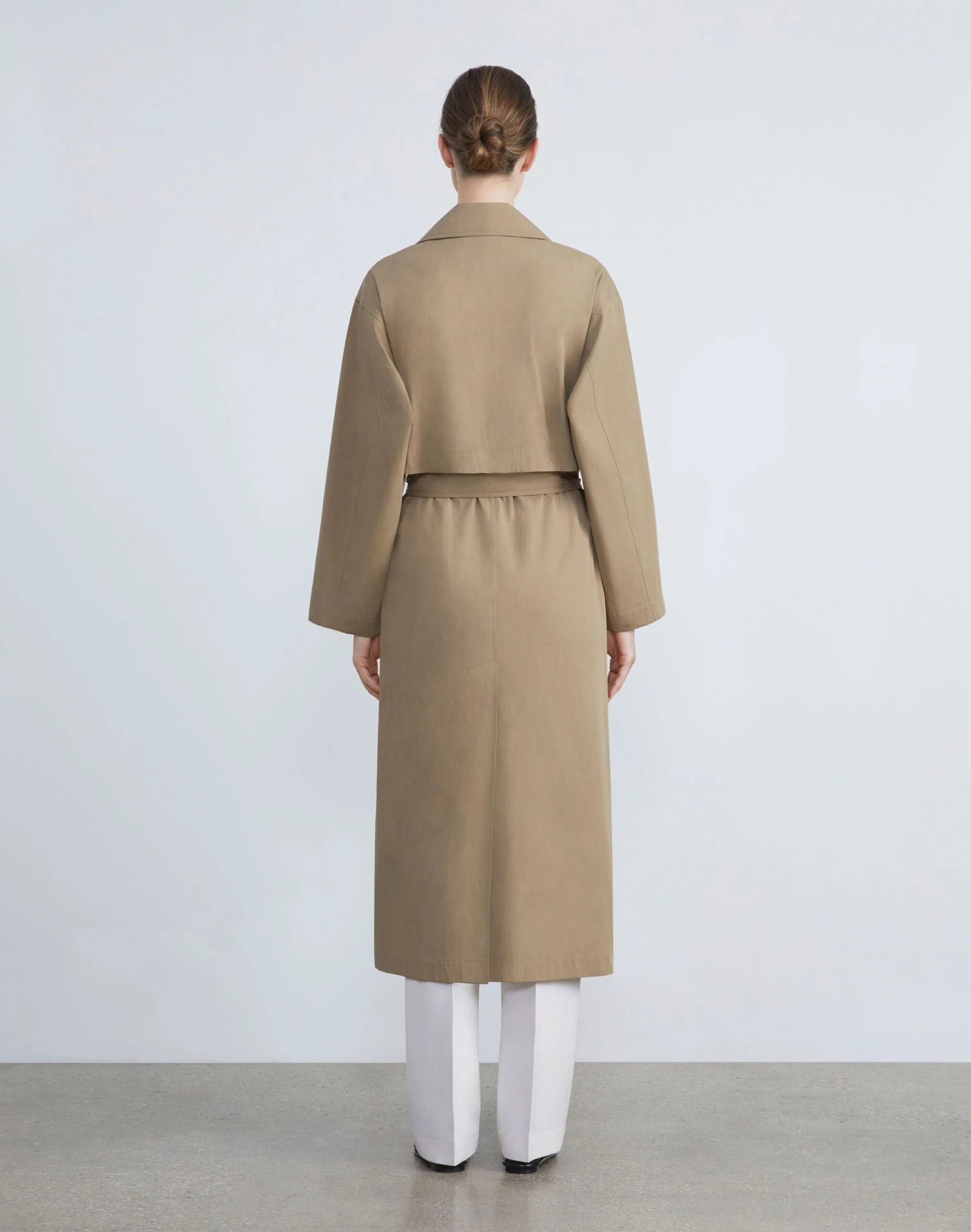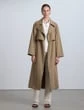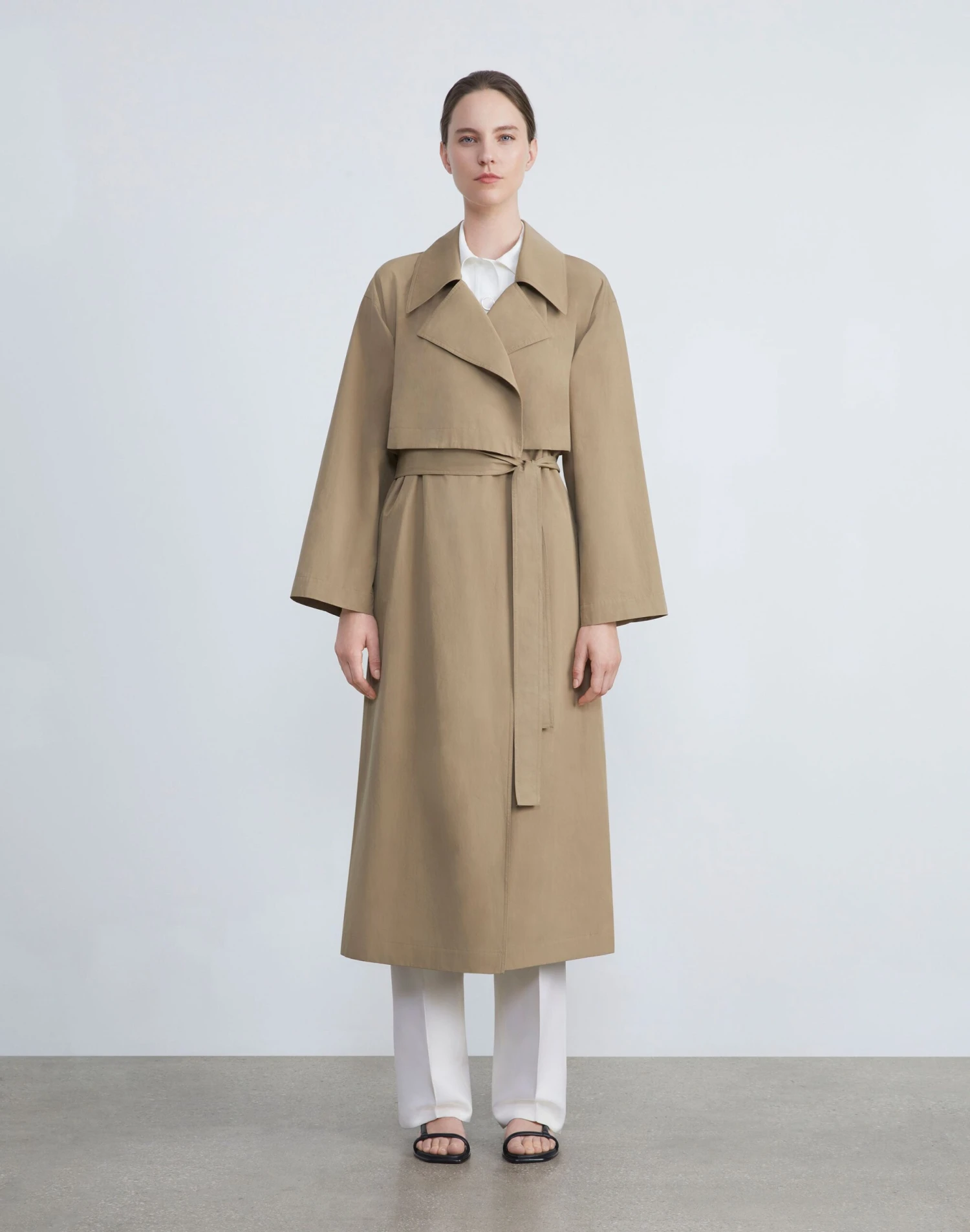 A study in modern design and versatile utility, the House’s trench coat is updated in lightweight Italian cotton twill with functional button detailing, rendering a convertible design that can be worn waist cropped or calf length. The oversized silhouette is traced with artisanal topstitching and features architectural, envelope-inspired notch lapels, drop shoulders, seam pockets and fastens with a self tie sash.
