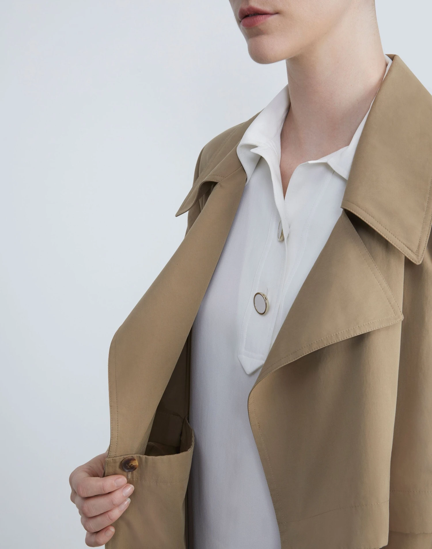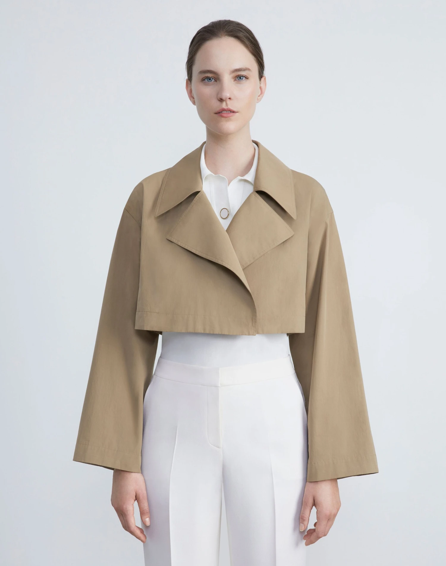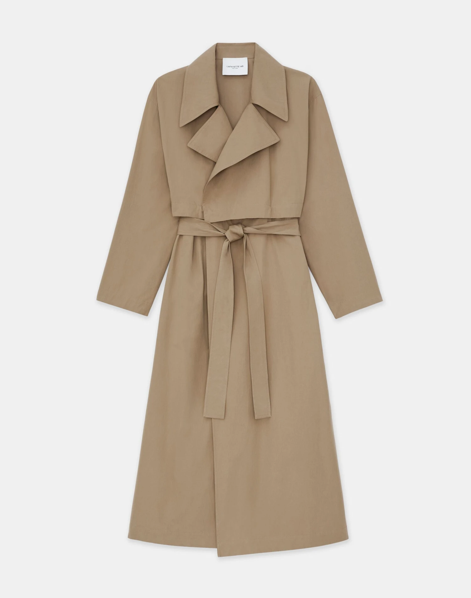 A study in modern design and versatile utility, the House’s trench coat is updated in lightweight Italian cotton twill with functional button detailing, rendering a convertible design that can be worn waist cropped or calf length. The oversized silhouette is traced with artisanal topstitching and features architectural, envelope-inspired notch lapels, drop shoulders, seam pockets and fastens with a self tie sash.