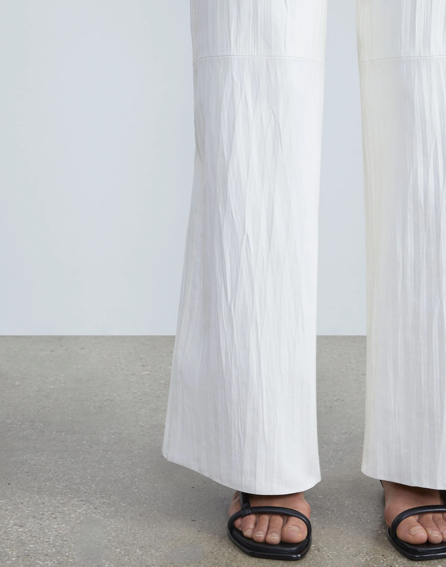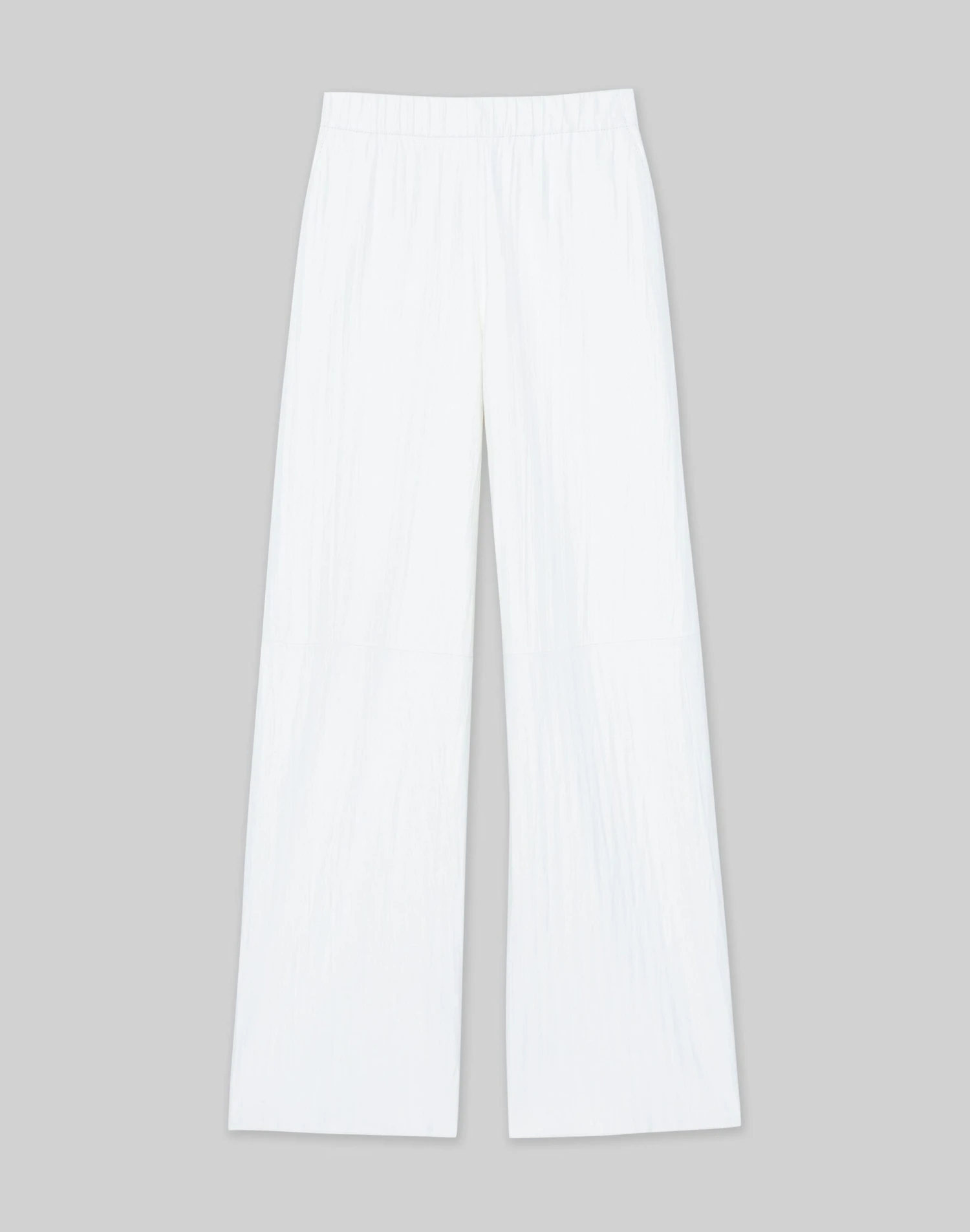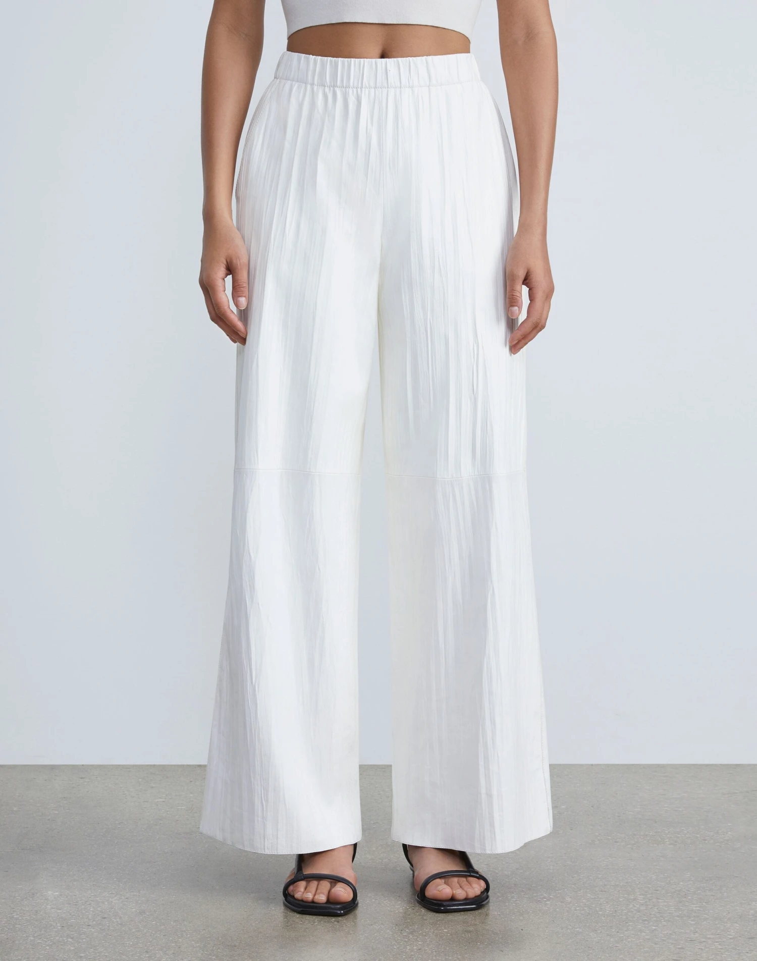 Sculptural form and artisanal craft transform the Riverside pant, cut from the finest tissue weight Italian lambskin masterfully twisted to create a delicate plissé effect. The pull-on design sits at the waist with a full, elongated leg and pairs with the coordinated —deftly translated into a luxurious leather lounge suit.
