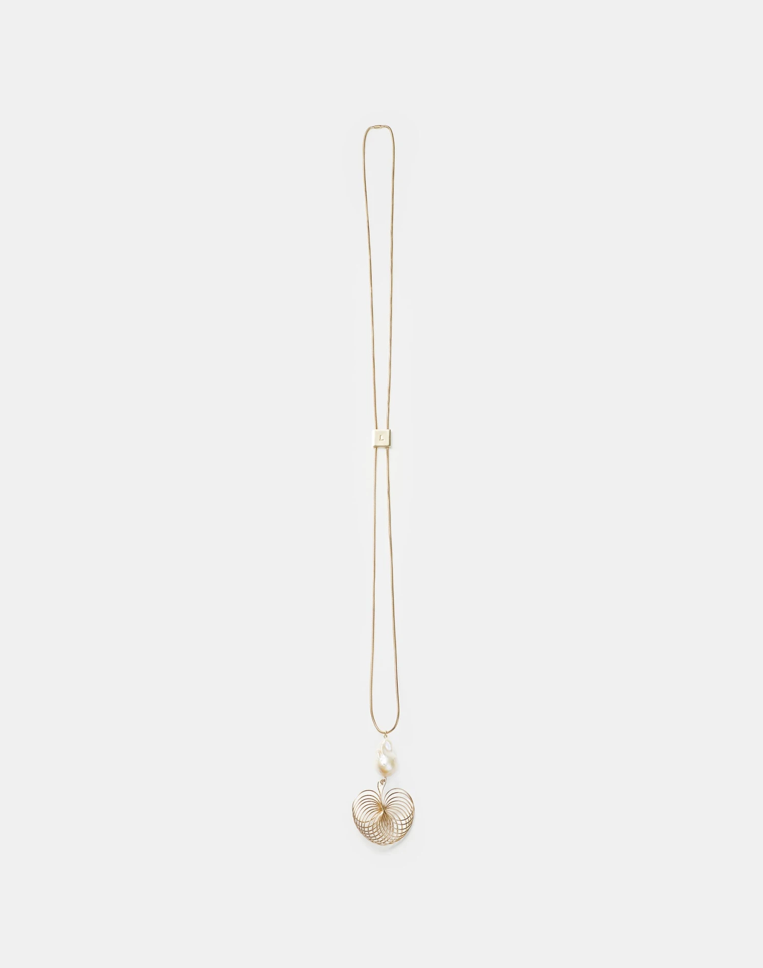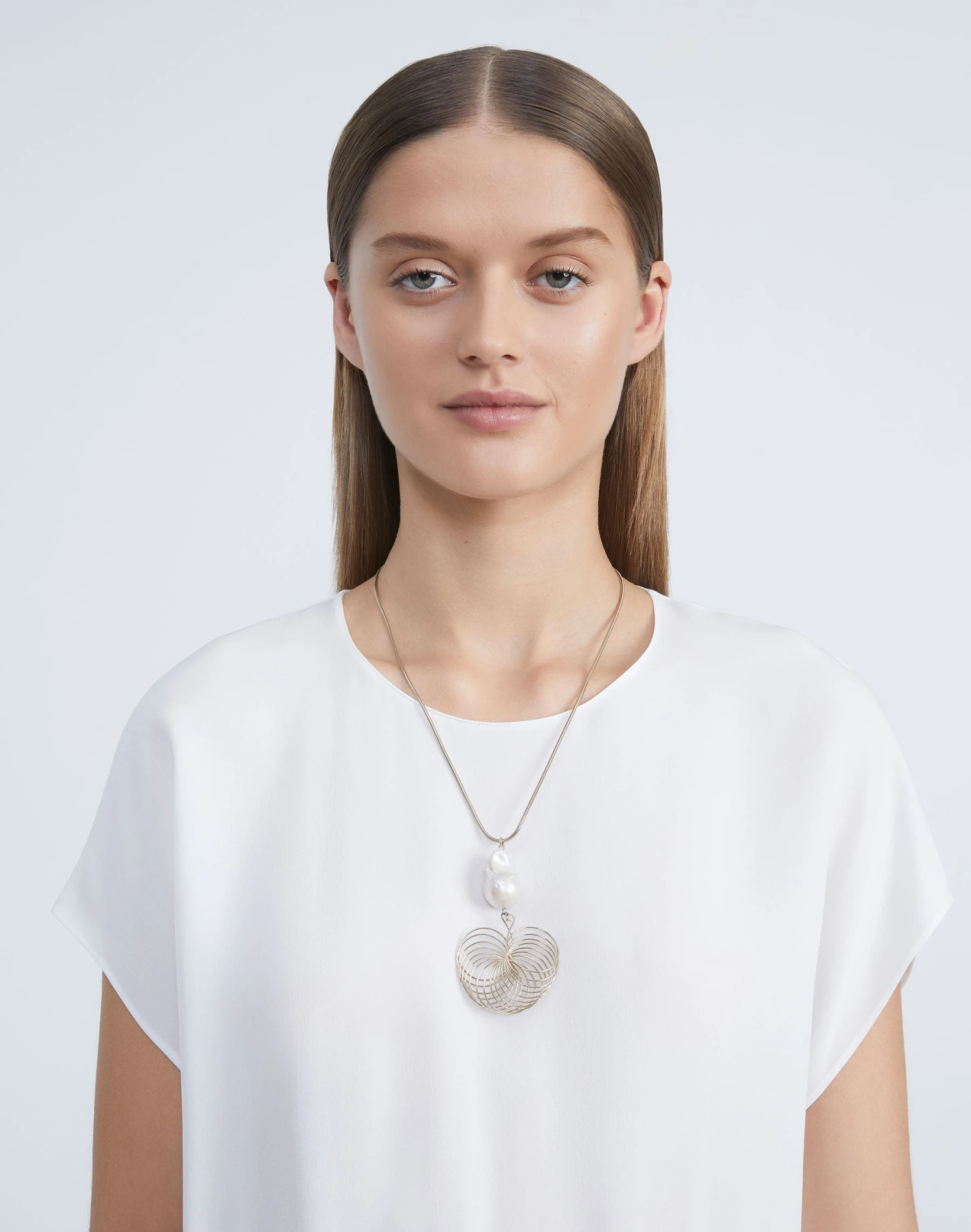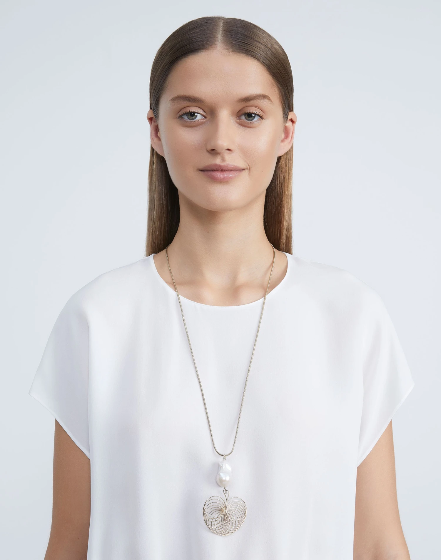 Italian artisanship and sculptural design fuse in this gold-plated metal necklace. Handcrafted to echo the organic lines of natural, oceanic elements, it’s set off with a luminous Baroque pearl and curvilinear filigree-effect pendant.