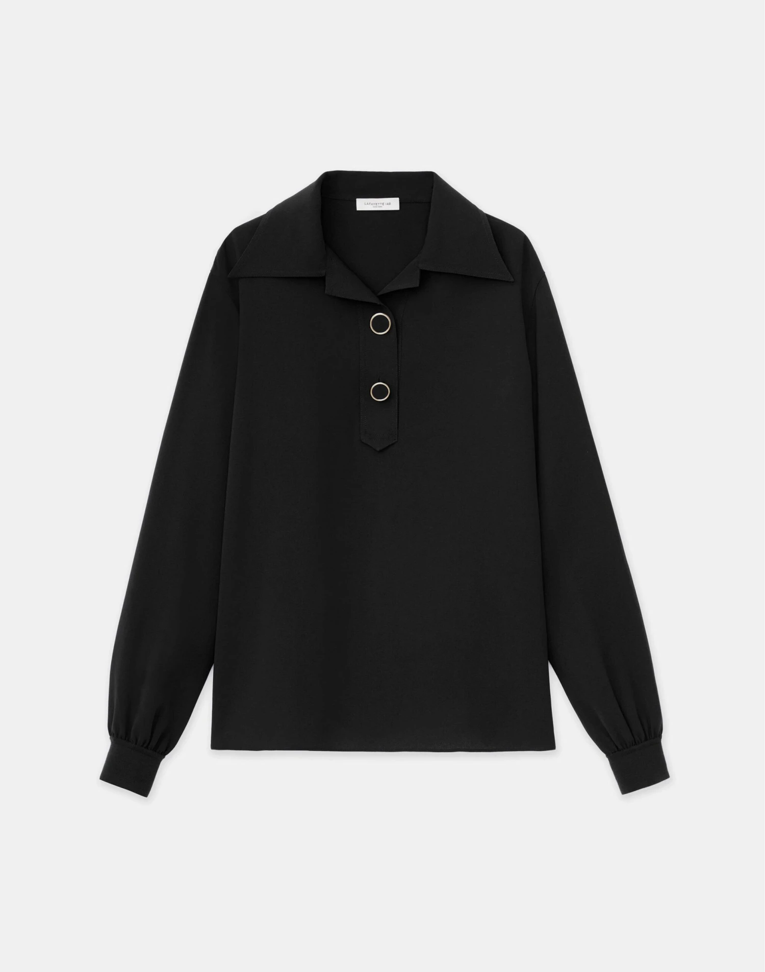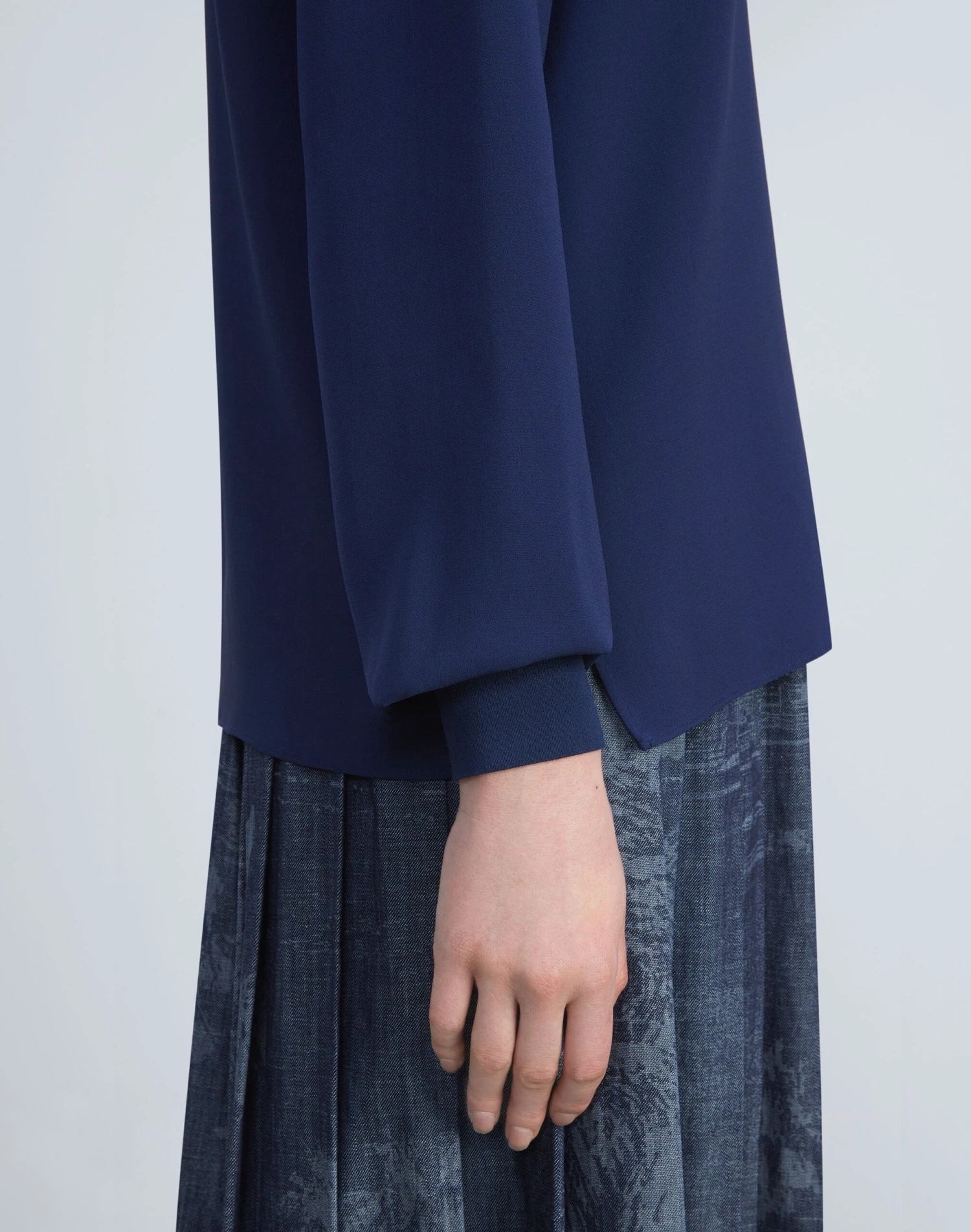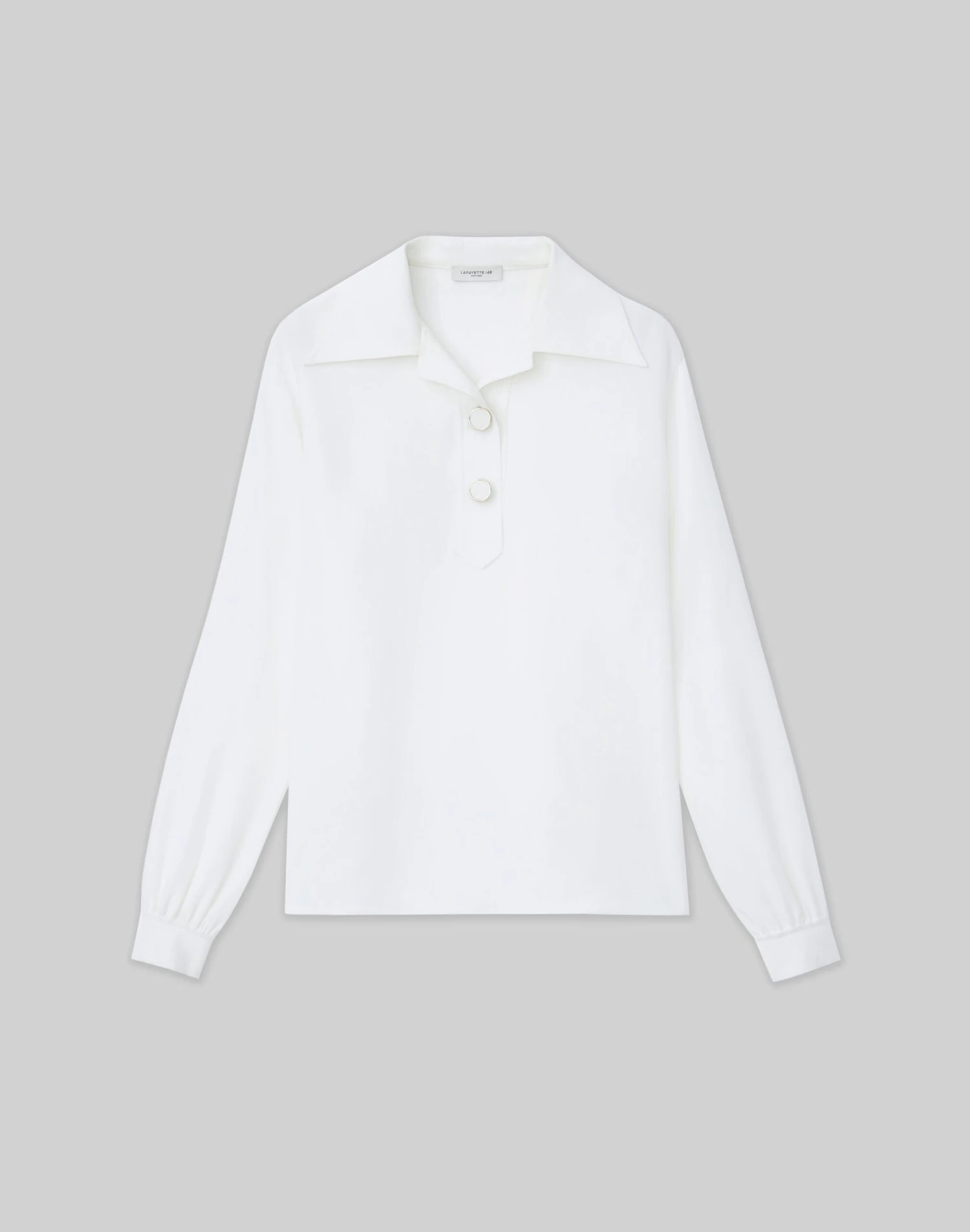 Redefining menswear codes with modern femininity, this long-sleeve blouse nods to the Pre-Fall 2023 collection’s tribute to ’70s tailoring with an oversized cutaway collar and fabric-covered, metal-traced buttons. House heritage Finesse Crepe lends fluidity through the straight silhouette, while ribbed cuffs add measured volume to the long sleeves.