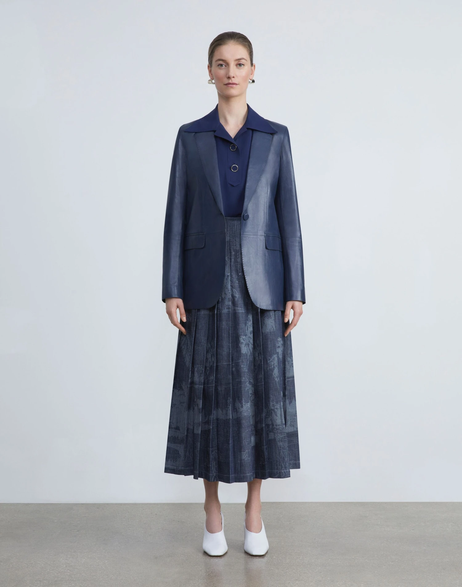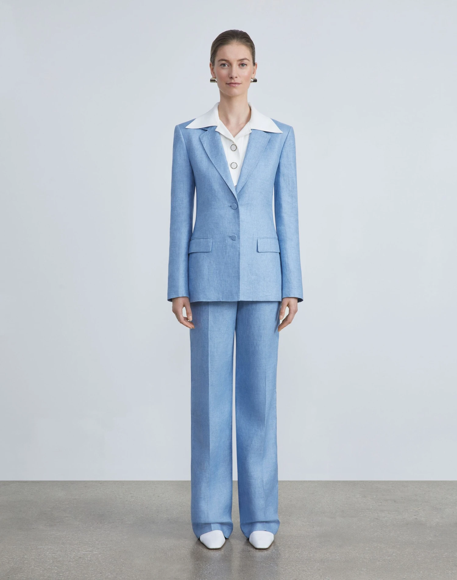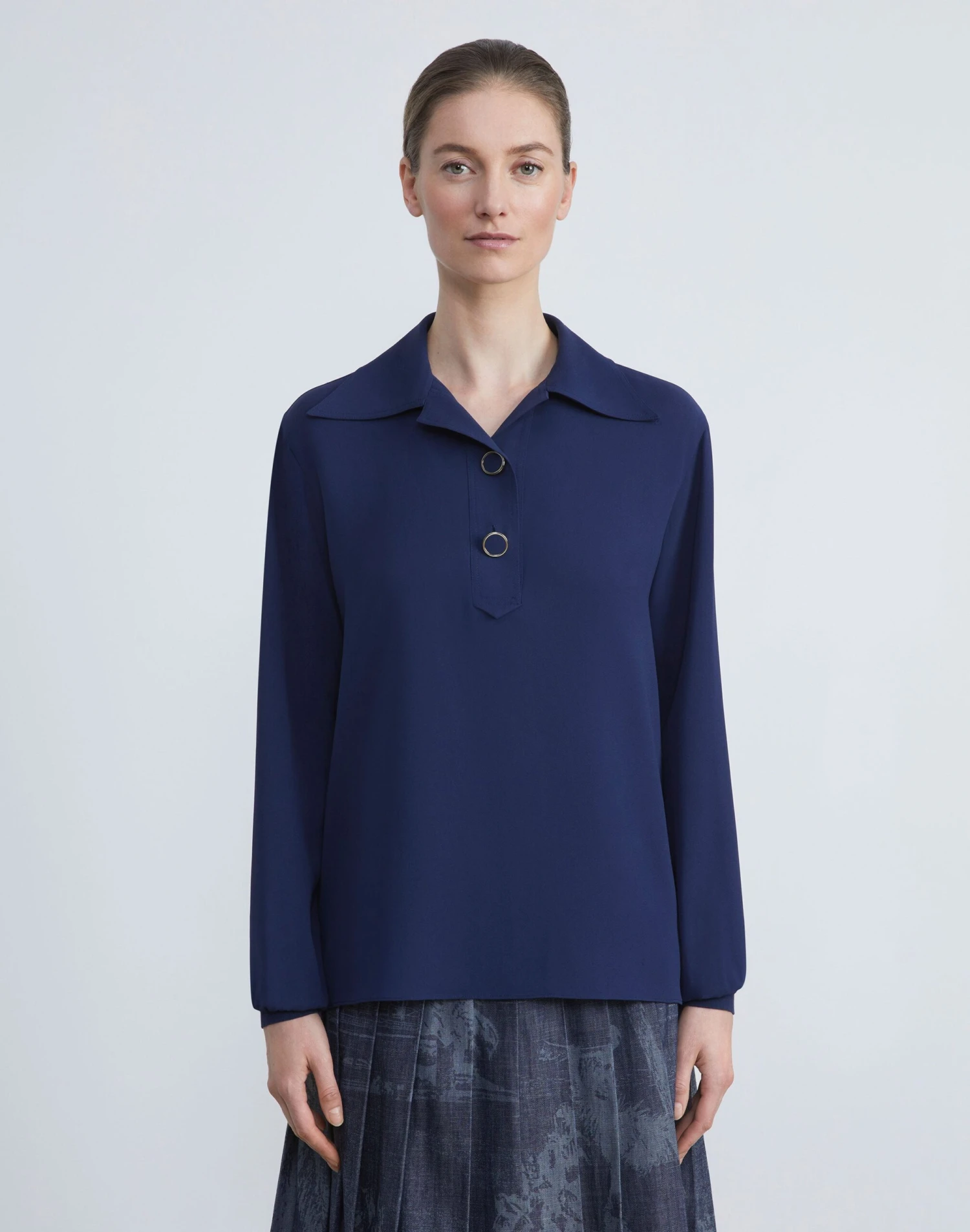 Redefining menswear codes with modern femininity, this long-sleeve blouse nods to the Pre-Fall 2023 collection’s tribute to ’70s tailoring with an oversized cutaway collar and fabric-covered, metal-traced buttons. House heritage Finesse Crepe lends fluidity through the straight silhouette, while ribbed cuffs add measured volume to the long sleeves.