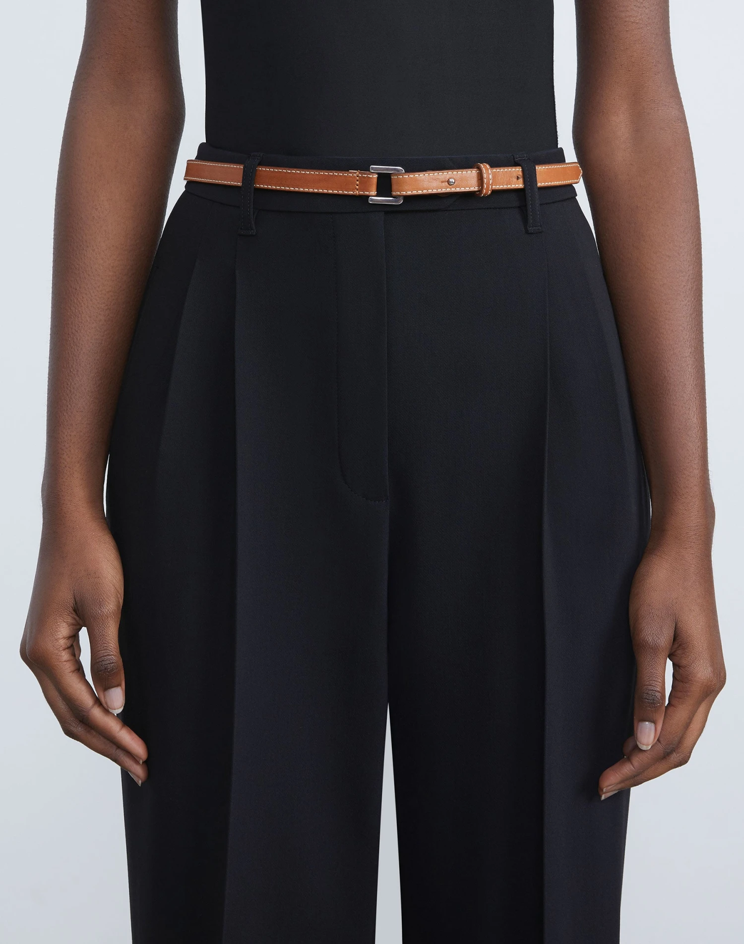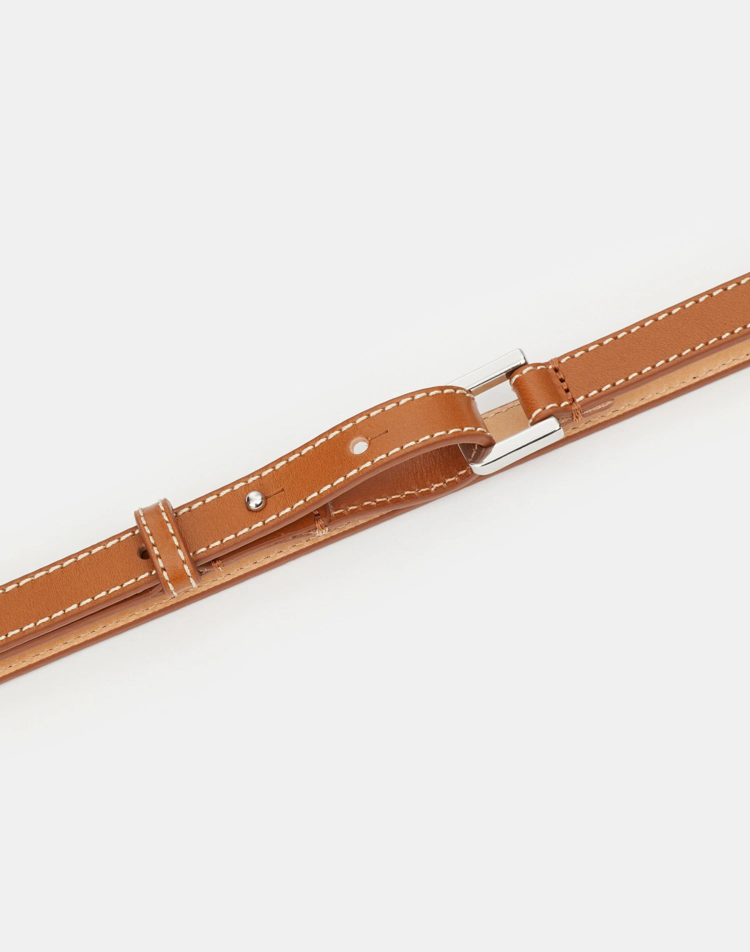 Hand-crafted in rich, naturally-dyed vachetta leather, this skinny belt offers an understated nod to the Spring/Summer 2022 collection’s utilitarian-inspired designs. The leather tab with metal D-ring closure and hand-finished topstitching lend a workwear-inspired aesthetic to this artisanal piece.