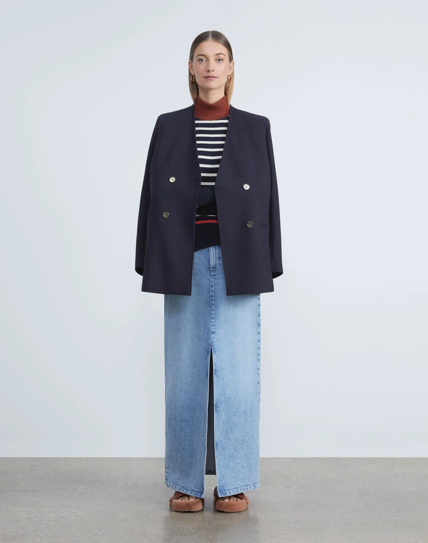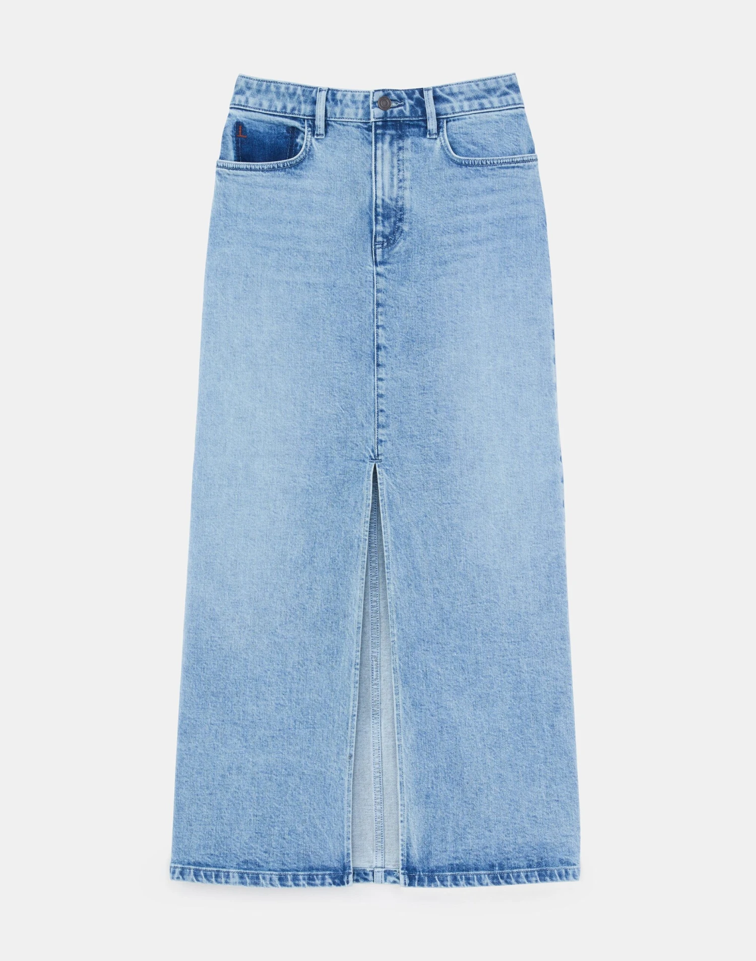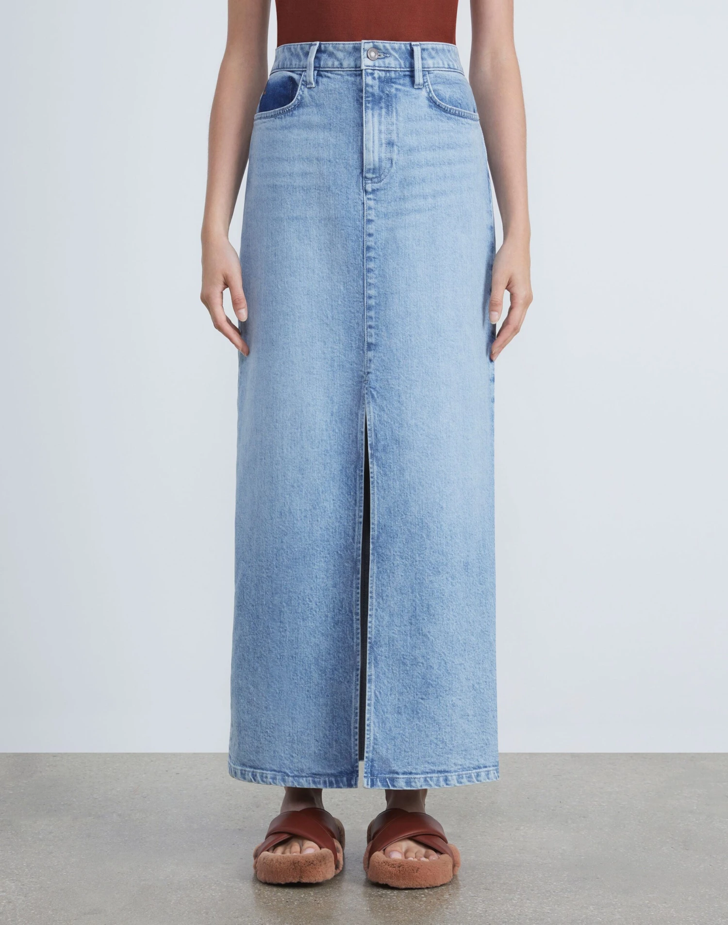 Contemporizing ’90s codes for today, this long denim skirt is transformed with a unique collage effect through patchwork construction and artisanal wash techniques, while an elongated front slit lends clean lines and ease of movement. It’s expertly crafted in the USA from L148’s signature Italian denim—a soft, yet structured cotton sourced from a legendary, sustainably-minded mill and hand-finished to achieve the unique highs and lows that make each piece truly one-of-a-kind.