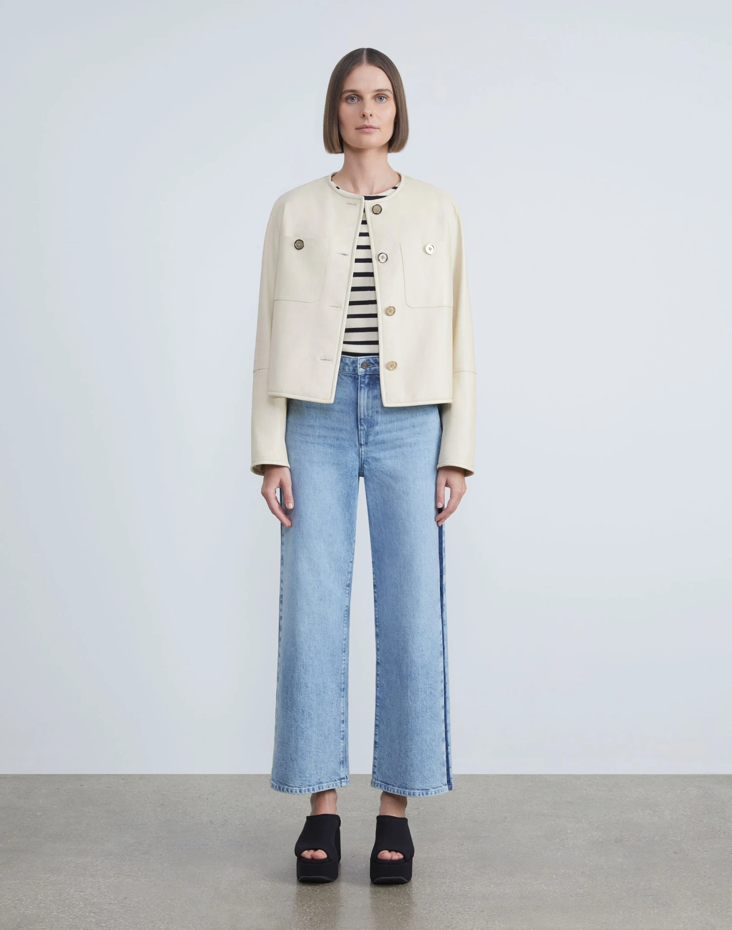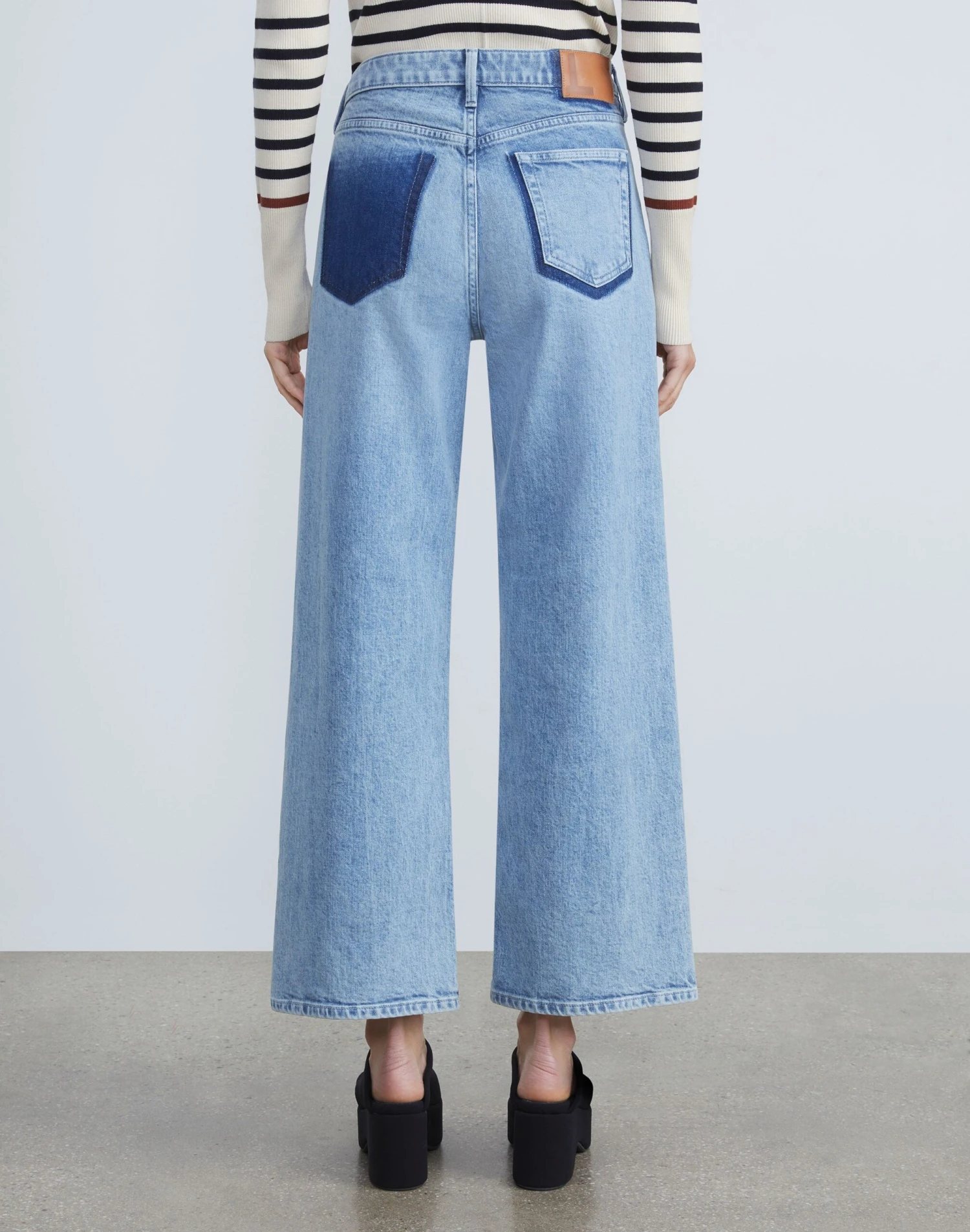 Lafayette’s signature Wyckoff jean is transformed with a unique collage effect through patchwork construction and artisanal wash techniques. This pair is made in the USA from the House’s heritage Italian denim—a soft yet structured cotton sourced from a legendary, sustainably-minded mill—and cut with a waist-sculpting high rise and cropped full leg.