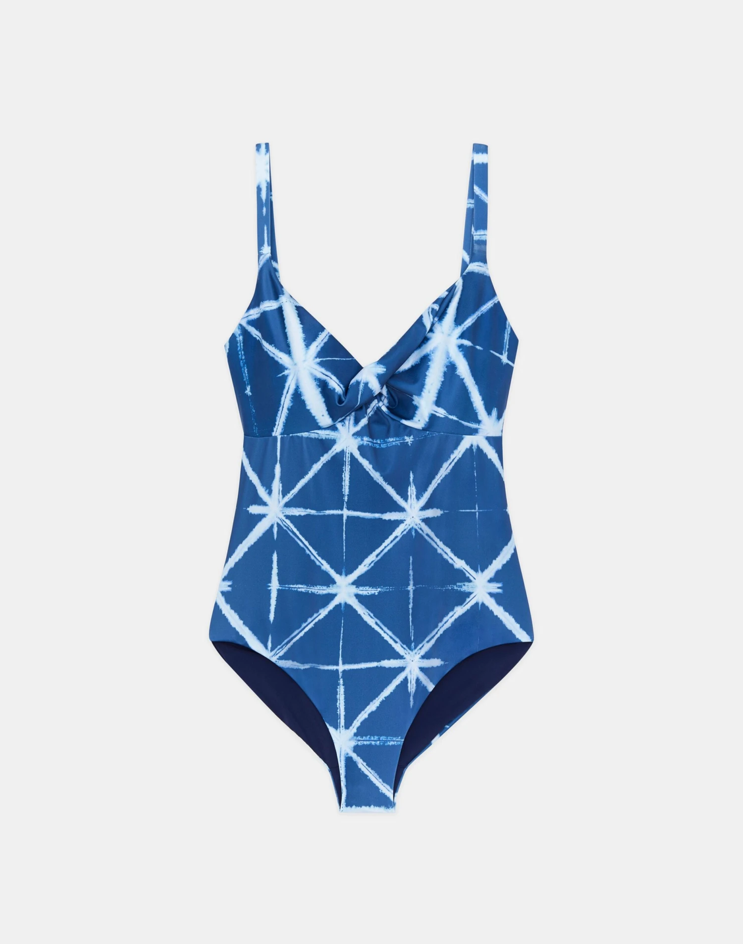 New from the L148 Swim collection, this one-piece translates Spring 2023’s Shibori-inspired technique through a geometric grid print on an innovative fine tech jersey, sustainably-crafted from reclaimed ocean plastics. The definitively feminine design features a twisted, V-neck bodice and a low-cut back with a sash tie finish.