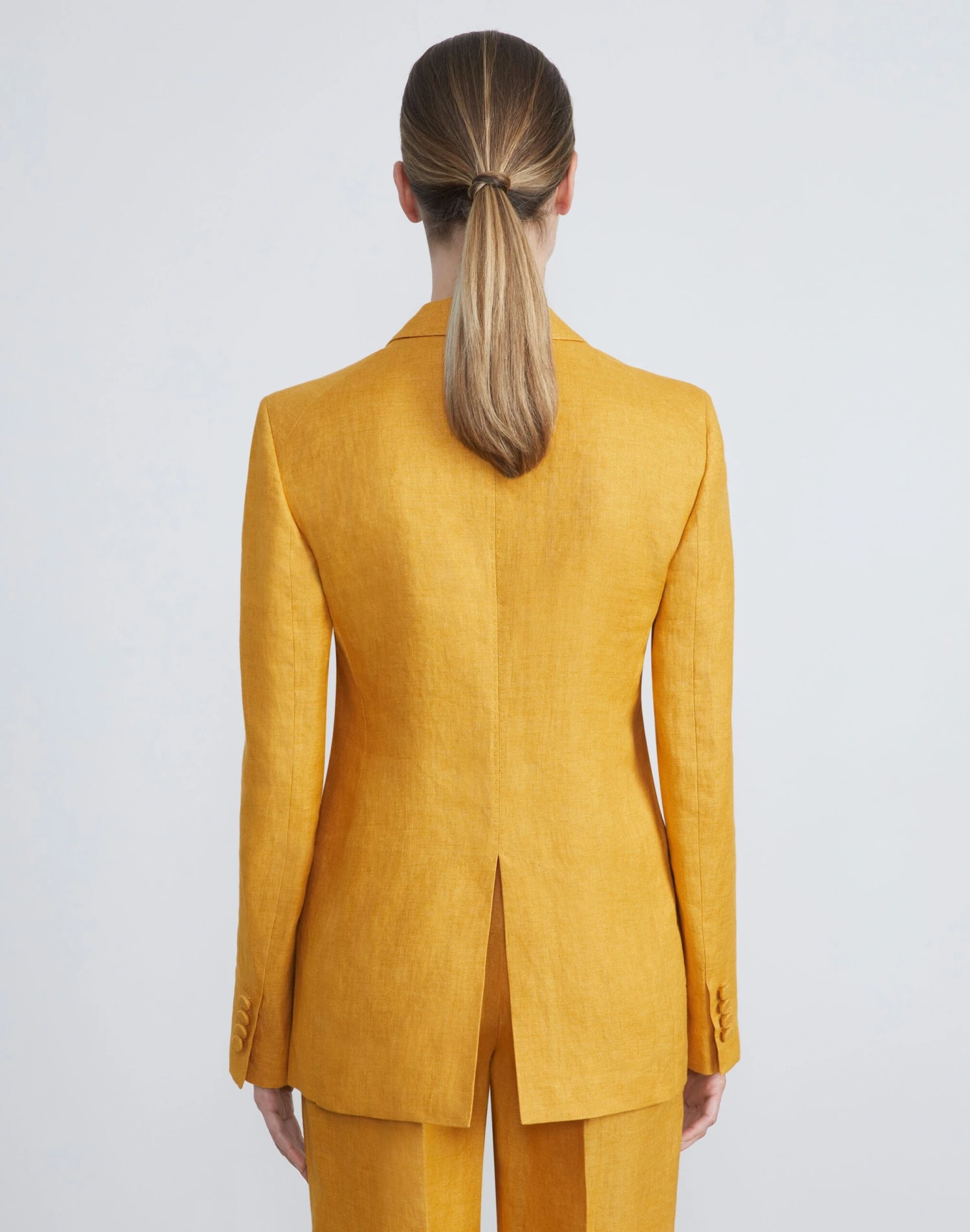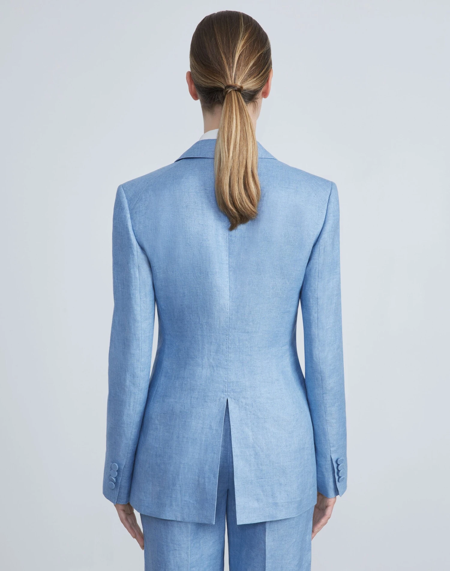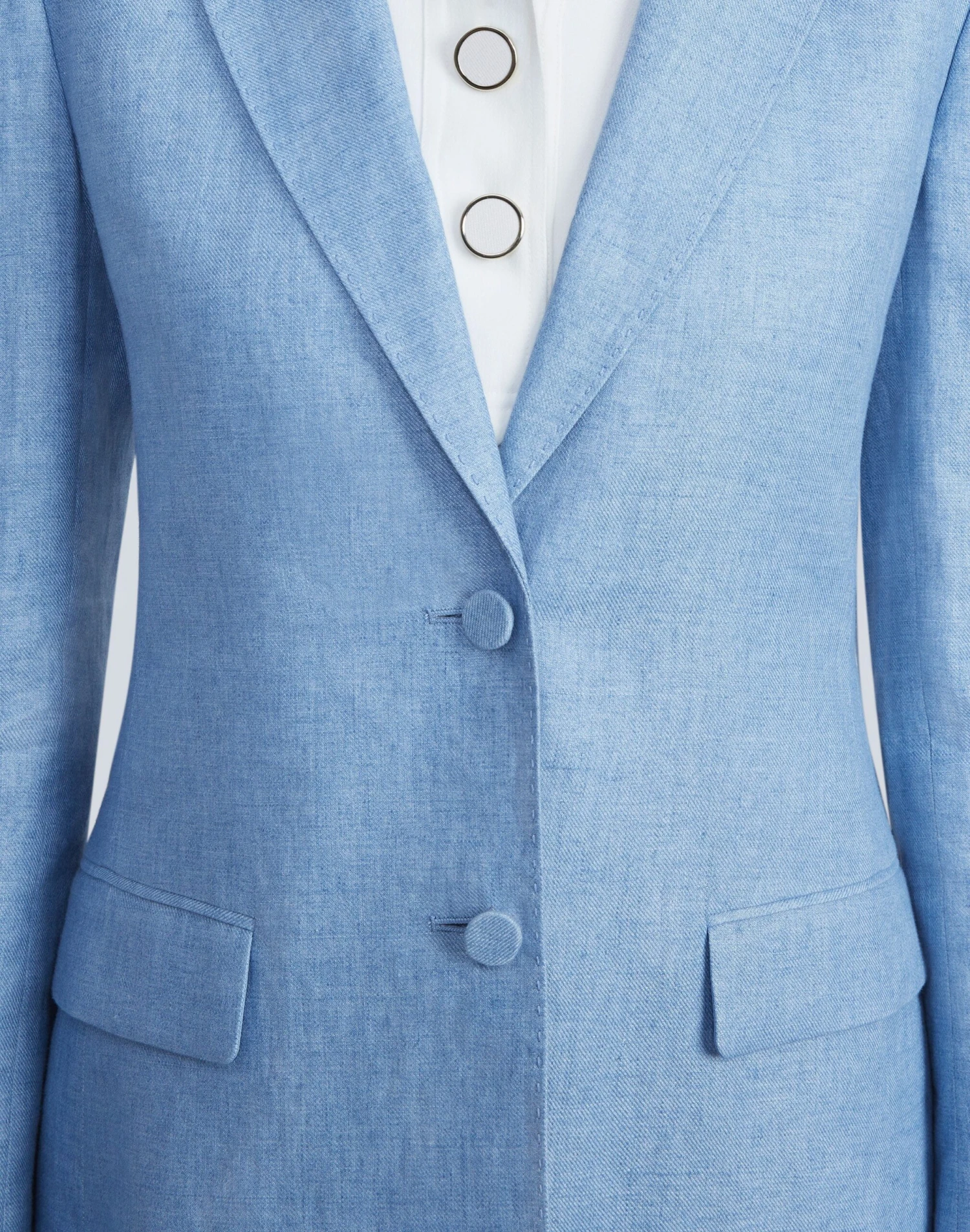 Precision cut and flawlessly finished, this two-button blazer reimagines classic menswear-inspired design with modern femininity. Rendered in lightweight Italian linen twill with a subtle mélange effect, the fitted silhouette is traced with artisanal pickstitching and features notched lapels, flap pockets and a split back vent.