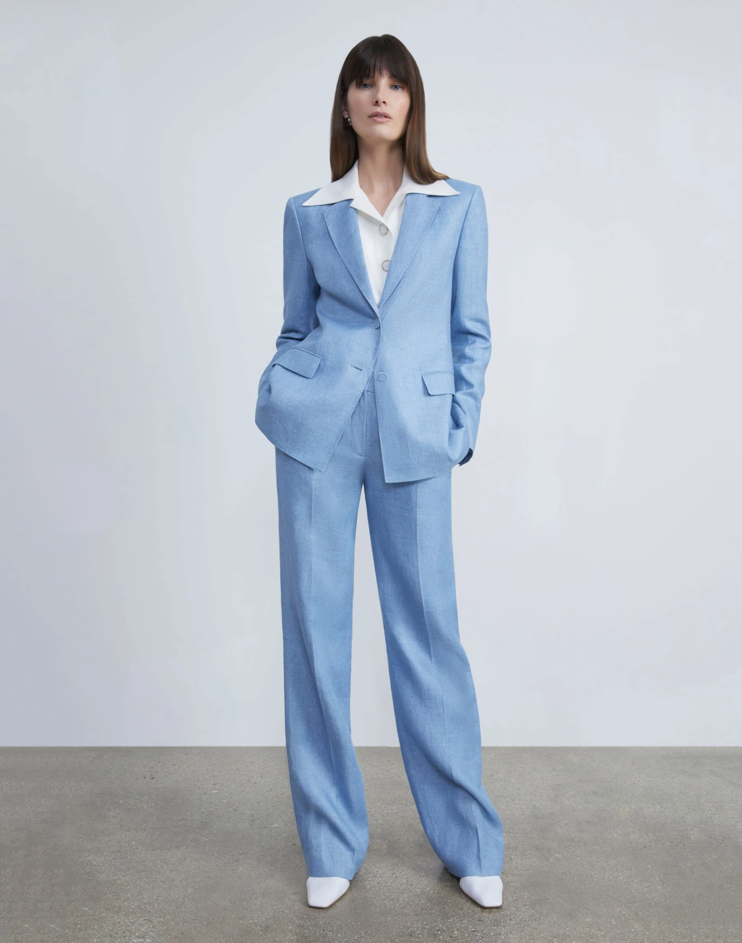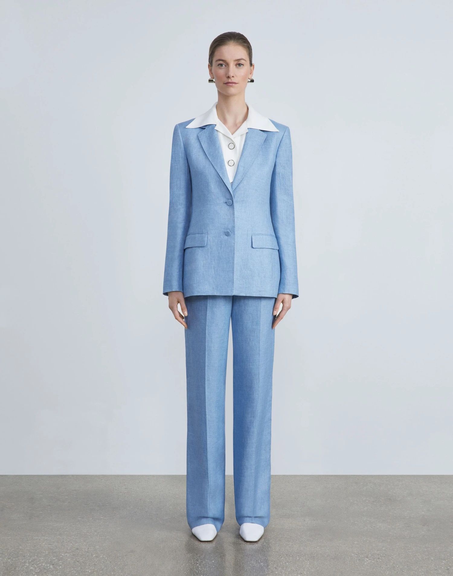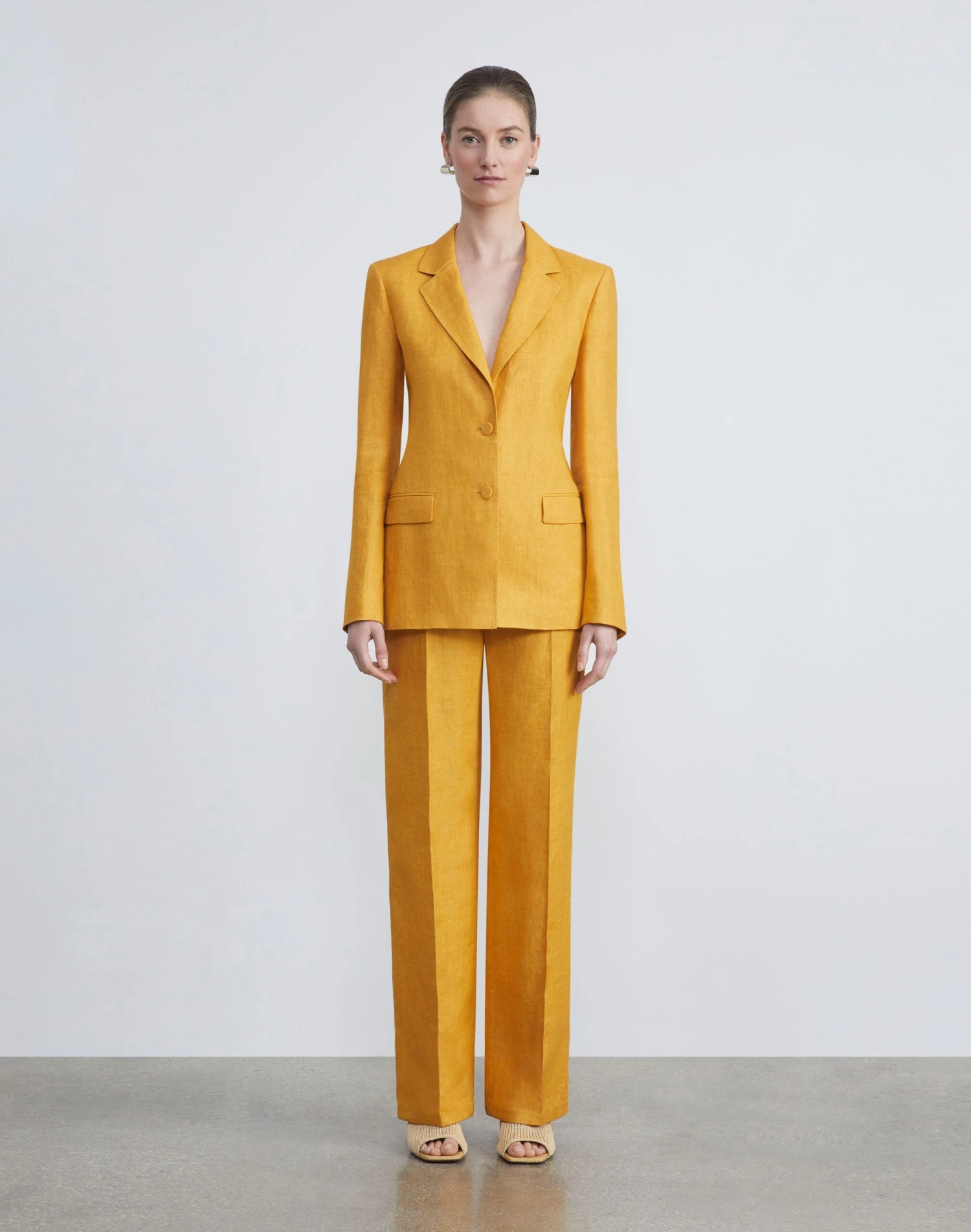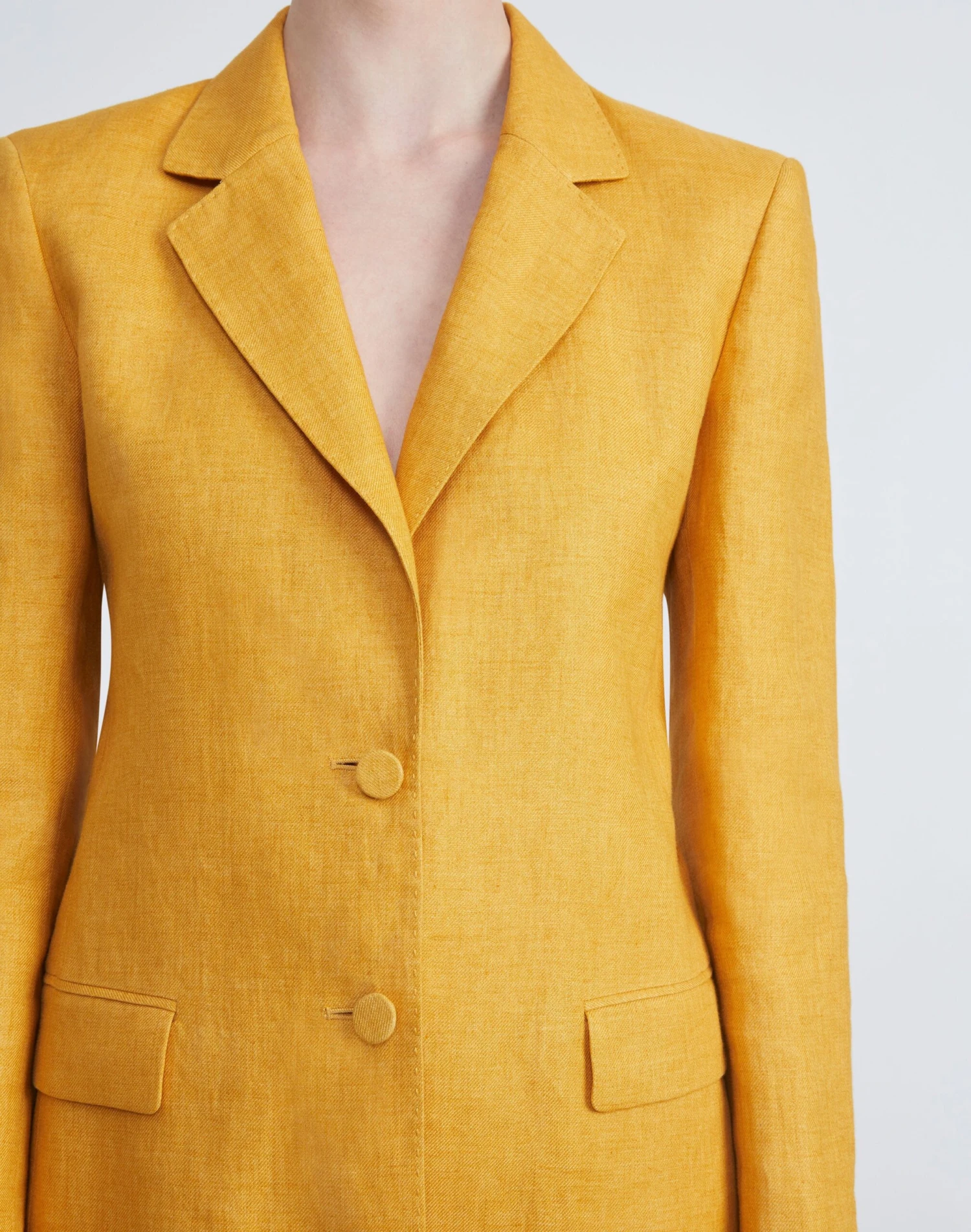 Precision cut and flawlessly finished, this two-button blazer reimagines classic menswear-inspired design with modern femininity. Rendered in lightweight Italian linen twill with a subtle mélange effect, the fitted silhouette is traced with artisanal pickstitching and features notched lapels, flap pockets and a split back vent.