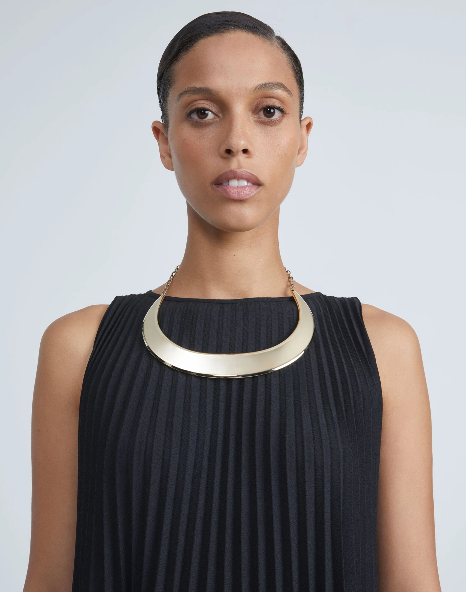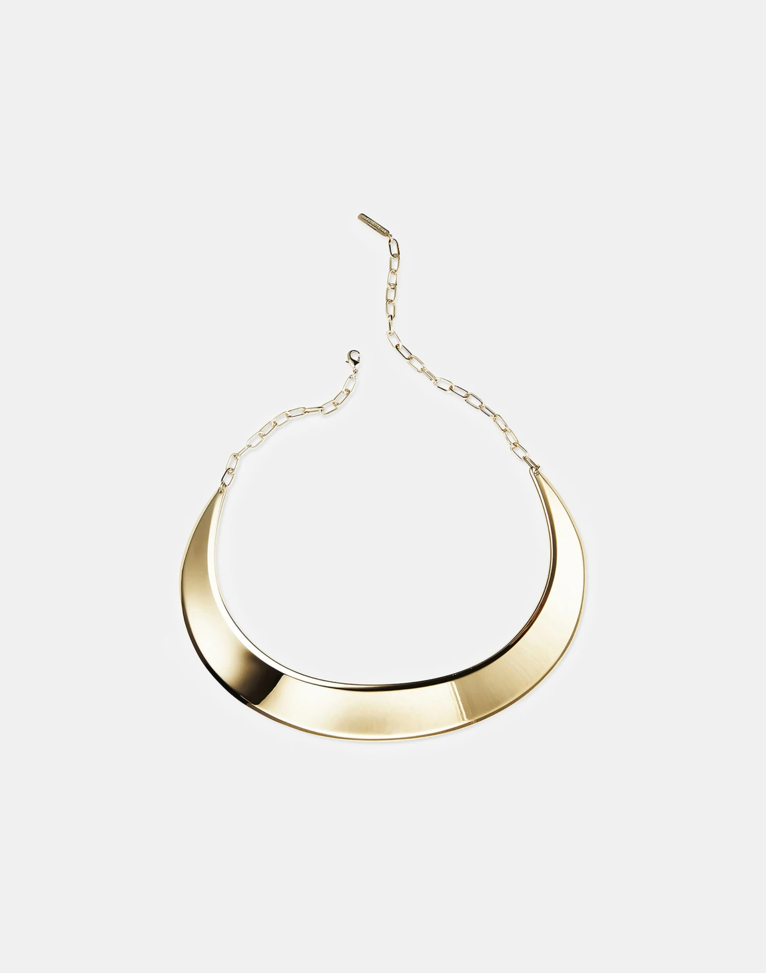 Sculpted in a minimalist collar, this Italian-crafted necklace curves around the neck in a perfect crest with smooth, beveled edges. The brass design is polished in light gold and with a chain-link closure for wearing short or long. Pair it with the Lune and .