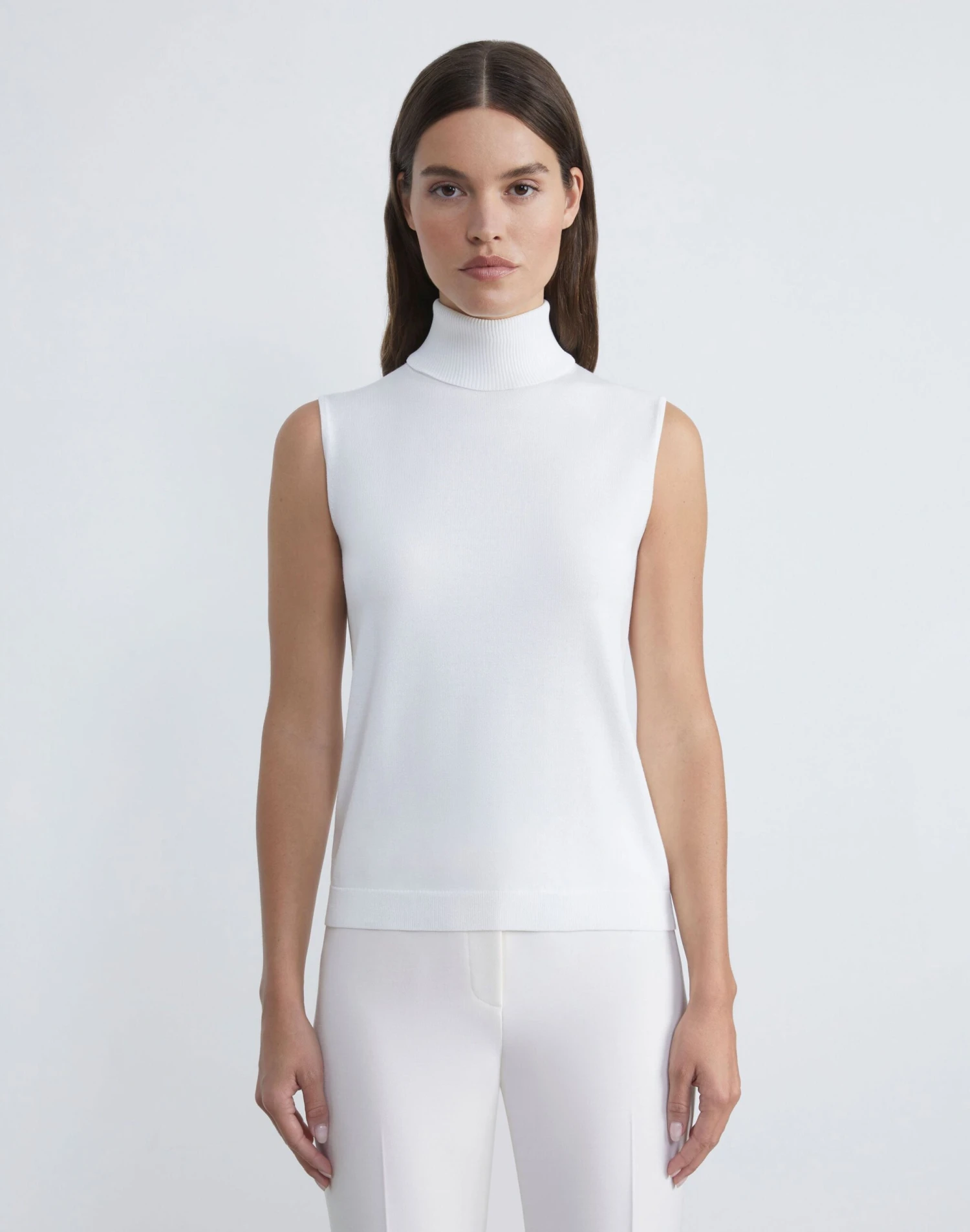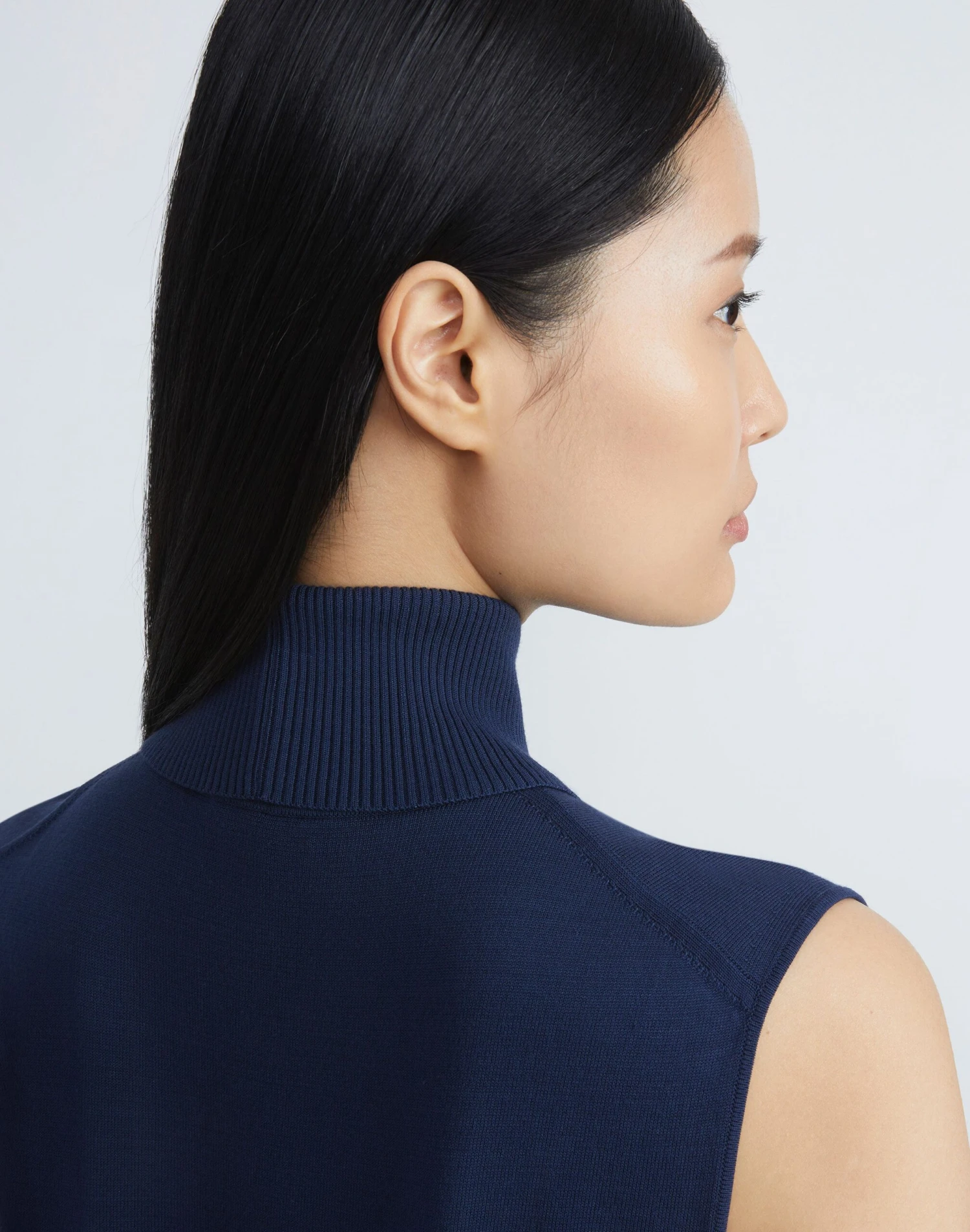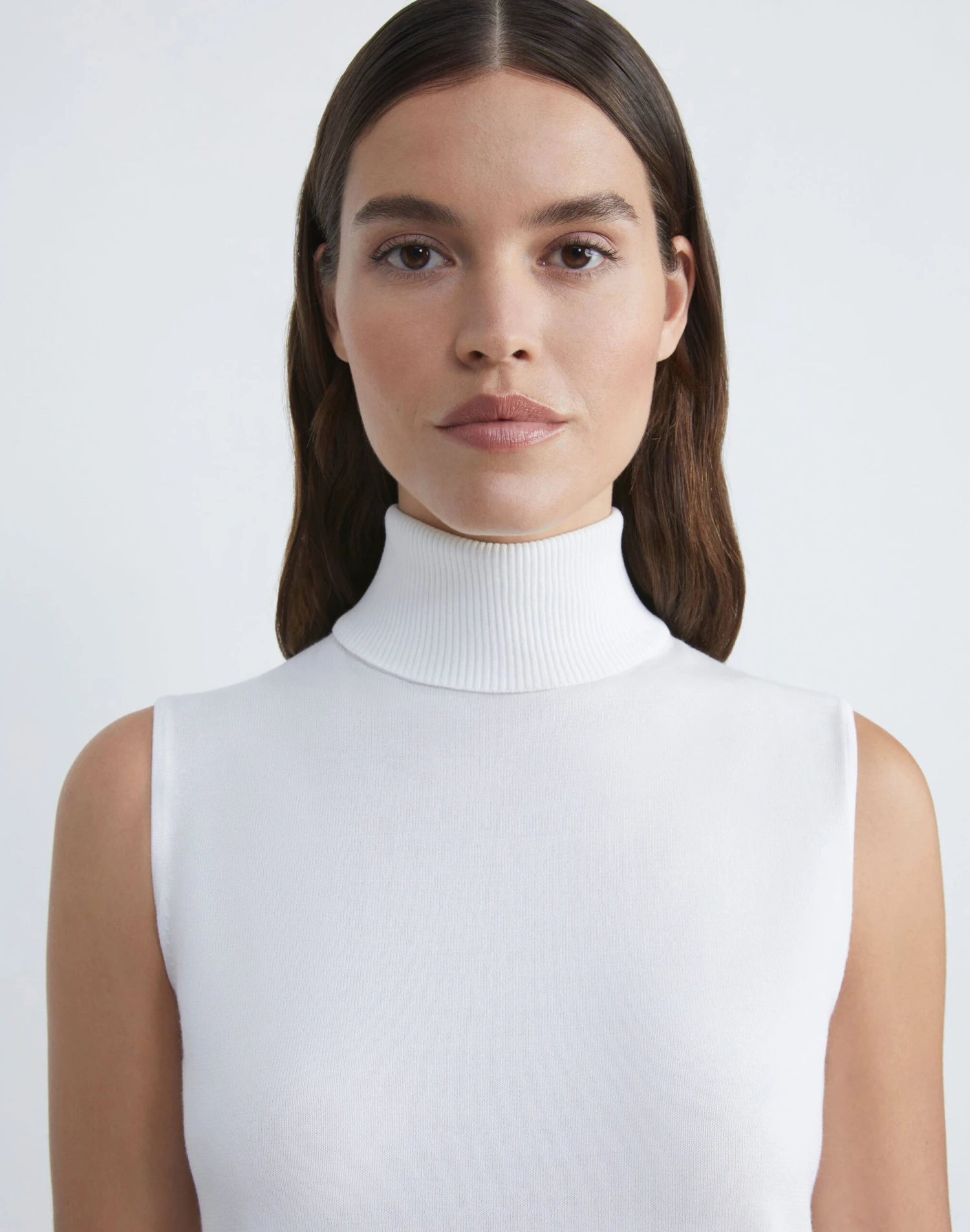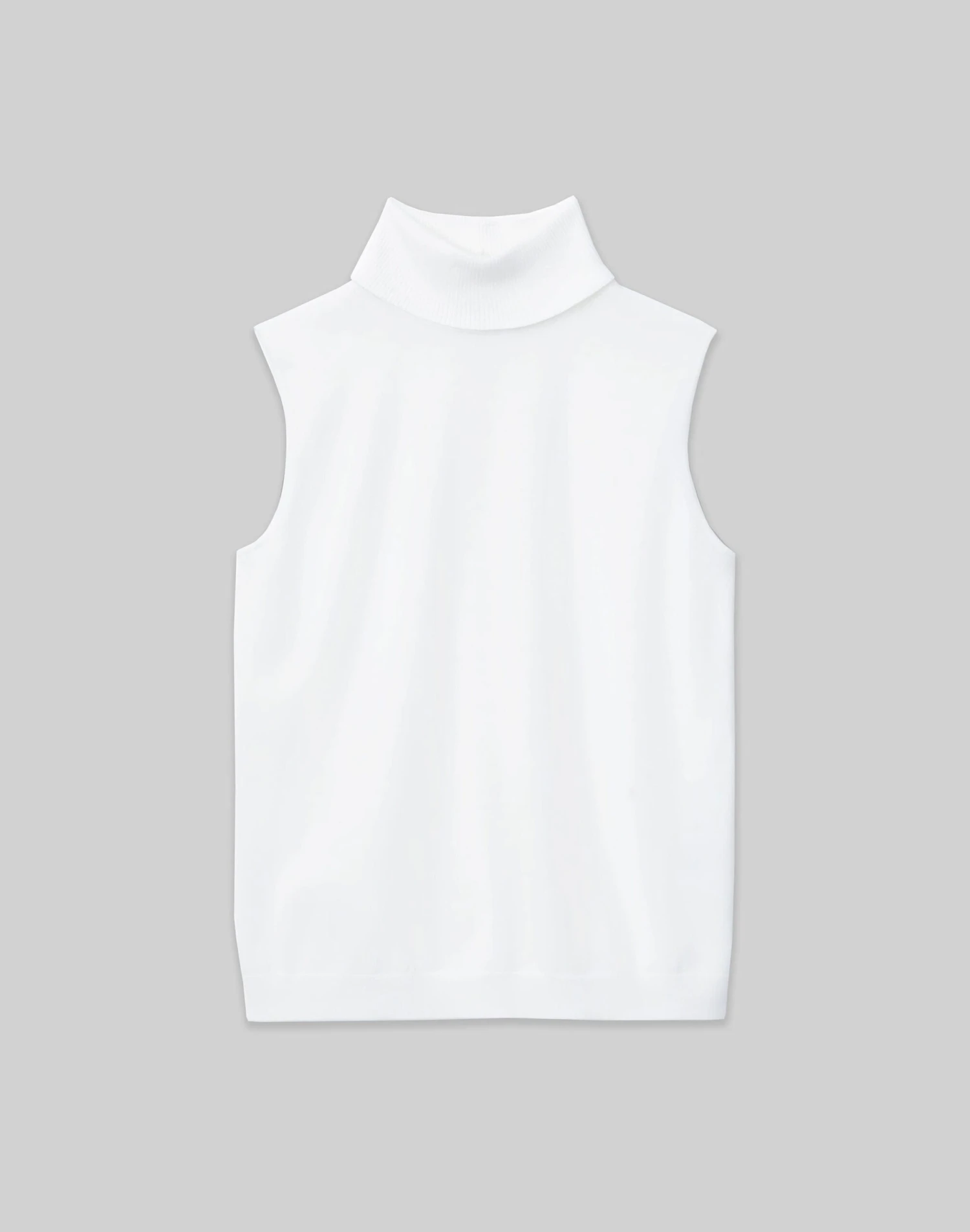 Made for seasonless layering, this turtleneck sweater is crafted from House heritage Matte crepe and plaited with fluid viscose for a smooth fit and soft feel. The relaxed silhouette features a sleeveless design with off-shoulder seams and ribbed hemlines.