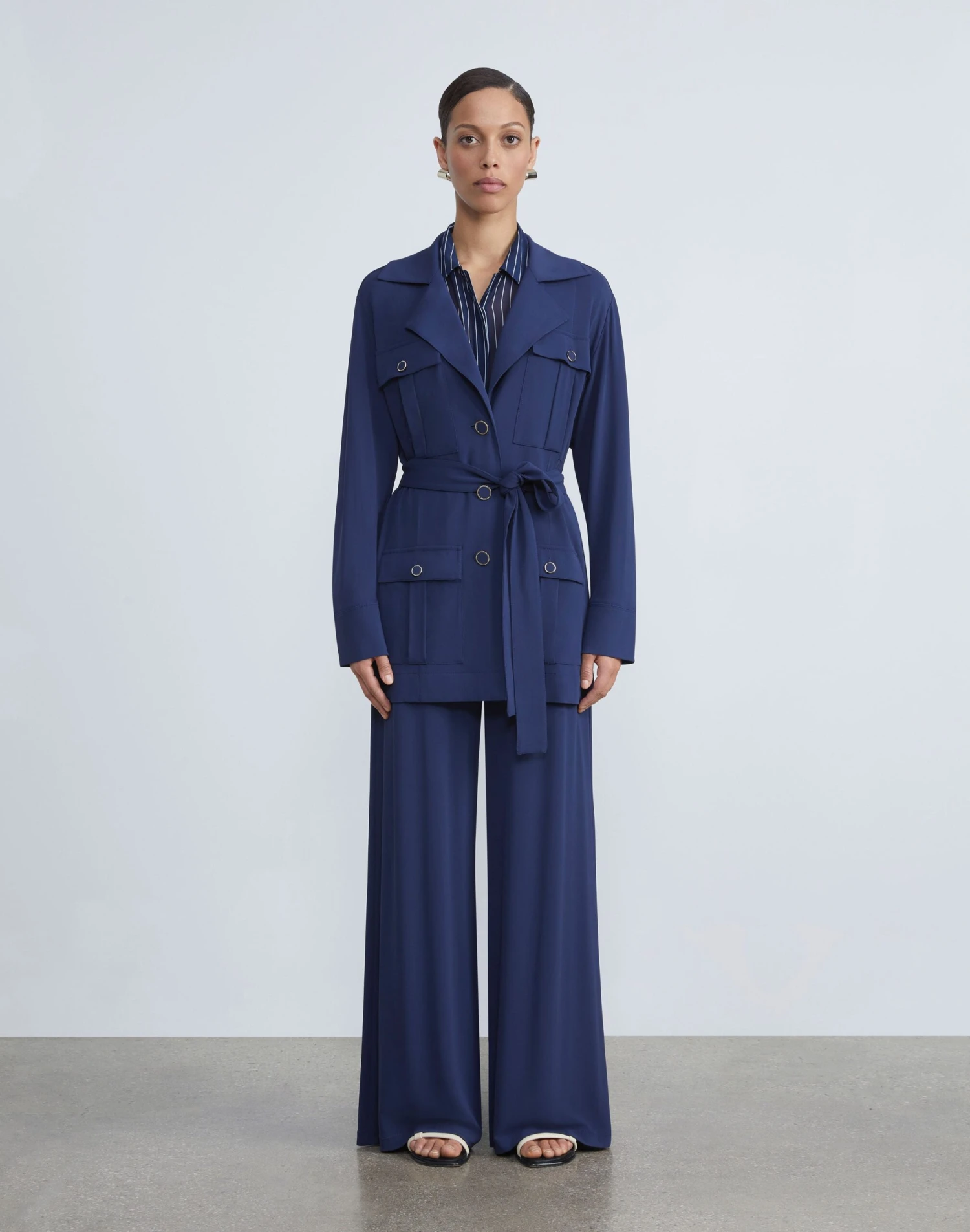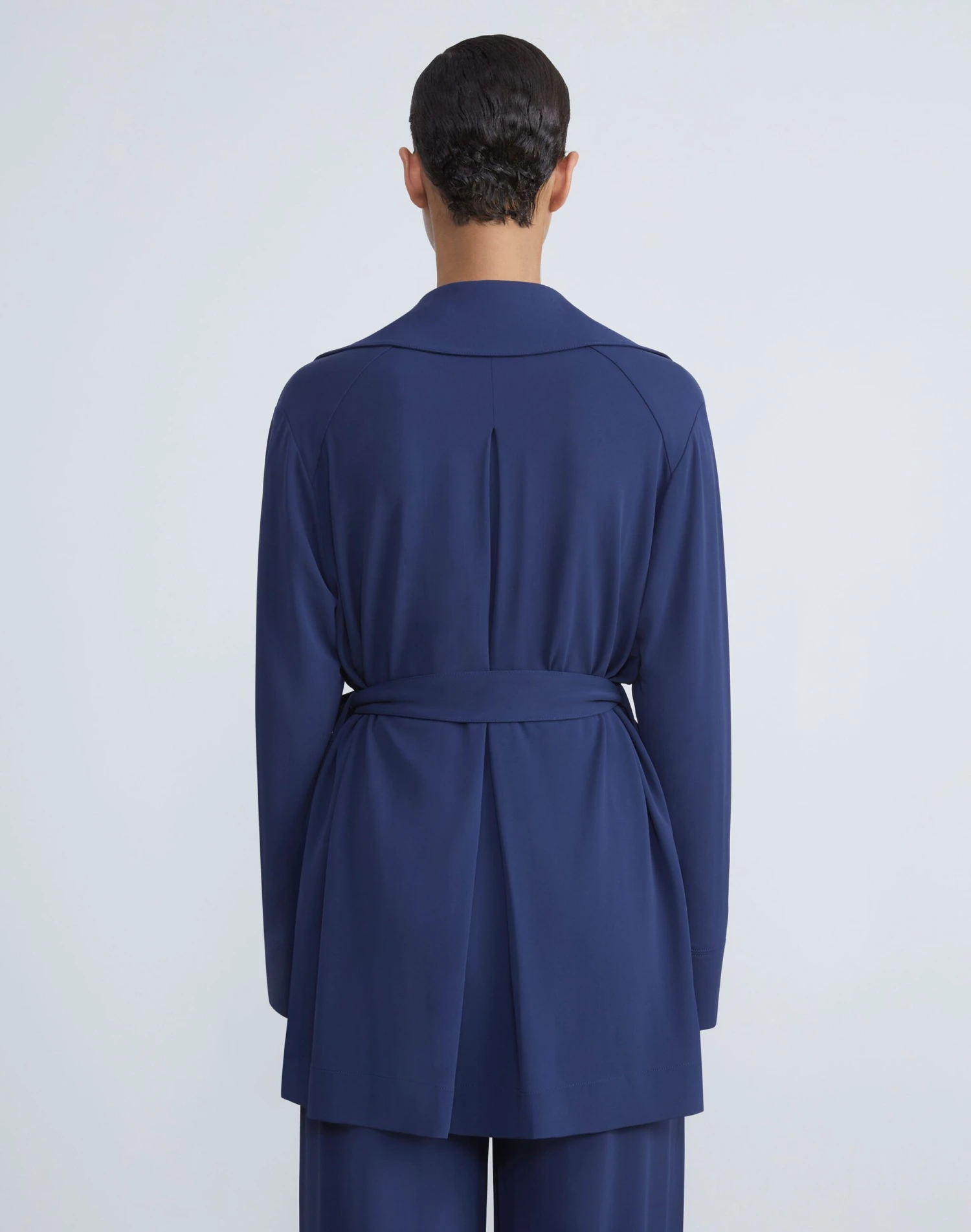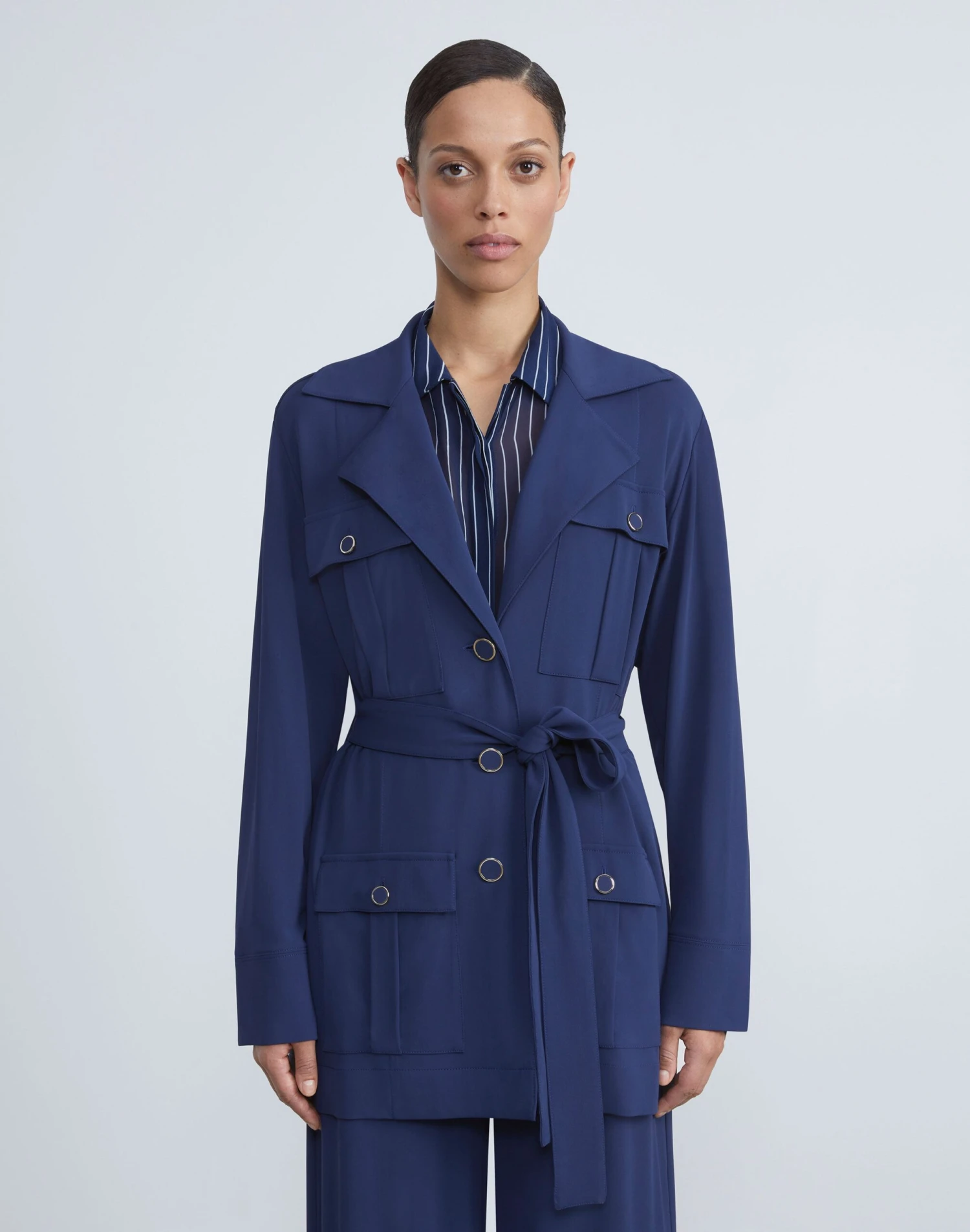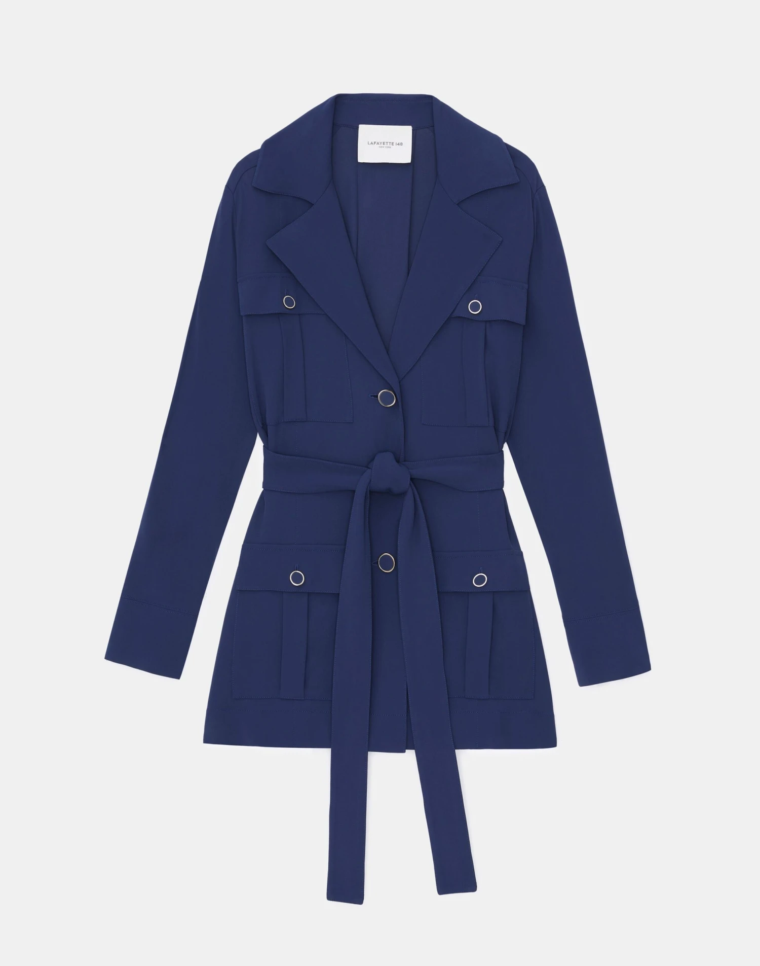 A favorite fabric for its drape and packability, Lafayette 148’s signature matte jersey returns in a relaxed jacket infused with utilitarian detailing. This versatile travel layer is cut in a fluid silhouette belted at the waist and defined by utility patch pockets secured by metal-framed buttons.Â