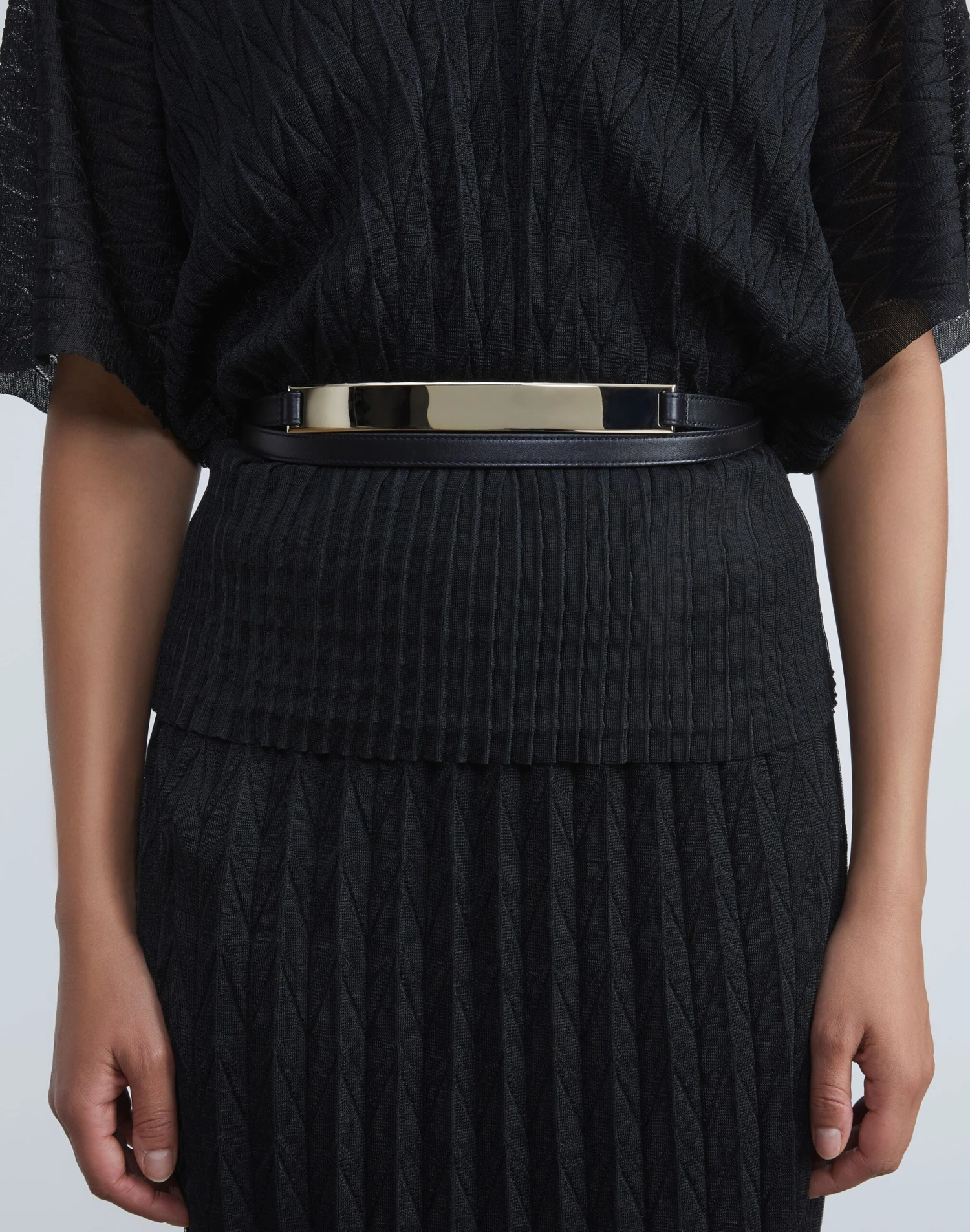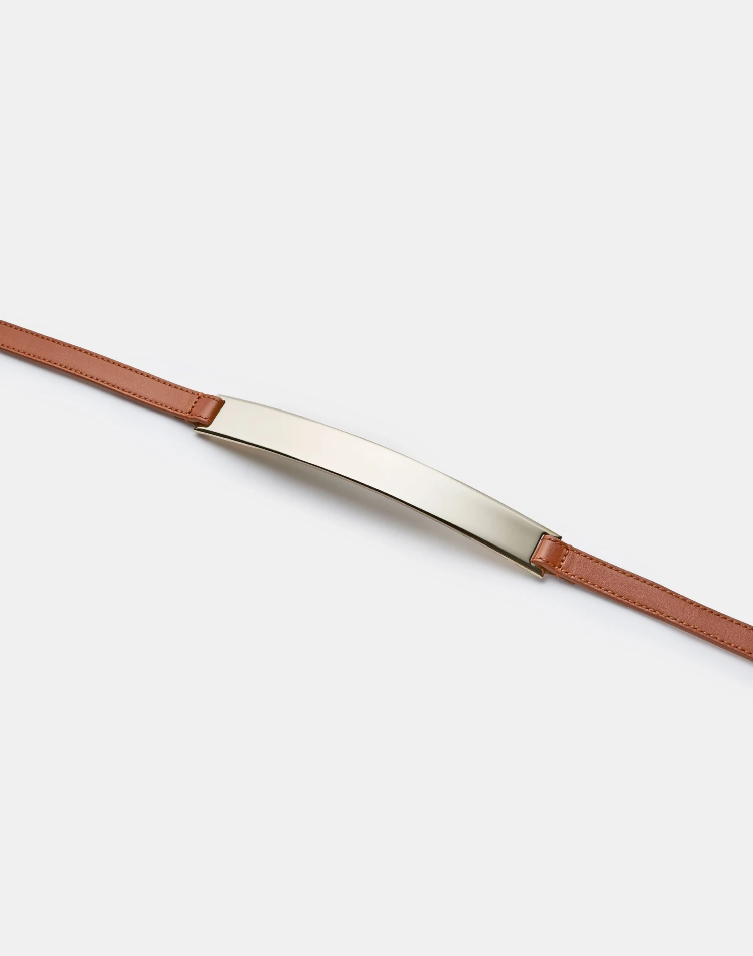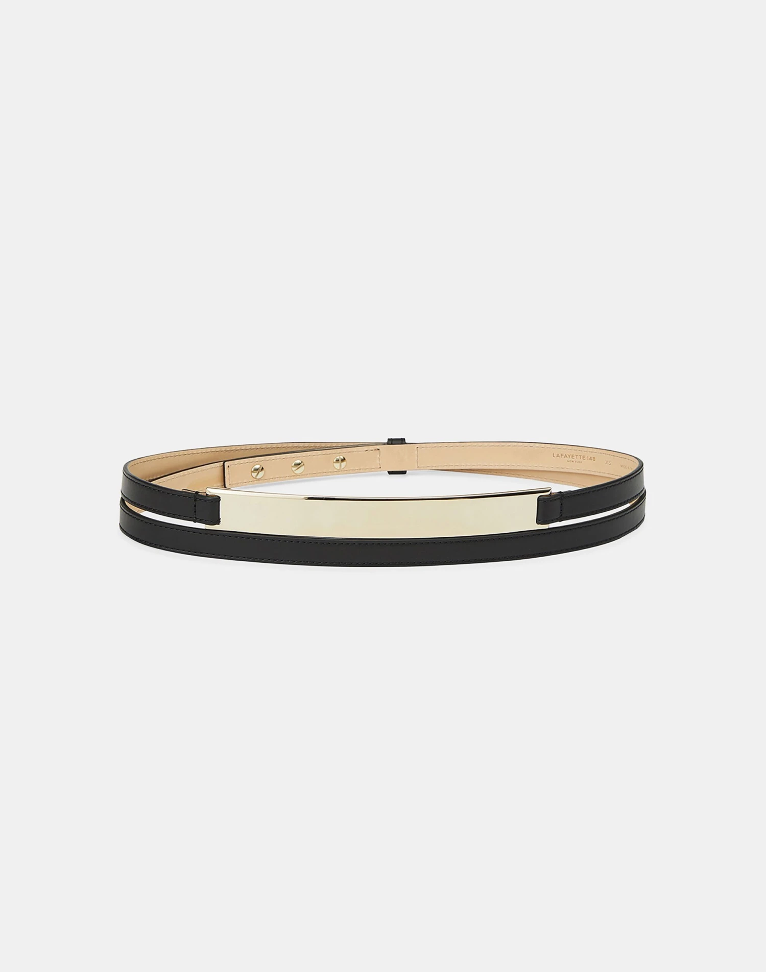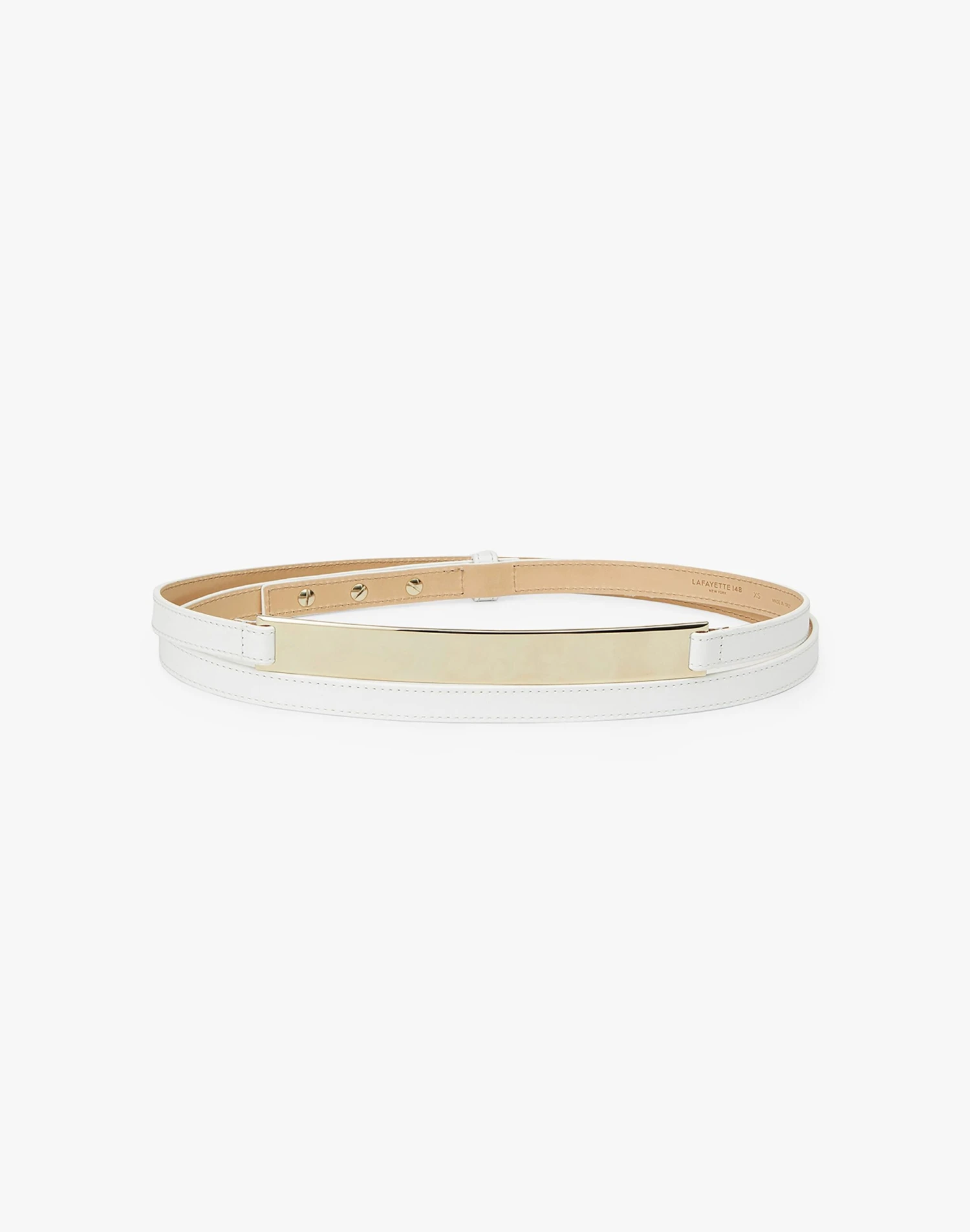 Crafted in Italy from smooth nappa leather, this thin belt features a double-wrap design that’s accentuated by a sculptural metal plate at the center. It’s finished with artisanal topstitching and polished gold-tone hardware.