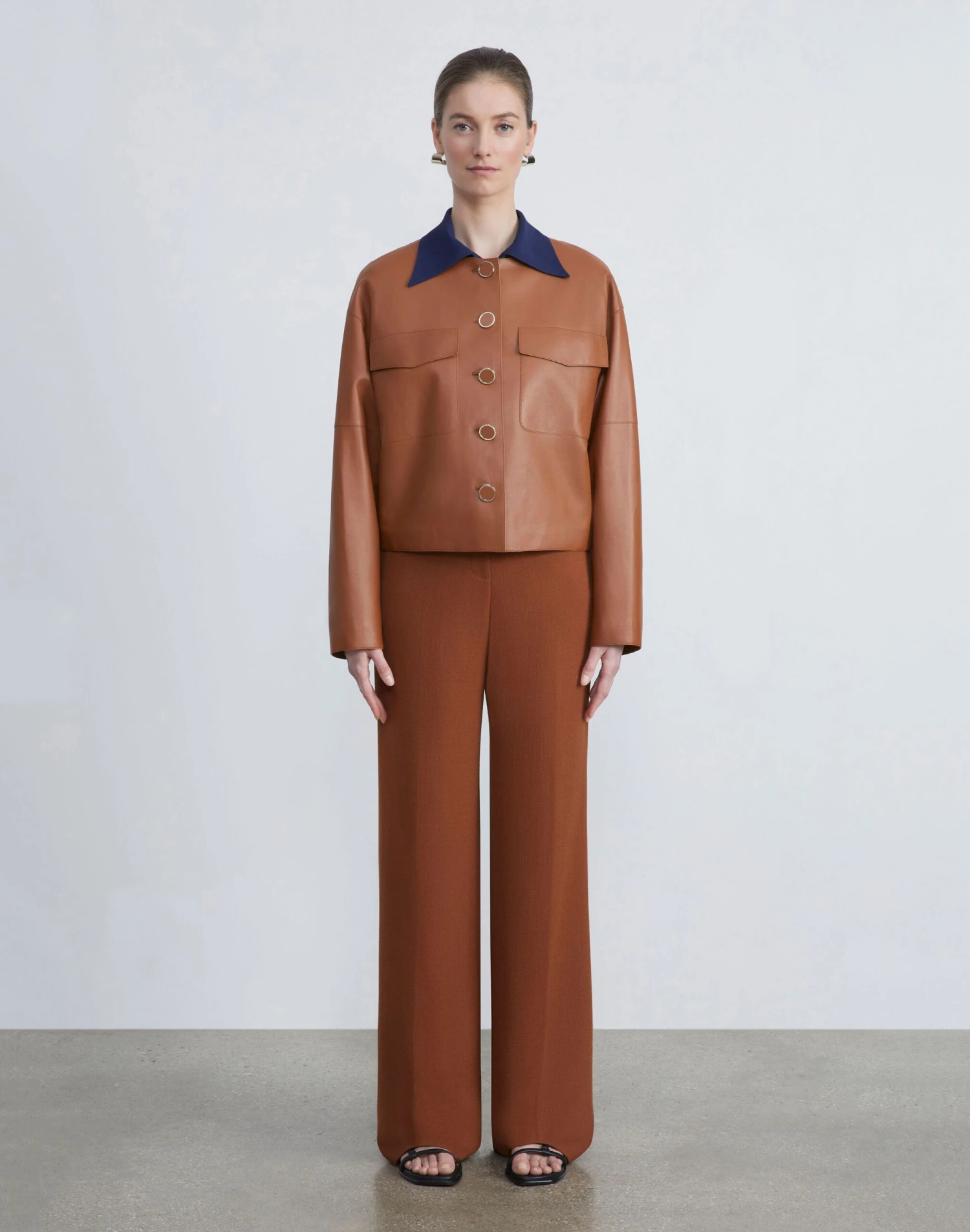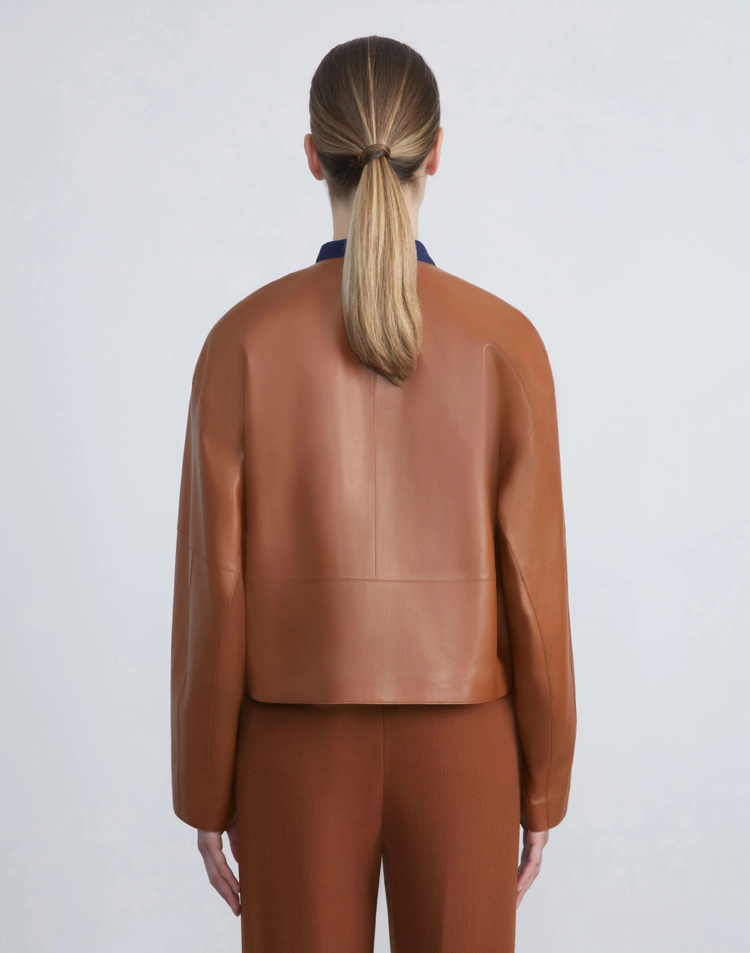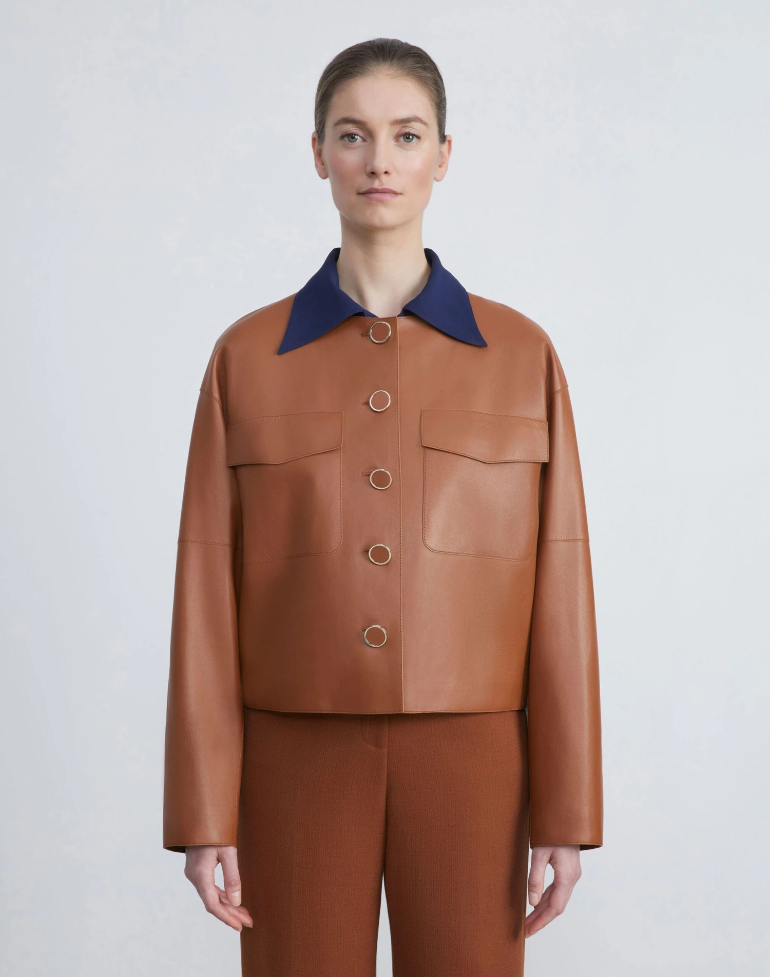 Smooth Italian nappa lambskin brings buttery texture and soft structure to this meticulously crafted jacket—elevated to modern proportions by an oversized fit and cropped length. The collarless design is lined with a quilted insulated interior, that’s both lightweight and exceptionally warm, and fastens with leather-trimmed metal buttons.