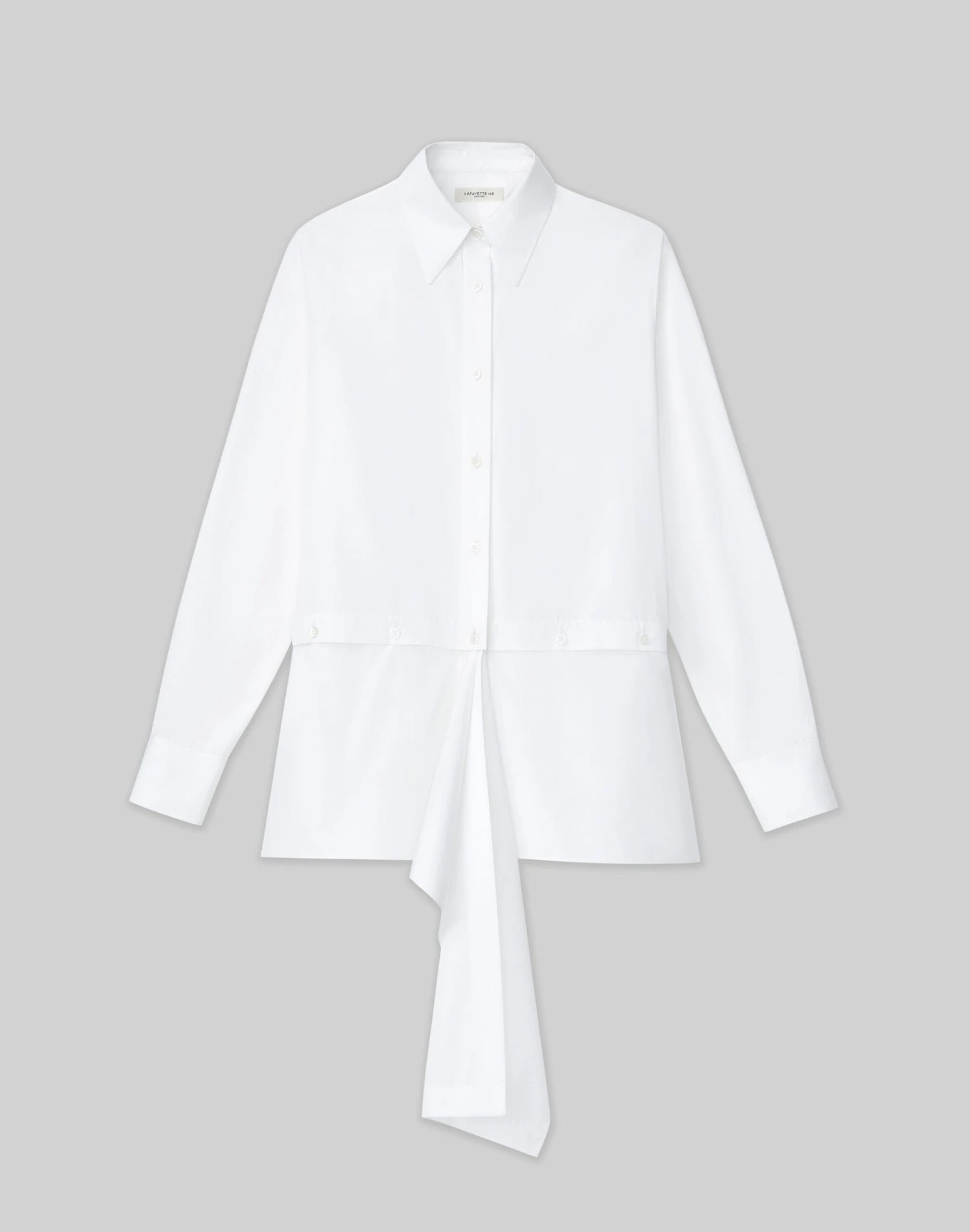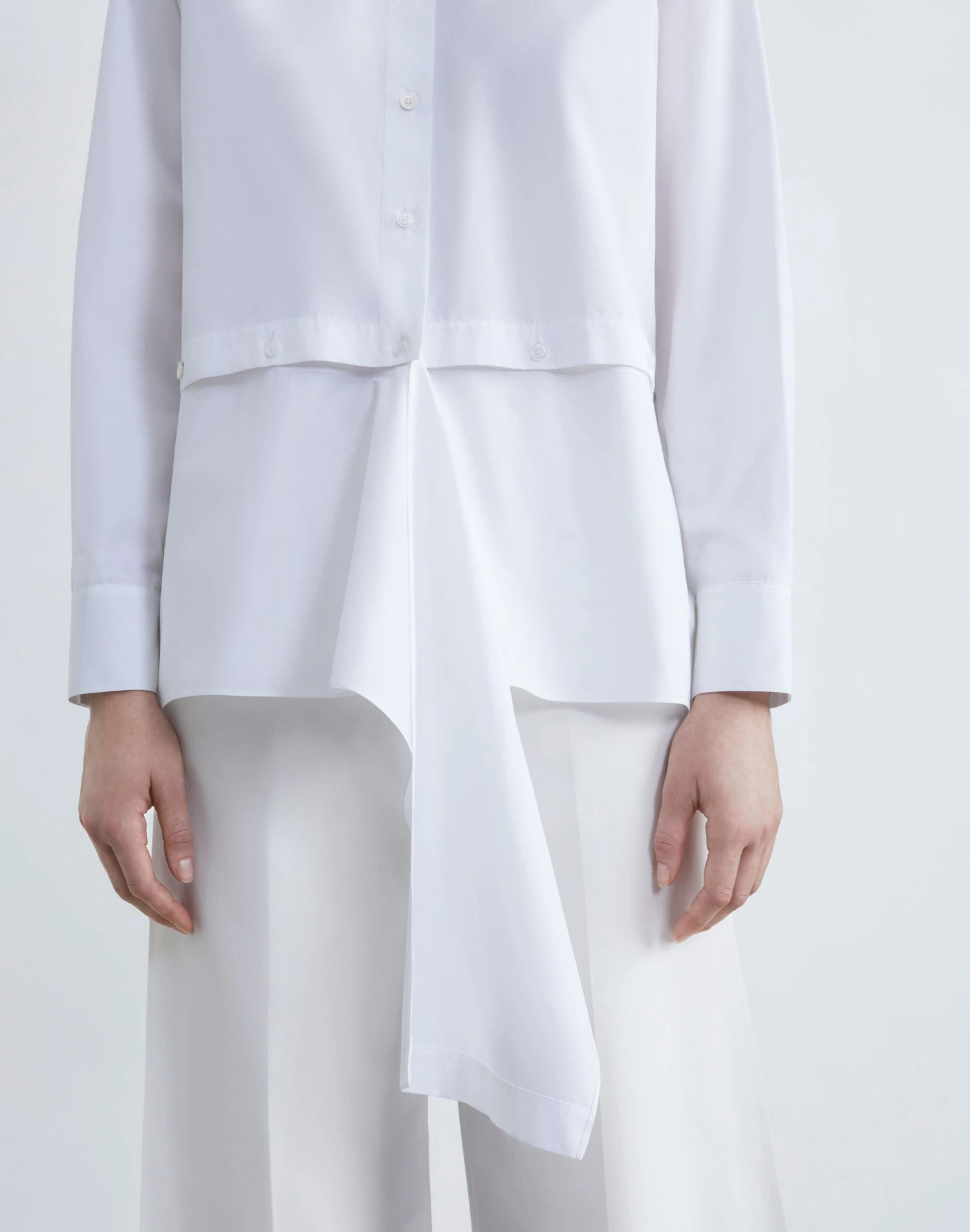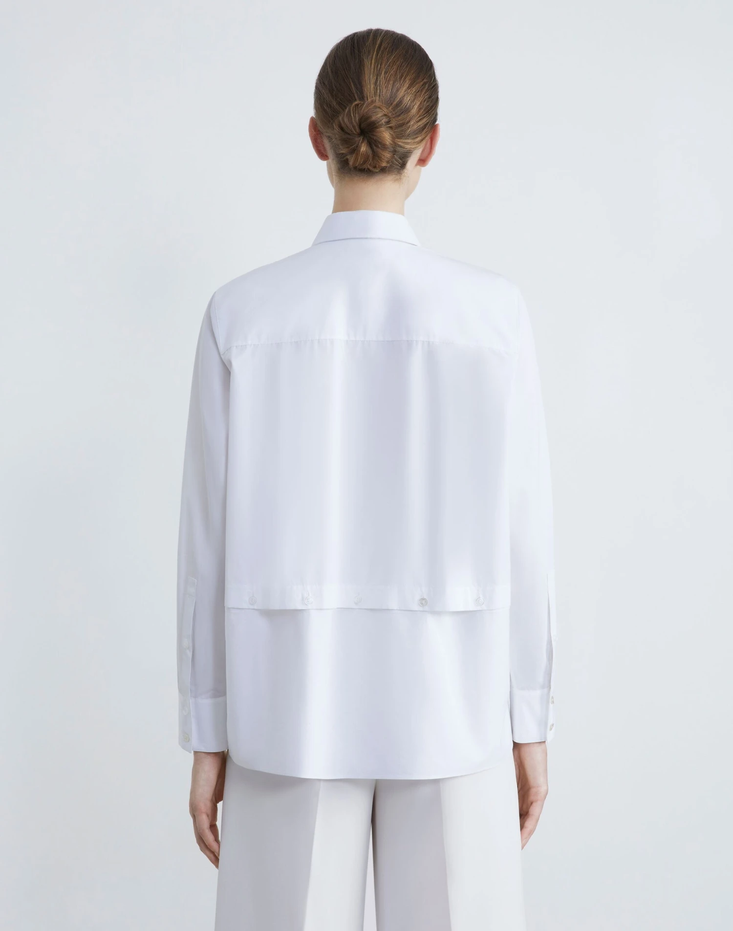 Updating an L148 icon, this collared shirt is sharply tailored from crisp Italian cotton poplin in an oversized fit with clean finishes. Functional button detailing—inspired by the scalloped edges of tear-away stamps—makes this a convertible design: button off the bottom, draped front panel to wear as a clean, cropped silhouette.