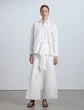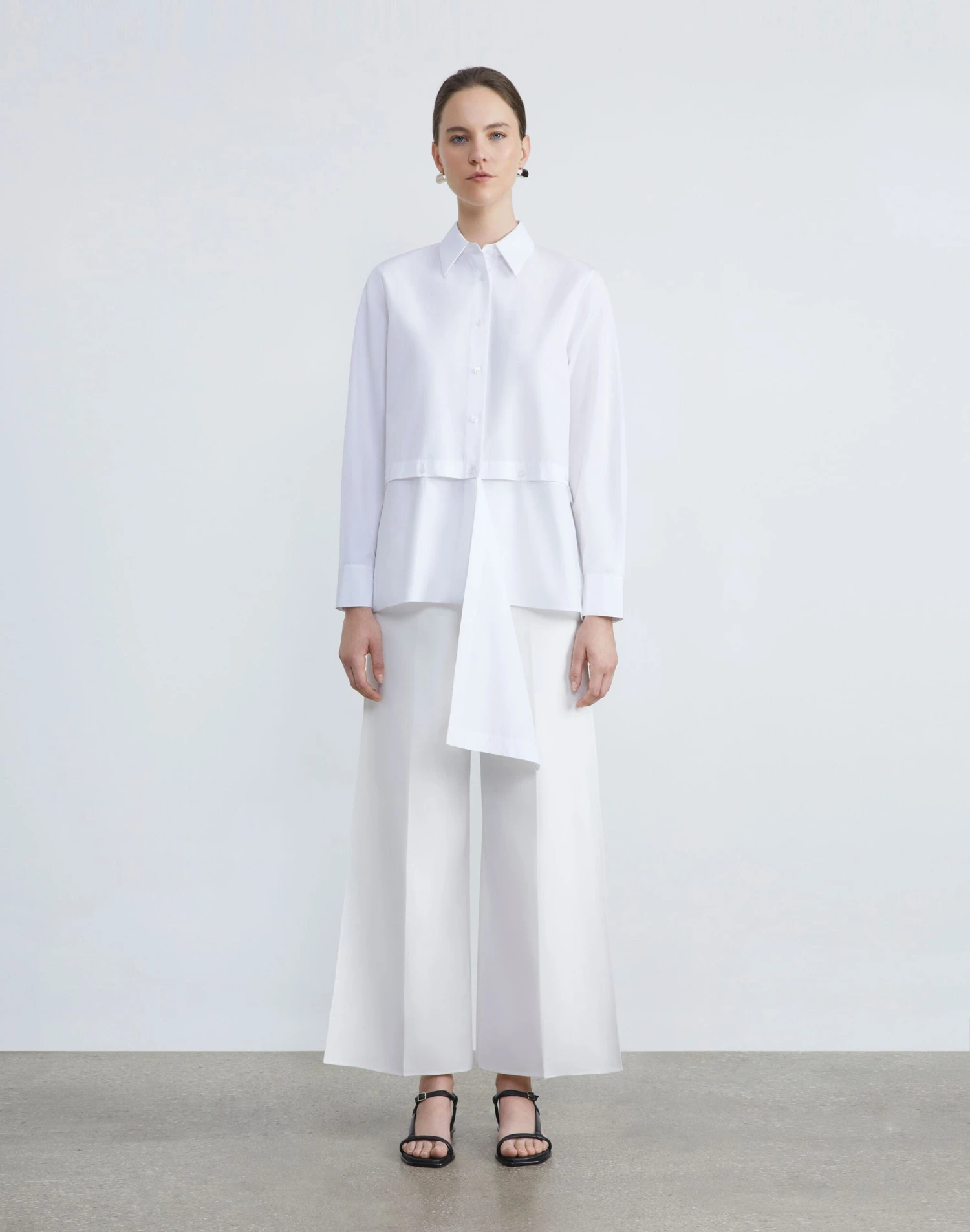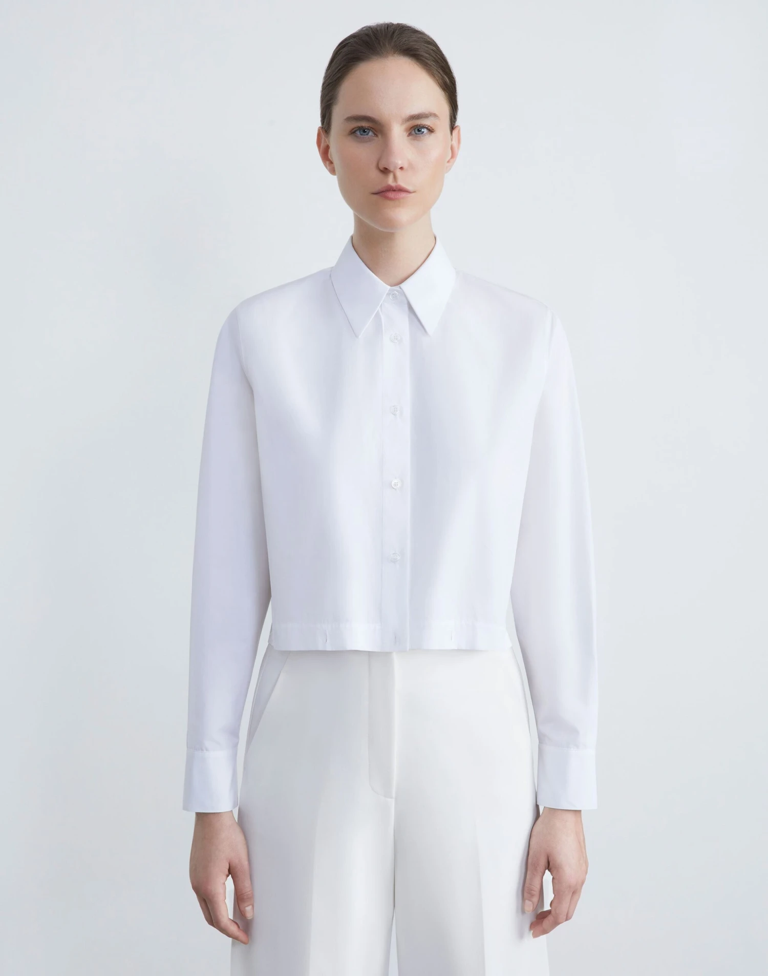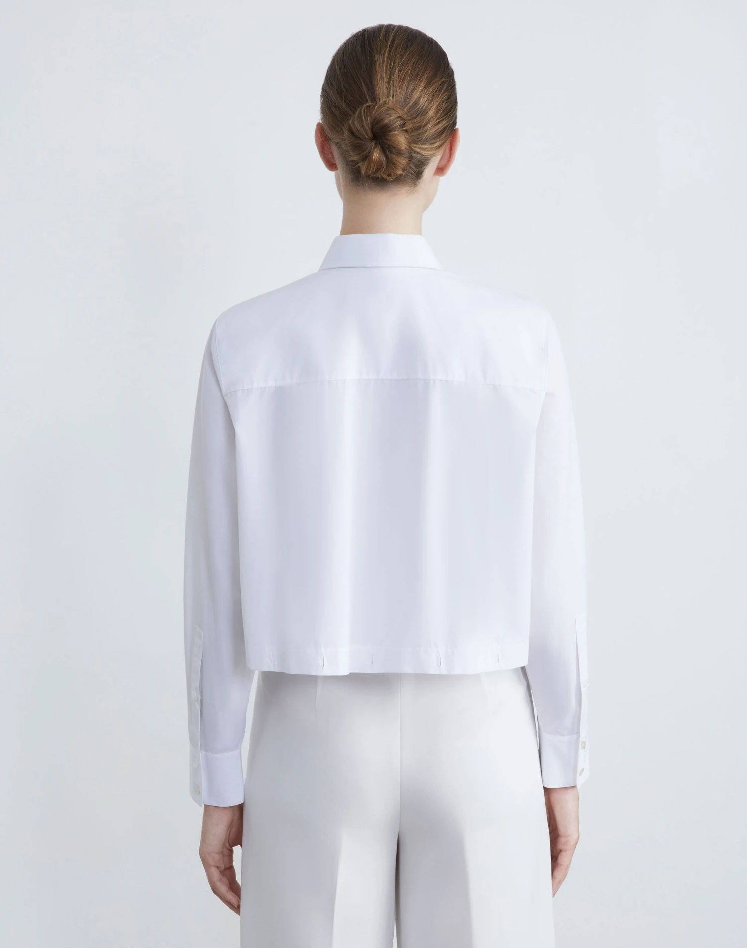 Updating an L148 icon, this collared shirt is sharply tailored from crisp Italian cotton poplin in an oversized fit with clean finishes. Functional button detailing—inspired by the scalloped edges of tear-away stamps—makes this a convertible design: button off the bottom, draped front panel to wear as a clean, cropped silhouette.