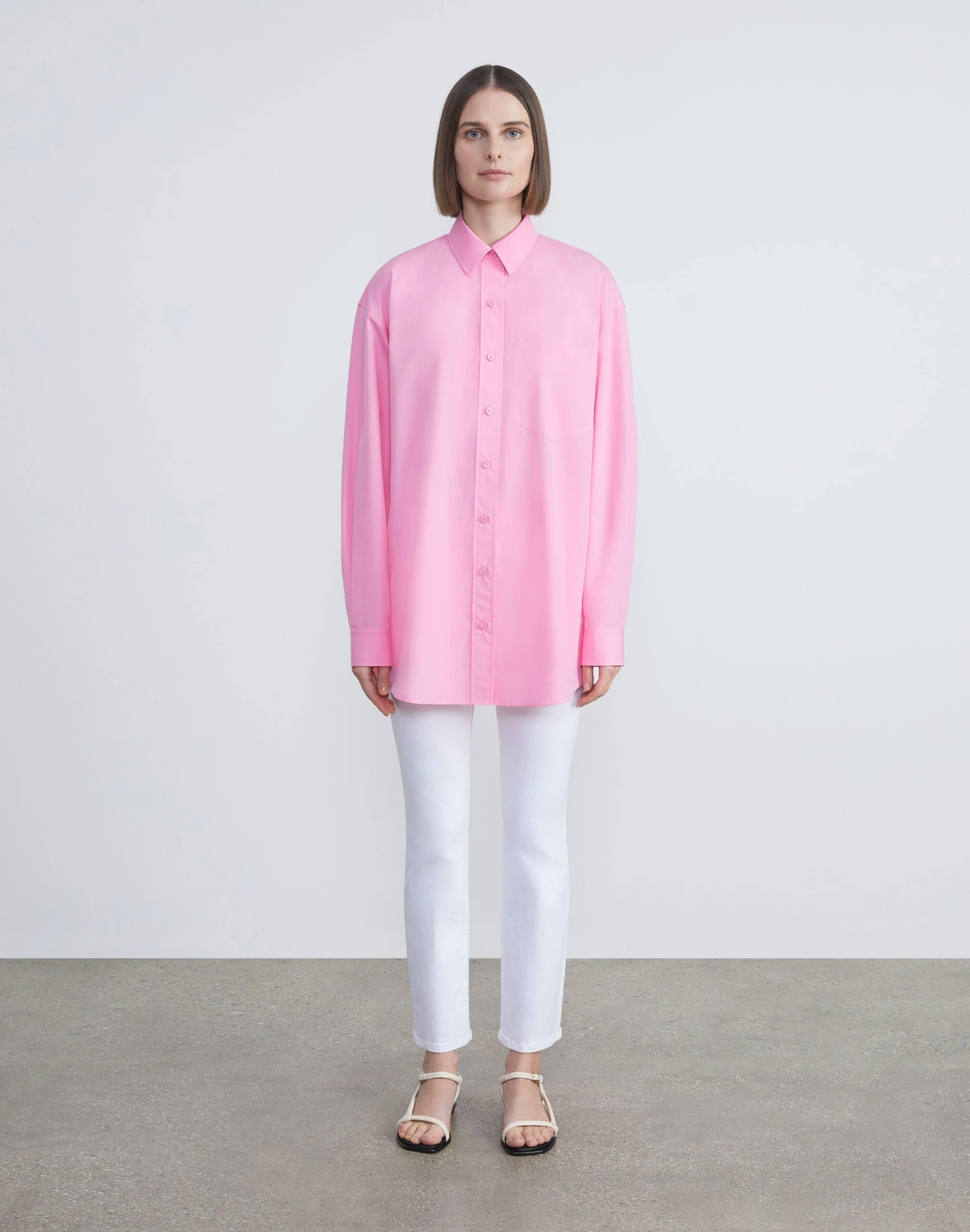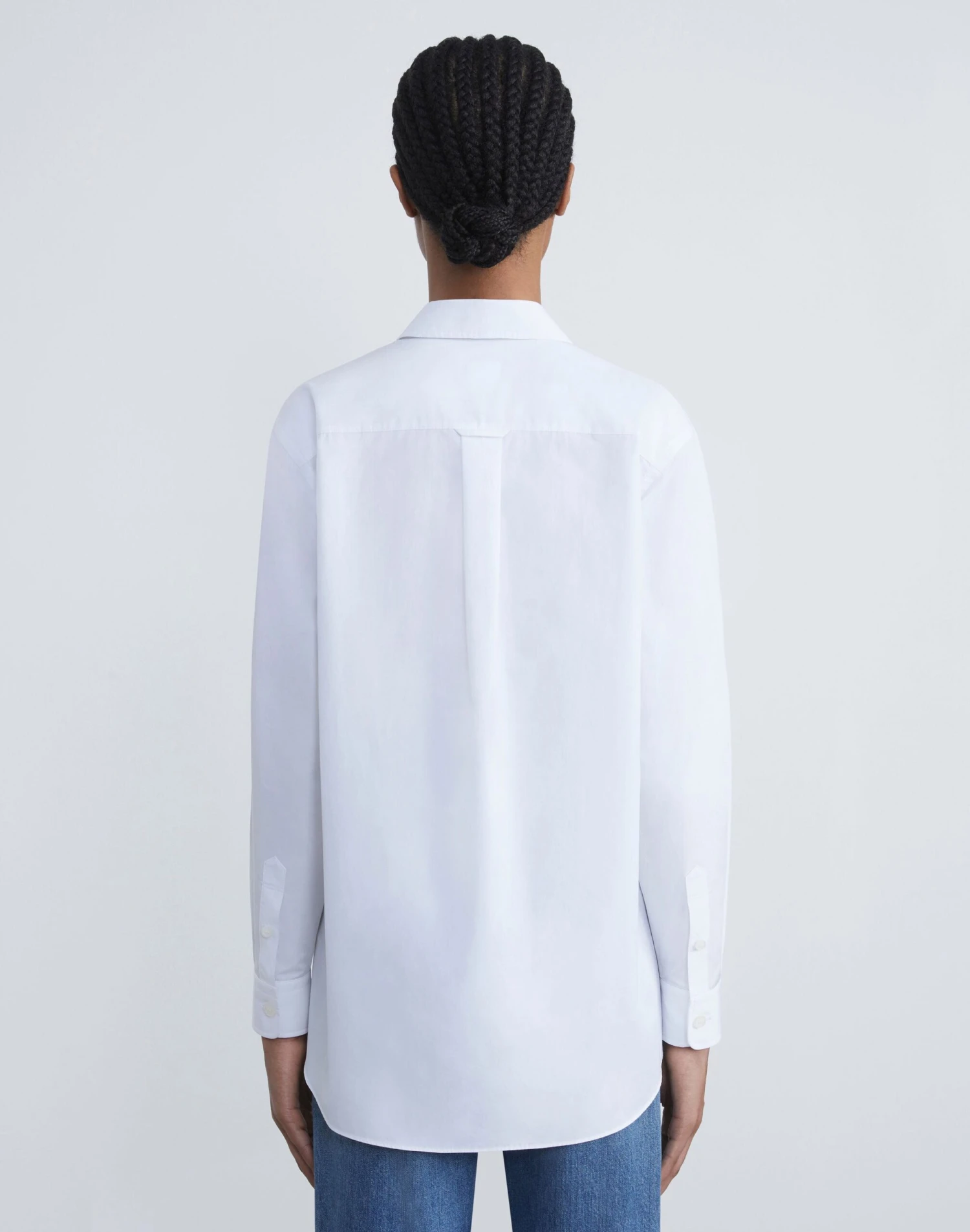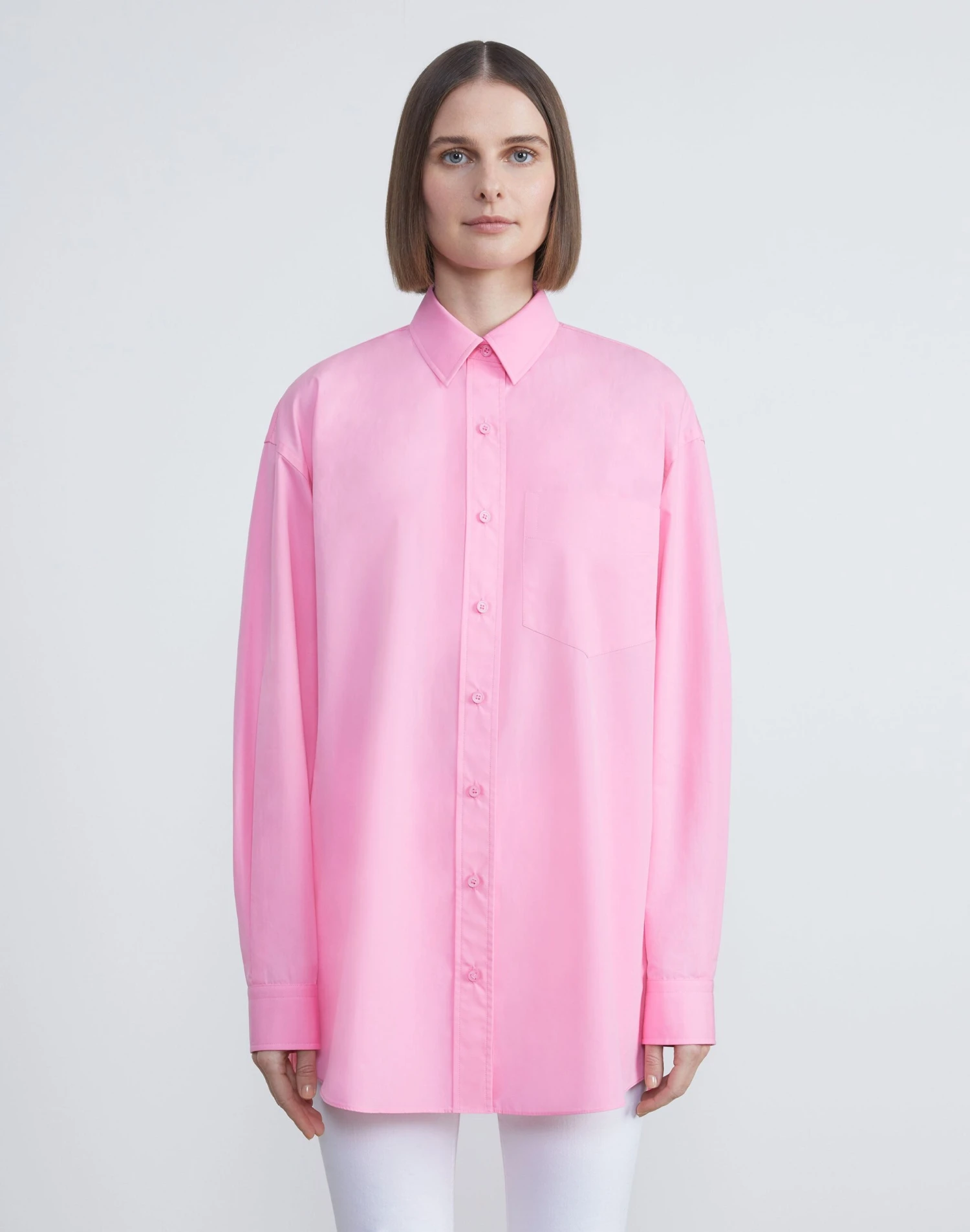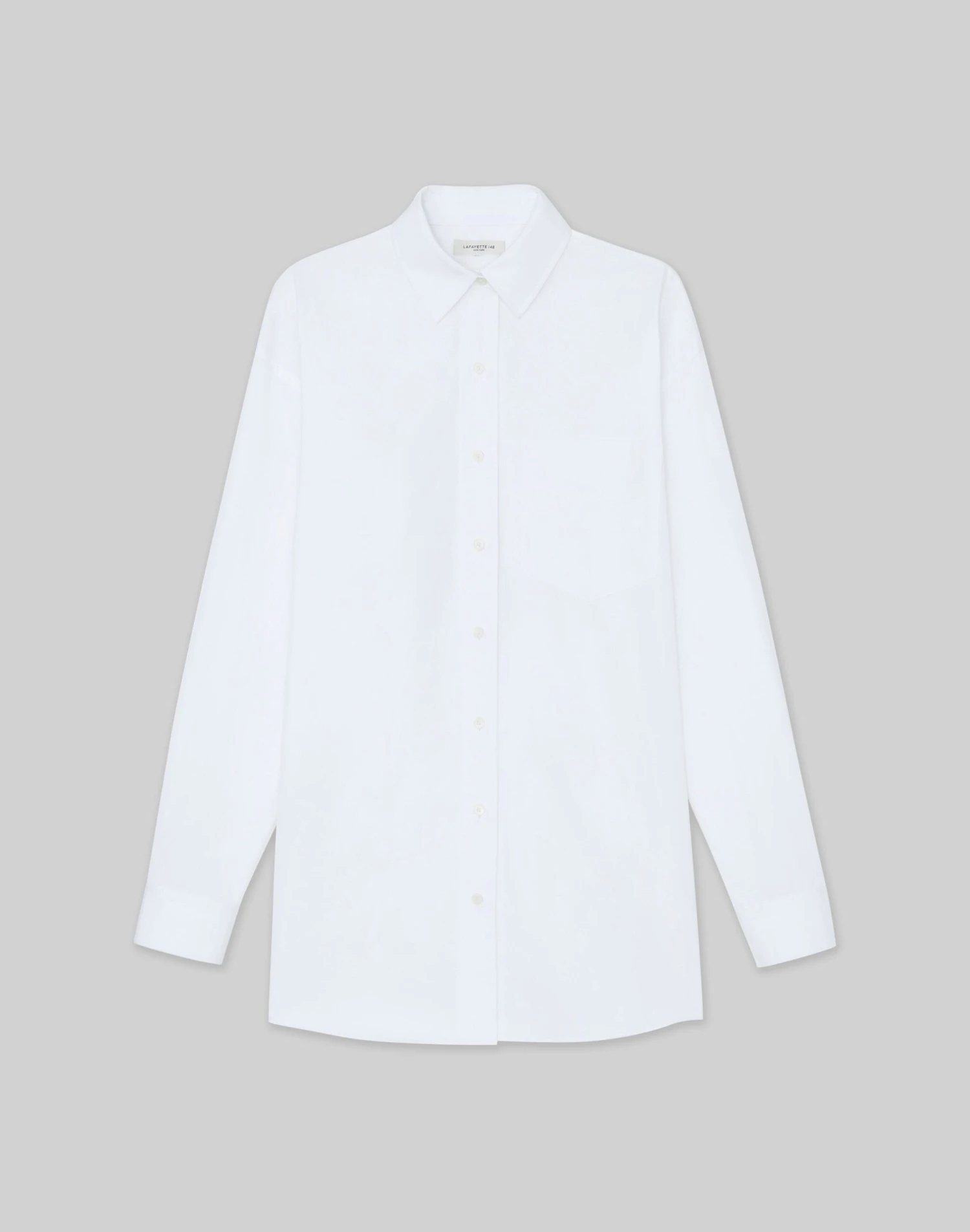 Clean lines and boyfriend-inspired proportions define this button-front shirt, precision cut in an oversized silhouette with a dropped back hem. Crafted from organic Italian cotton poplin, it’s soft and crisp with a structured fit, and finished with a sharp shirt collar and refined button-cuffed sleeves for a sartorial finish.