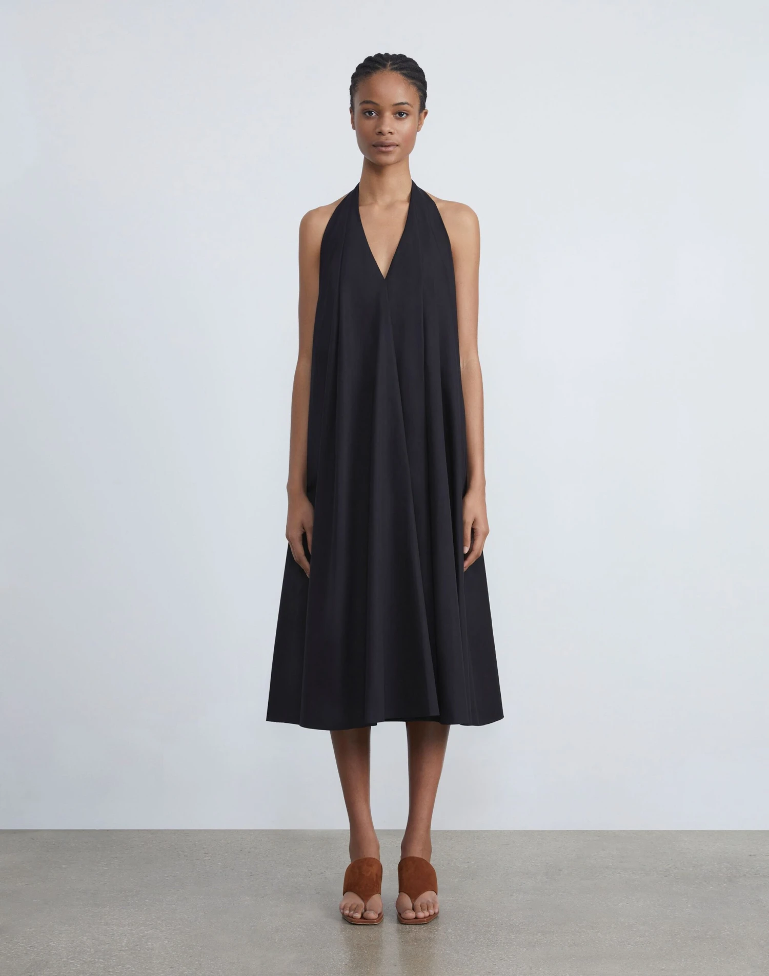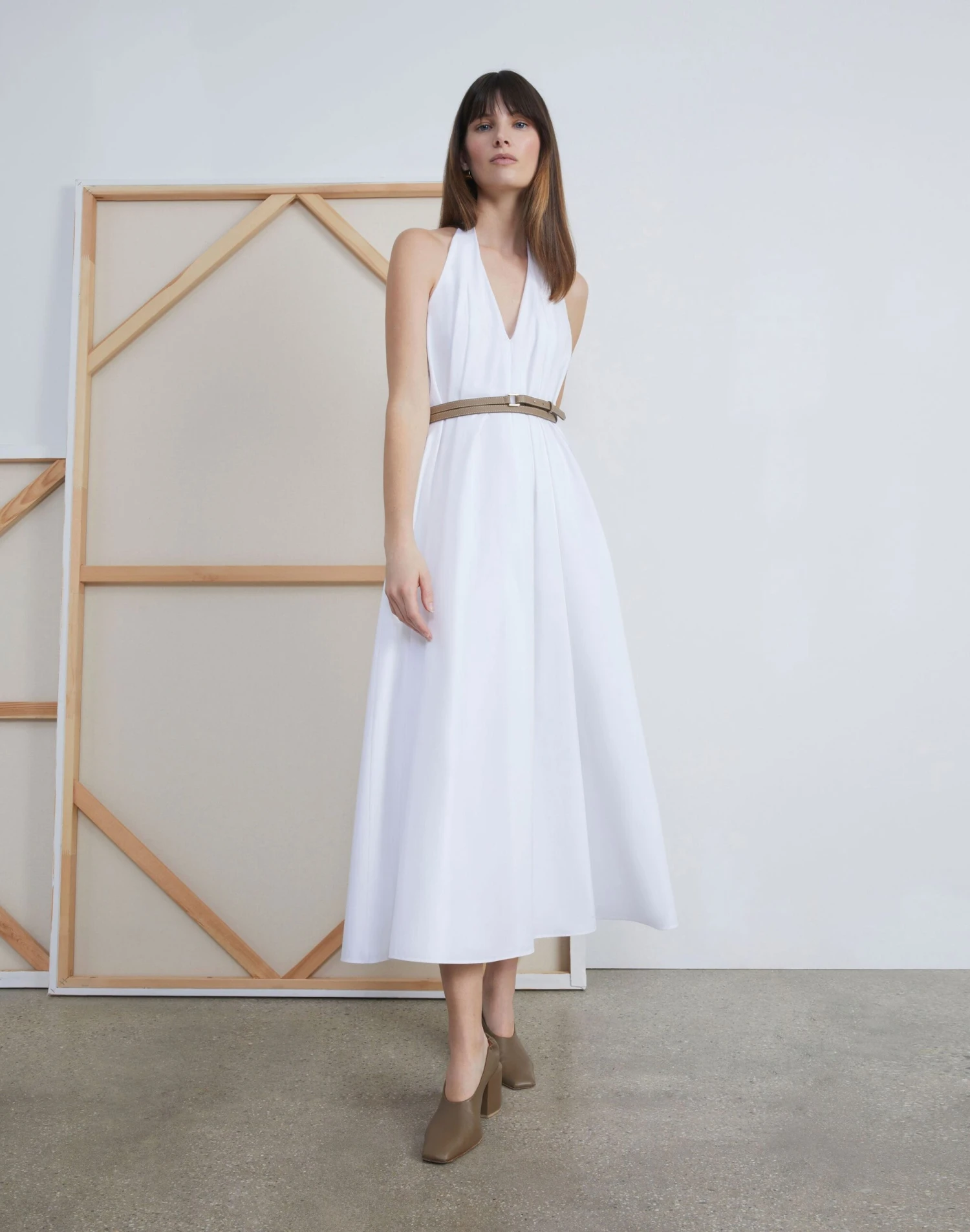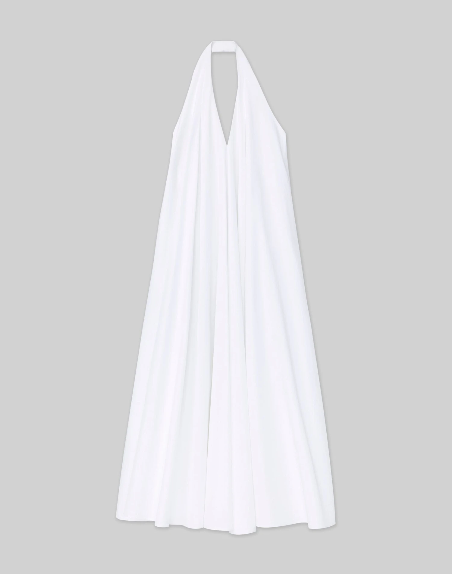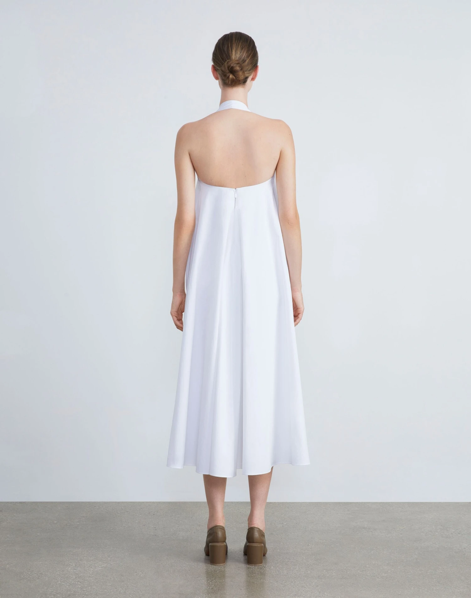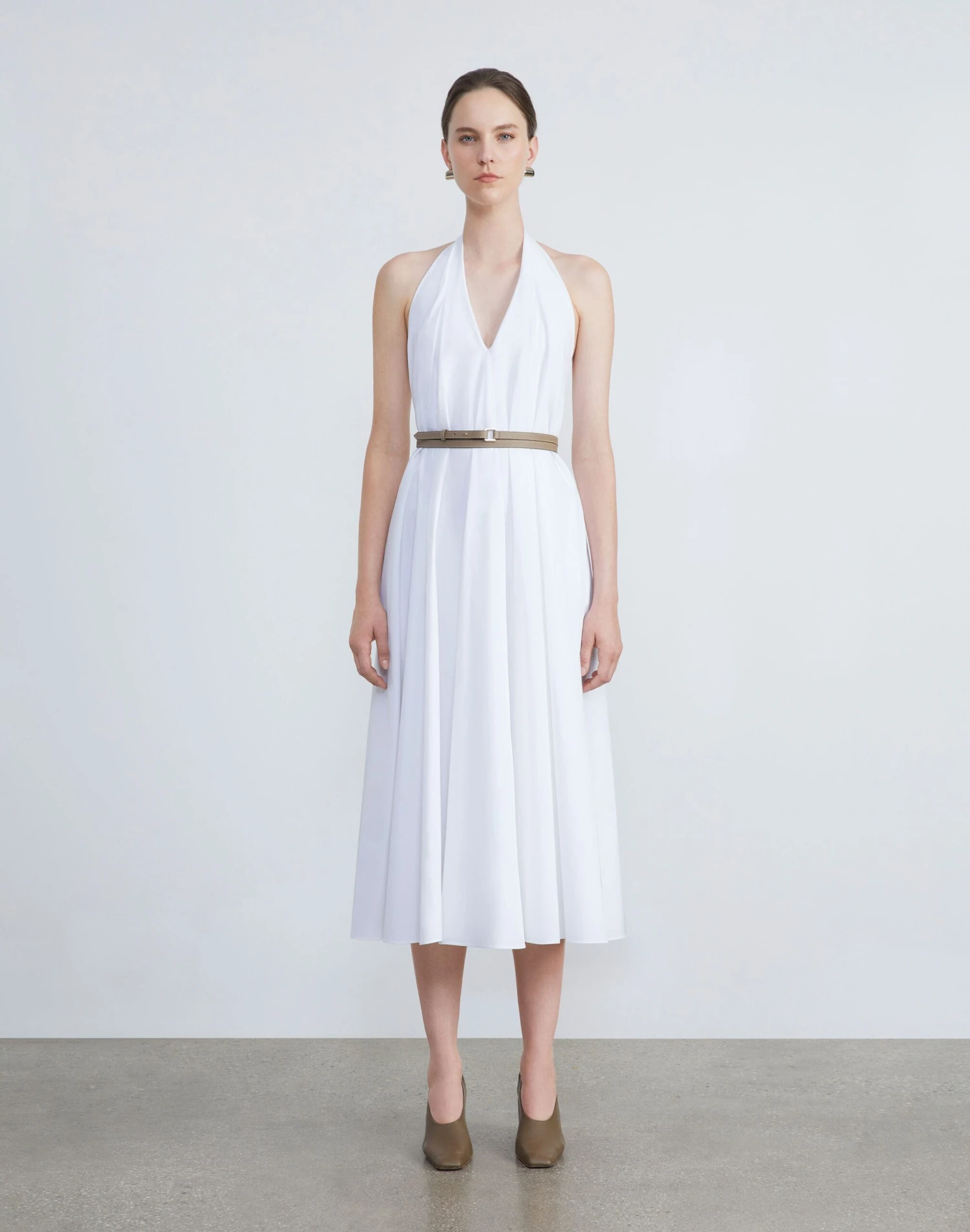 Crisp and cooling in pure Italian organic cotton poplin, this flared swing dress is expertly crafted with inverted pleats rendering measured volume through a billowing silhouette. It’s designed with a structured interior slip and features a halter V-neckline, seam pockets and midi length.