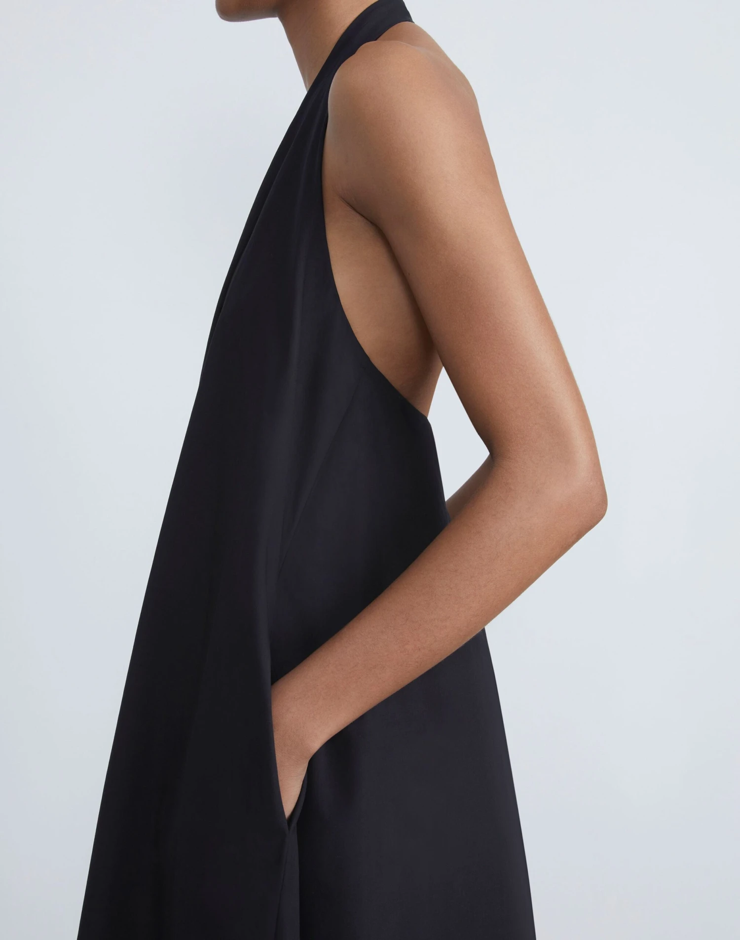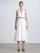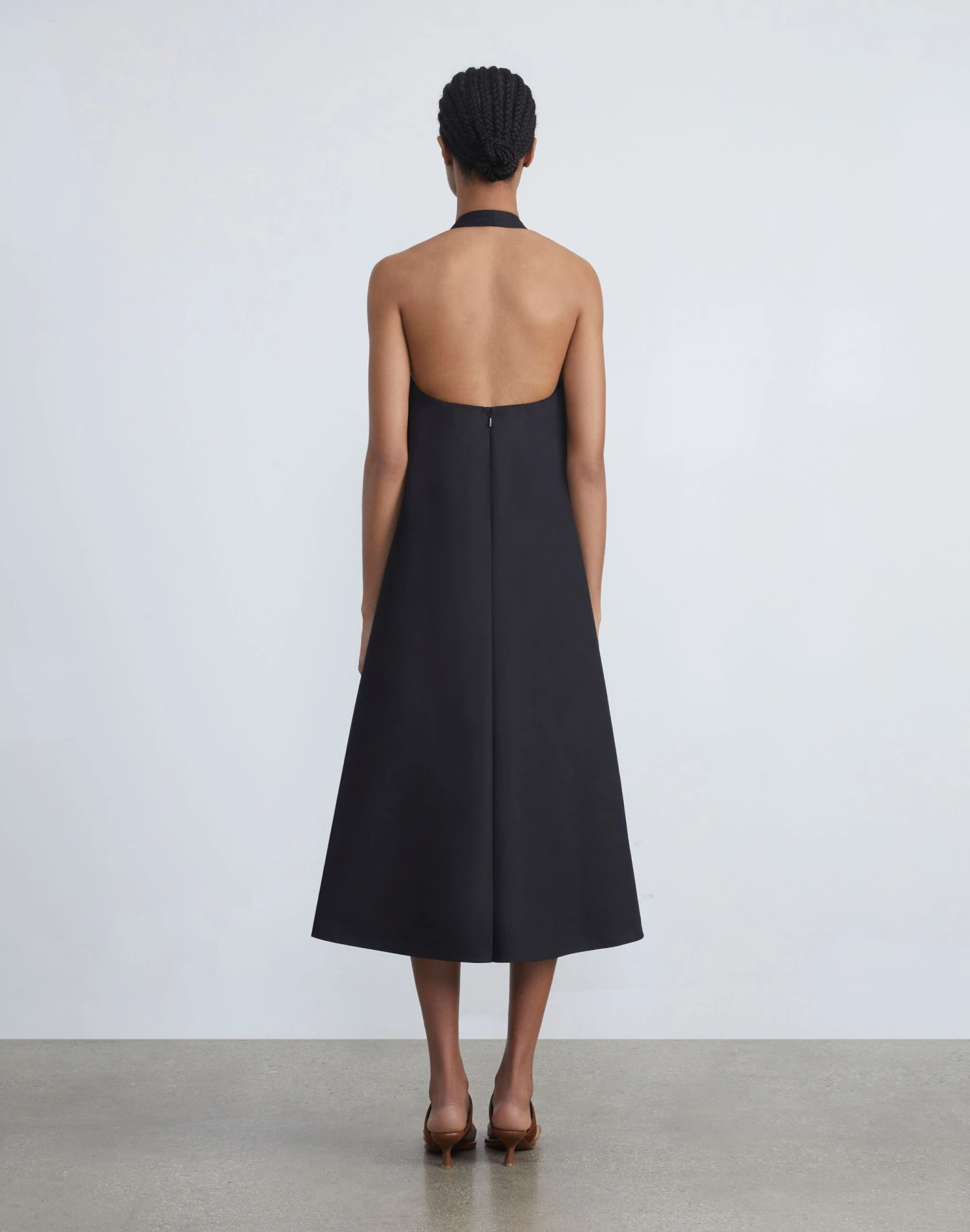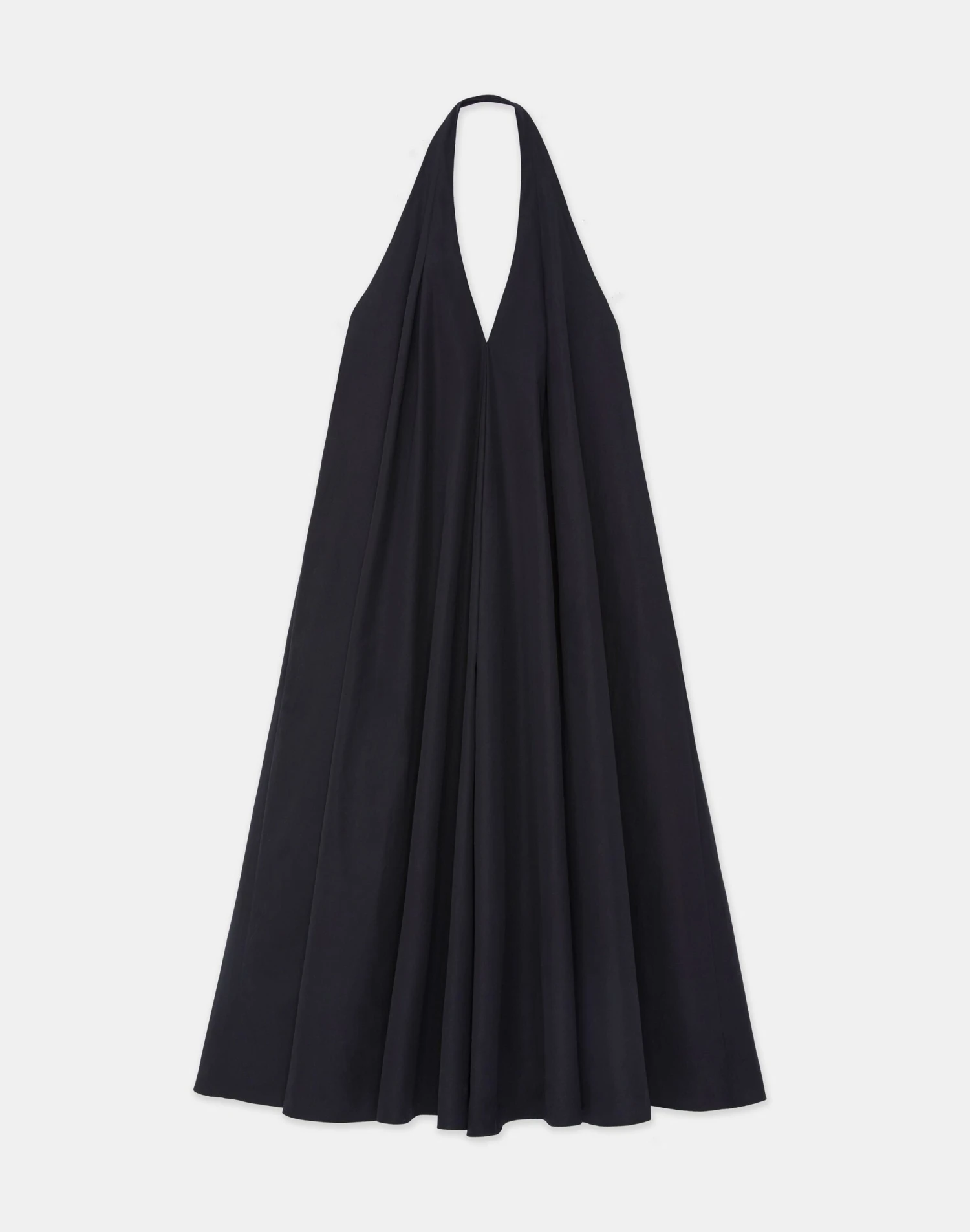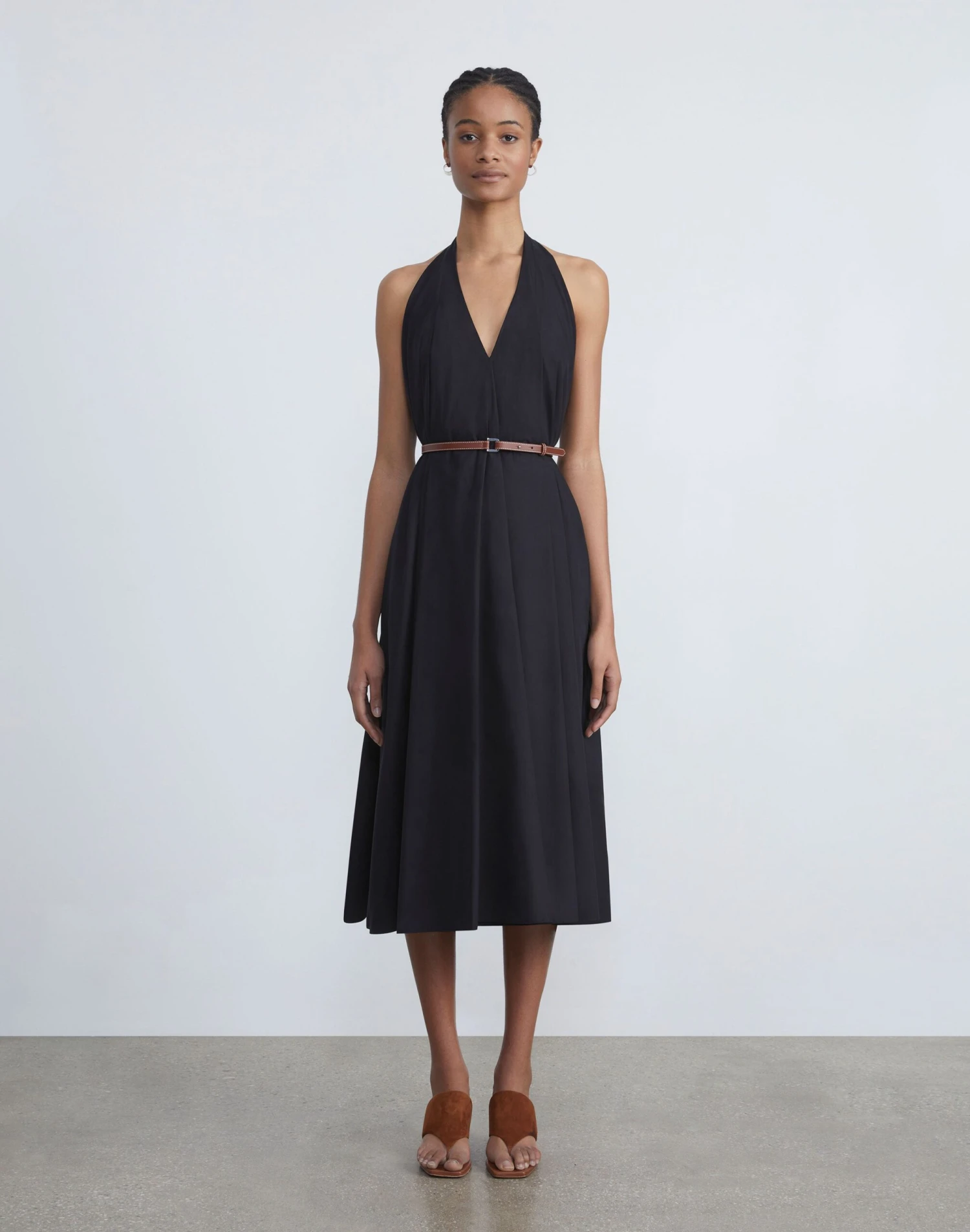 Crisp and cooling in pure Italian organic cotton poplin, this flared swing dress is expertly crafted with inverted pleats rendering measured volume through a billowing silhouette. It’s designed with a structured interior slip and features a halter V-neckline, seam pockets and midi length.