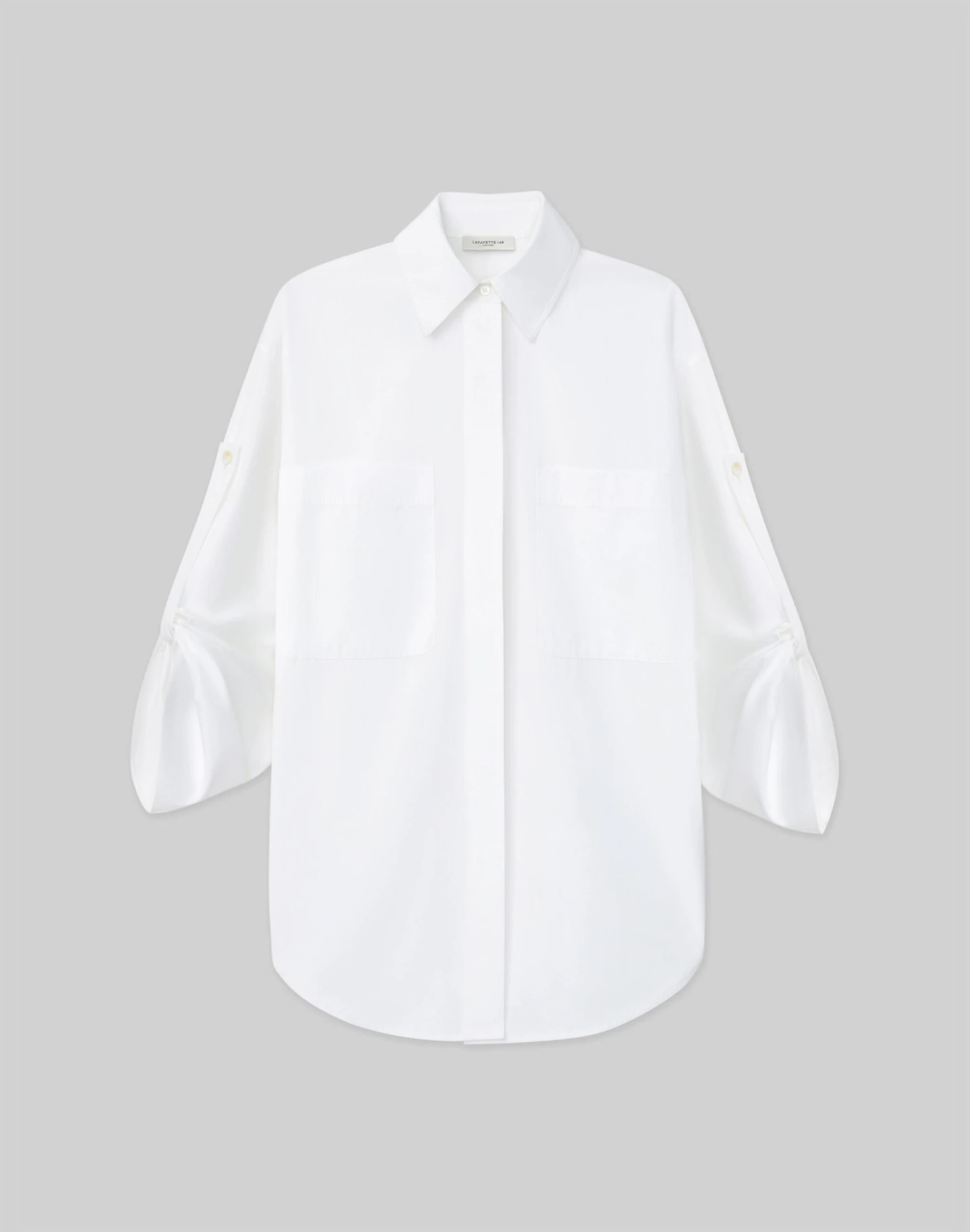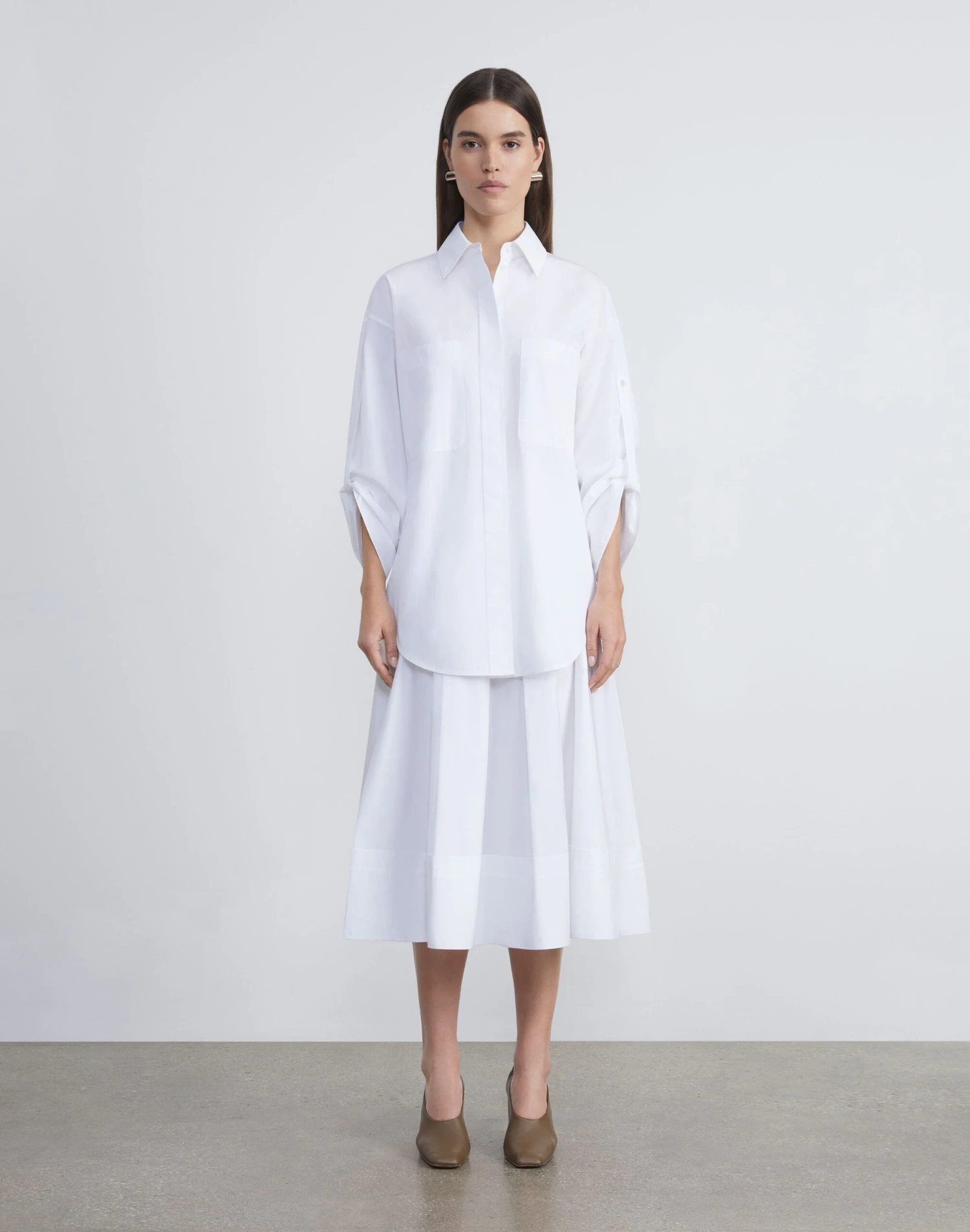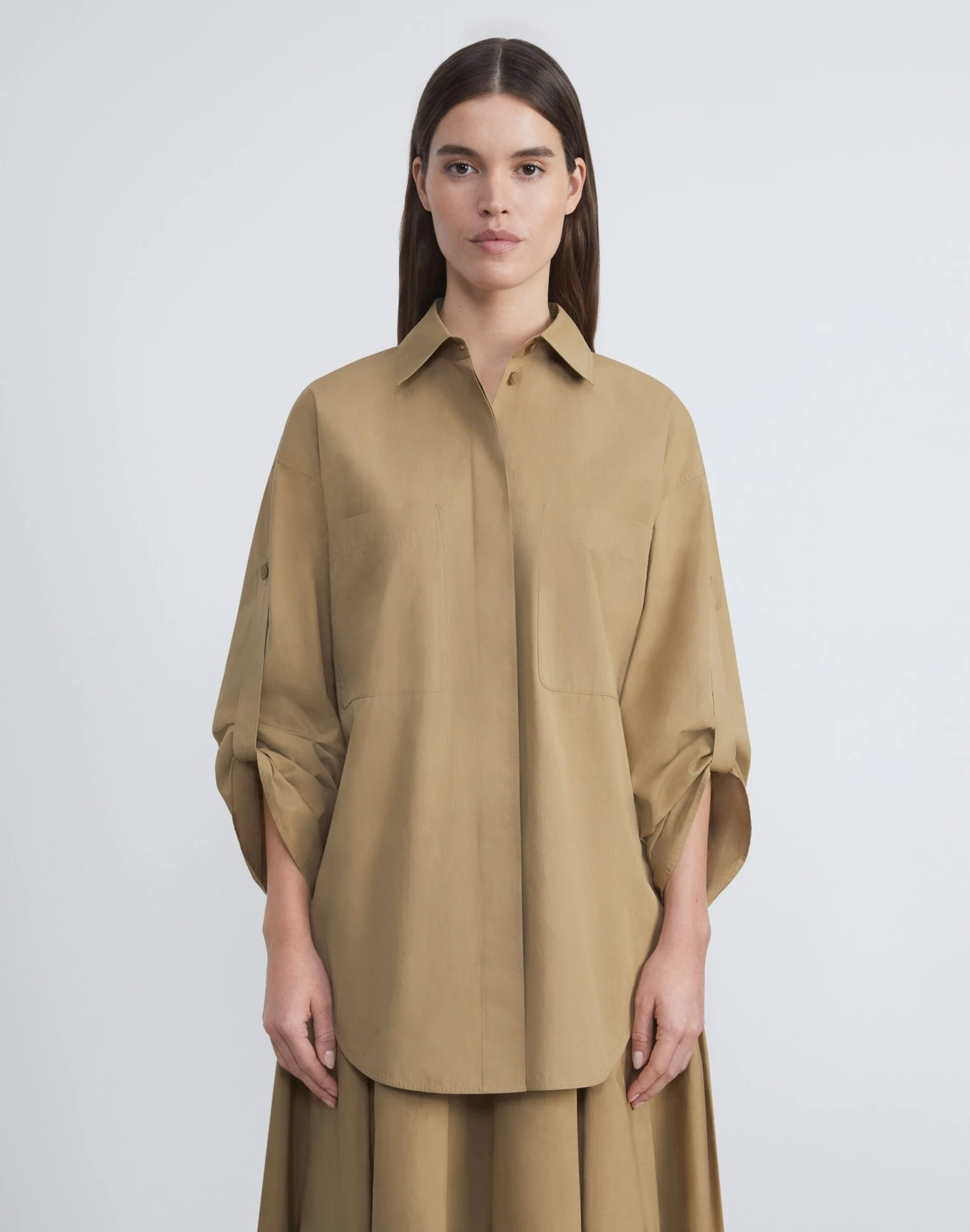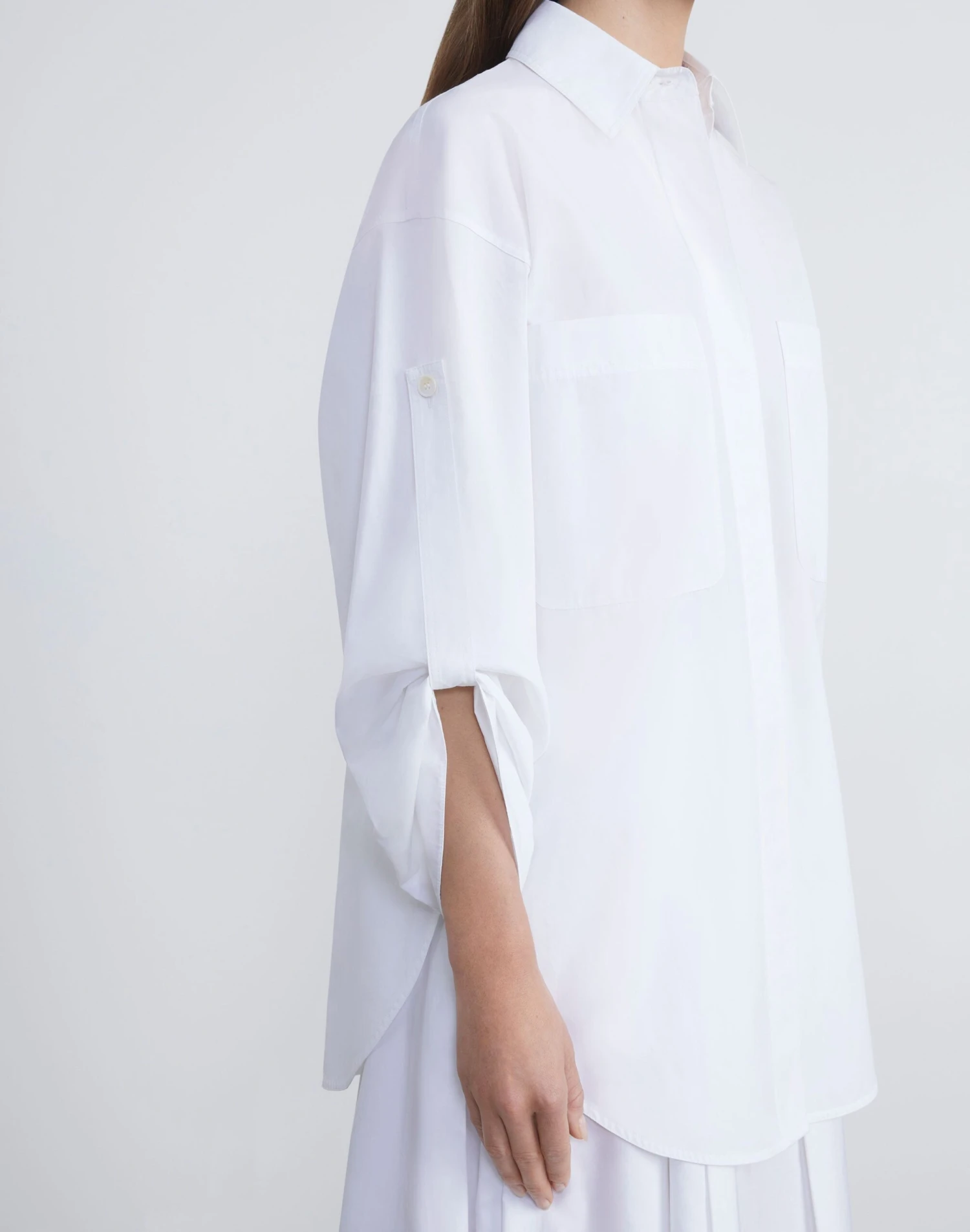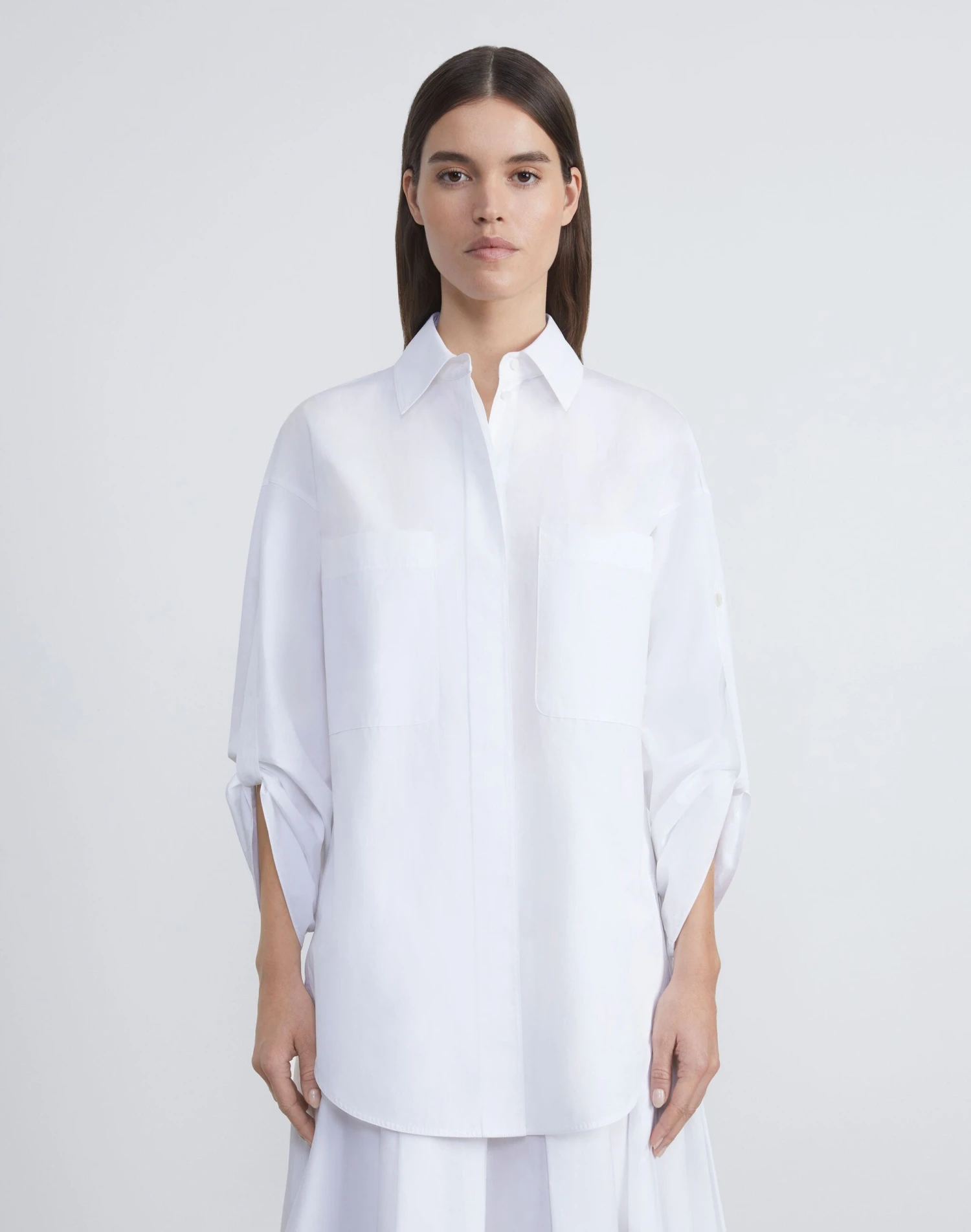 A study in versatile design, this classic collared shirt is cut from lightweight organic Italian cotton poplin with detachable button-tab sleeves for wearing cinched, cuffed or released to slightly above the wrist. The relaxed silhouette features dropped shoulders, double patch pockets and a curved hem, punctuated by airy side slits.