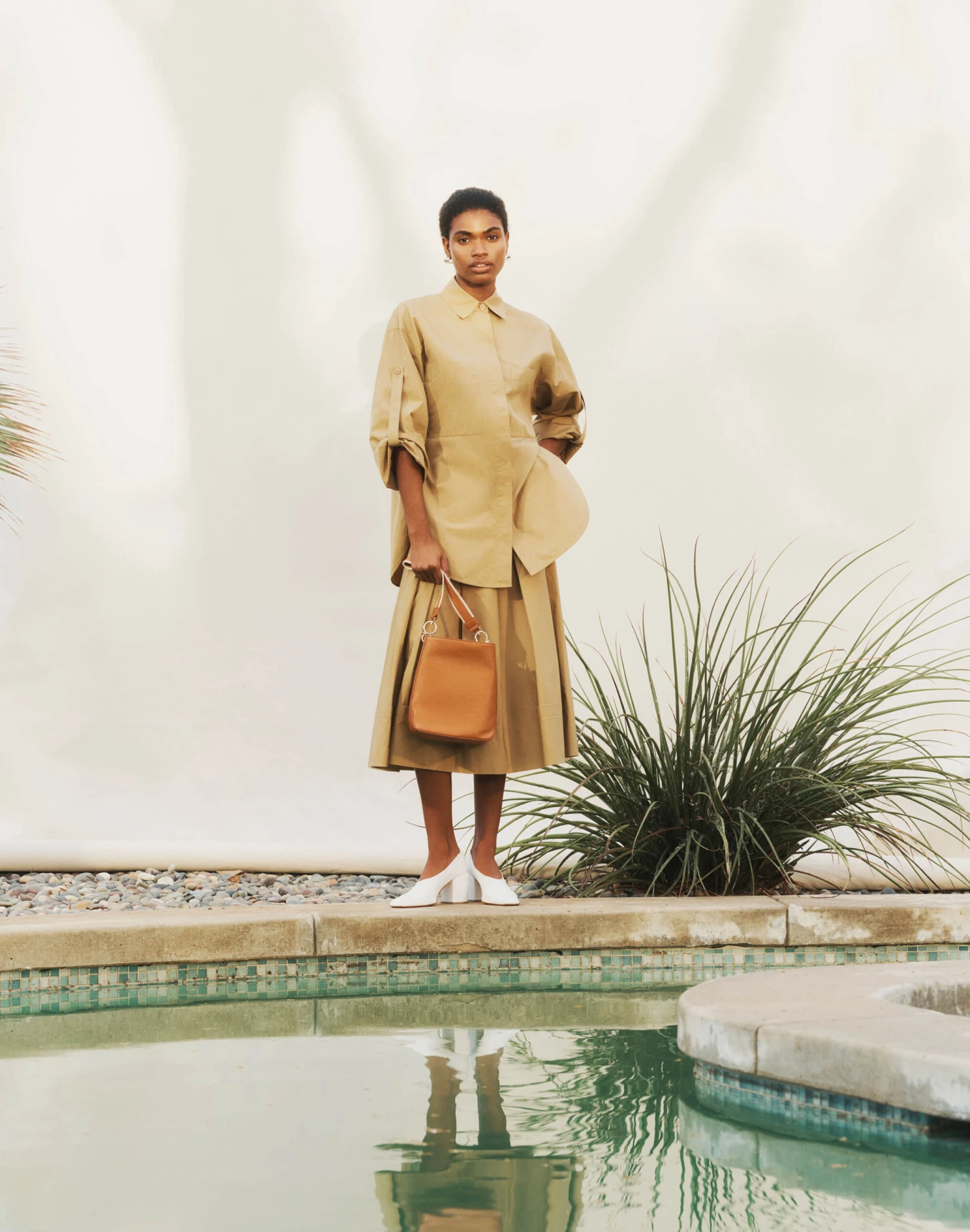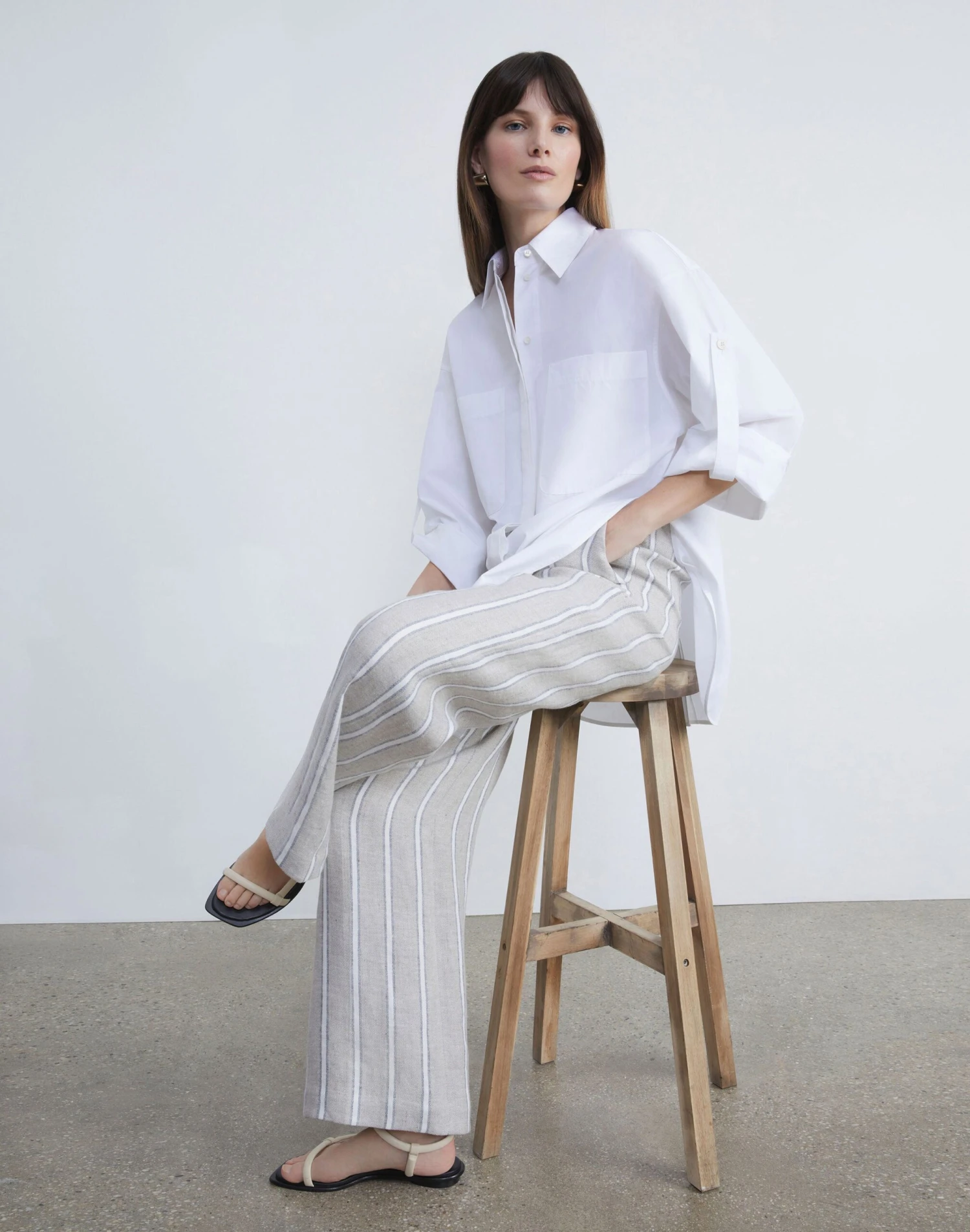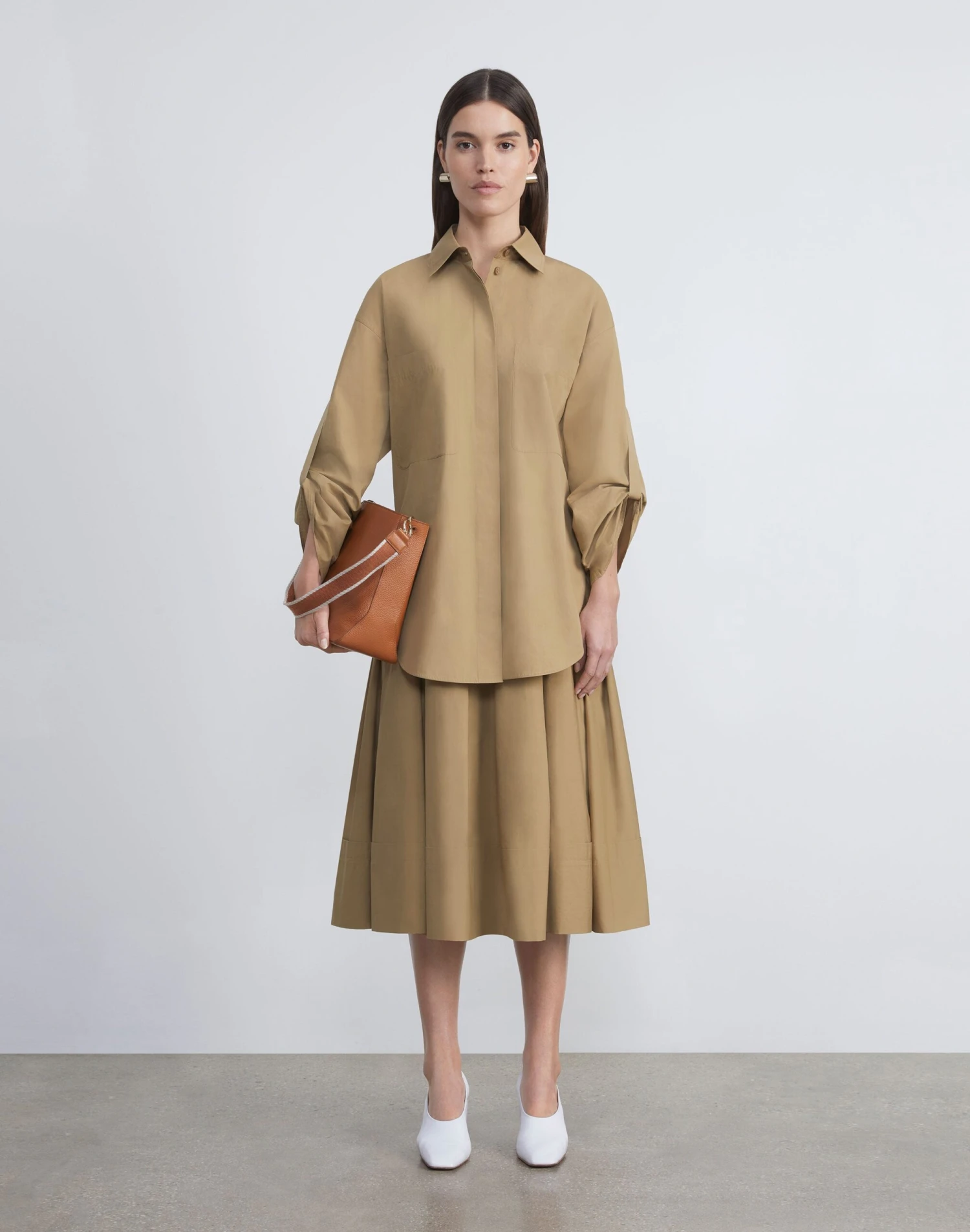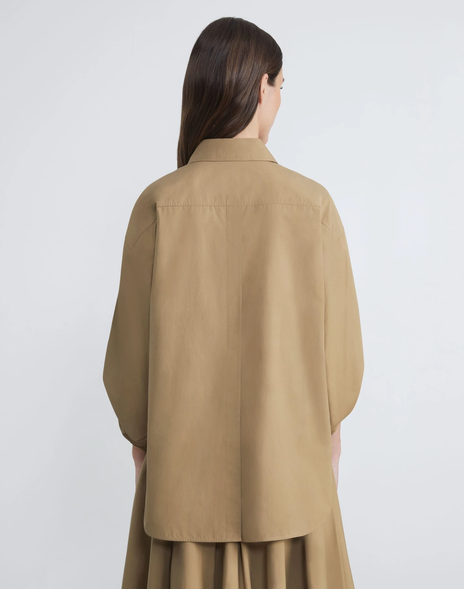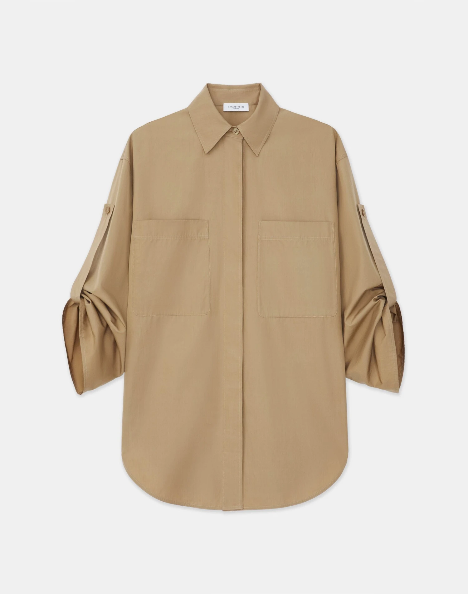 A study in versatile design, this classic collared shirt is cut from lightweight organic Italian cotton poplin with detachable button-tab sleeves for wearing cinched, cuffed or released to slightly above the wrist. The relaxed silhouette features dropped shoulders, double patch pockets and a curved hem, punctuated by airy side slits.