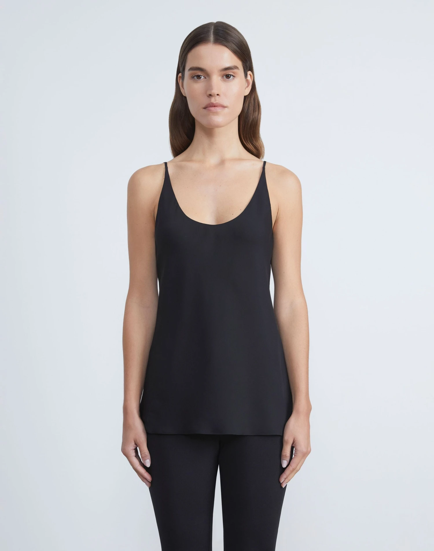 Epitomizing sensual simplicity and modern versatility, this camisole made for layering and beautifully crafted in fluid organic silk georgette. It’s cut on the bias for contouring shape and framed with a deep scoop neckline and ultra-slim straps that adjust at the back.