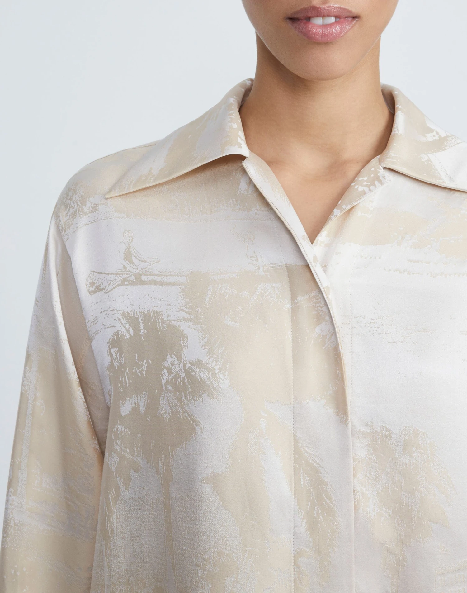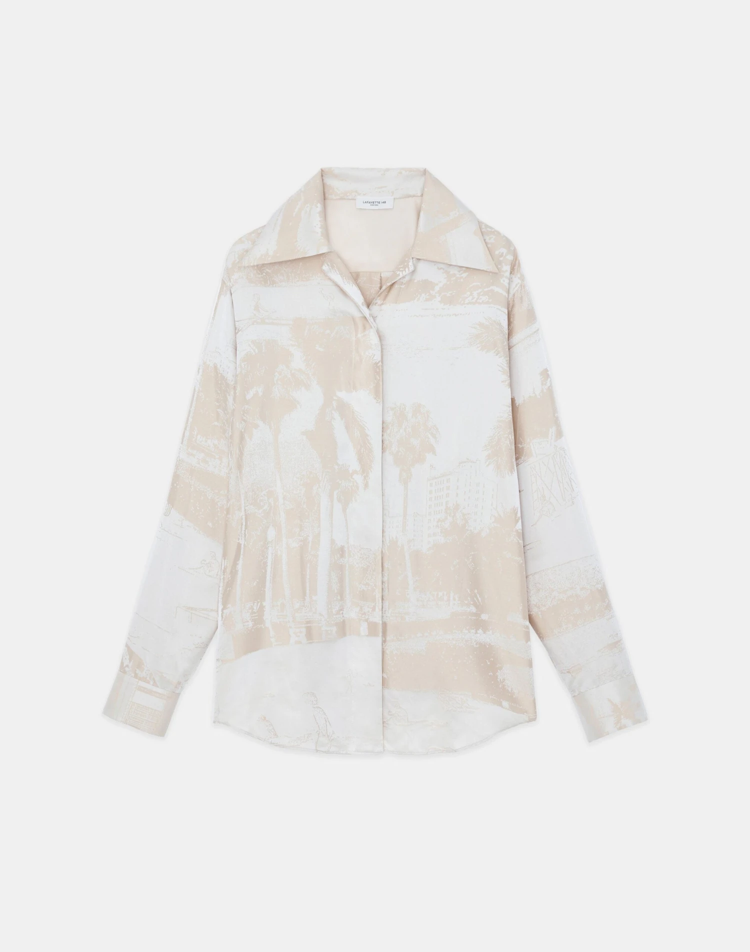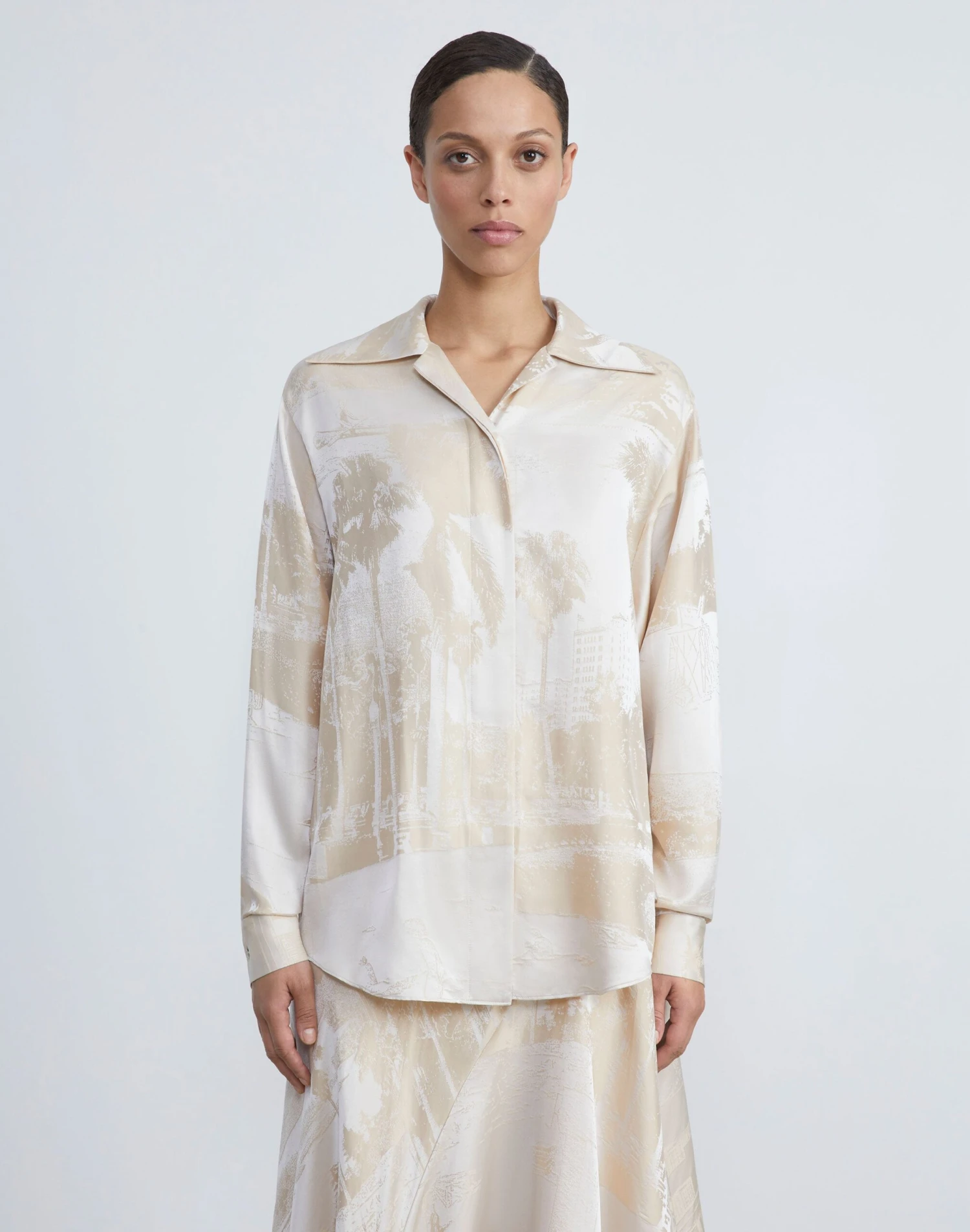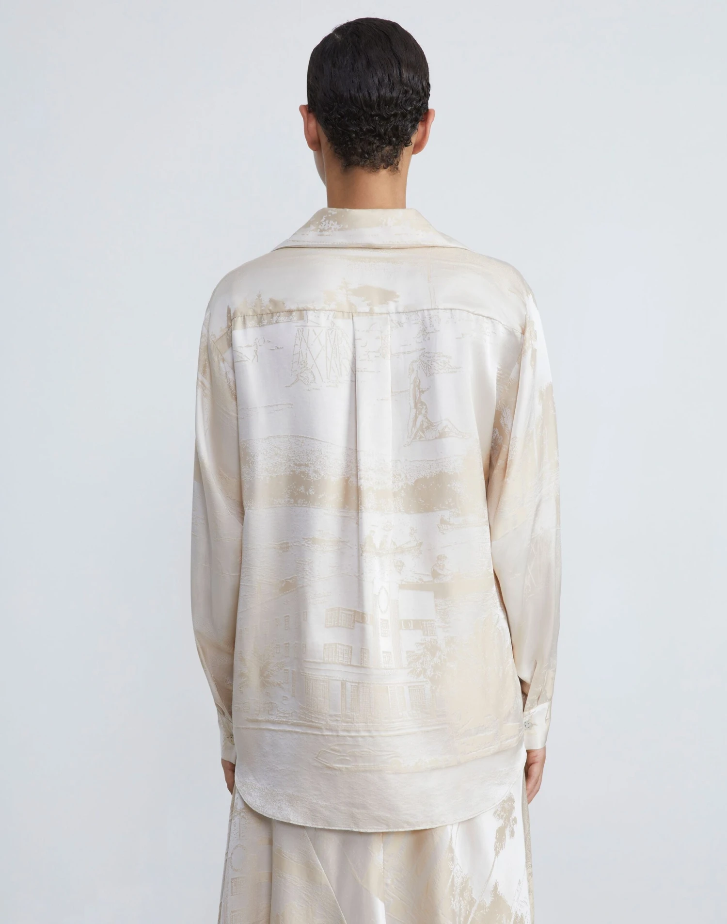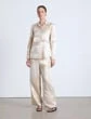 Artful allure and ’70s-inflected tailoring combine in this cutaway collar blouse, intricately woven in Pre-Fall 2023’s vintage Postcards motif on fluid, Italian silk jacquard. The relaxed silhouette is finished with a hidden placket, button-cuff sleeves and designed to pair effortlessly with the matching .