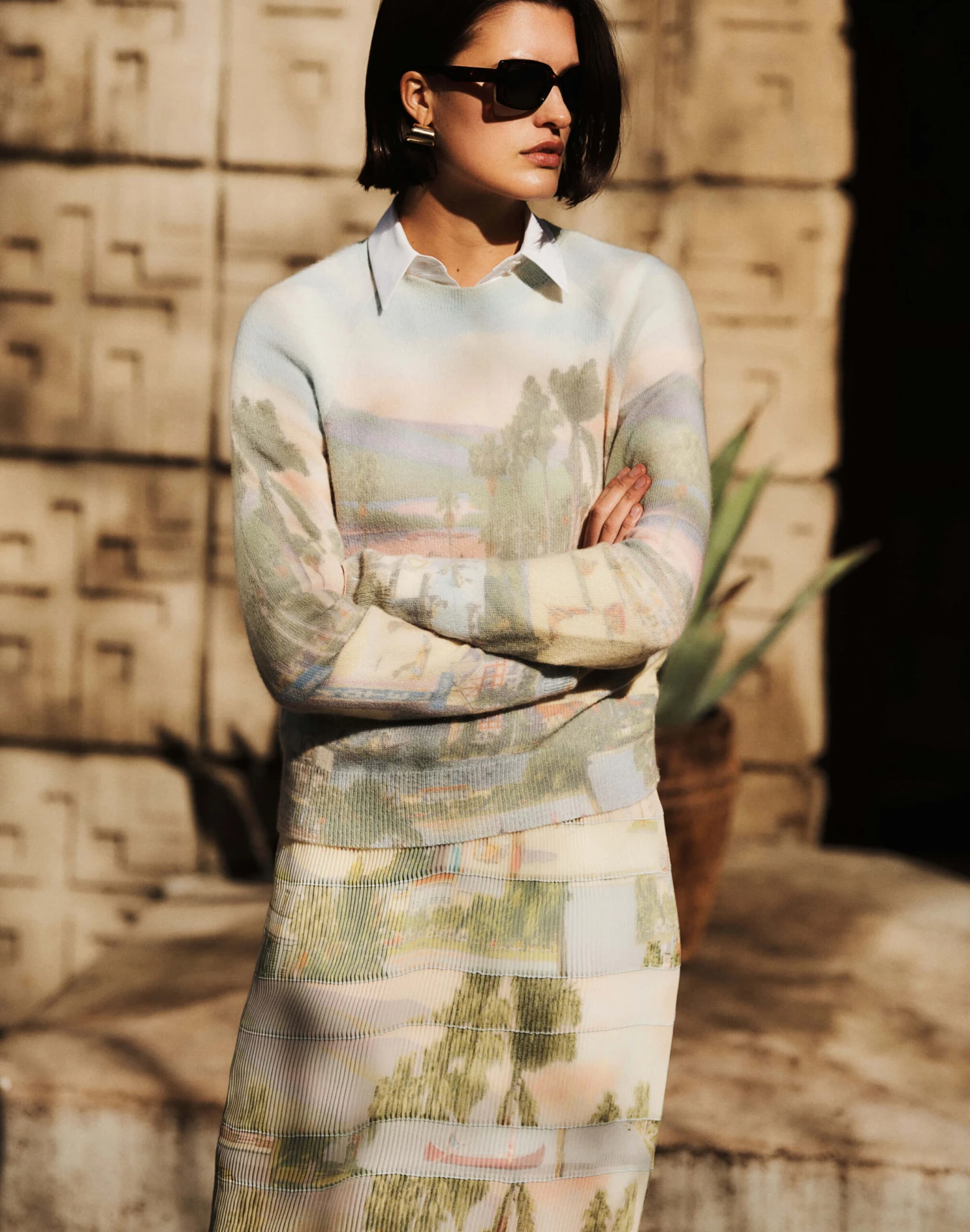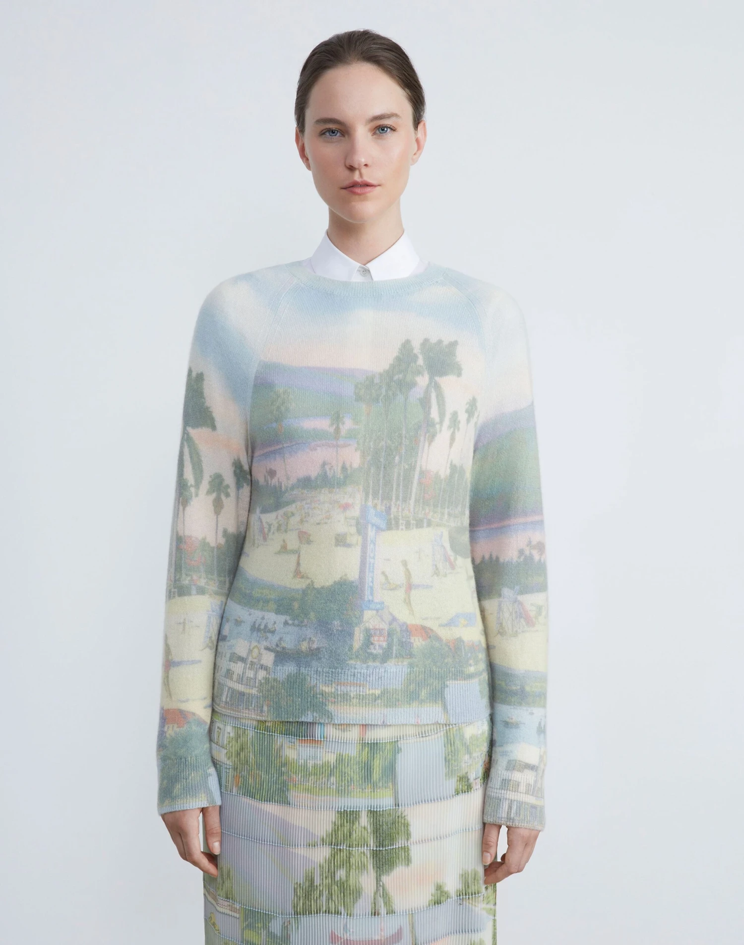 This graphic crewneck sweater is finely knit from lofty cashmere yarns, rendering an immaculate canvas for the collection’s vintage Postcards motif. It’s cut in a relaxed silhouette with roomy dolman sleeves and designed to pair effortlessly with the coordinating .