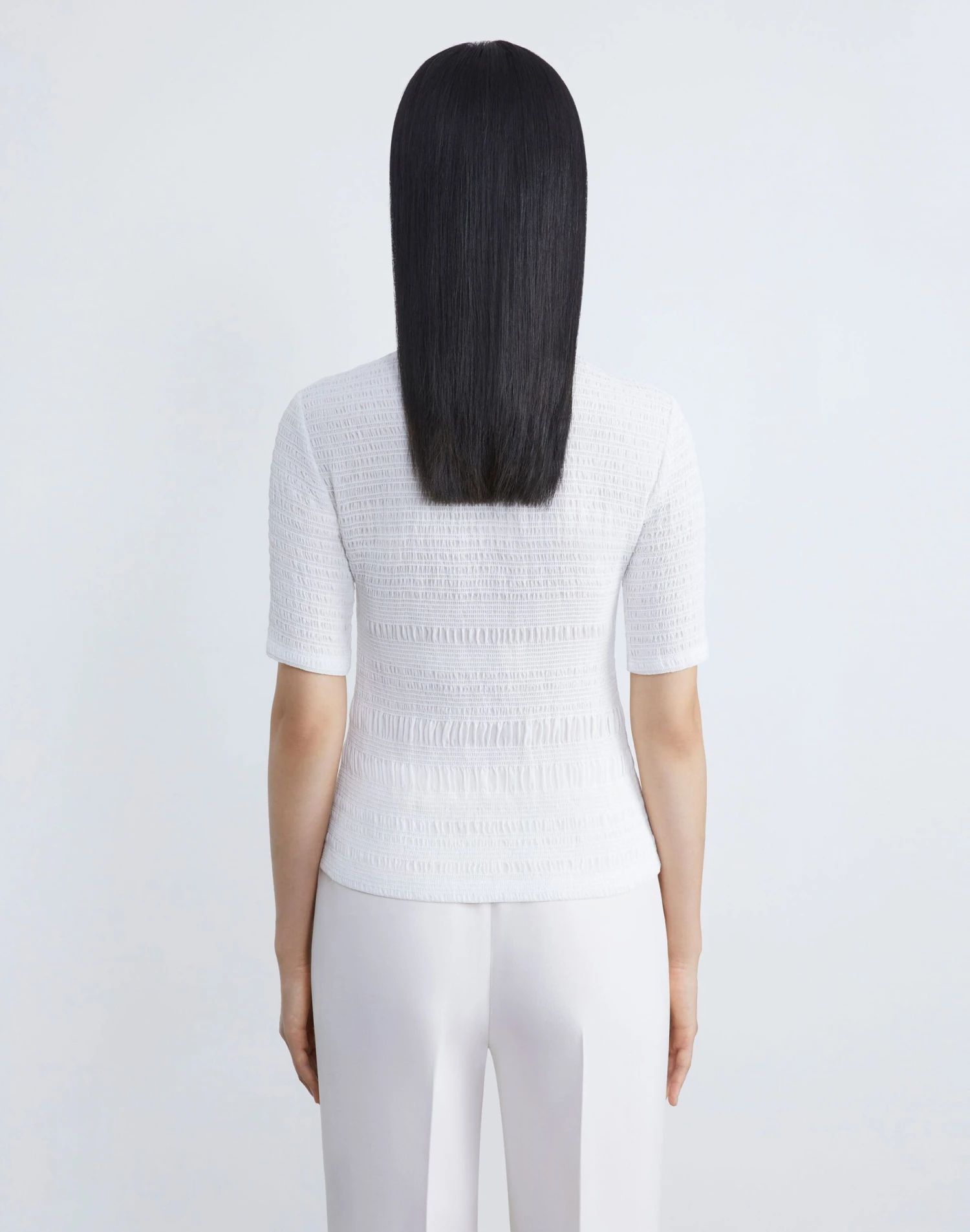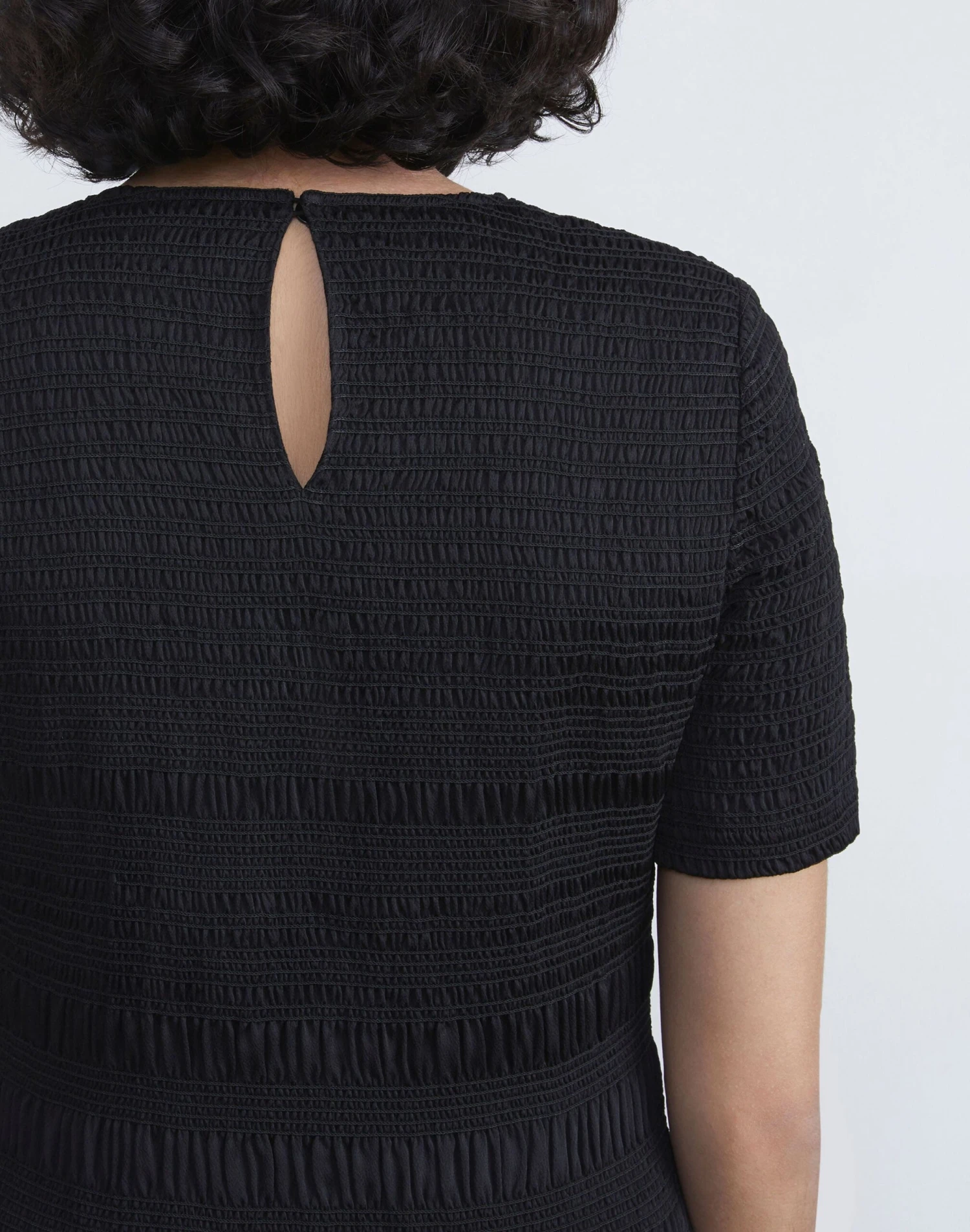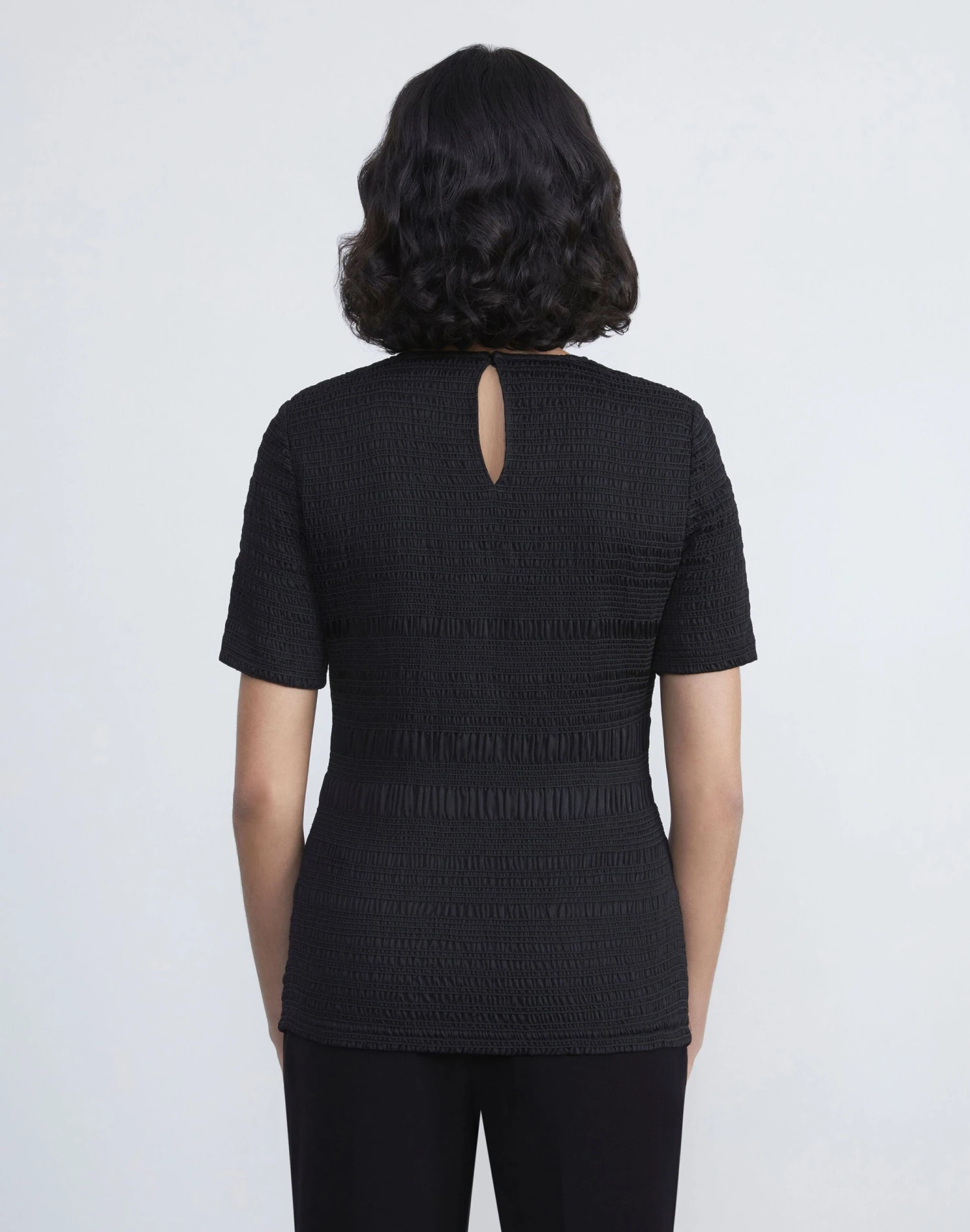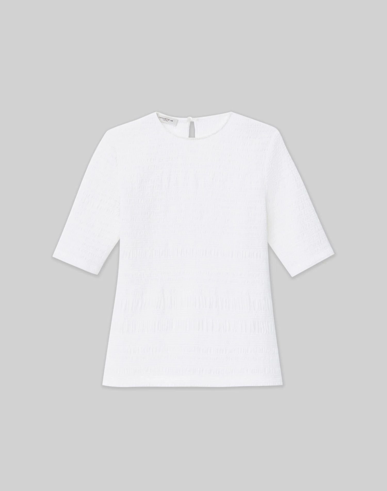 A textural take on the House’s signature stripe, this short sleeve blouse is meticulously crafted with alternating rows of gathered smocking on lightweight satin. The sculptural shape is cut with a contouring close fit, clean crewneck and keyhole fastening at the back.