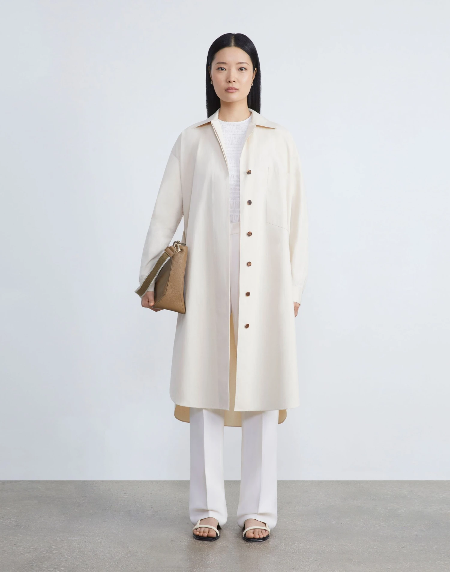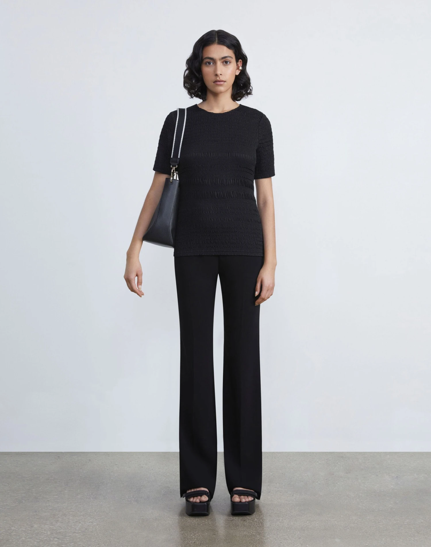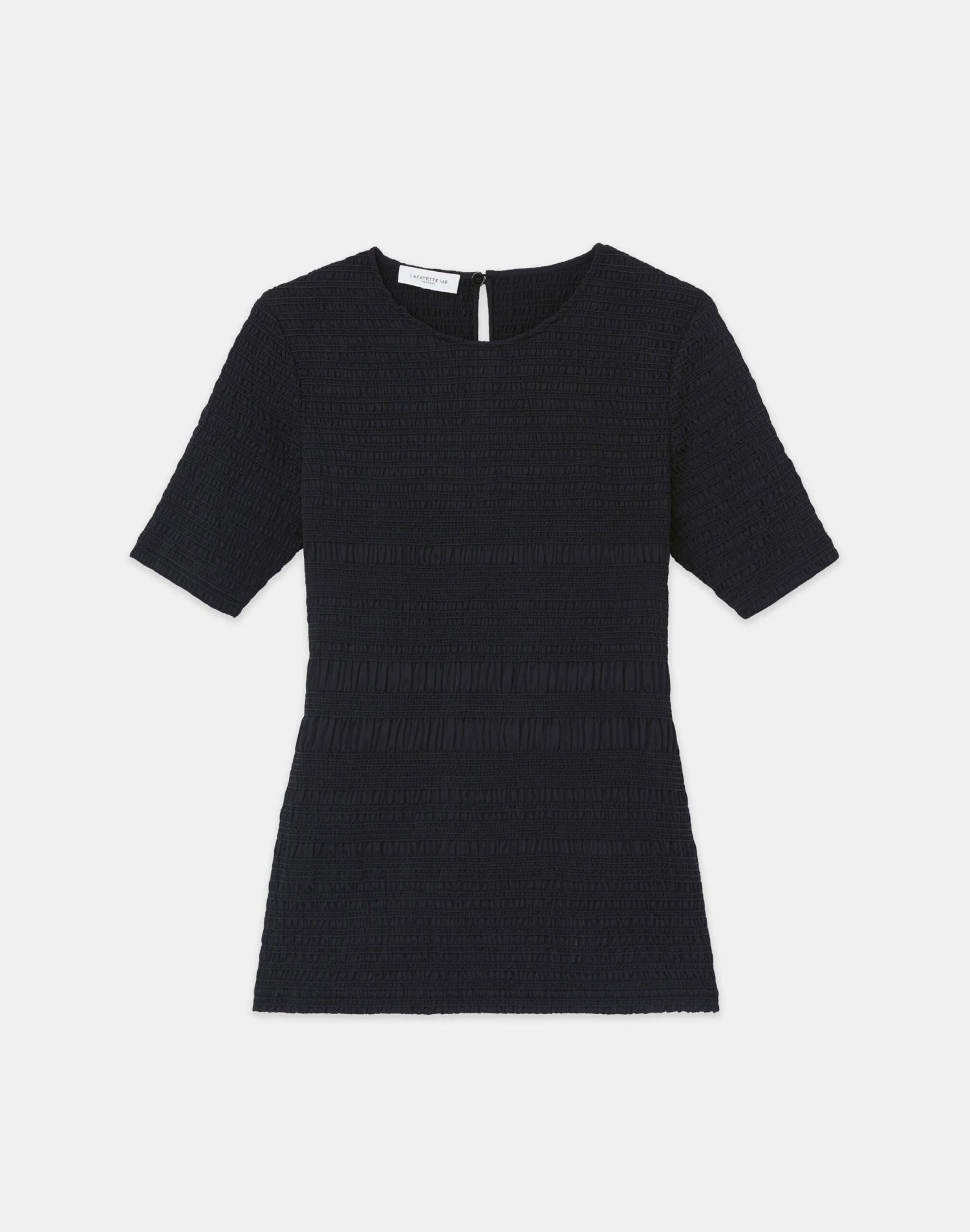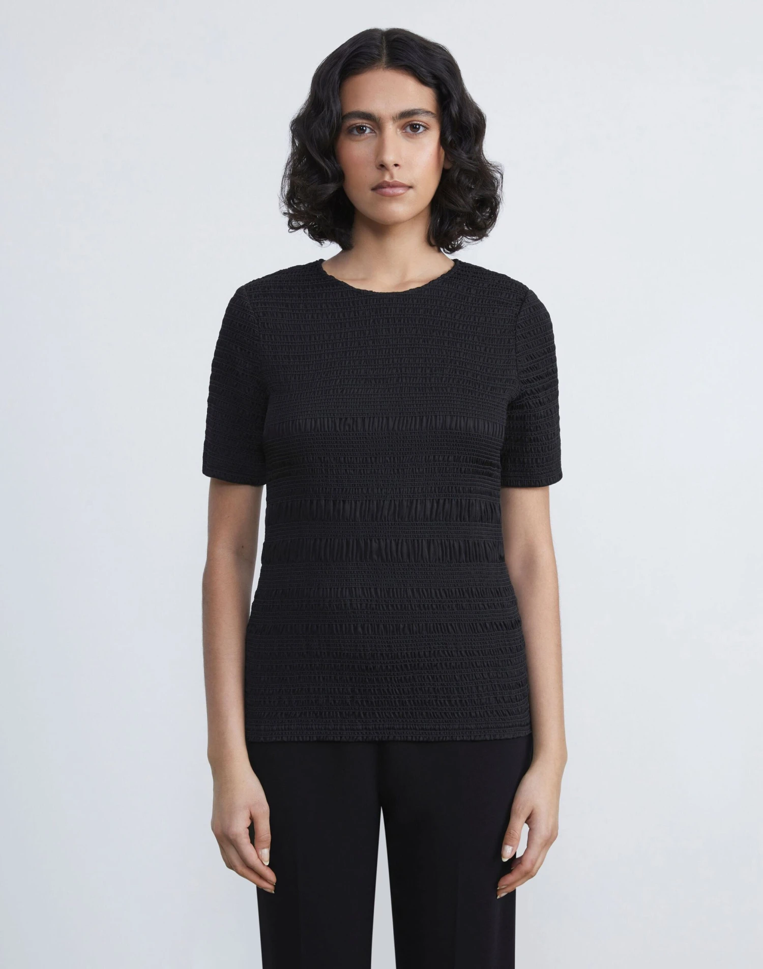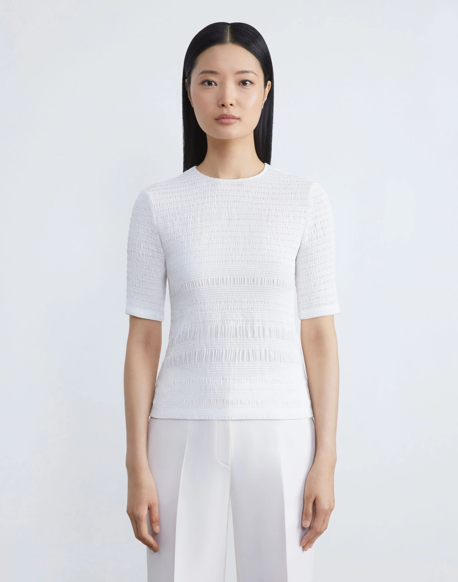A textural take on the House’s signature stripe, this short sleeve blouse is meticulously crafted with alternating rows of gathered smocking on lightweight satin. The sculptural shape is cut with a contouring close fit, clean crewneck and keyhole fastening at the back.