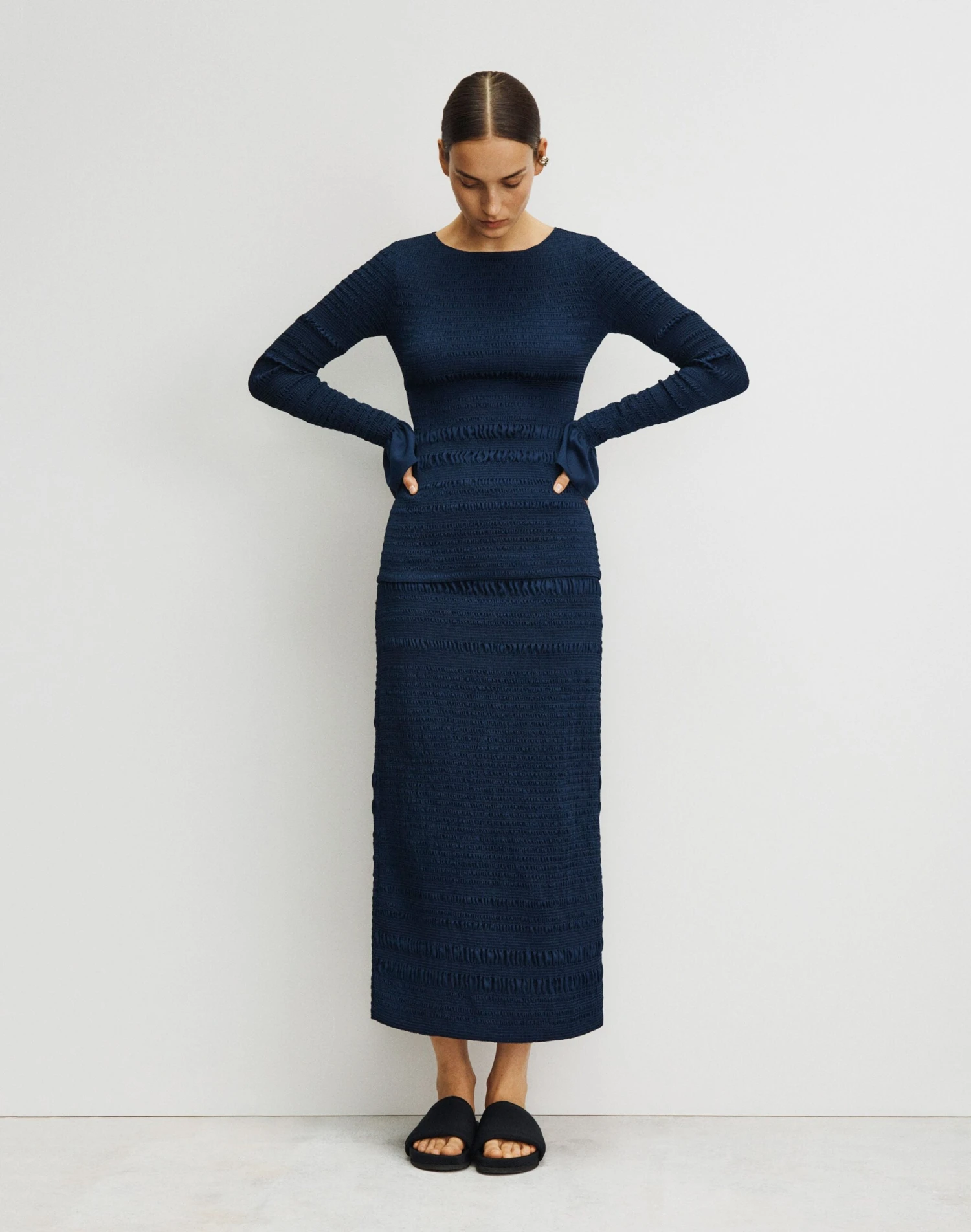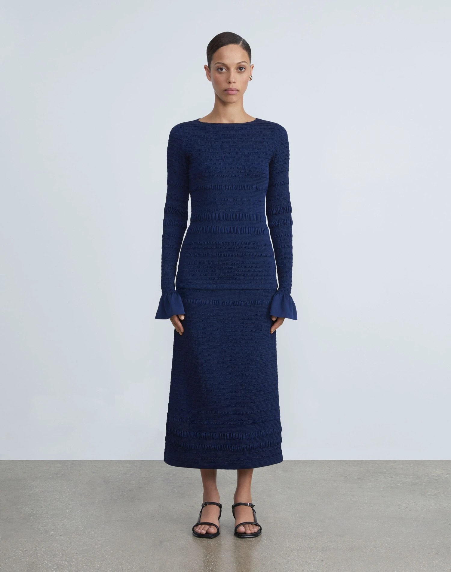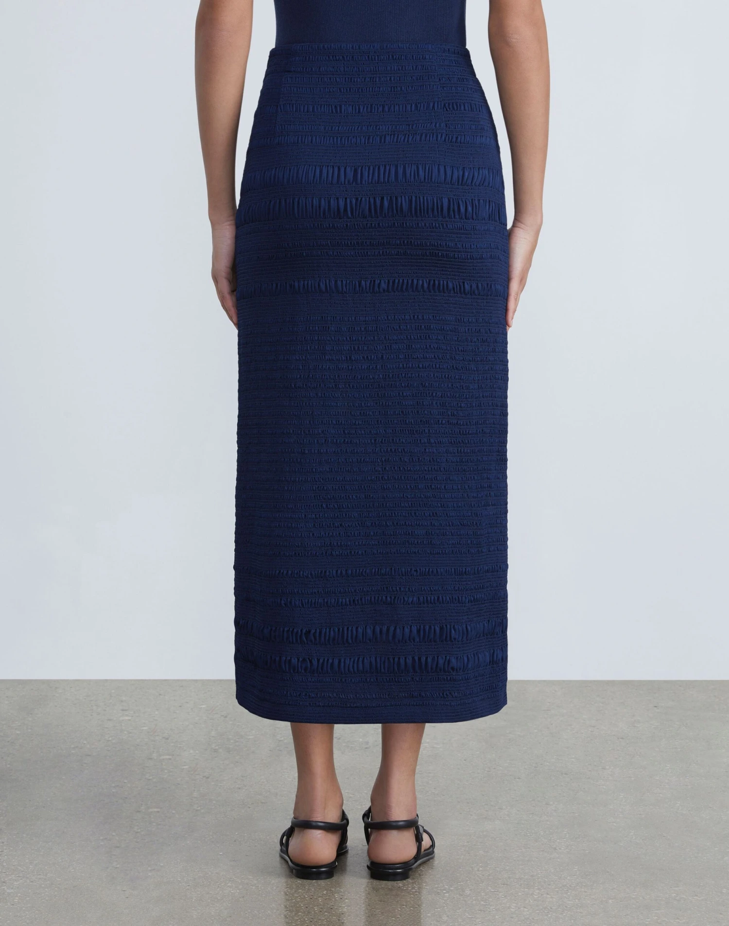 For Pre-Fall 2023, the House’s signature stripe is reimagined through meticulously engineered rows of gathered smocking in this lustrous satin skirt. The soft-yet-sculptural design is cut to a fitted, calf-grazing length, and designed to pair effortlessly with the coordinating .