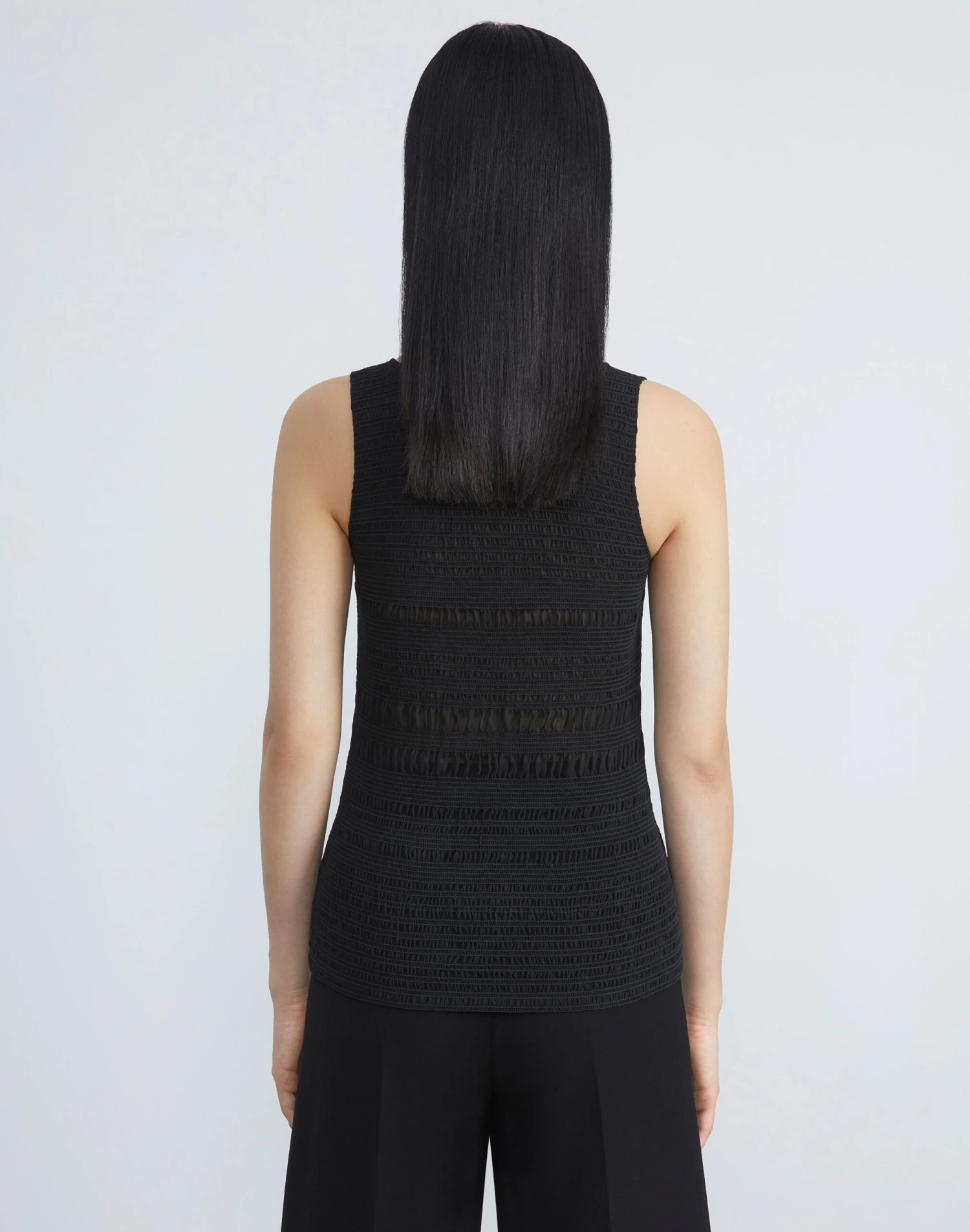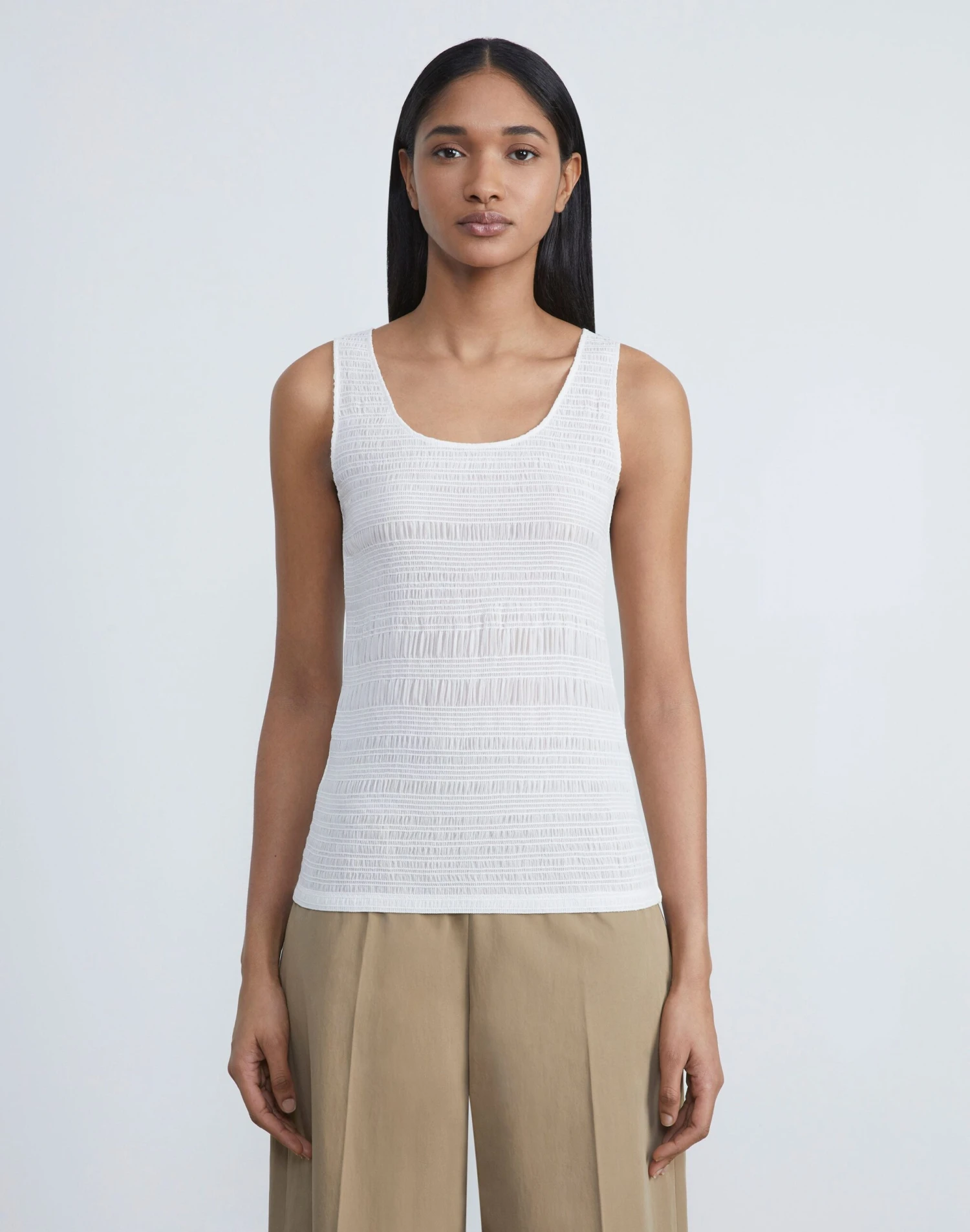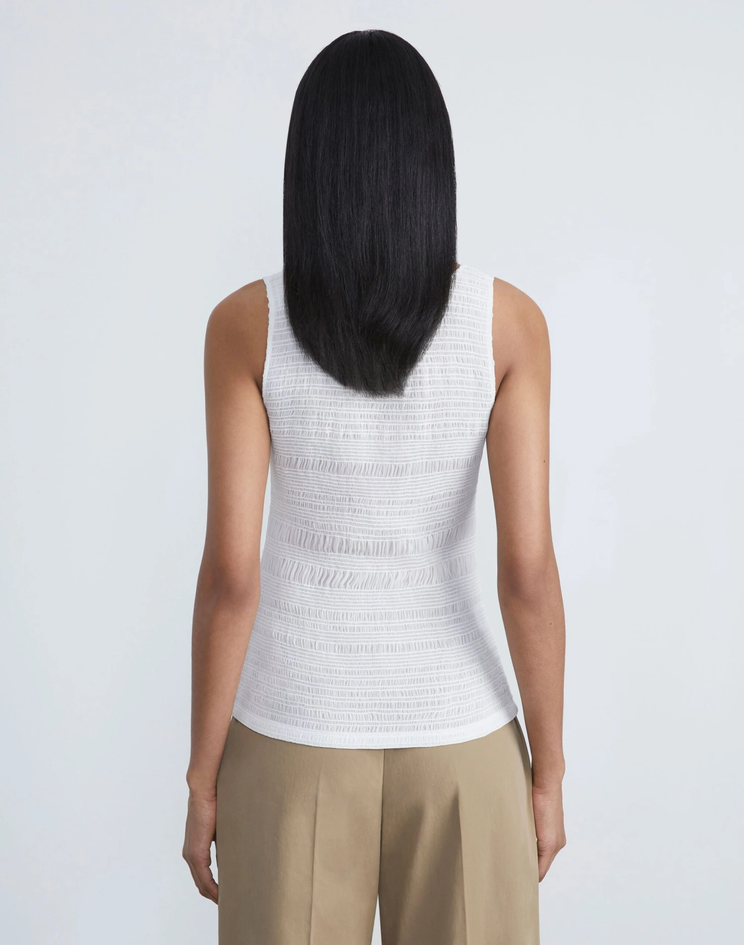 The House’s signature stripe is reimagined through alternating rows of tonal, gathered smocking on lightweight satin in this sleeveless blouse. The sculptural shape is cut with a deep scoop neck and contouring close fit.