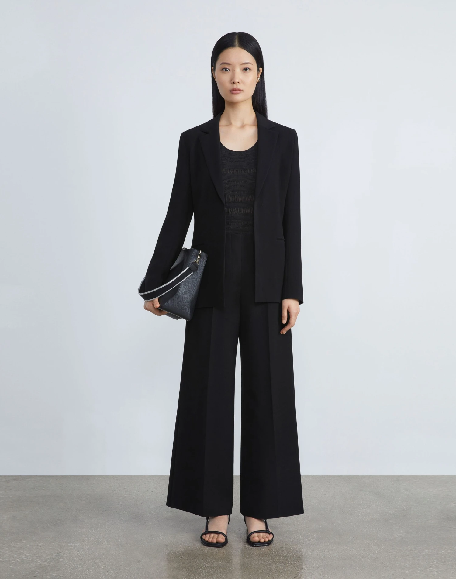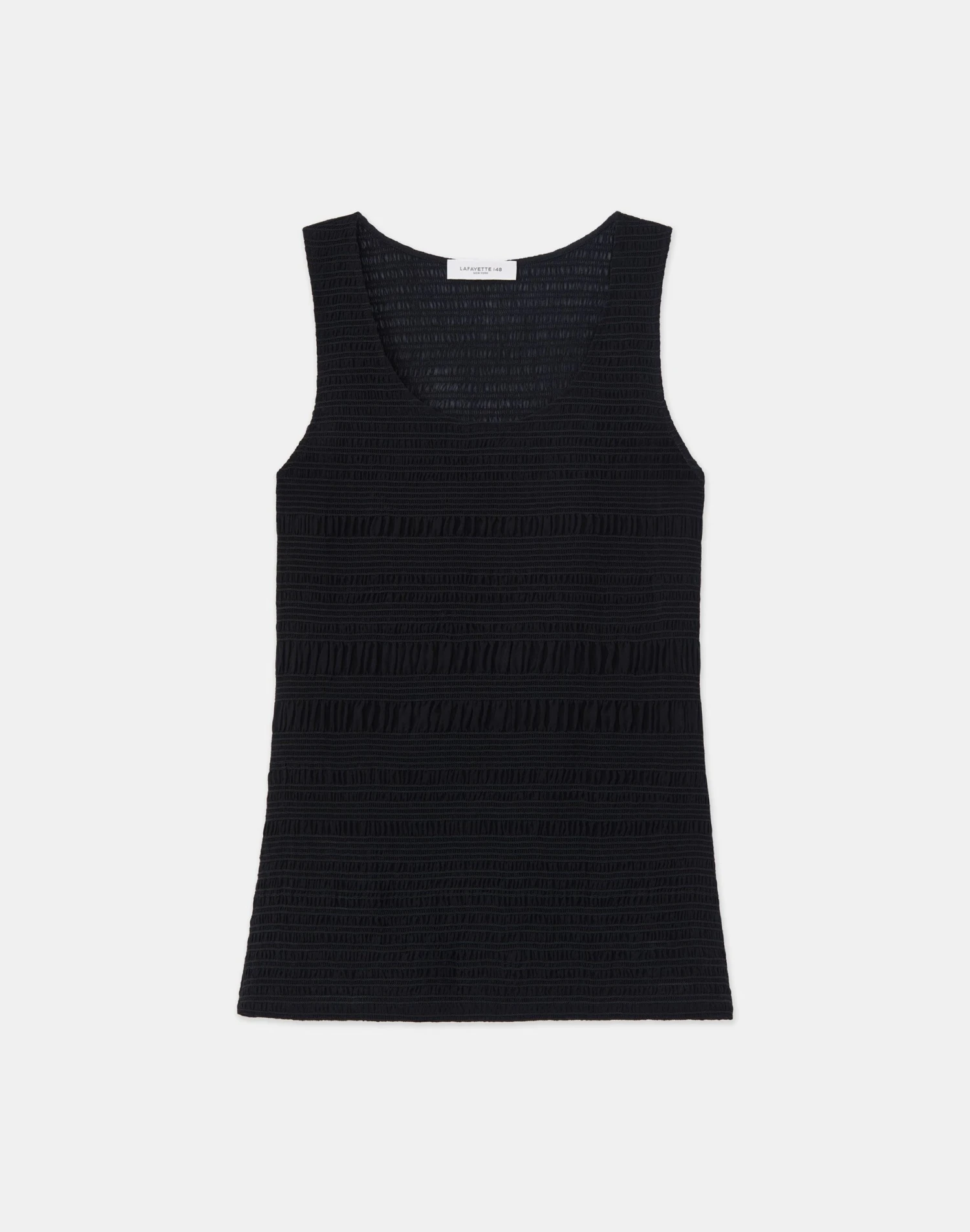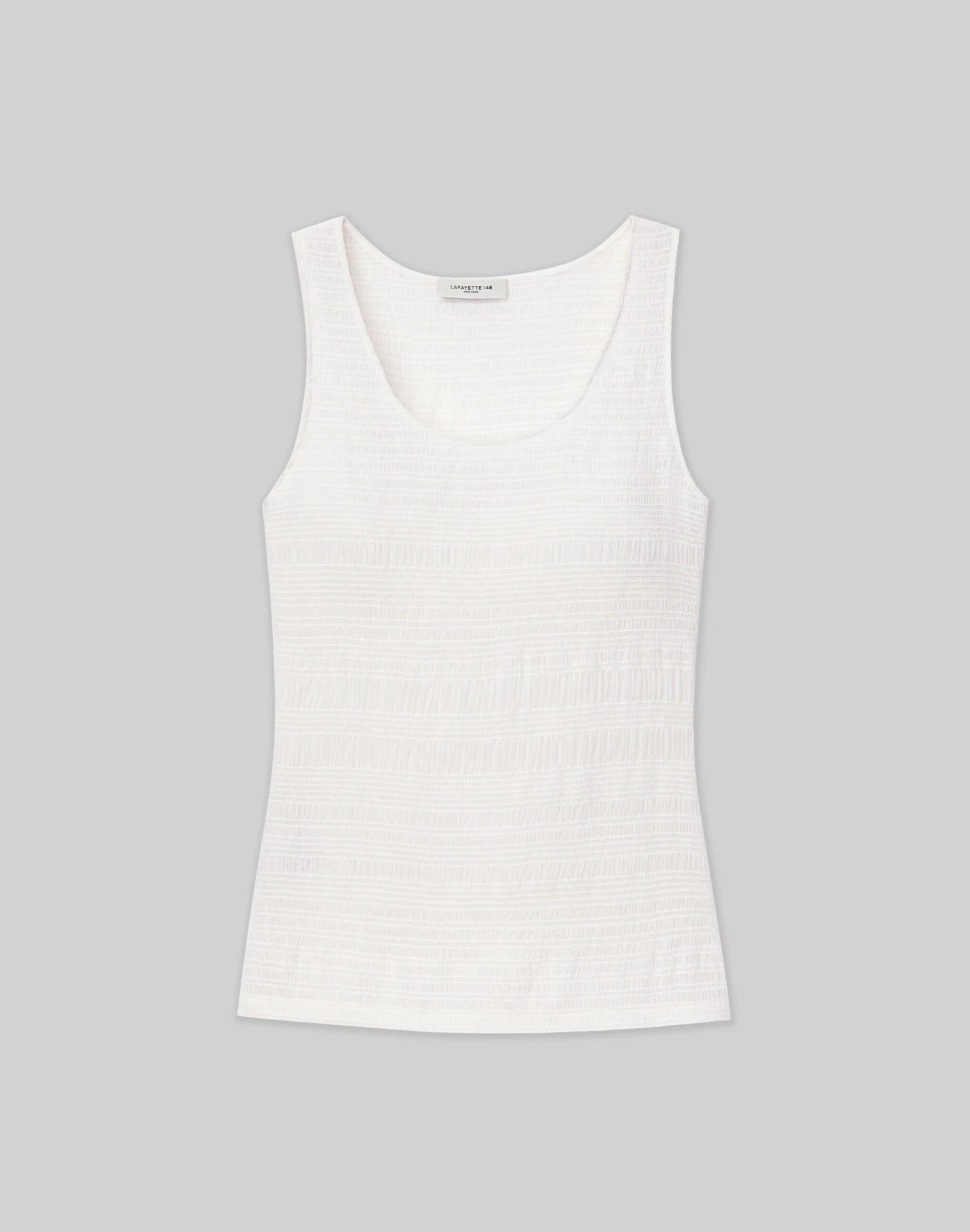 The House’s signature stripe is reimagined through alternating rows of tonal, gathered smocking on lightweight satin in this sleeveless blouse. The sculptural shape is cut with a deep scoop neck and contouring close fit.