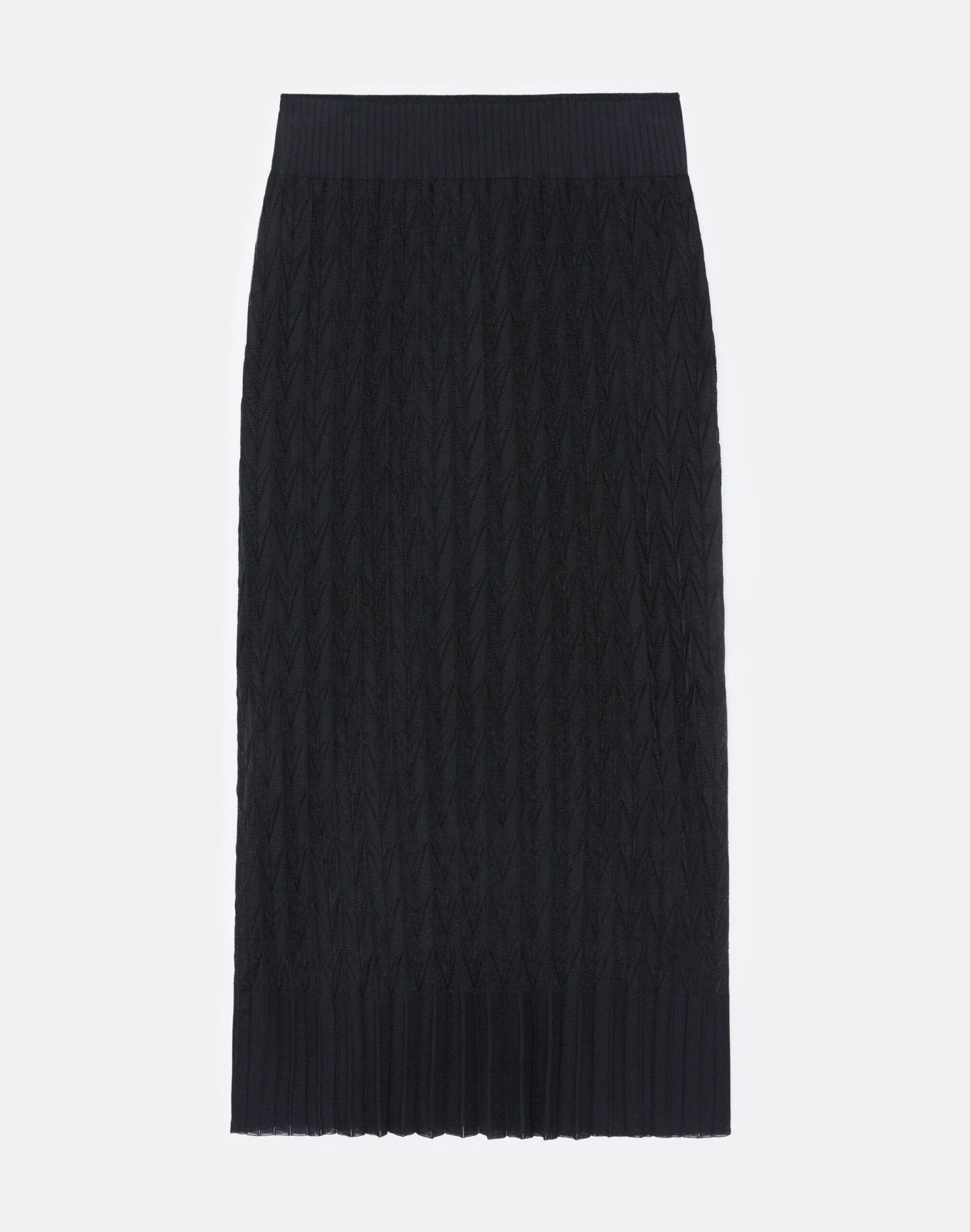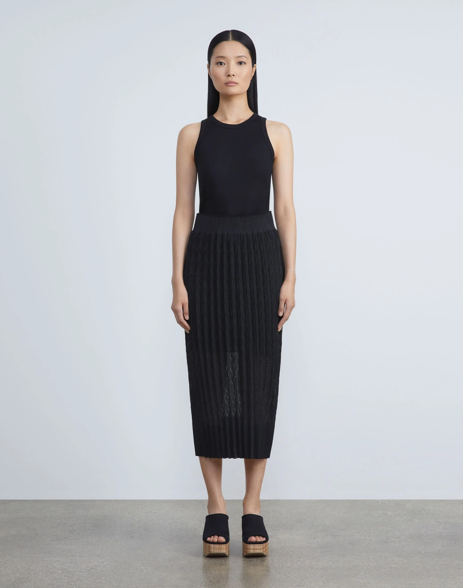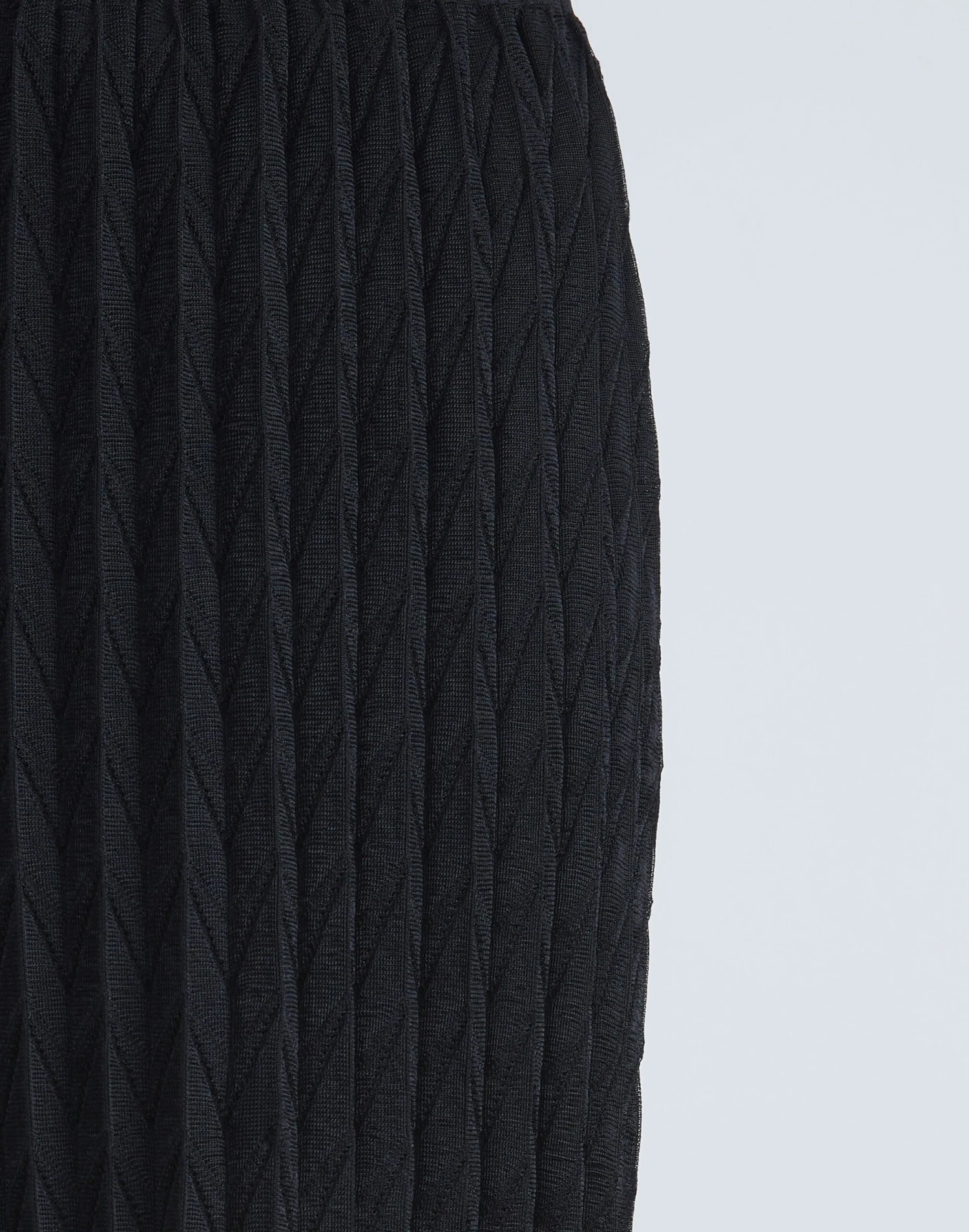 Intricate detail and meticulous craftsmanship combine in this shine-infused skirt, expertly knit in dimensional diamond stitch pleating with a sculptural origami effect. The fitted, semi-sheer silhouette rests high on the waist and flows through to a calf-grazing finish. Pair it with the coordinating .