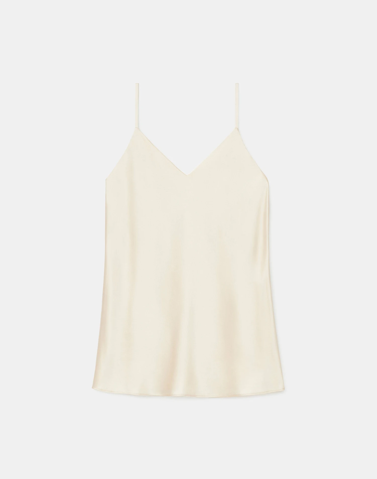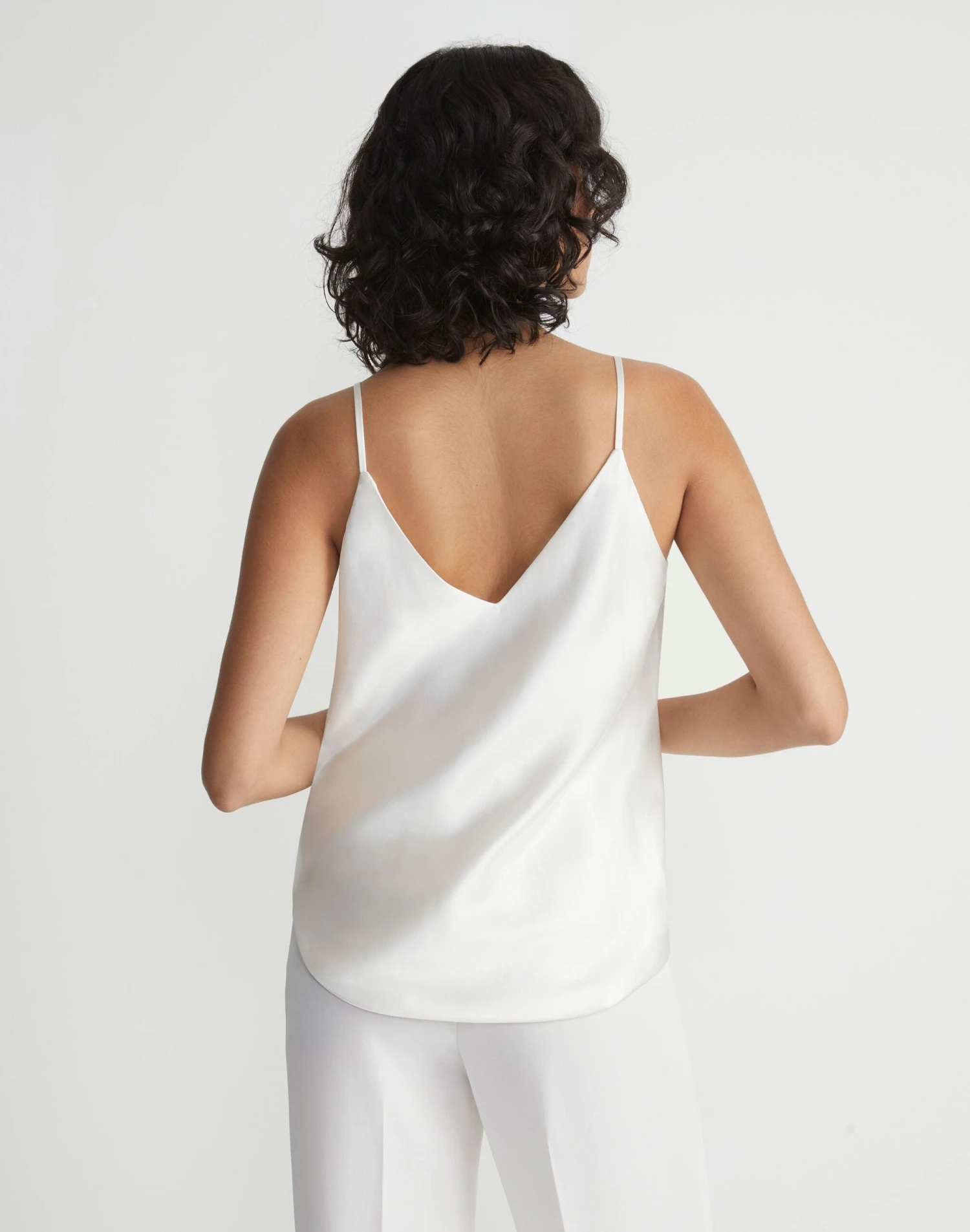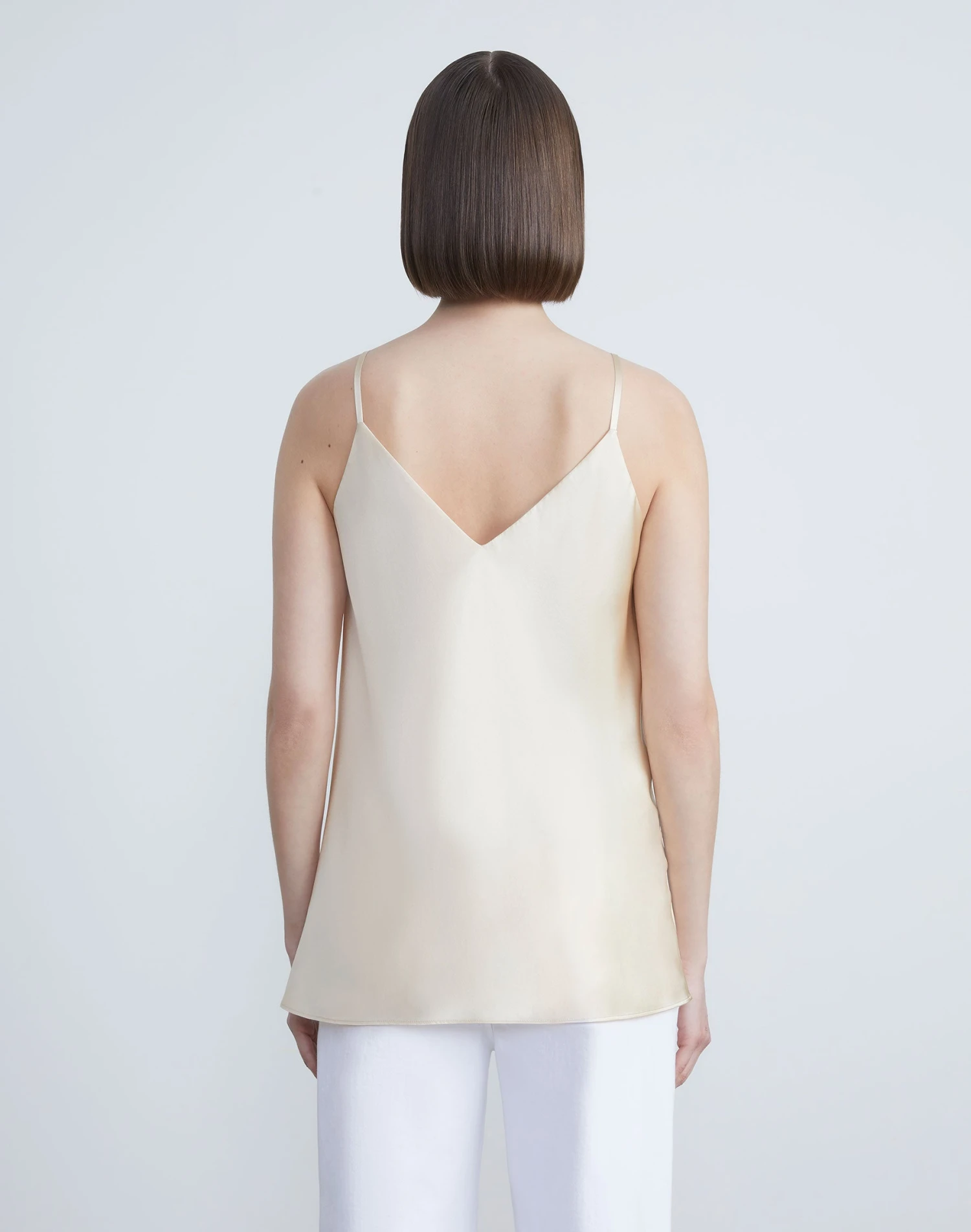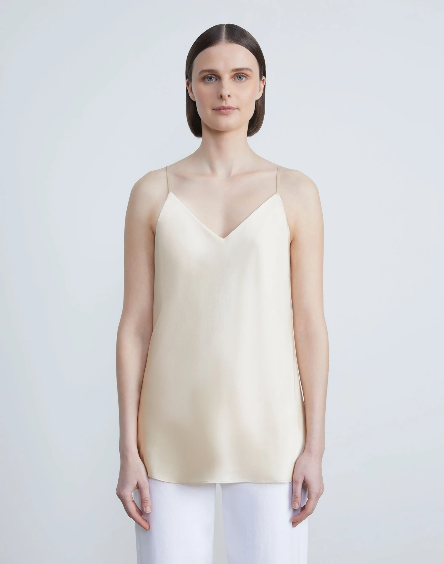 Simply striking, this design-favorite tank is crafted in lustrous, pure silk charmeuse. It’s cut on the bias, draping effortlessly through thin straps and a sharp V-neckline.