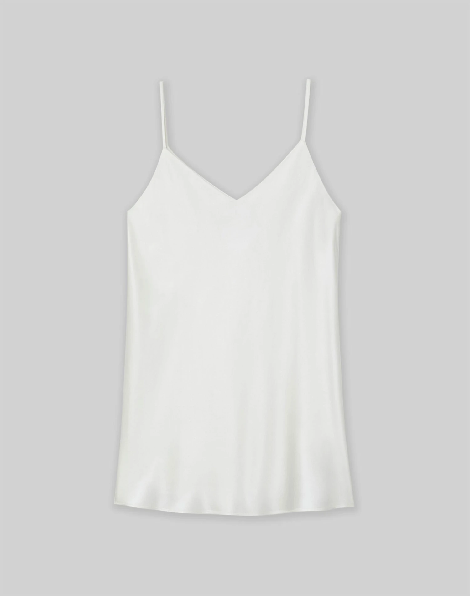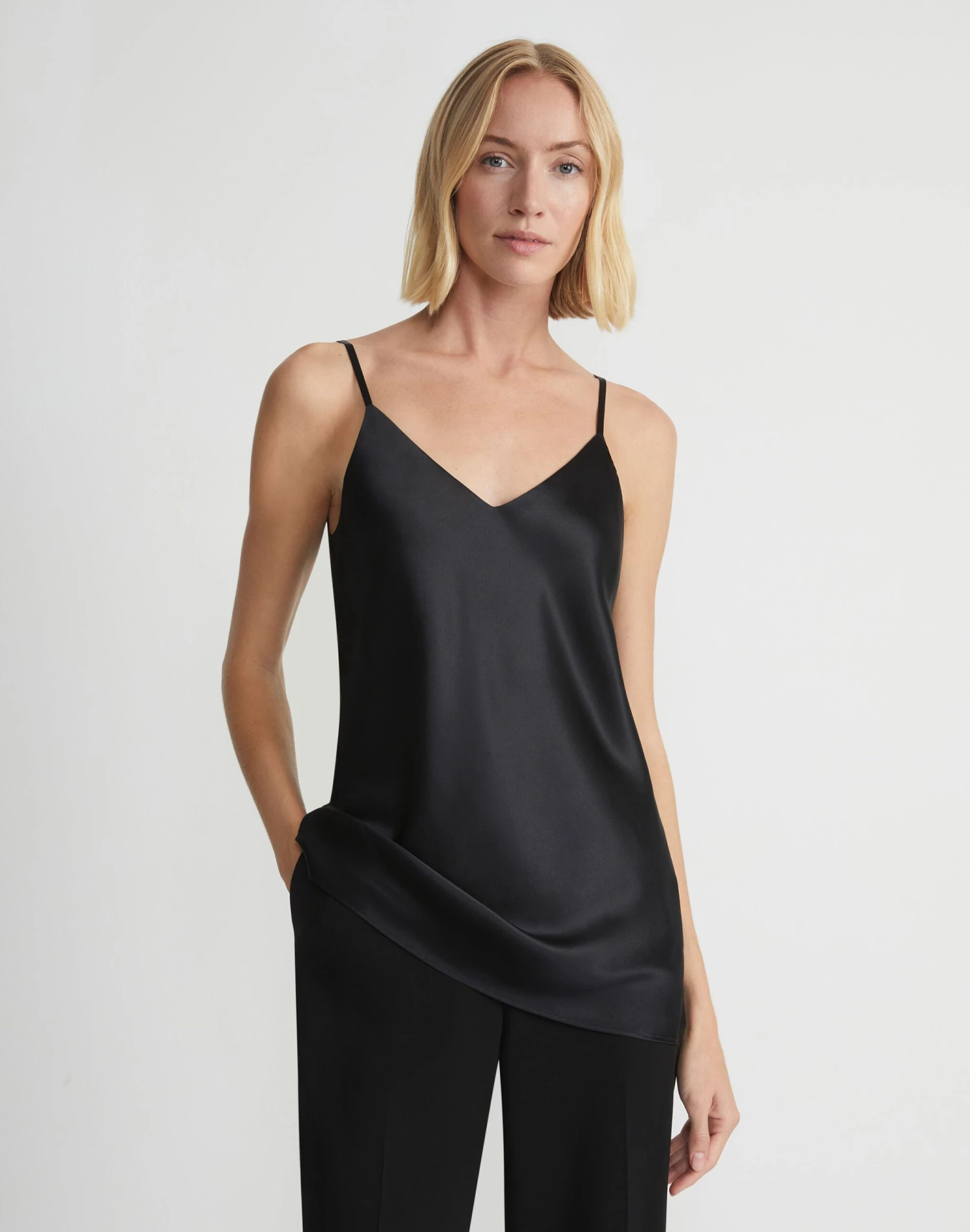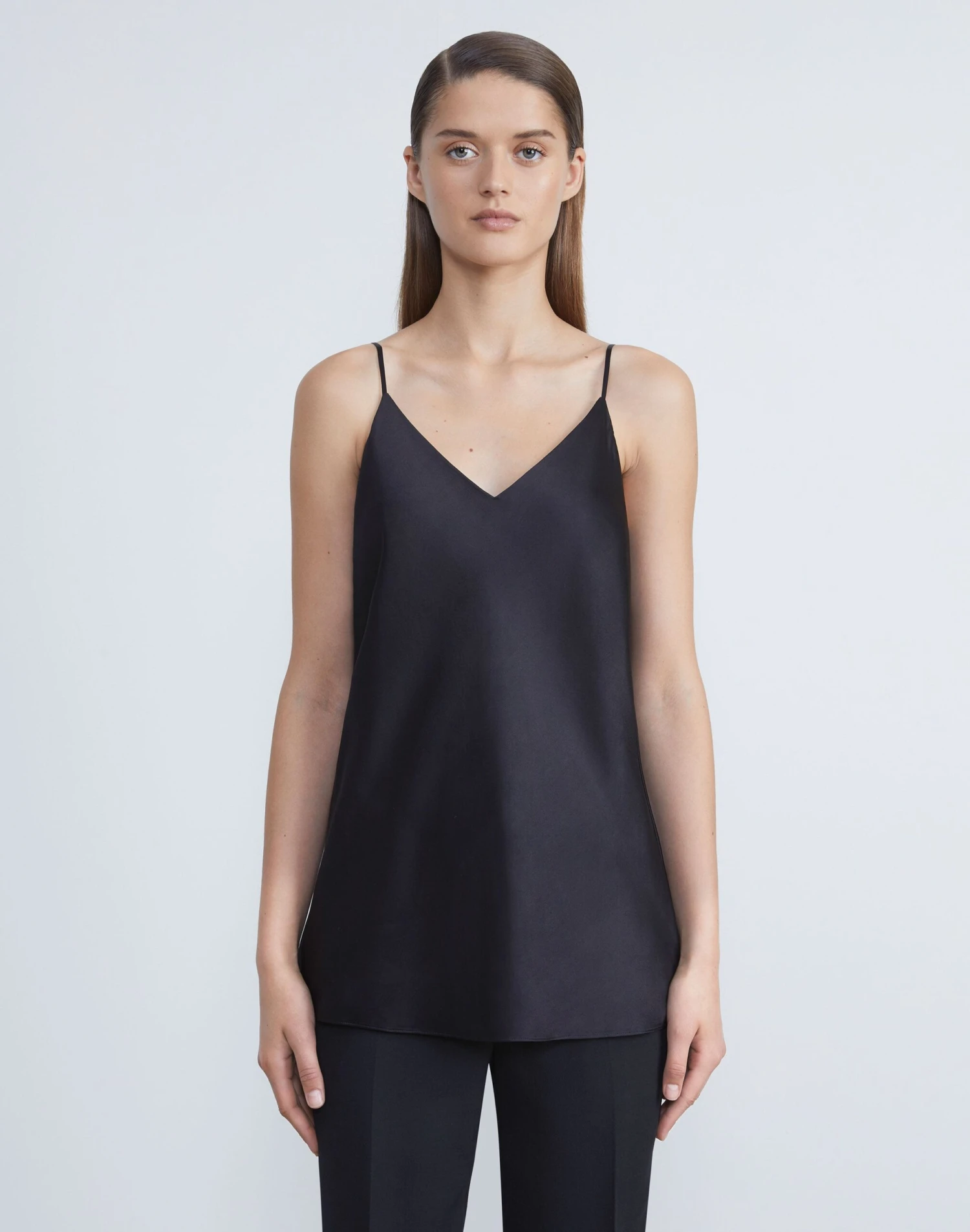 Simply striking, this design-favorite tank is crafted in lustrous, pure silk charmeuse. It’s cut on the bias, draping effortlessly through thin straps and a sharp V-neckline.