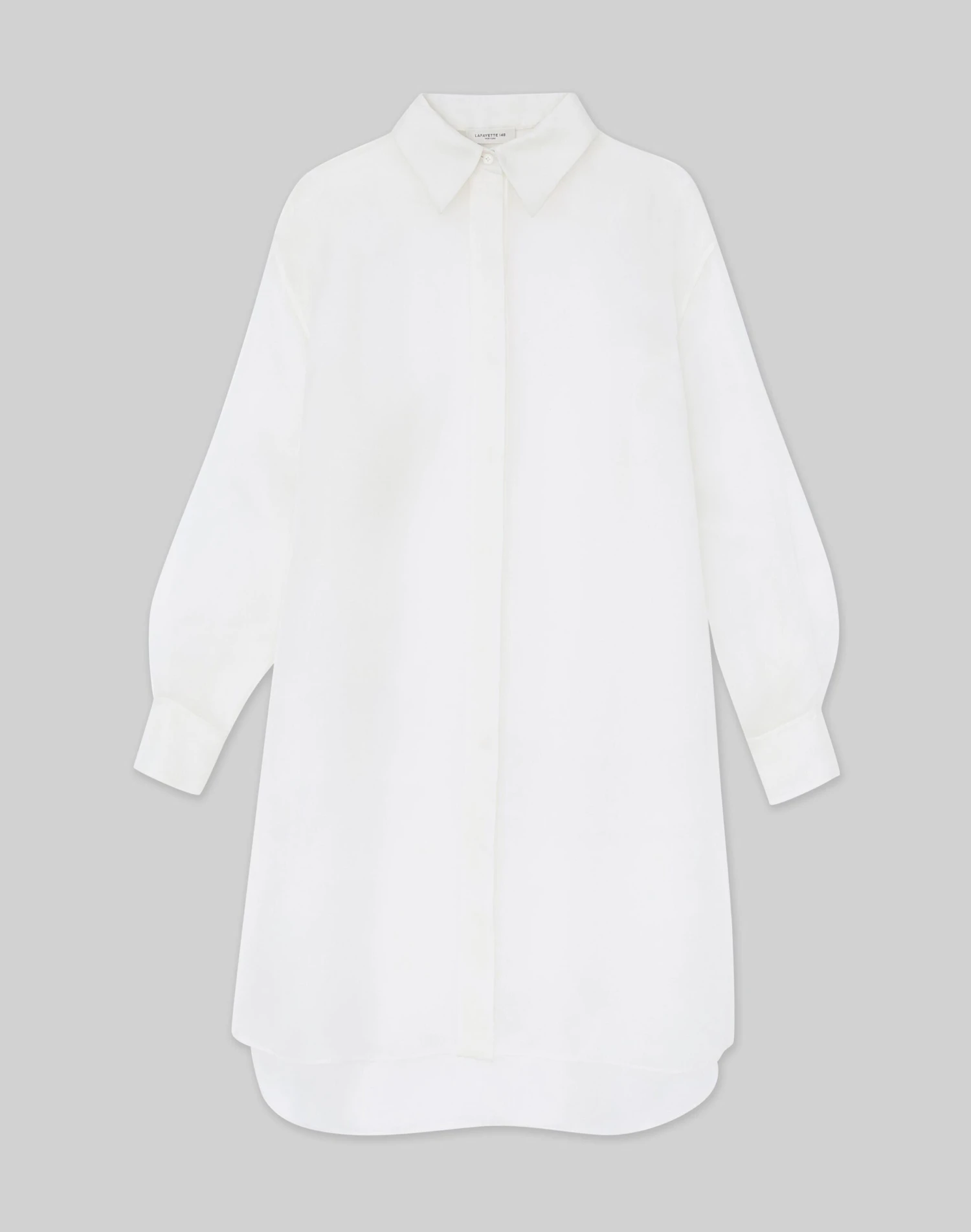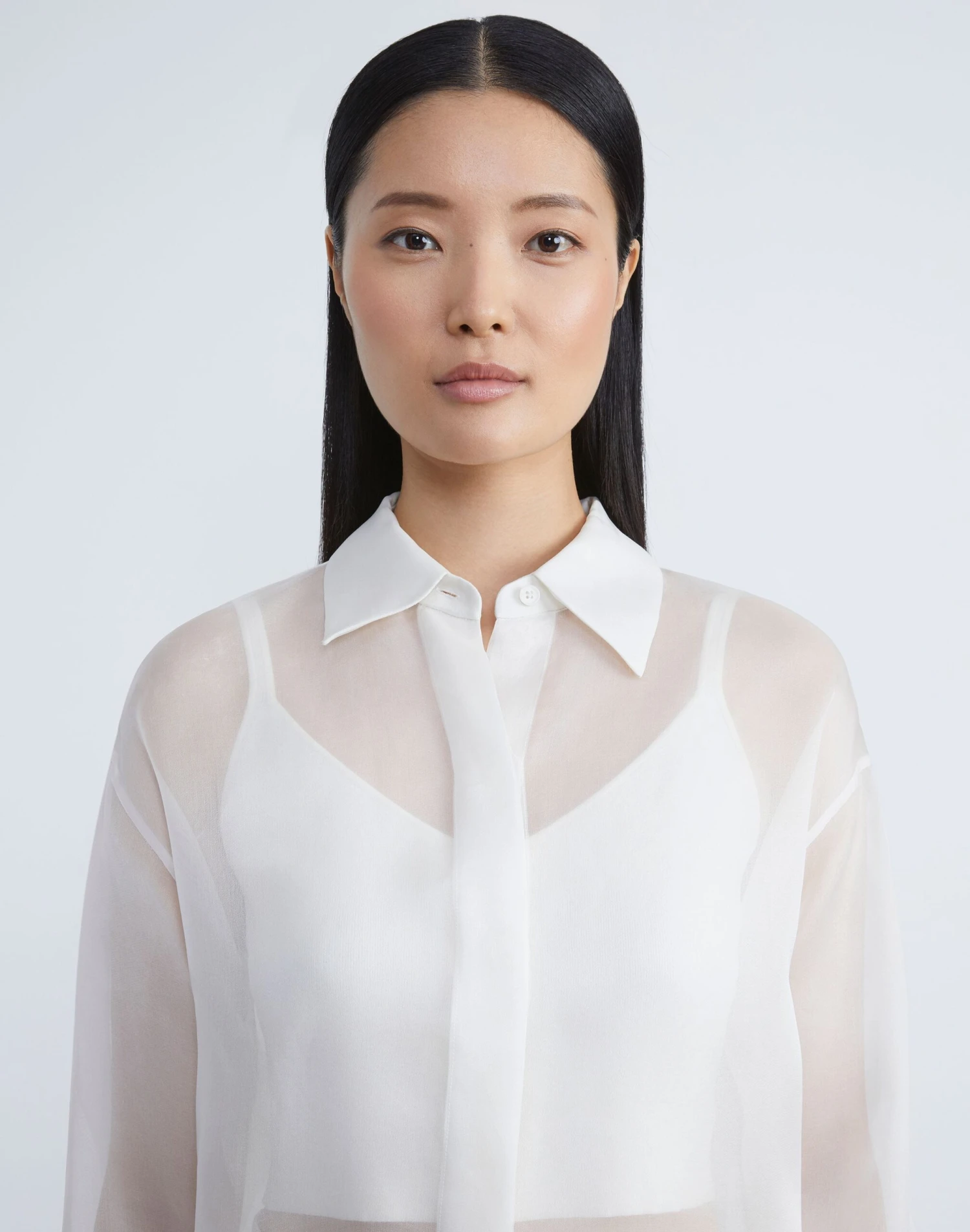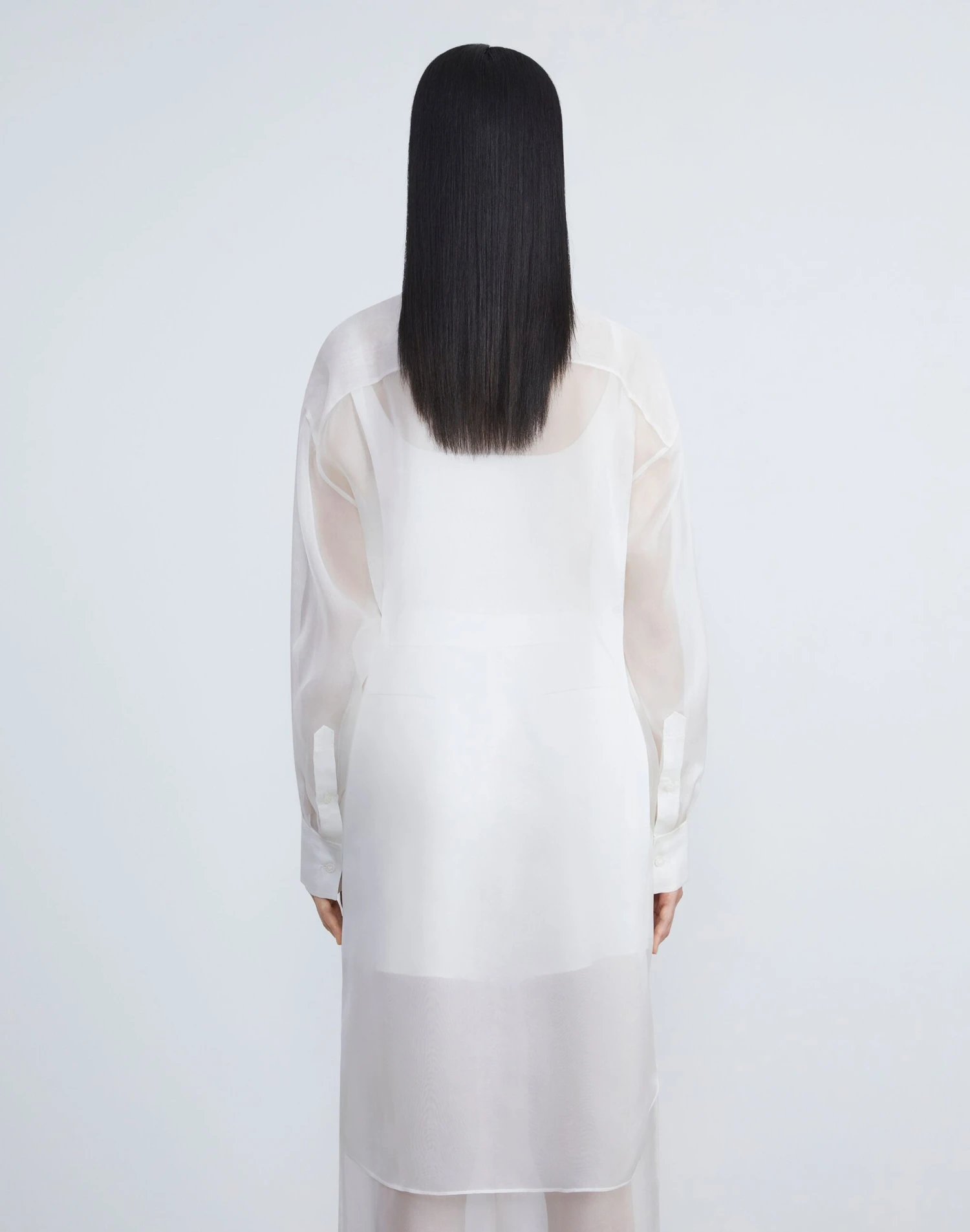 Sartorial tailoring and modern design combine with the collection’s tissue paper transparency in this Italian silk organza button shirt. Menswear codes inspire the clean-edged shirt collar and button-cuffed sleeves, while the elongated shirttail hem feels definitively feminine.