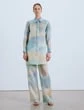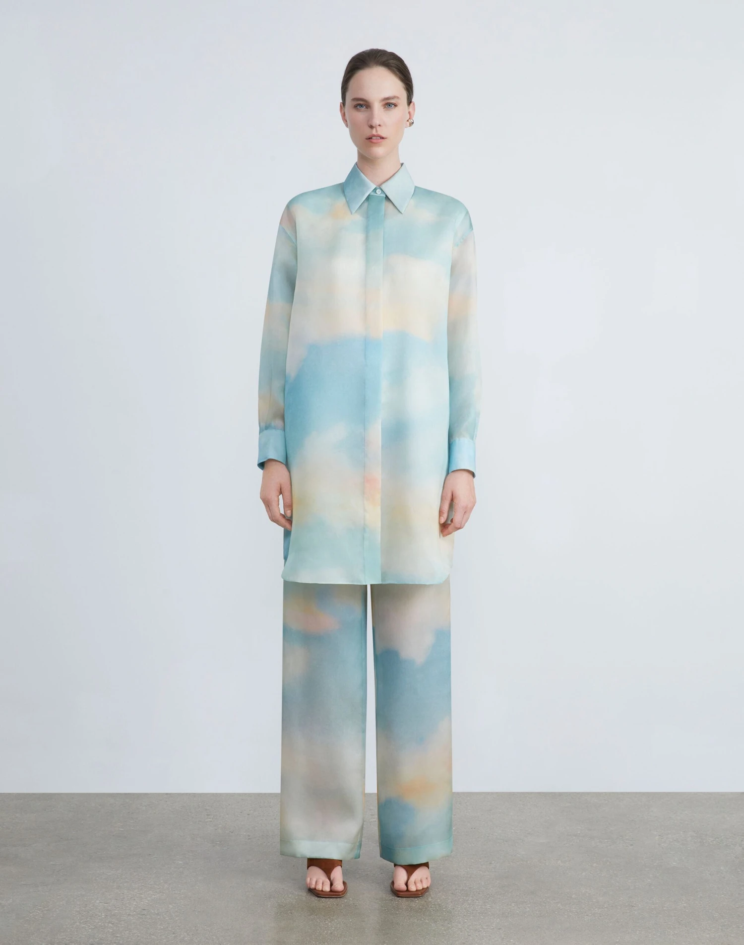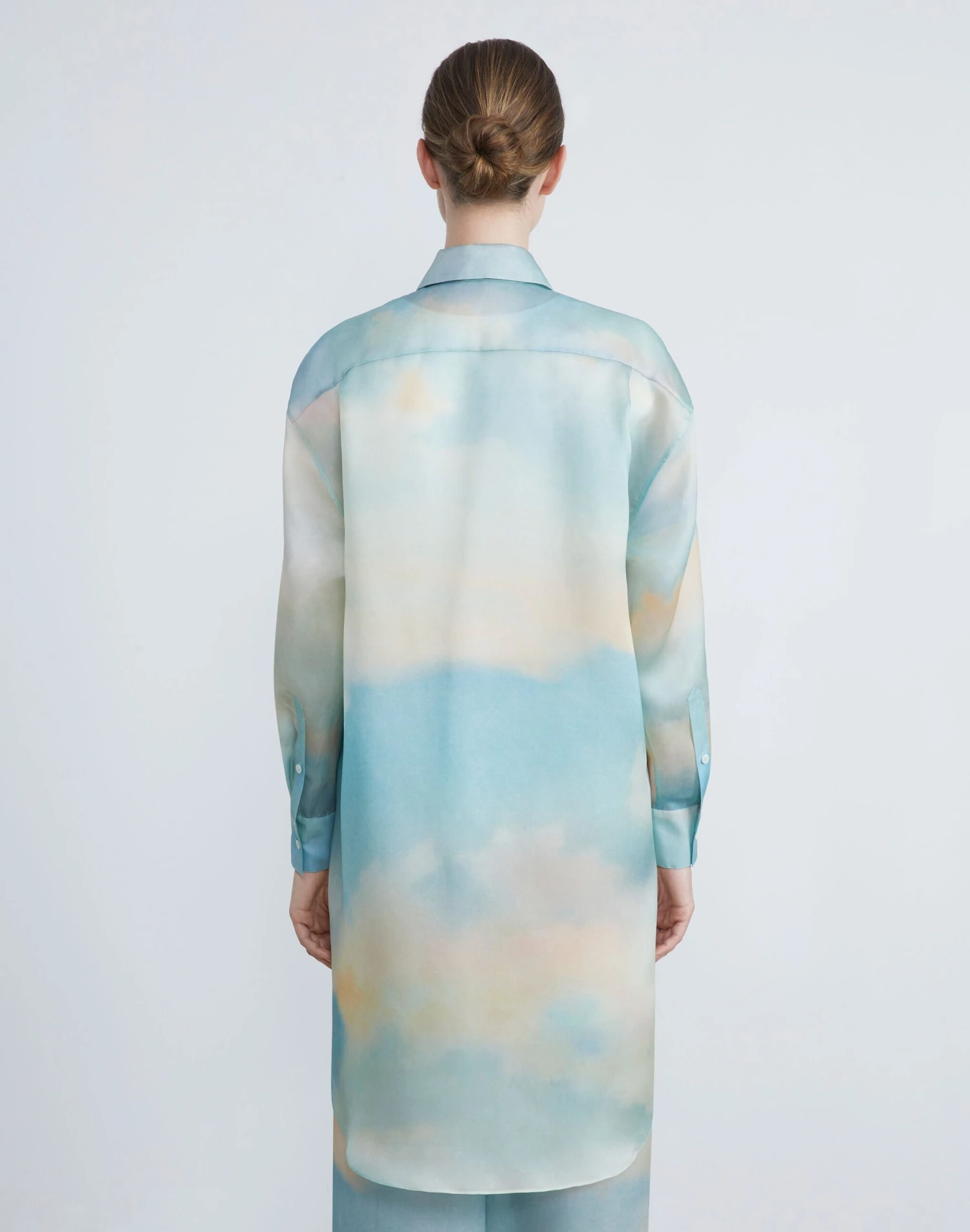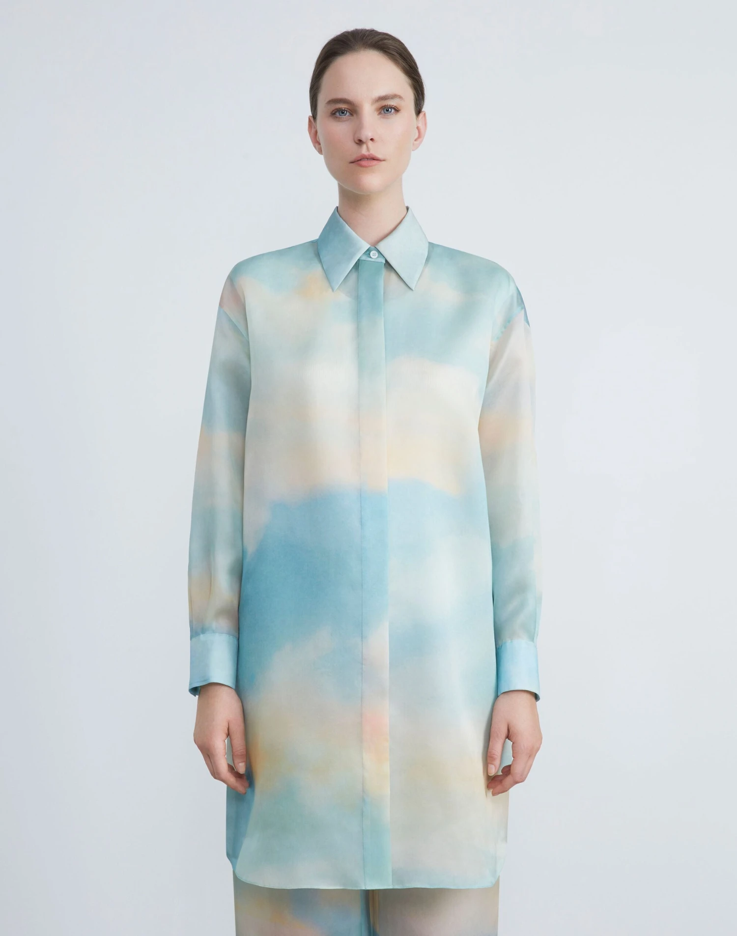 Ethereally imagined on gauzy Italian silk organza, the Pre-Fall 2023 collection’s Sky Scene print infuses the nostalgic allure and sun-kissed palette of vintage postcards to this tunic-length blouse. The oversized silhouette is cleanly tailored with a pointed shirt collar, button cuffs and hidden placket. It’s designed to pair effortlessly with the coordinating .