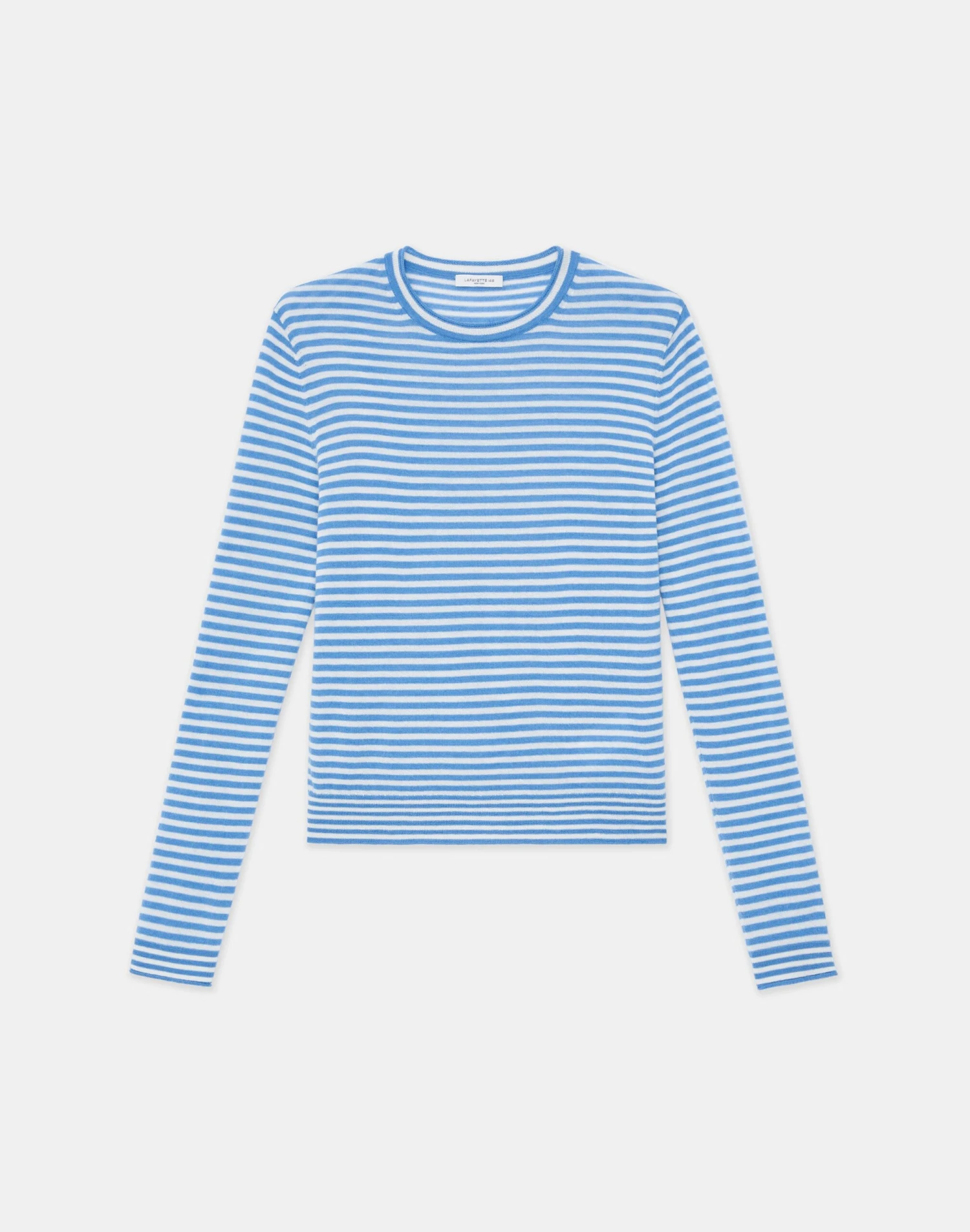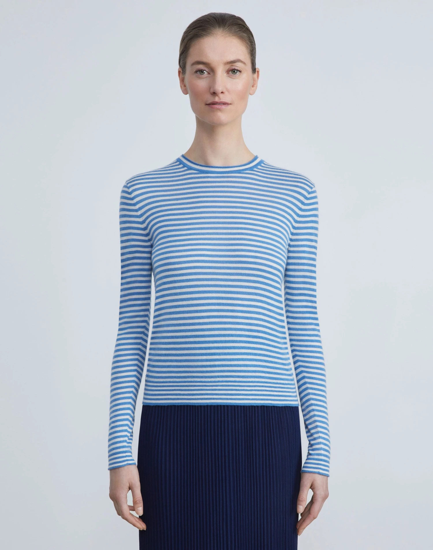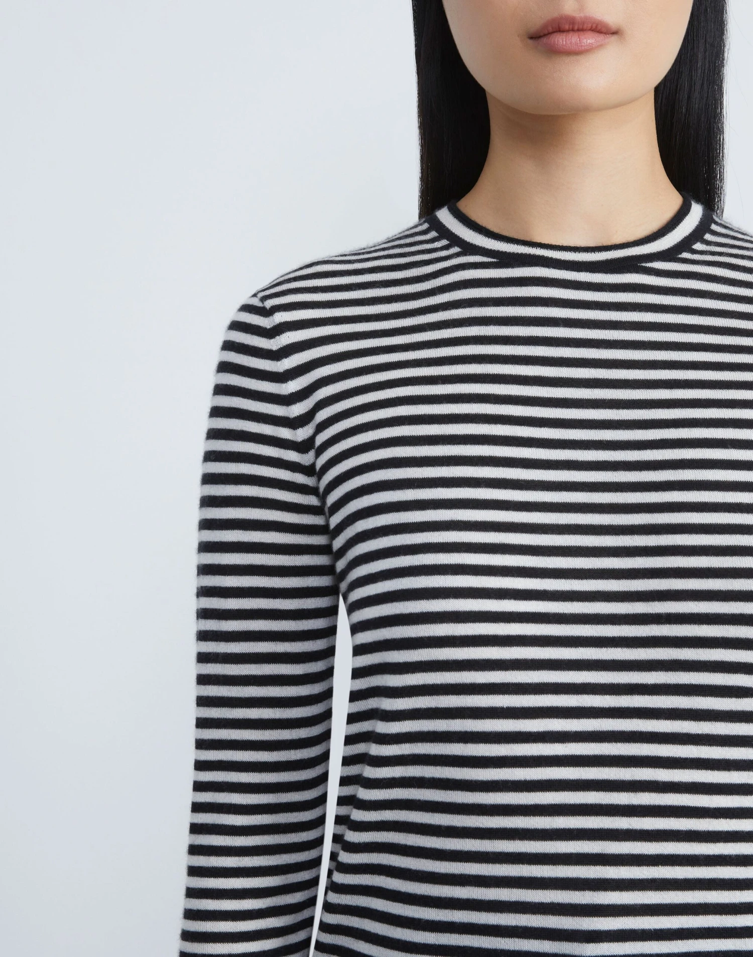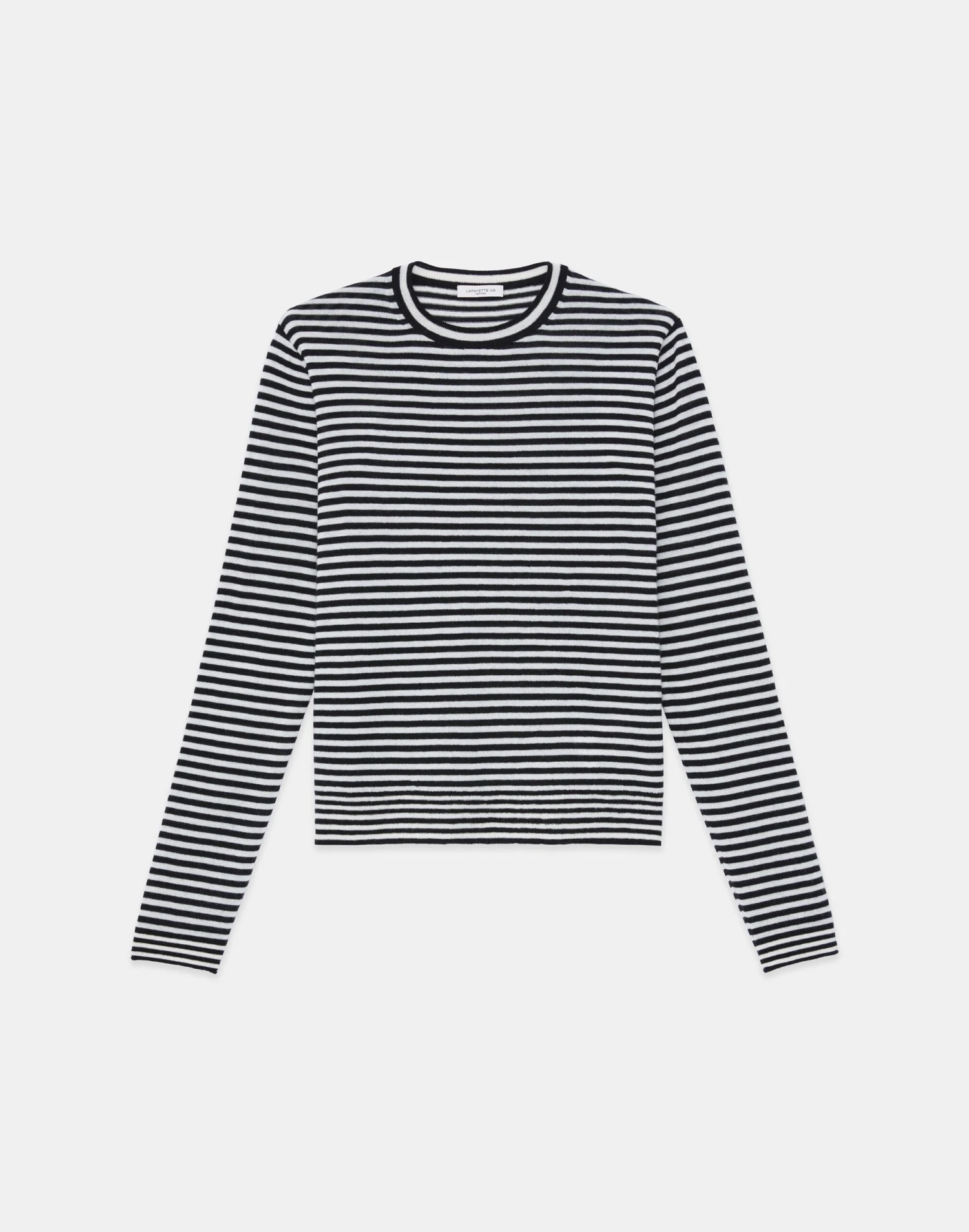 Crafted in the House’s signature stripe, this crewneck sweater is finely knit from a new exquisitely soft, ultra-lightweight cashmere that makes a versatile layering piece and also wears well alone. The fitted silhouette hits at the waist and is framed with softly curled, rolled edges.