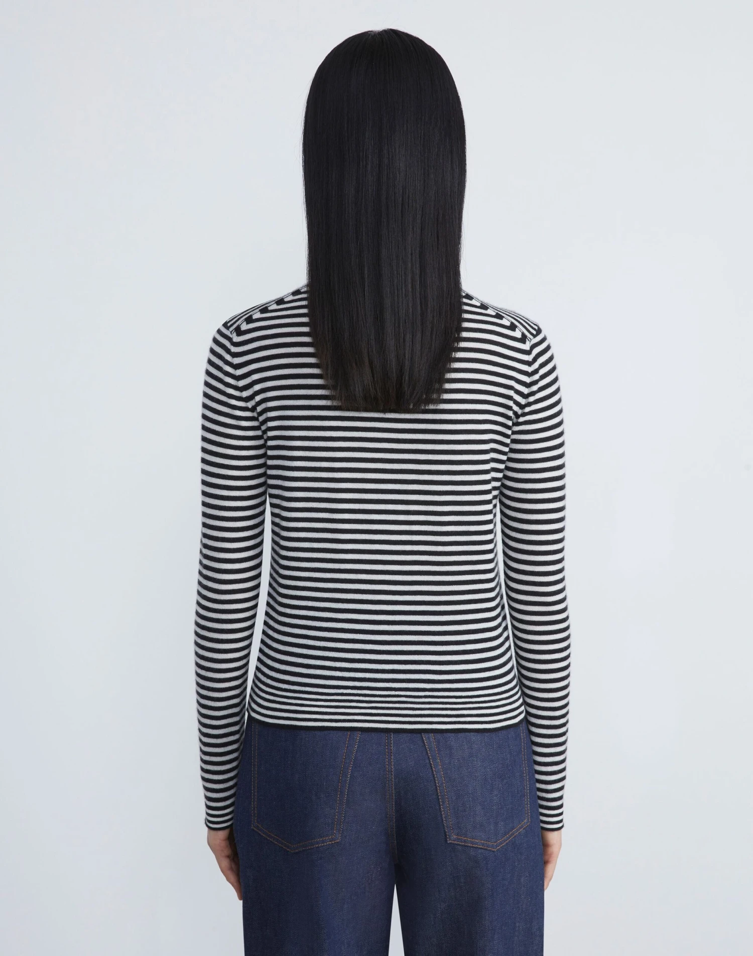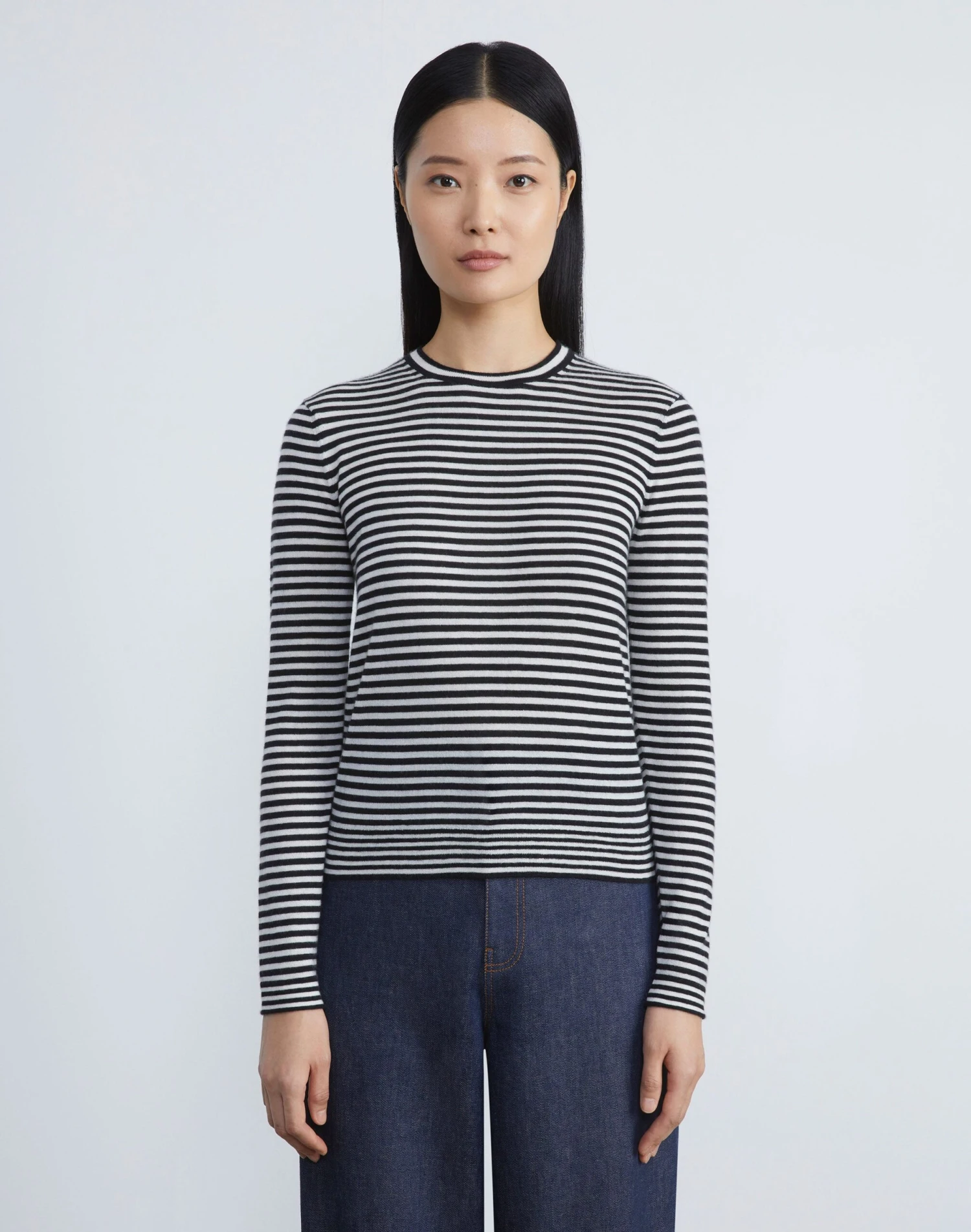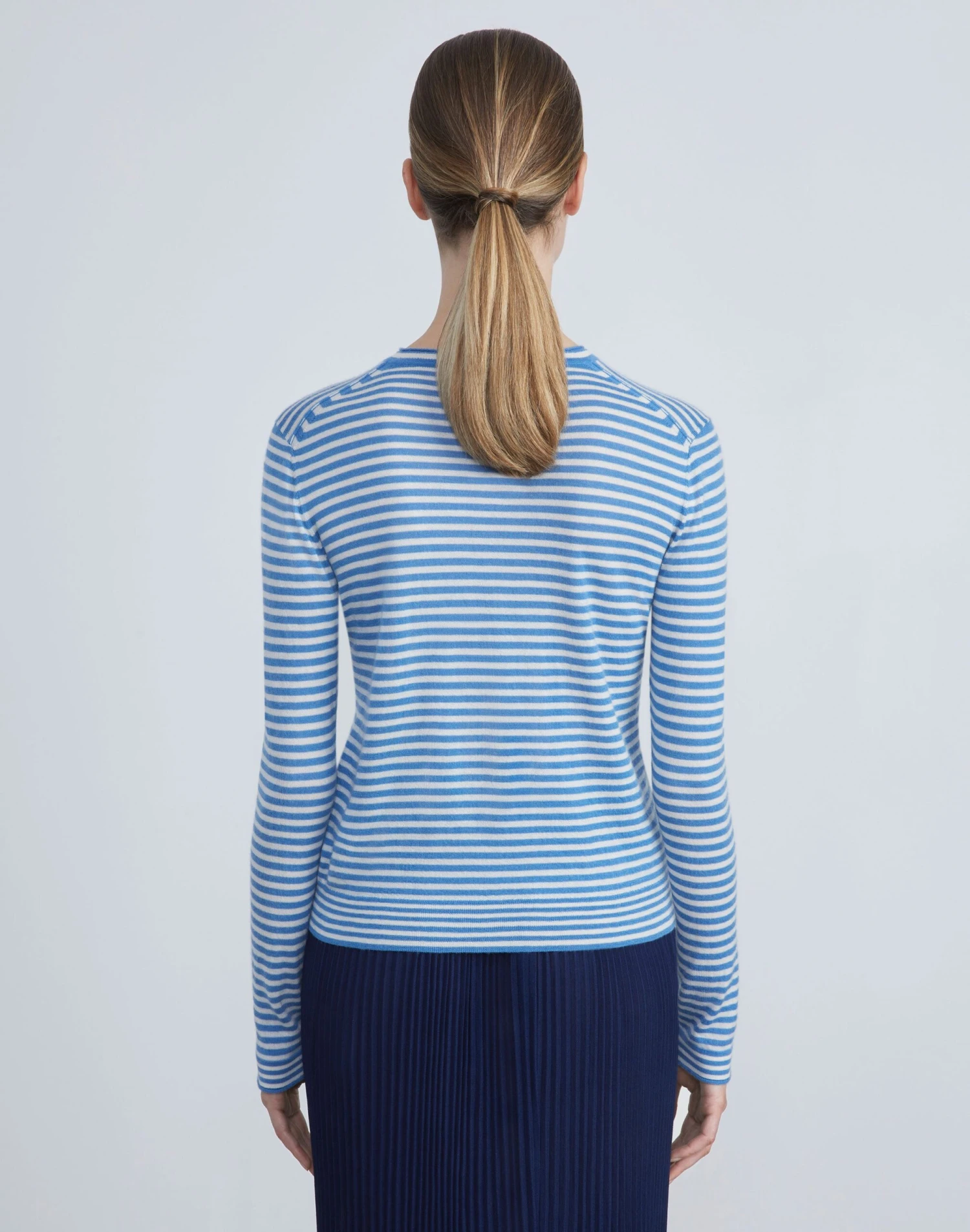 Crafted in the House’s signature stripe, this crewneck sweater is finely knit from a new exquisitely soft, ultra-lightweight cashmere that makes a versatile layering piece and also wears well alone. The fitted silhouette hits at the waist and is framed with softly curled, rolled edges.