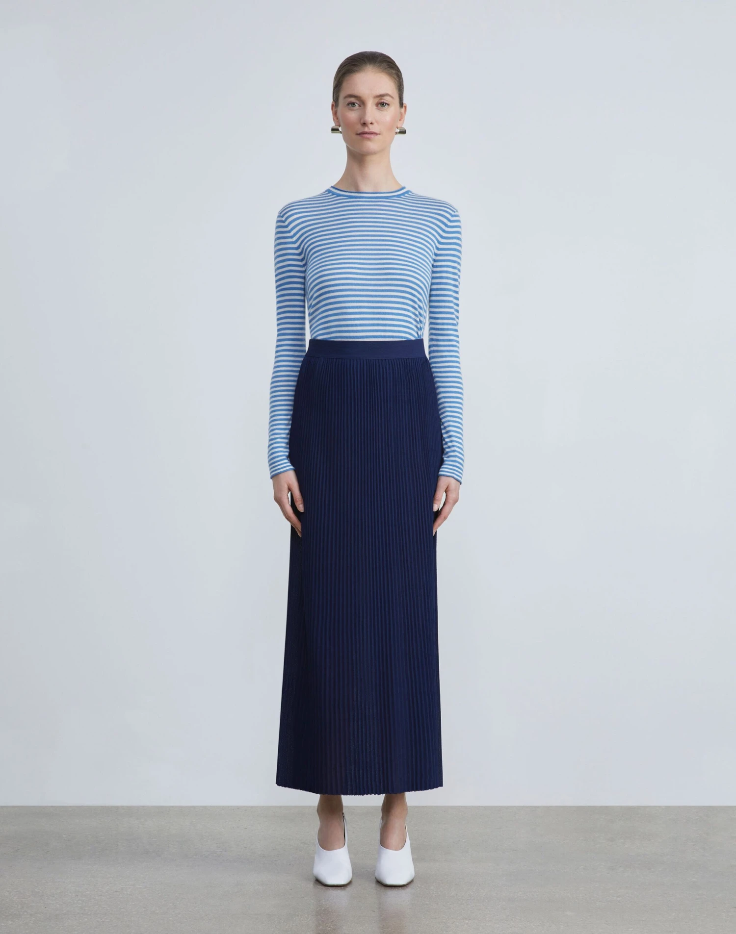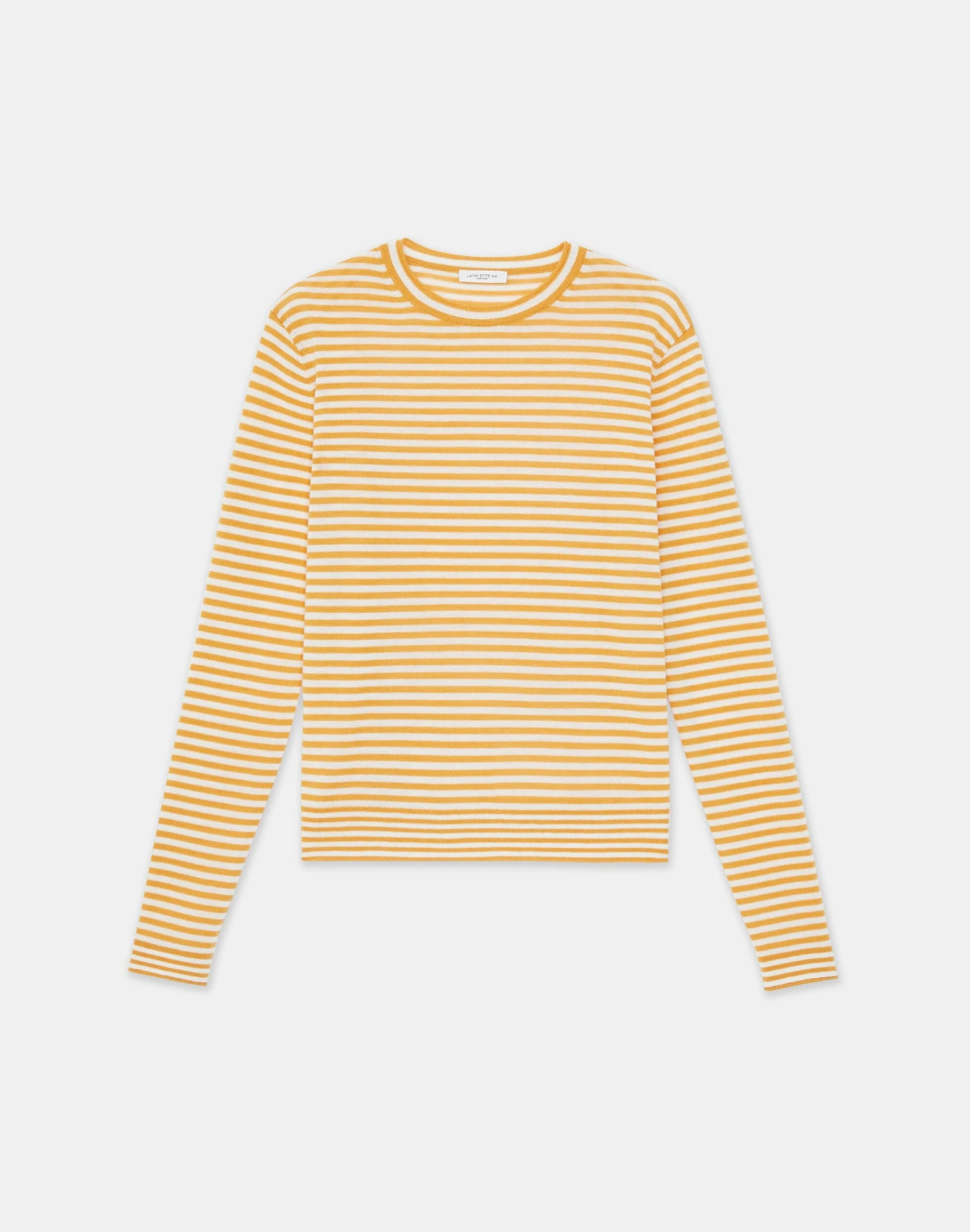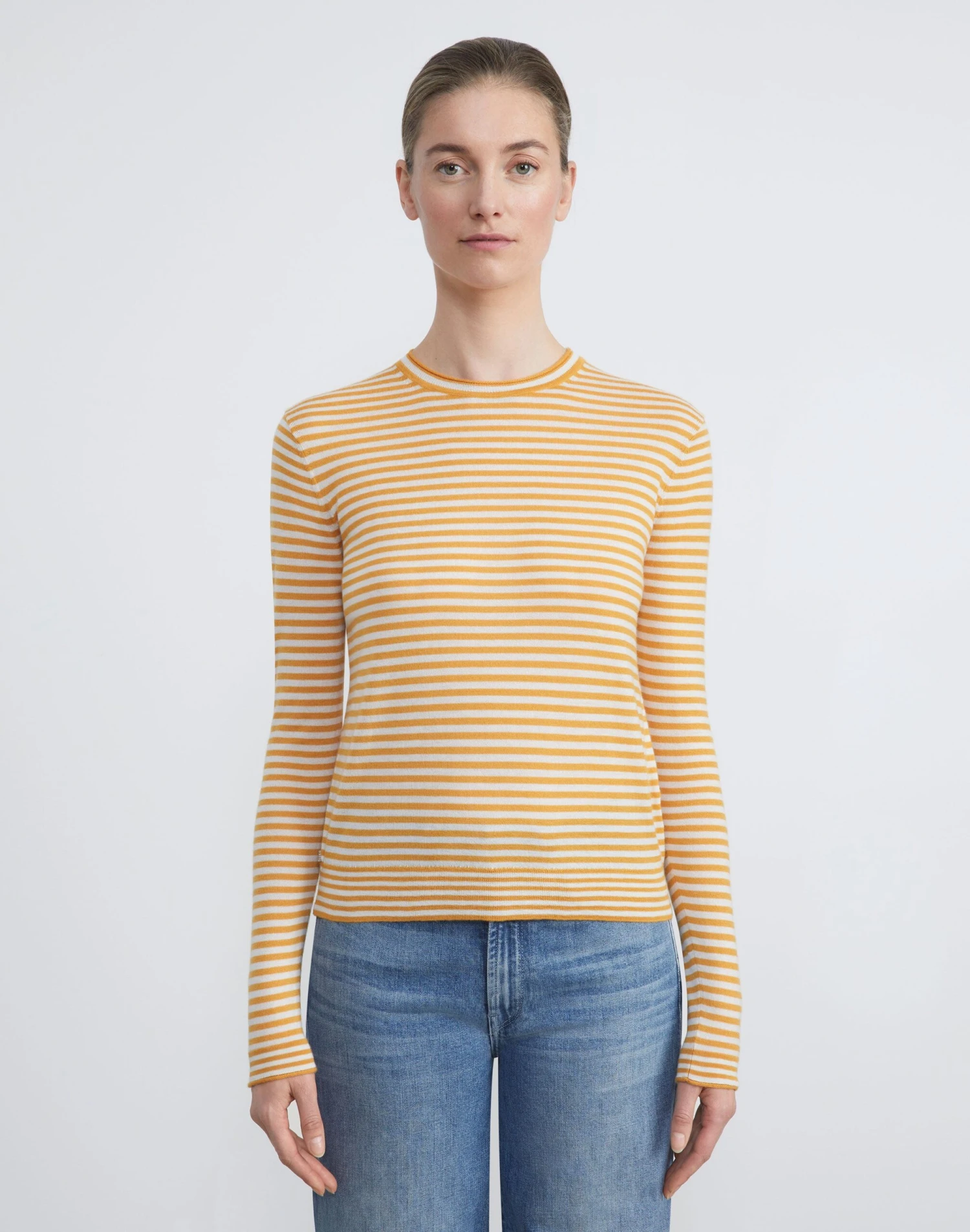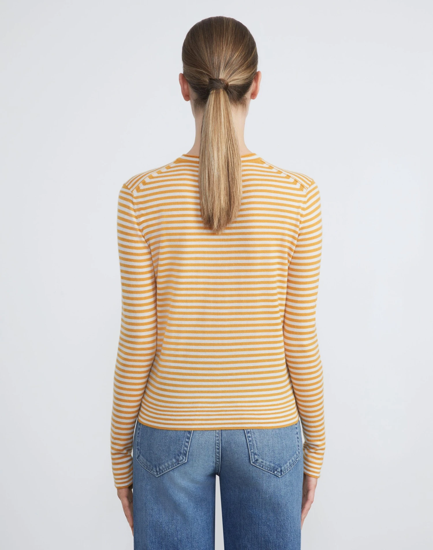 Crafted in the House’s signature stripe, this crewneck sweater is finely knit from a new exquisitely soft, ultra-lightweight cashmere that makes a versatile layering piece and also wears well alone. The fitted silhouette hits at the waist and is framed with softly curled, rolled edges.