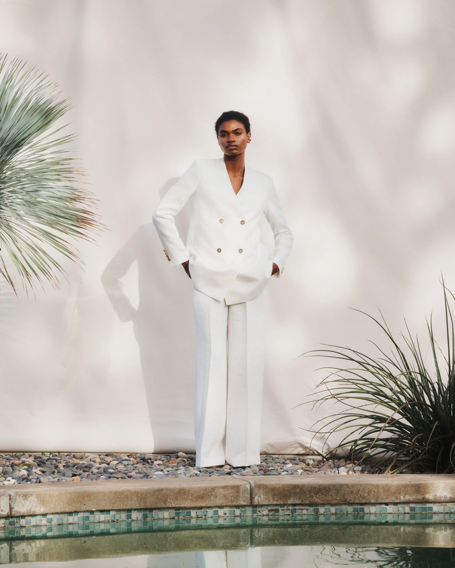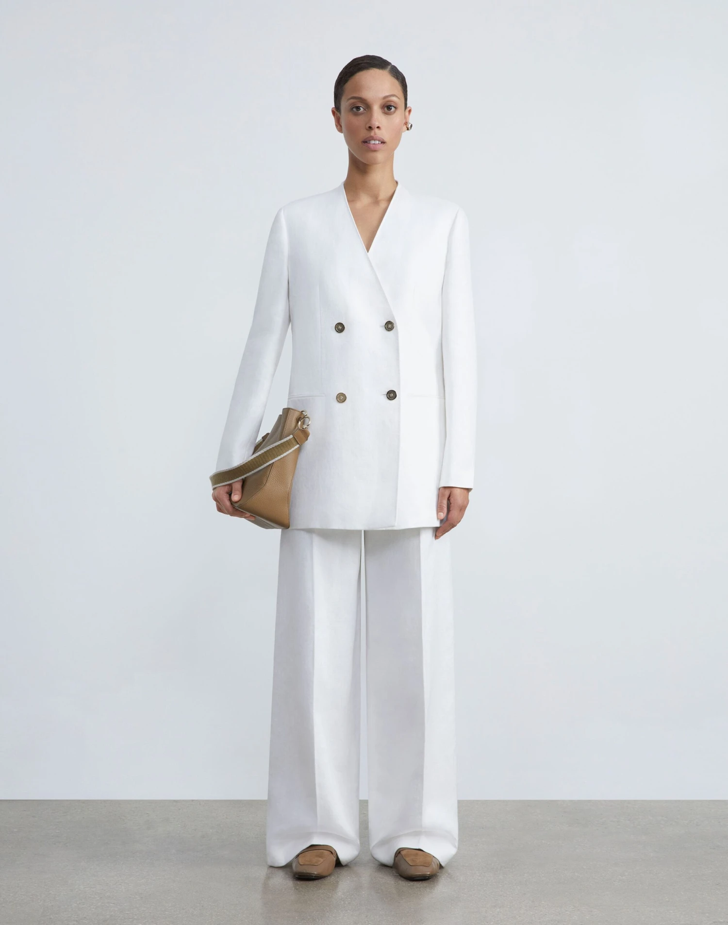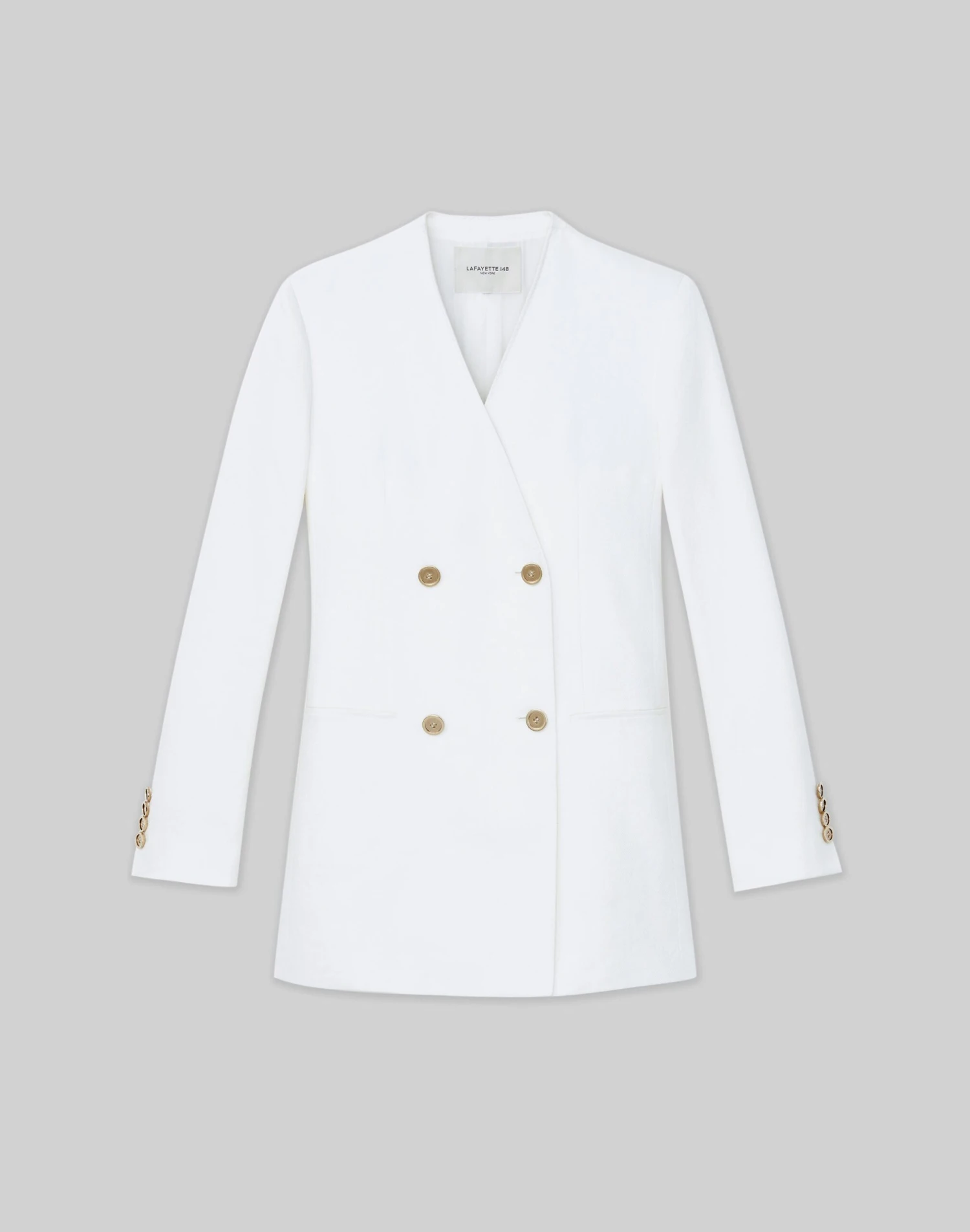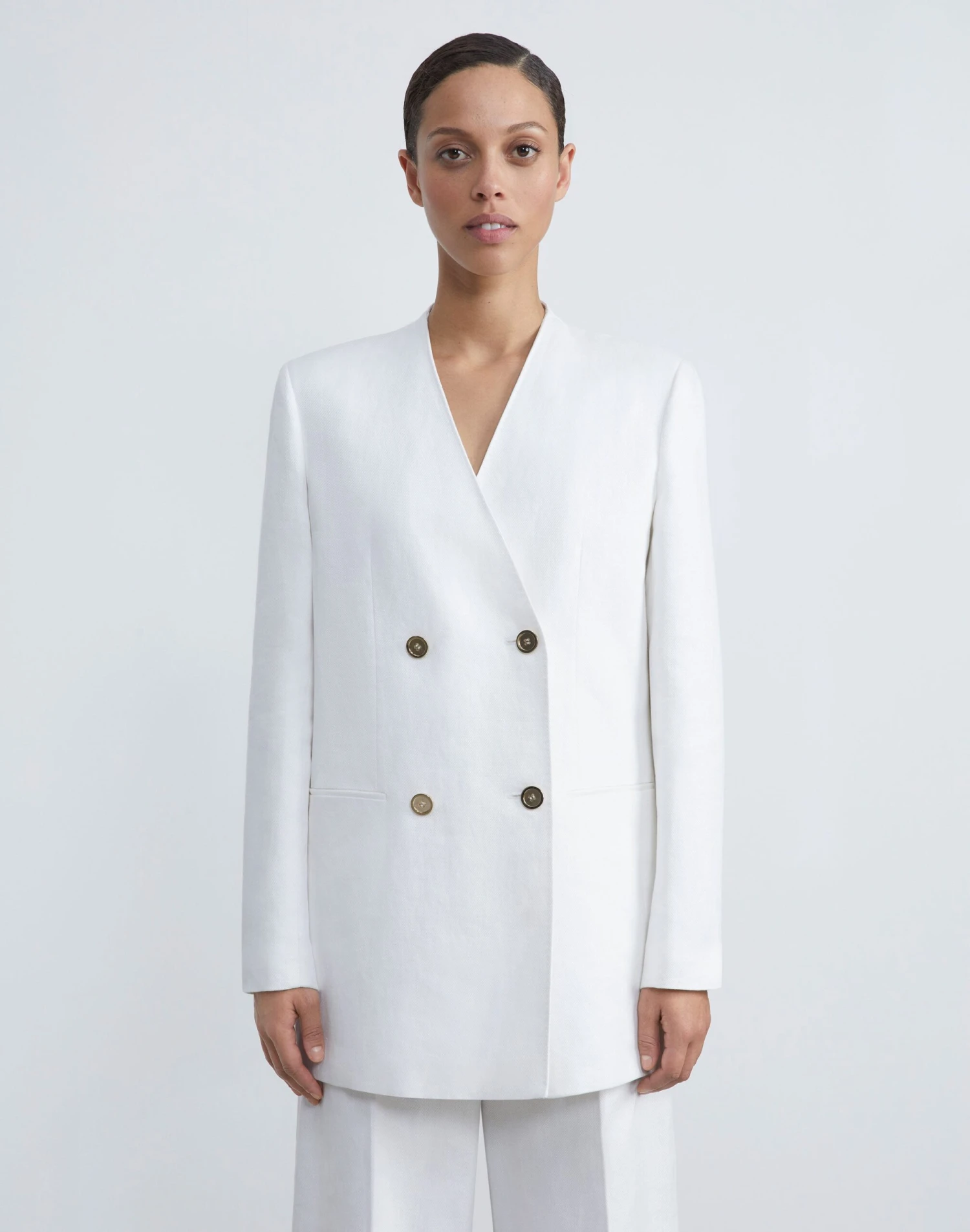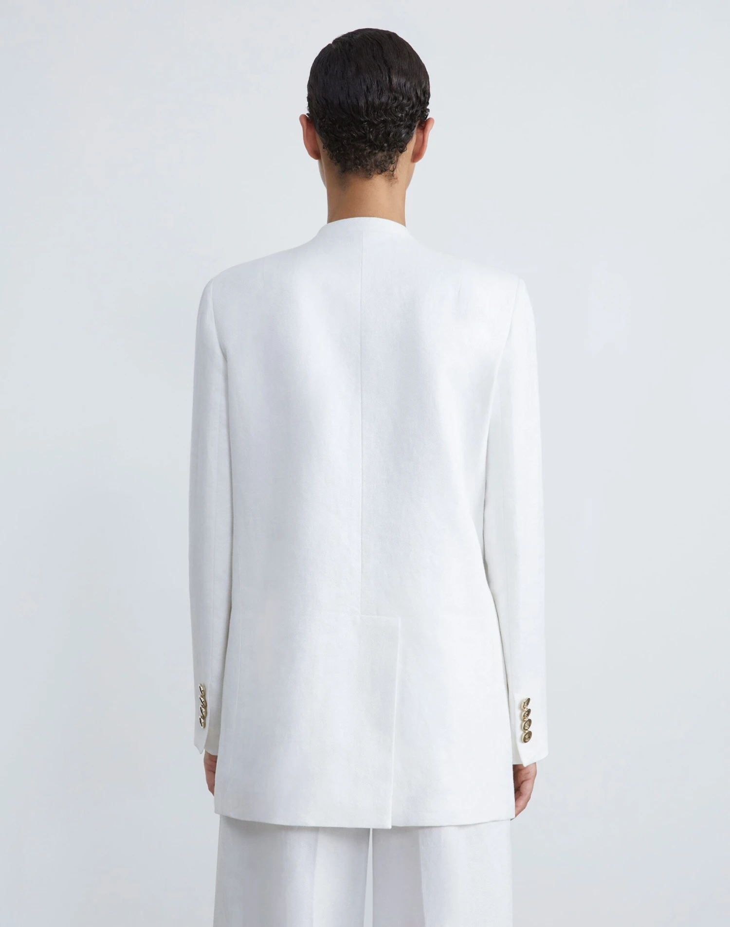 Meticulously tailored in structured linen twill, this collarless, double-breasted blazer draws from the classic lines of naval uniforms—a nod to L148’s Brooklyn Navy Yard atelier. The V-neck design is defined by strong shoulders, sartorial buttons and architectural cutlines, while pickstitch detailing lends a bespoke finish. Pair it with the coordinating .