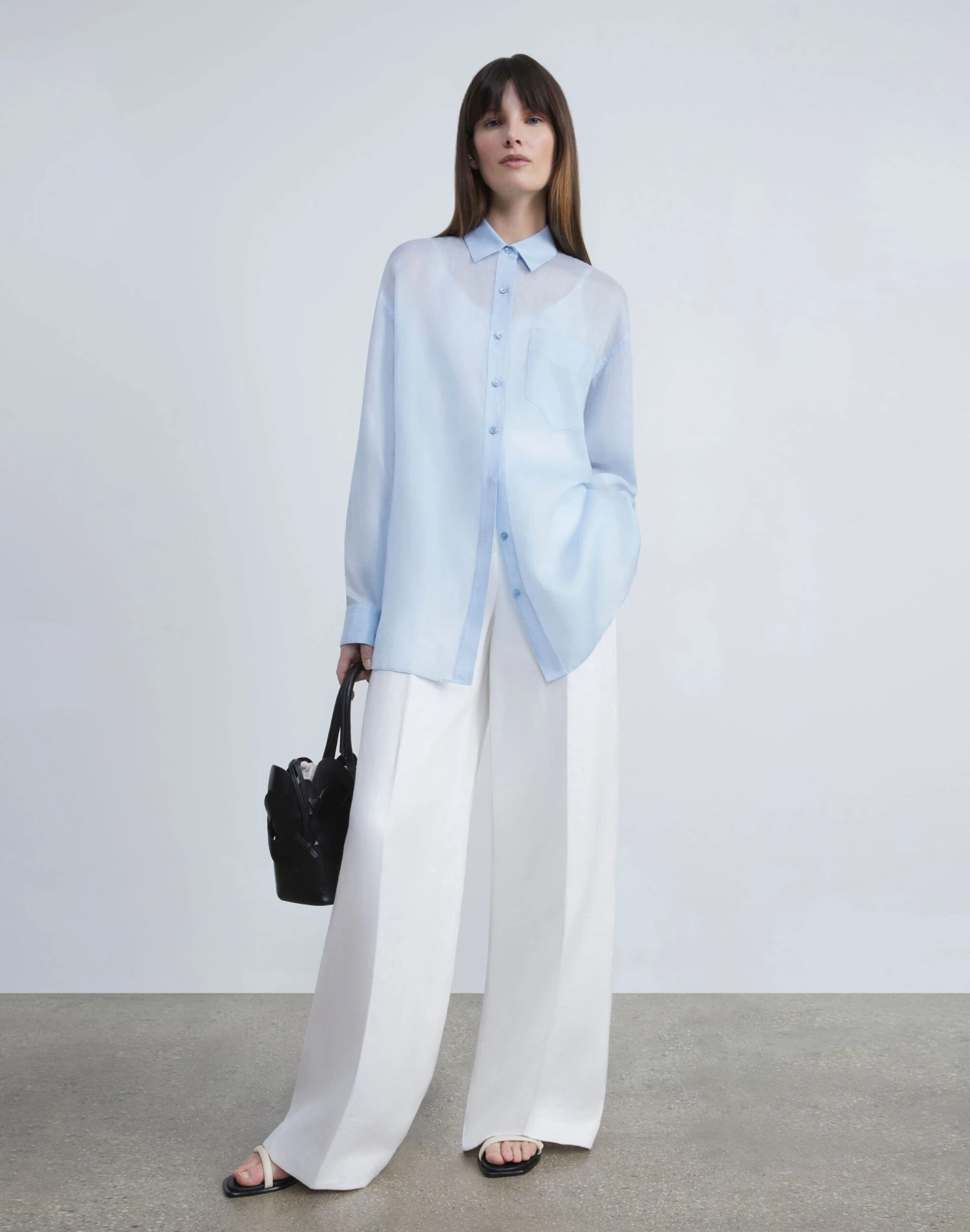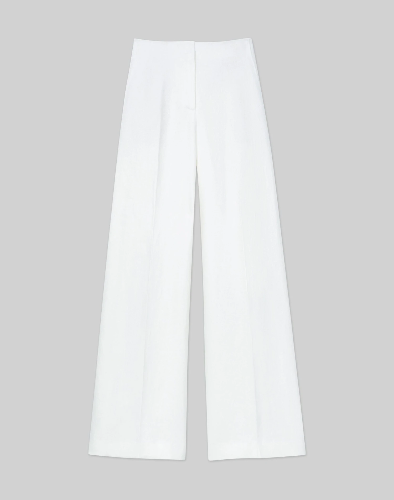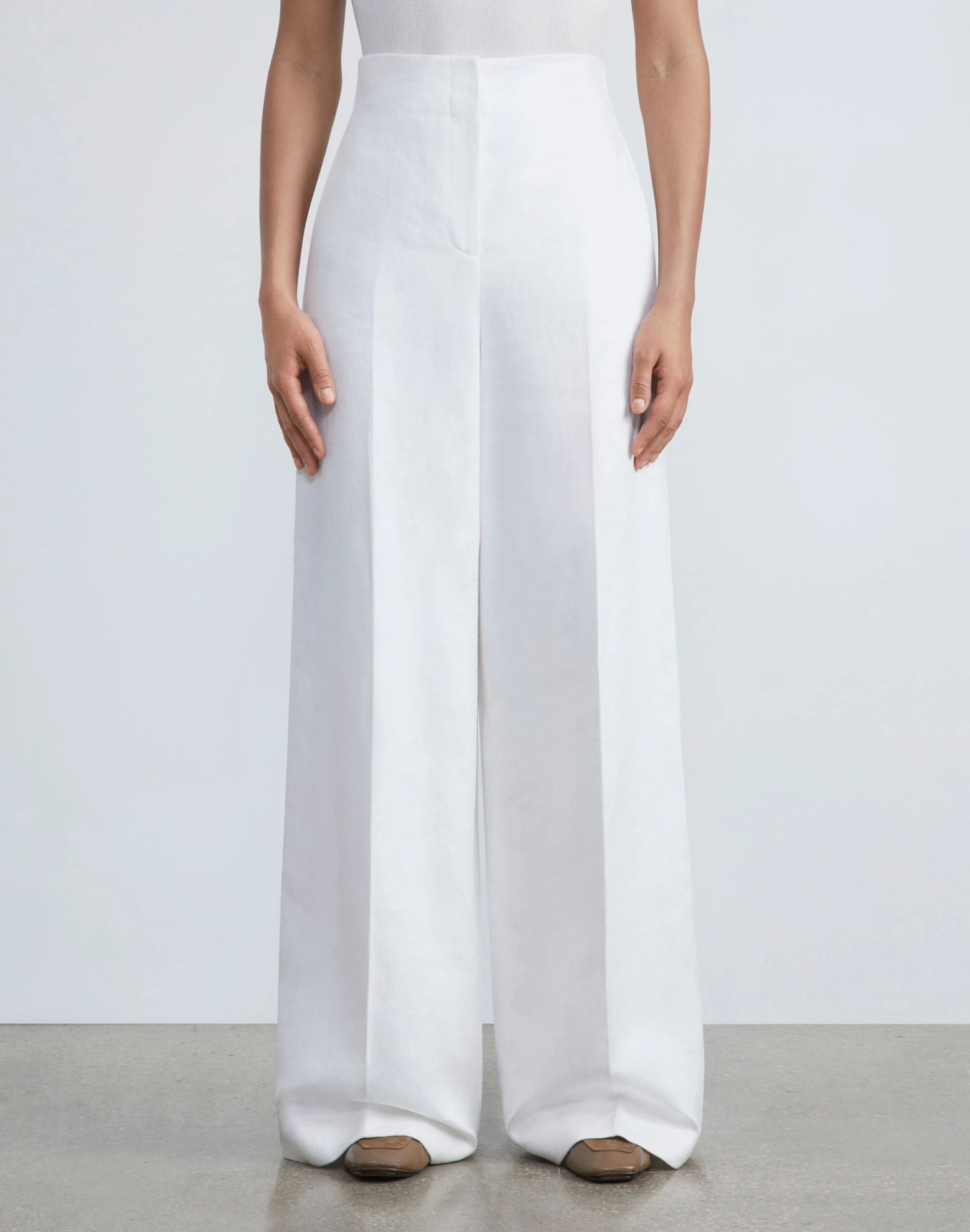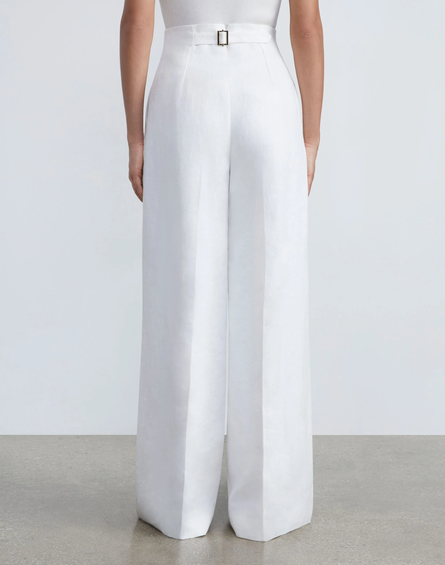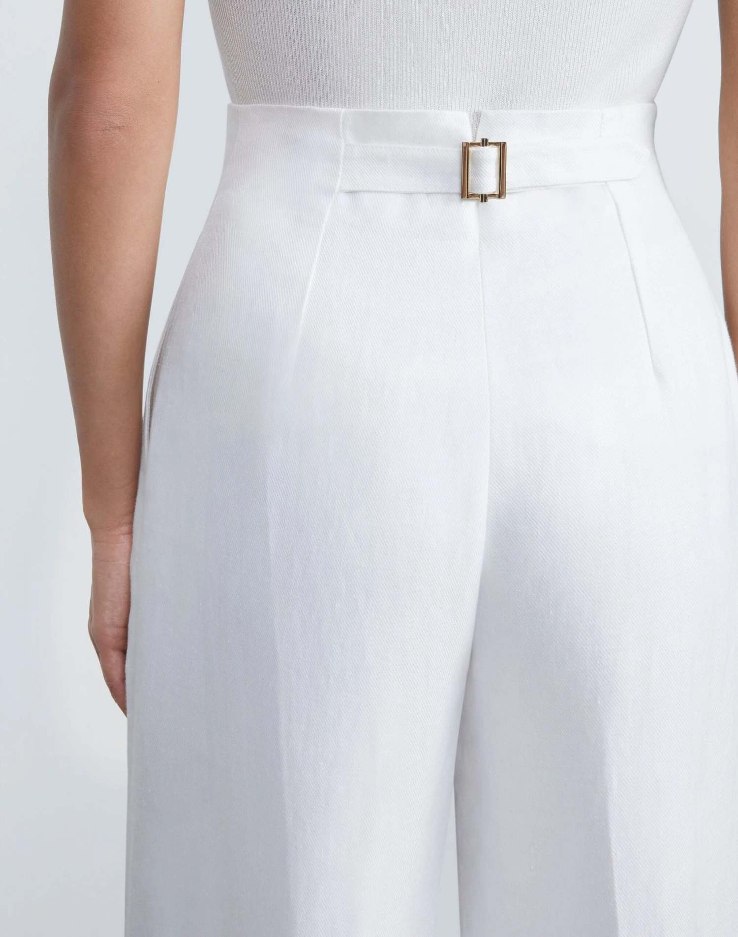 New for the season, the Thames pant features a wide leg and back buckle tabs merging modern proportions with vintage postal influences—a cornerstone of the Pre-Fall 2023 collection. Crafted from structured linen twill, it’s designed to sit high on the waist with contouring darts and pairs with the coordinating .
